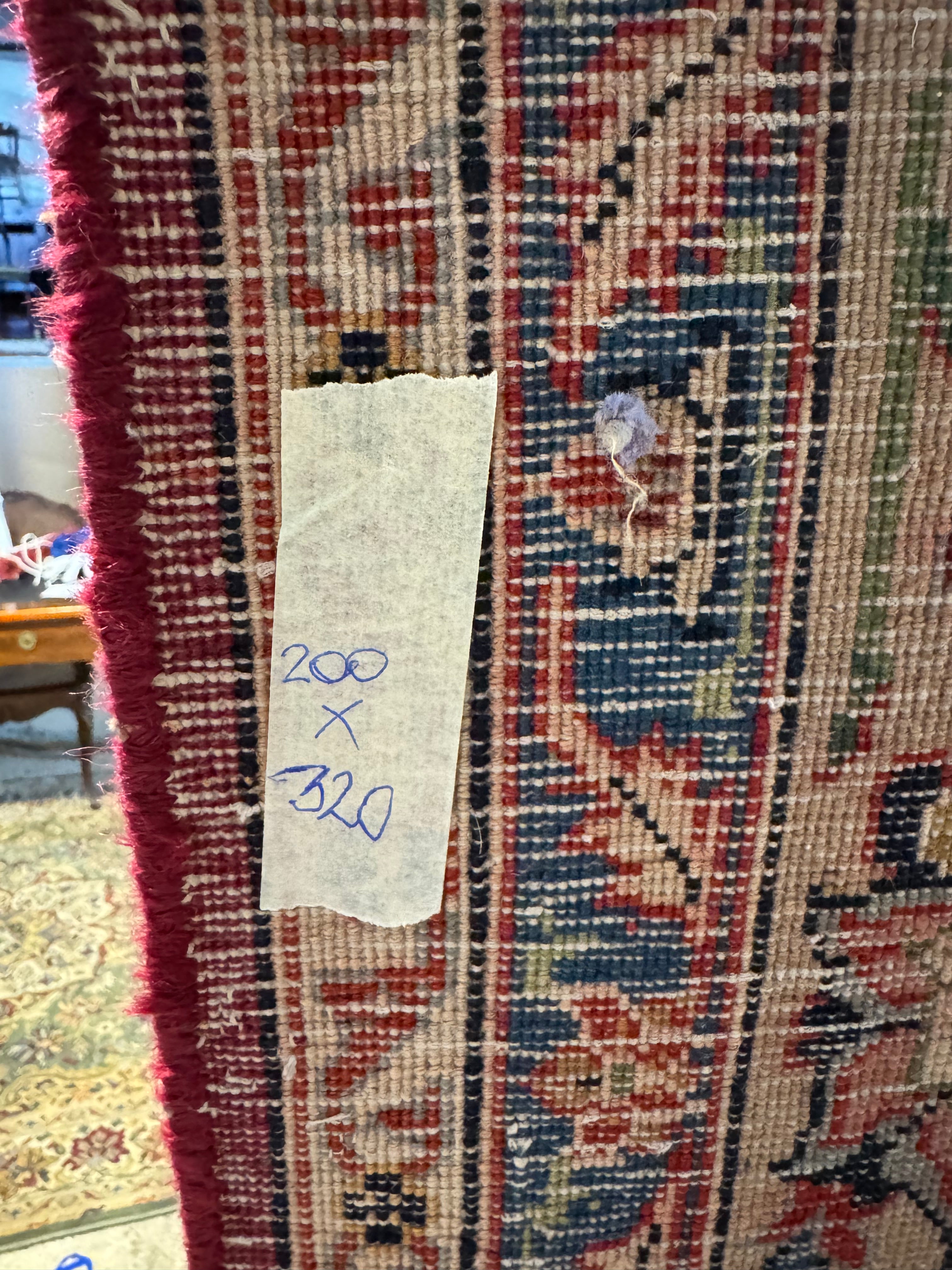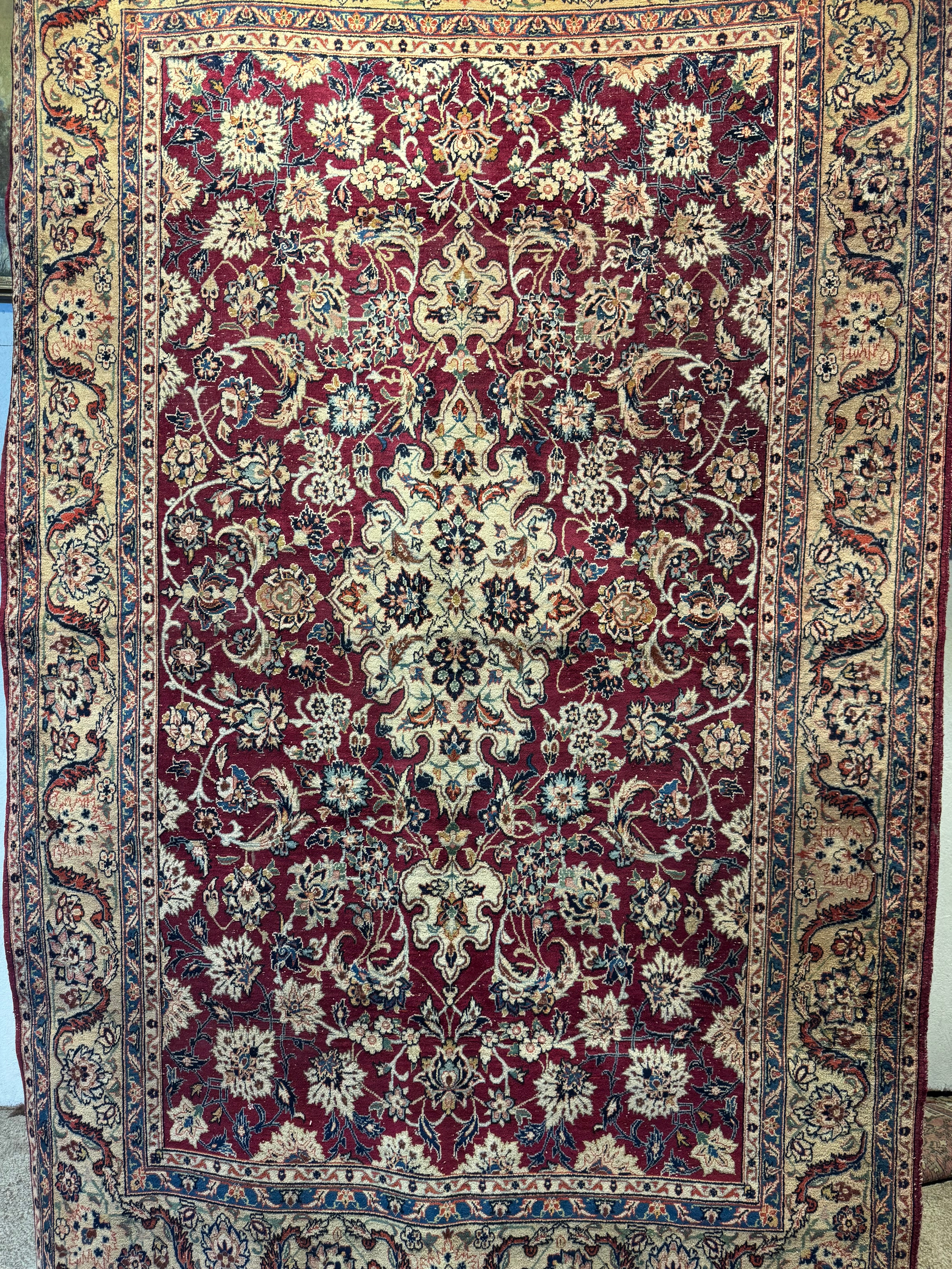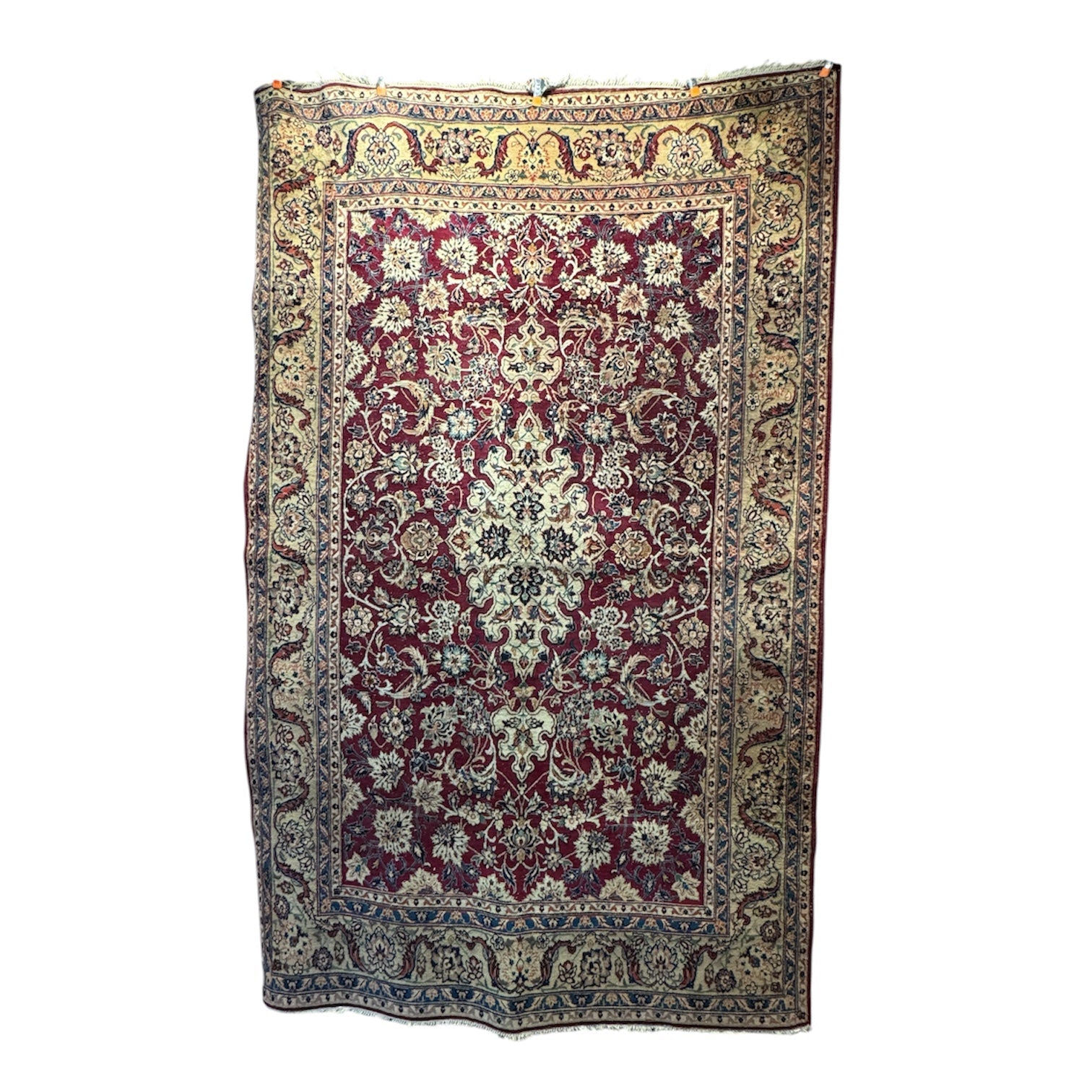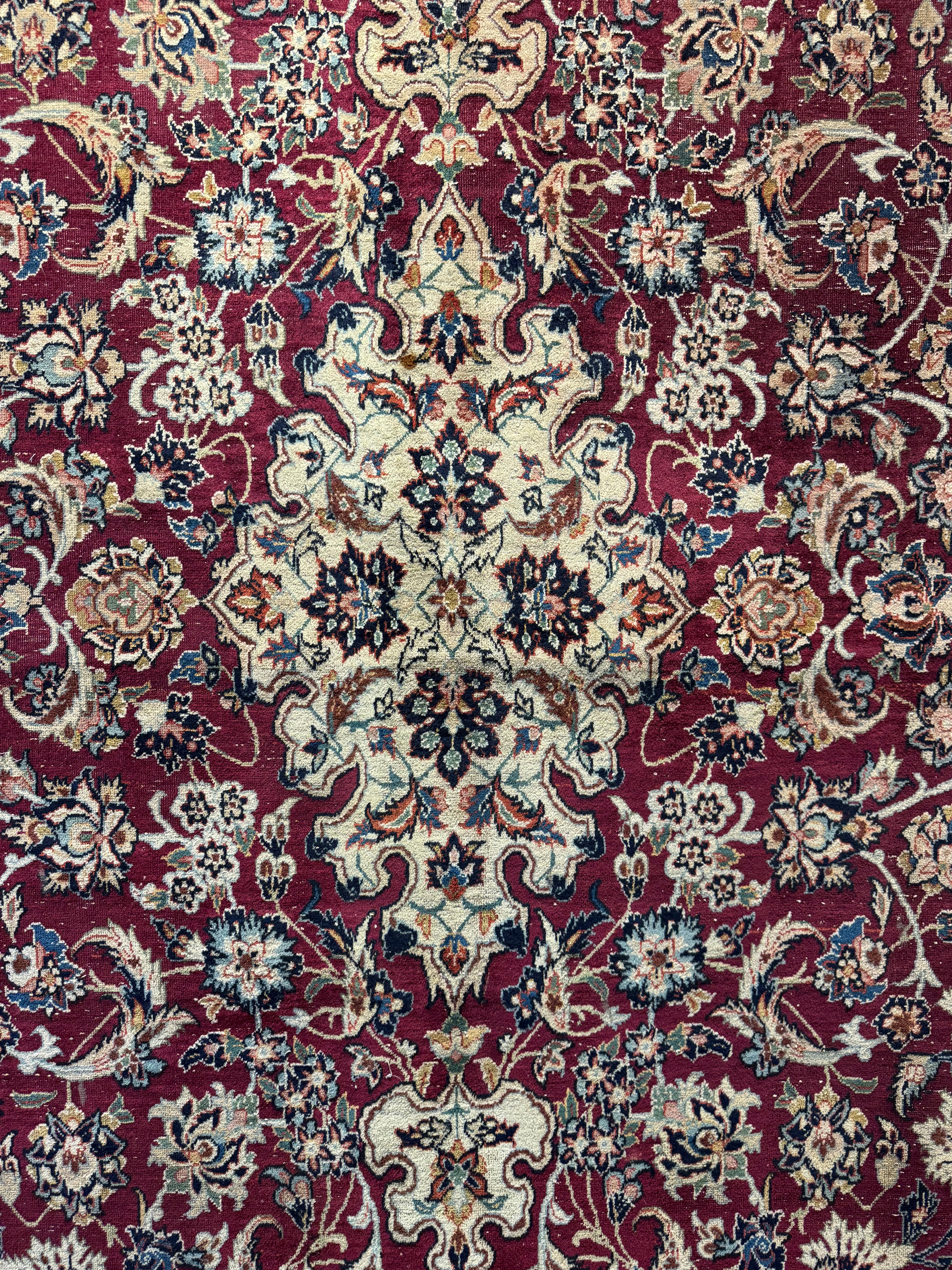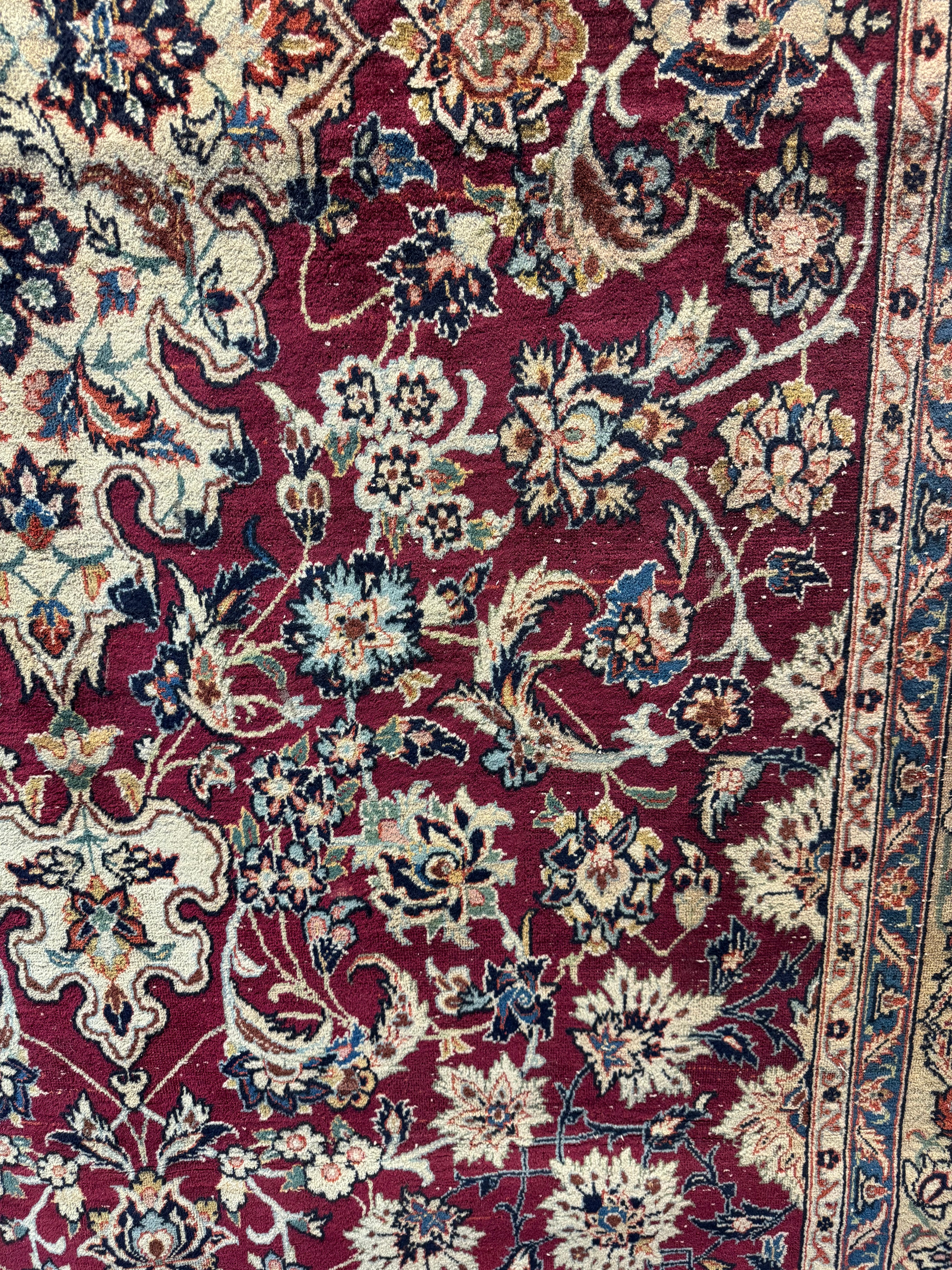Fantástica alfombra persa de la región central, hecho de lana tejida y teñida a mano. Esta alfombra tiene un diseño de medallón floral, rodeado de intrincados motivos florales. El medallón central de color crema, es el foco principal del diseño de la alfombra. También predomina el rojo oscuro del fondo, con detalles en azul y crema en sus decoraciones.