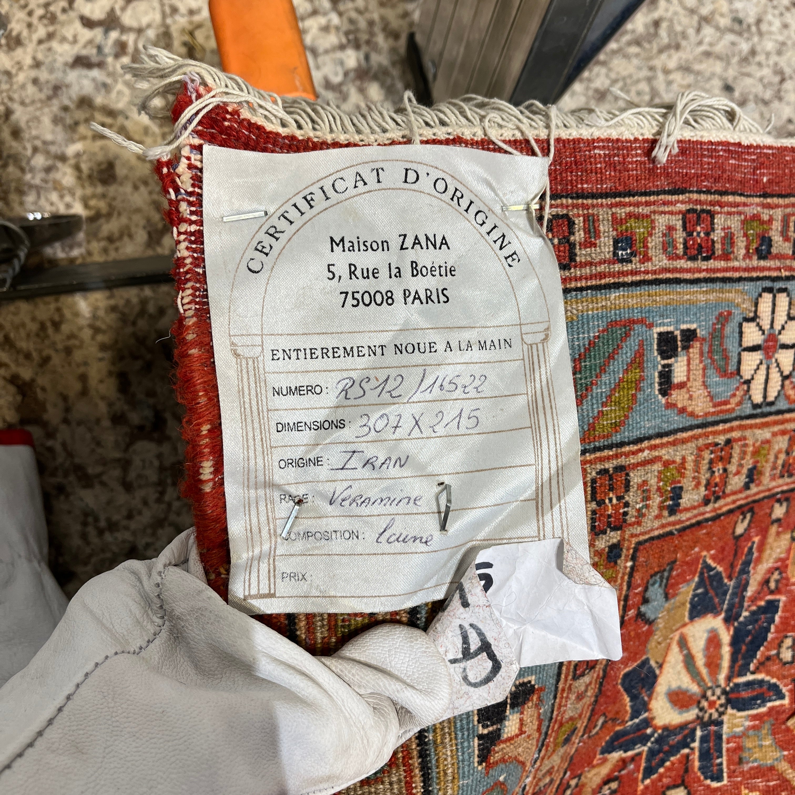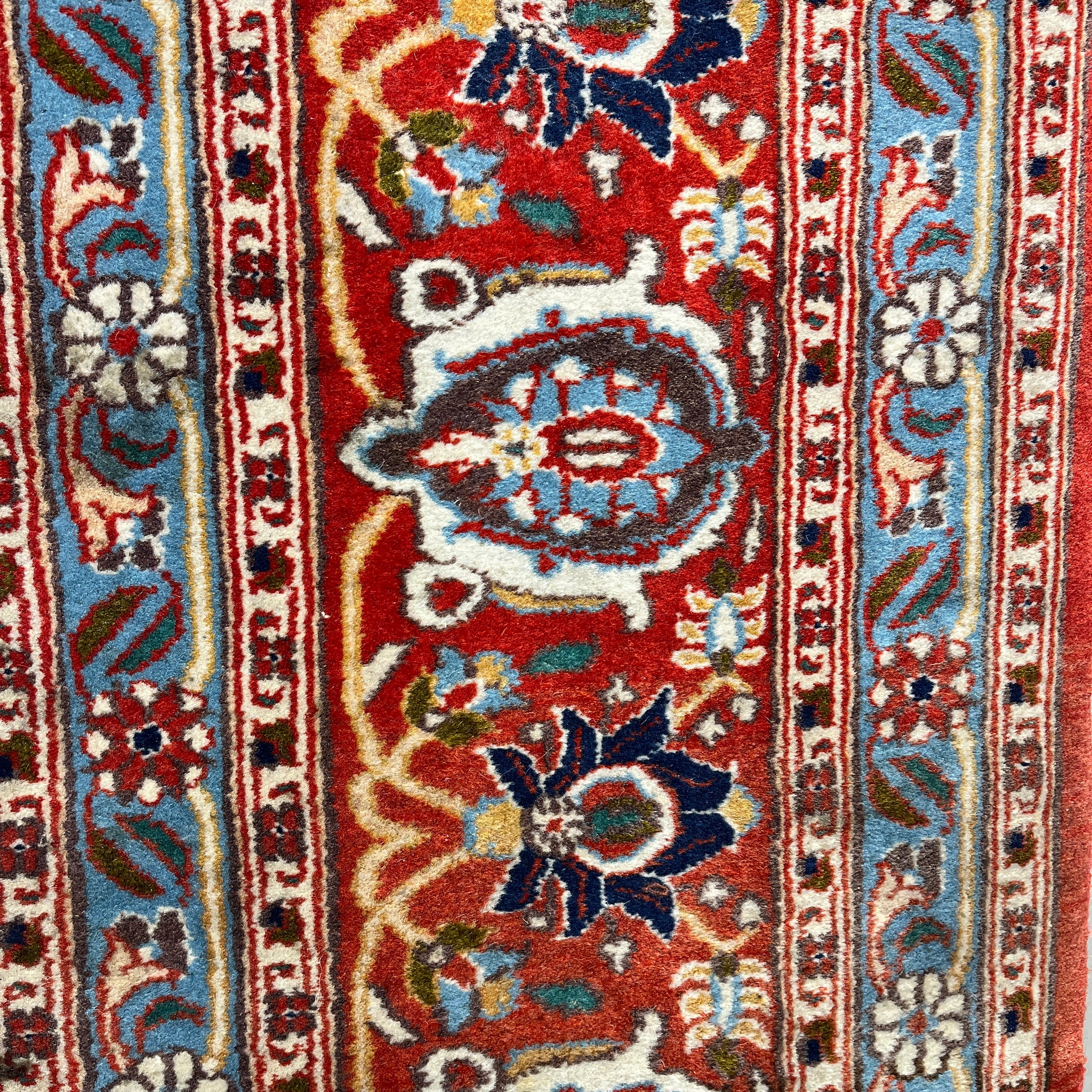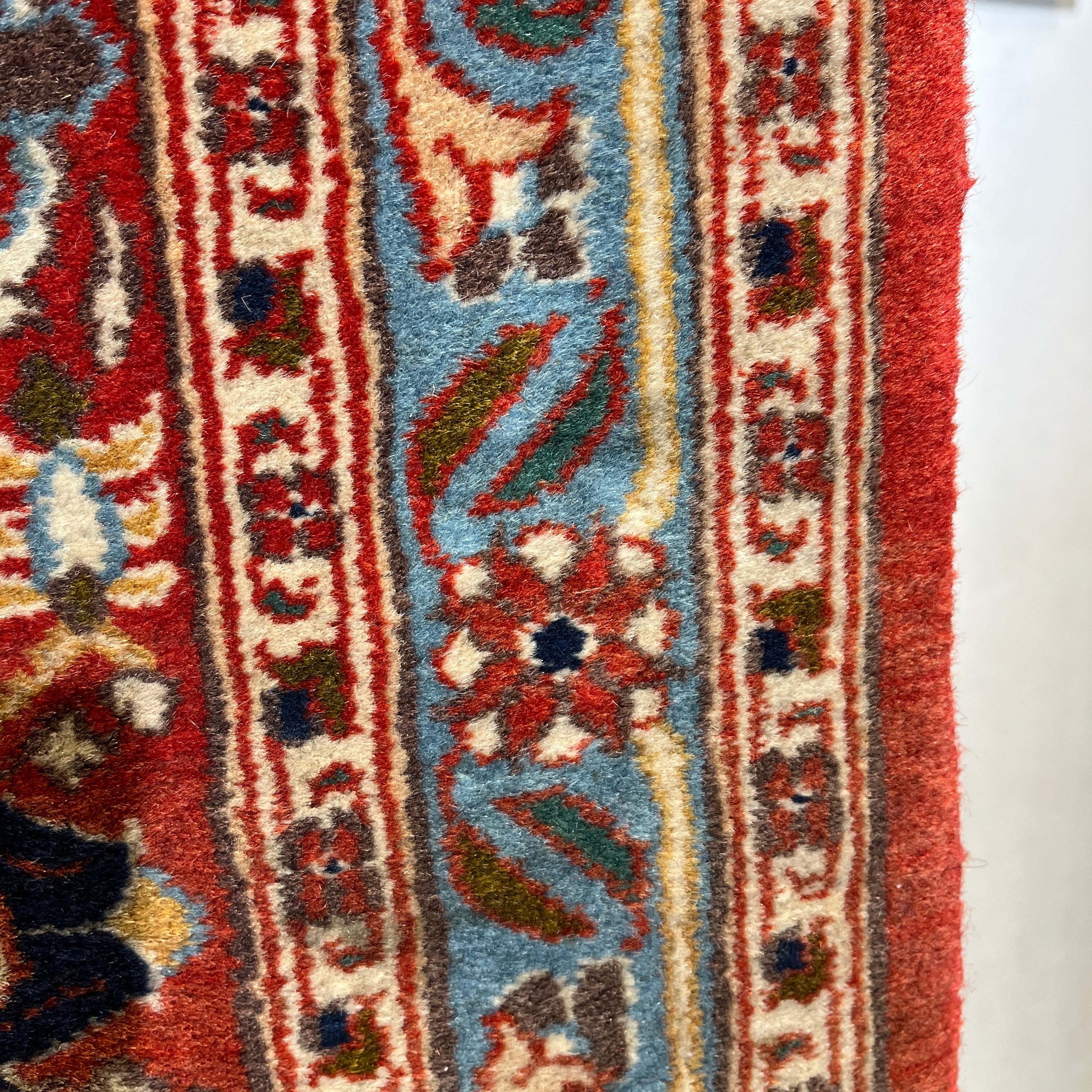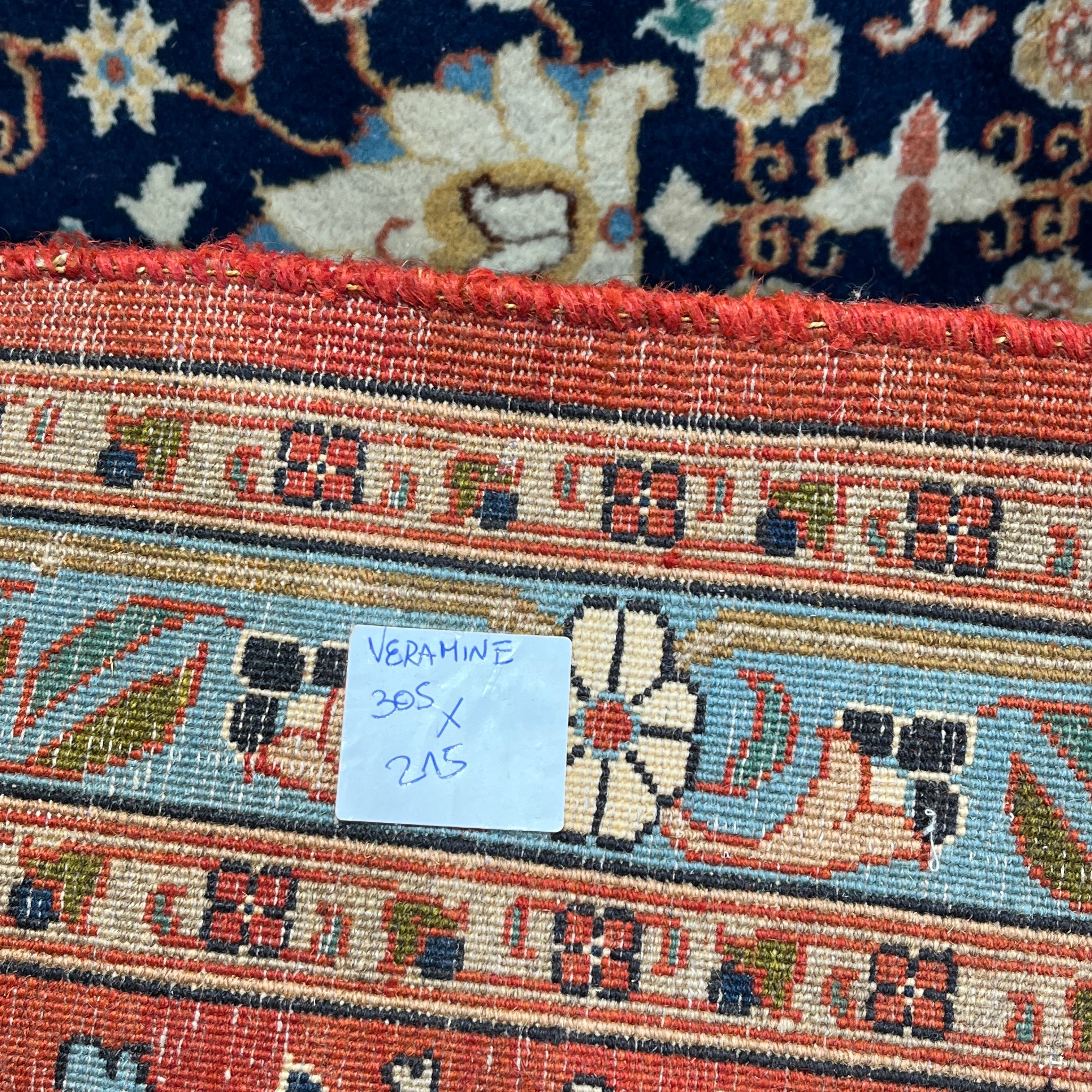 Alfombra persa Vehrahine hecha de lana tejida a mano y teñida con tintes naturales de origen vegetal. Estas alfombras son tejidas a mano por pastores de las zonas rurales de Hamadán, en el noroeste de Irán. Se caracterizn por su diseño de patrón repetitivo conocido como mina khani. Este diseño se compone de hileras de flores conectadas por líneas en tonos azules, rojos y crema, con detalles en indigo. Sus cenefas son predominantemente rojas, con patrones florales y geométricos.