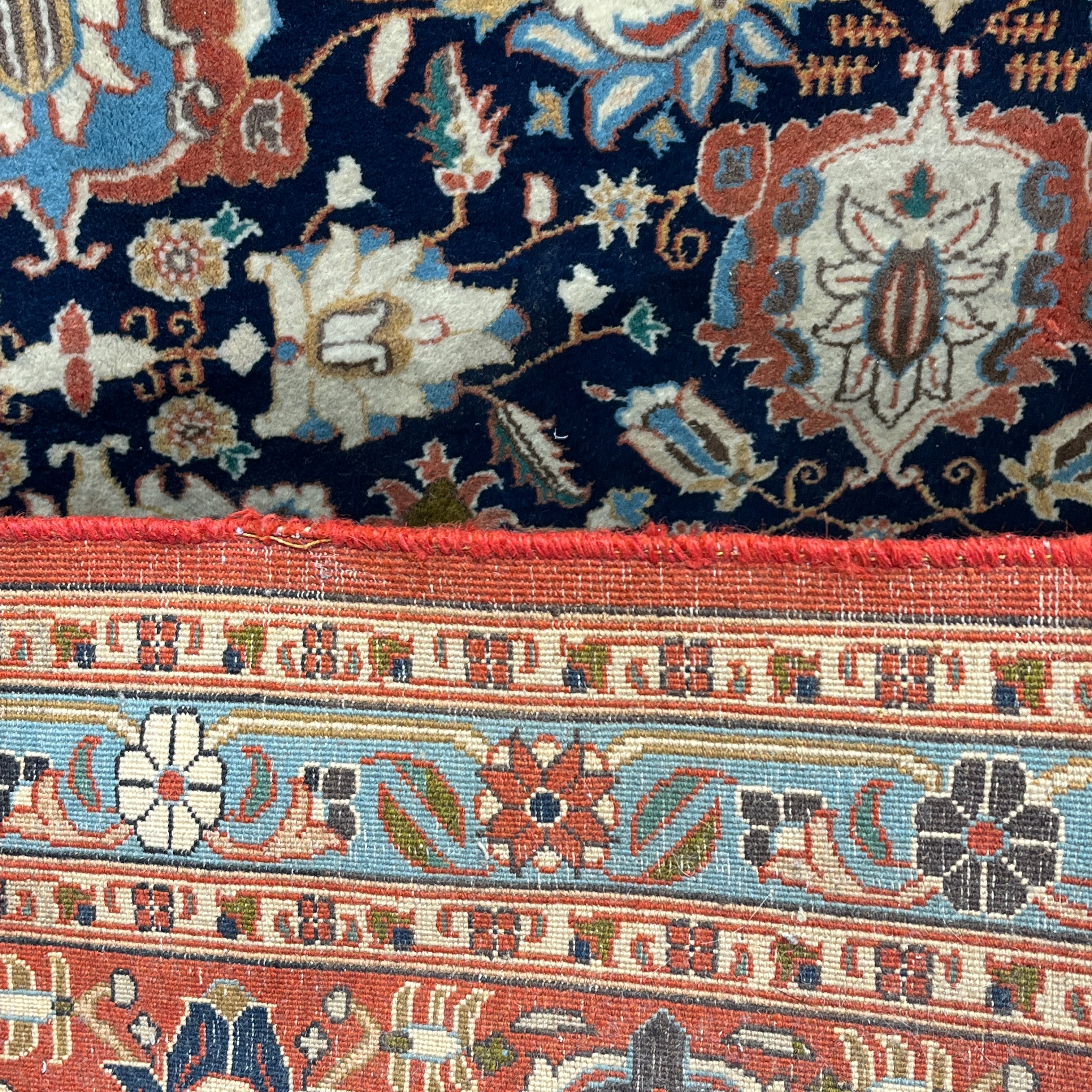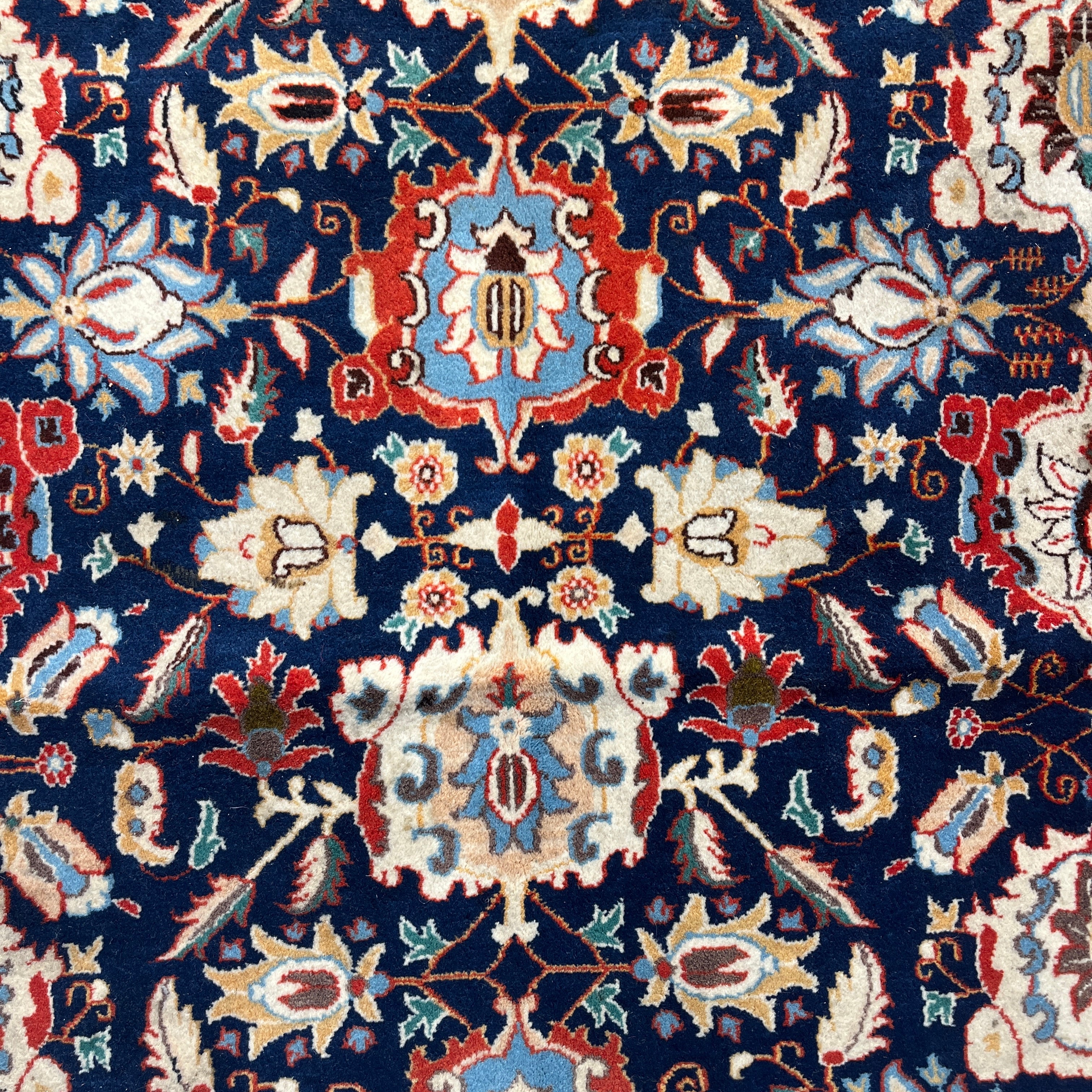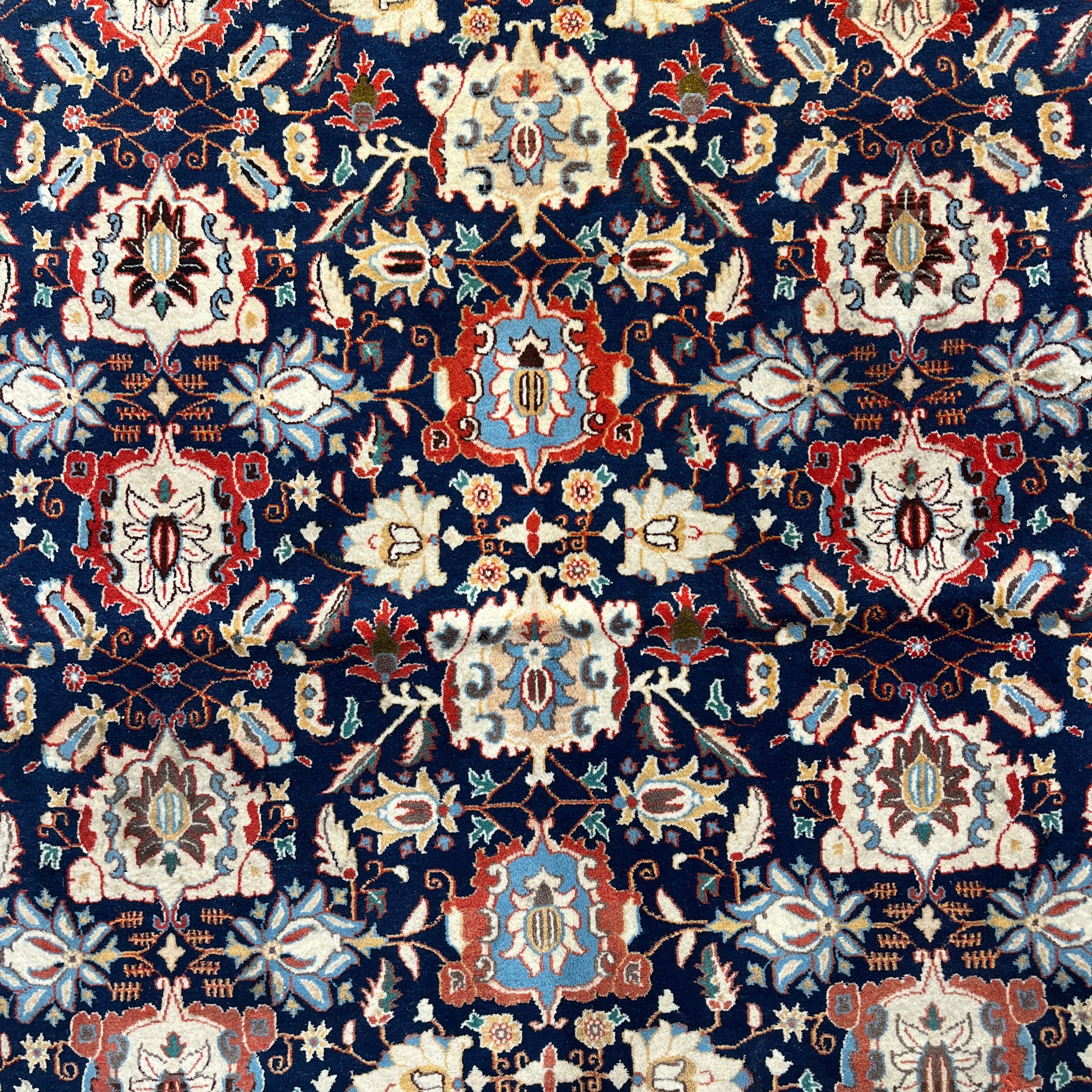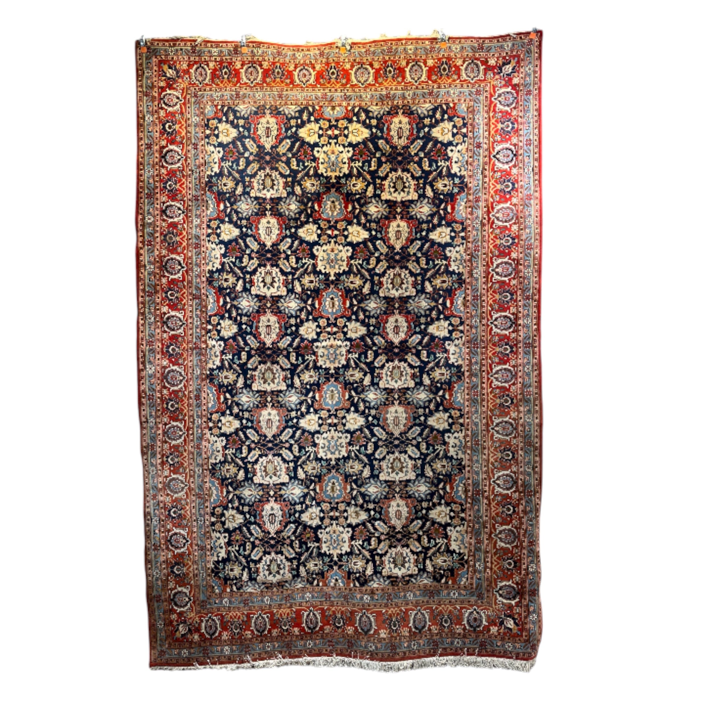 Alfombra persa Vehrahine hecha de lana tejida a mano y teñida con tintes naturales de origen vegetal. Estas alfombras son tejidas a mano por pastores de las zonas rurales de Hamadán, en el noroeste de Irán. Se caracterizn por su diseño de patrón repetitivo conocido como mina khani. Este diseño se compone de hileras de flores conectadas por líneas en tonos azules, rojos y crema, con detalles en indigo. Sus cenefas son predominantemente rojas, con patrones florales y geométricos.
