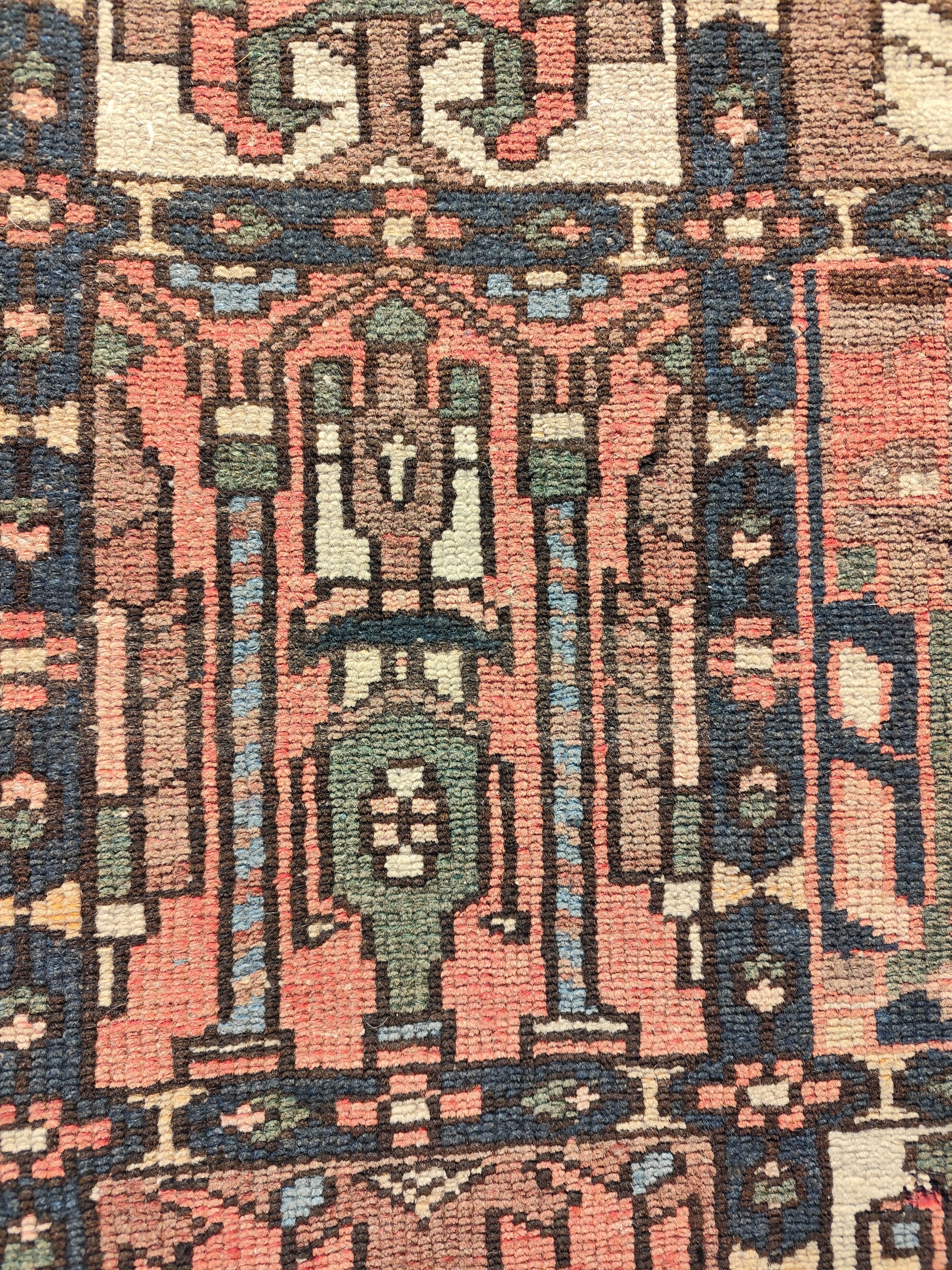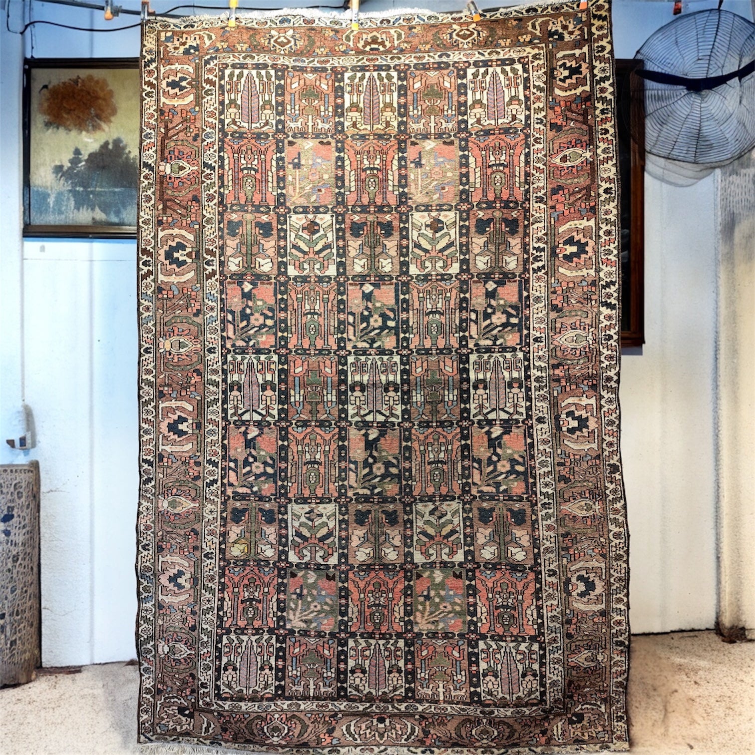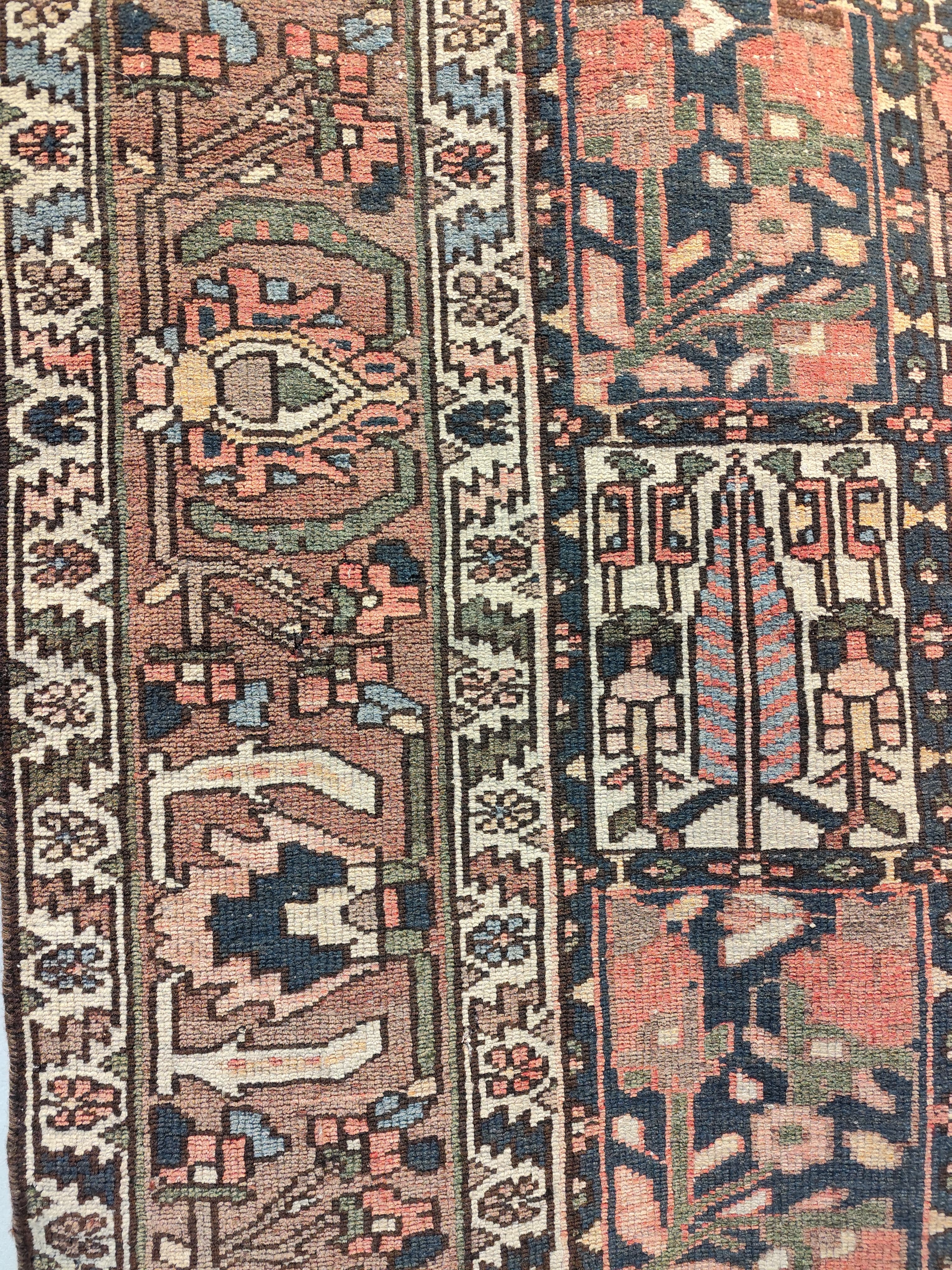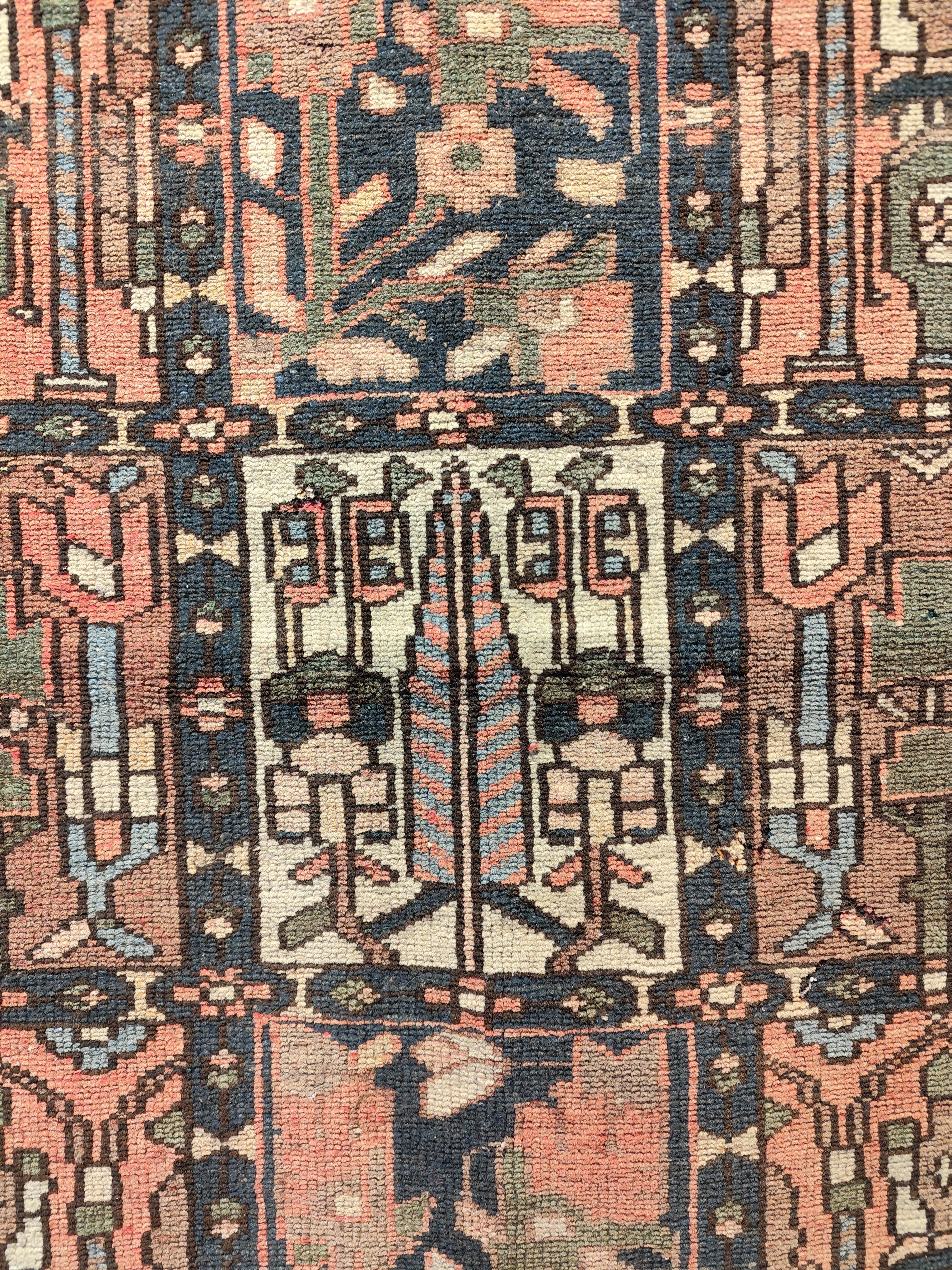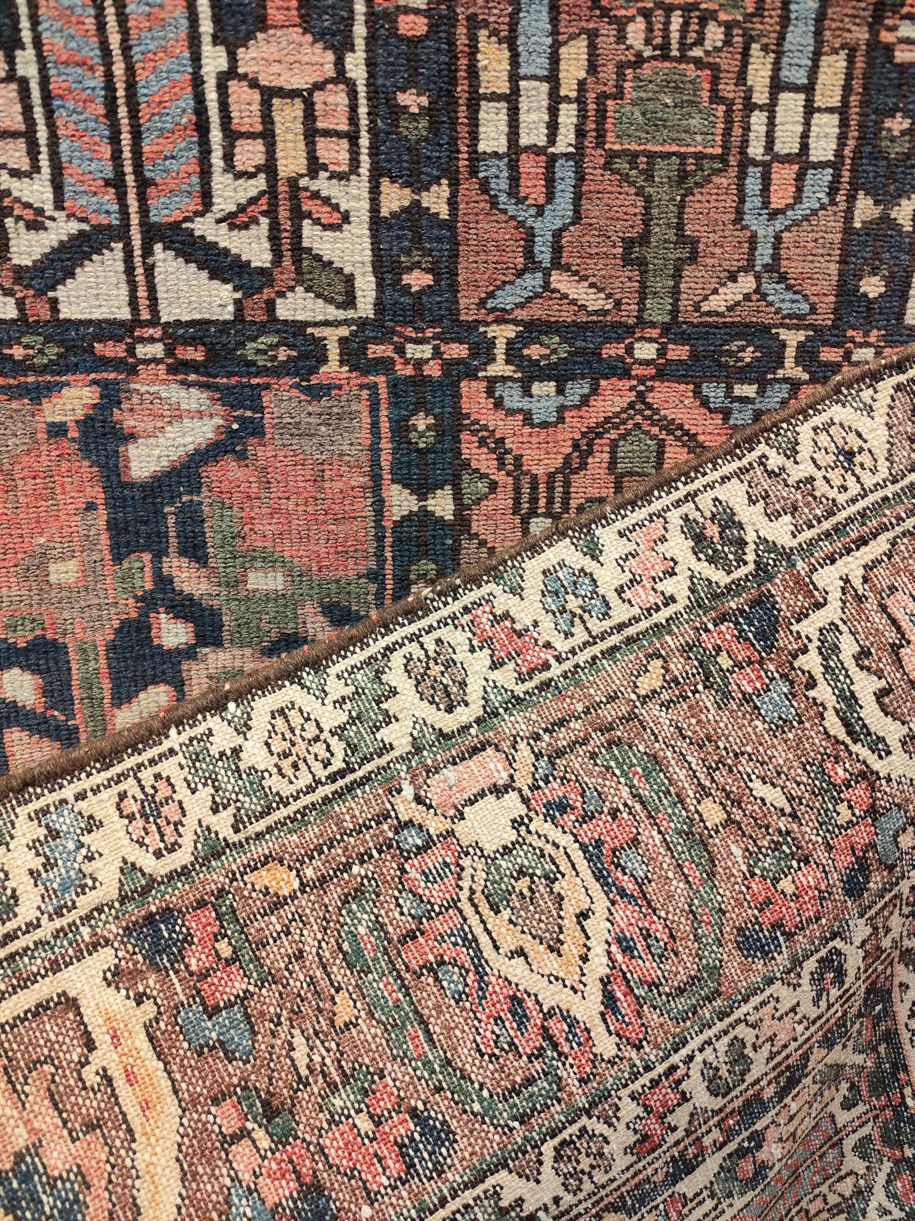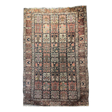 Preciosa alfombra persa Backthiari, fabricada por la tribu nómada Backthiari en Irán, hecha de lana tejida a mano. Se trata de una alfombra persa tradicional, reconocida por su resistencia al tiempo, debido al uso de lana gruesa y de alta calidad. Se conocen por sus patrones que representan jardines con motivos de cuadros o medallones centrales, a menudo con representaciones de árboles de la vida. Los motivos florales y geométricos son comunes.