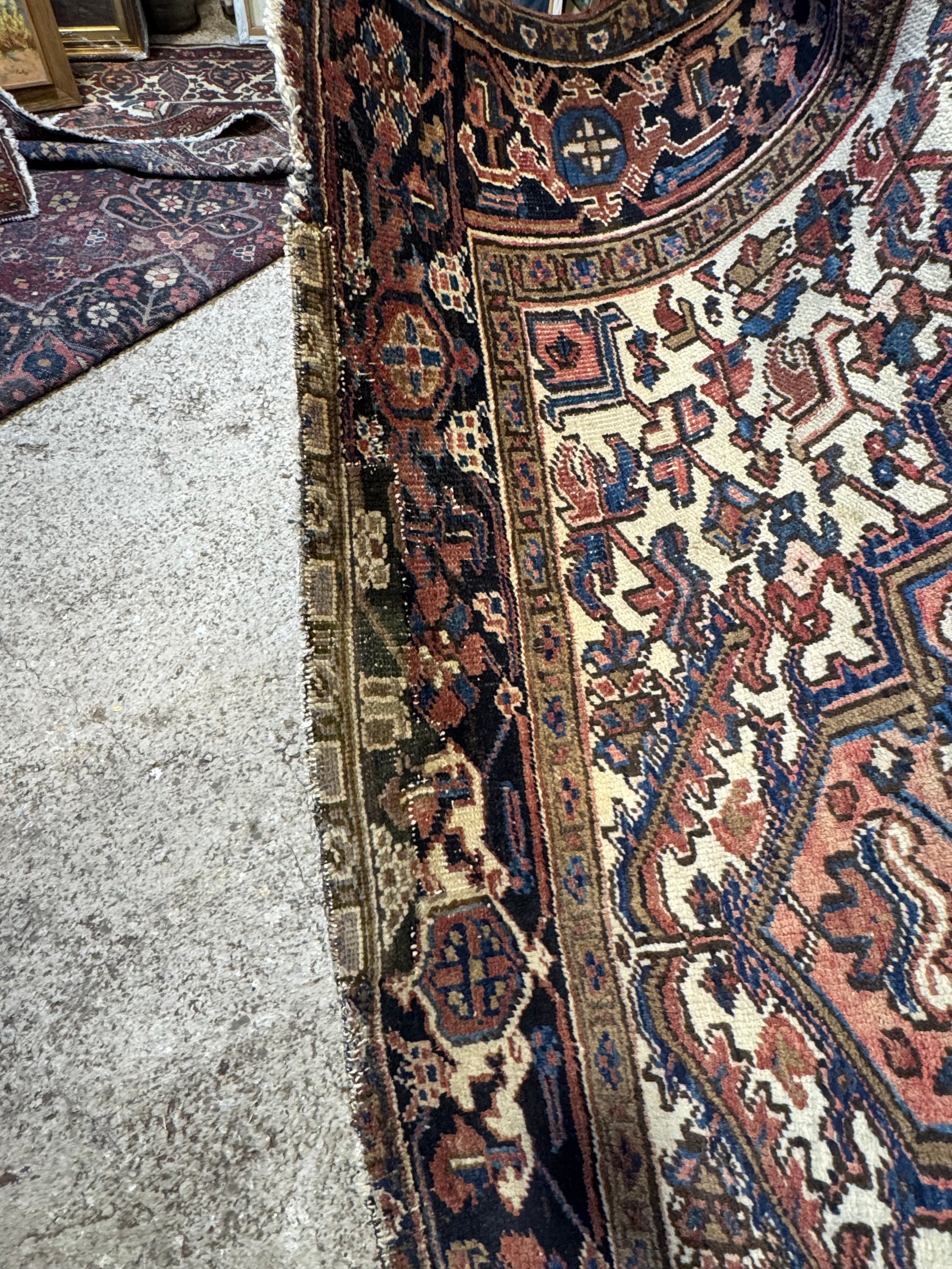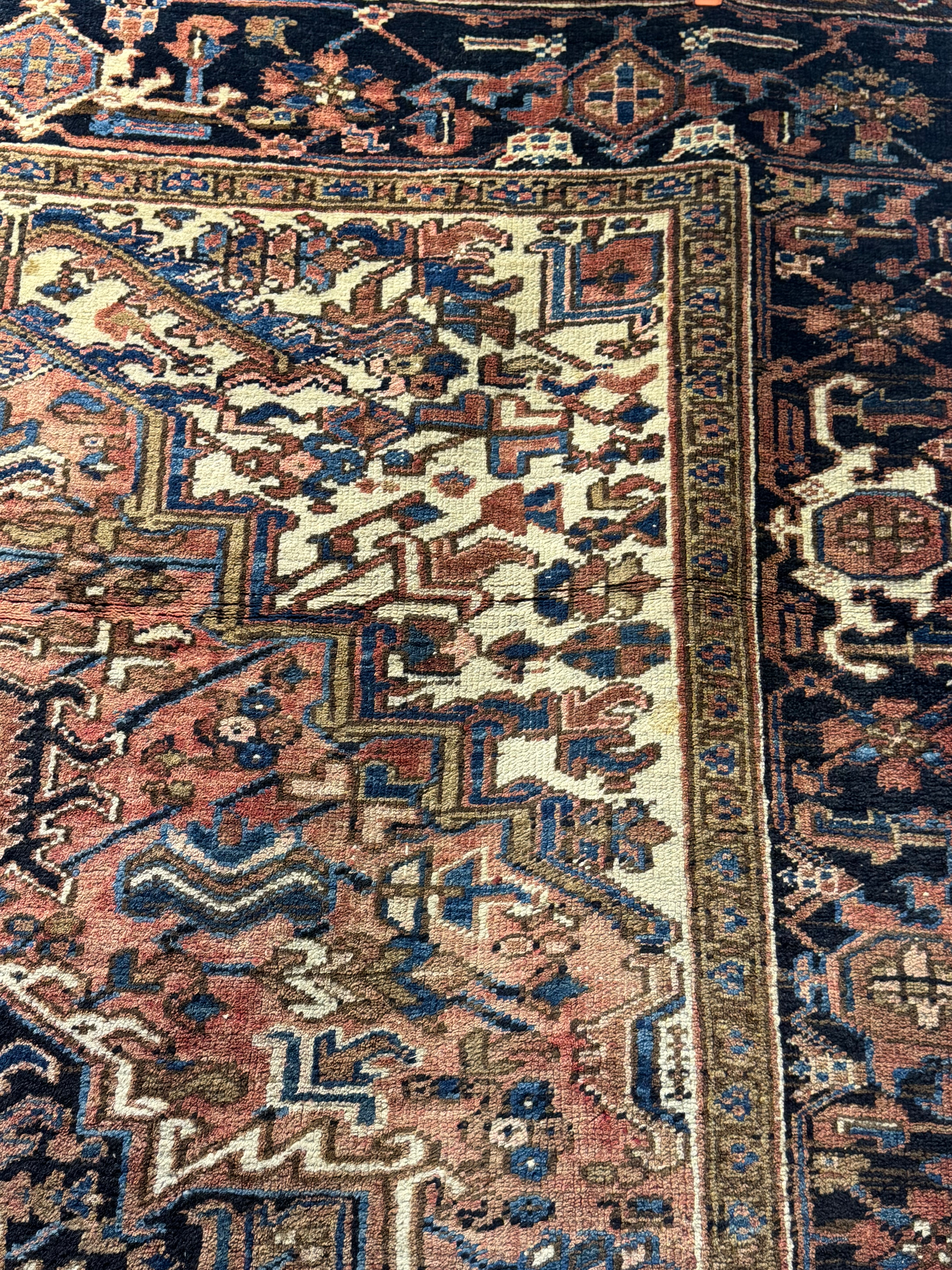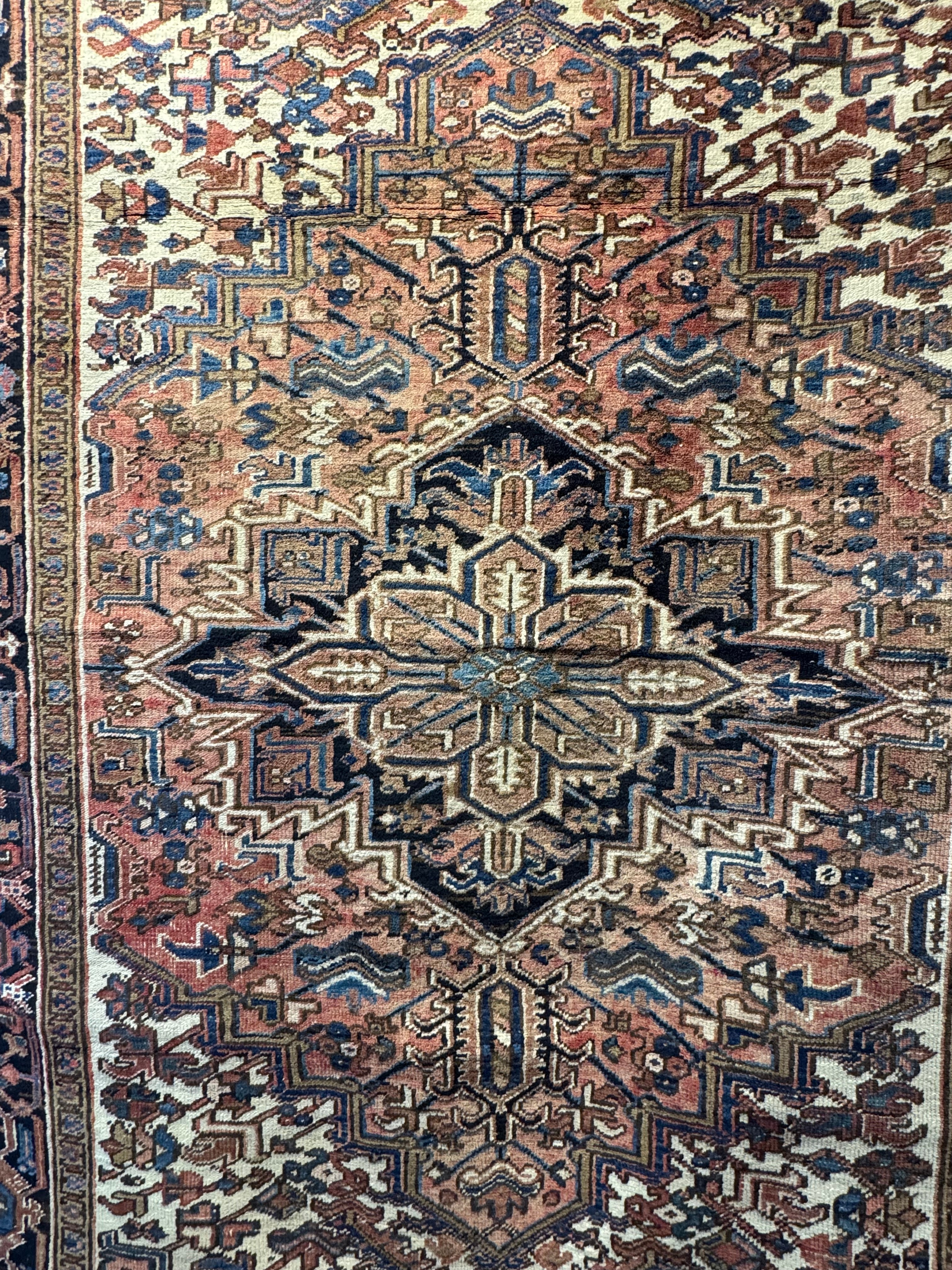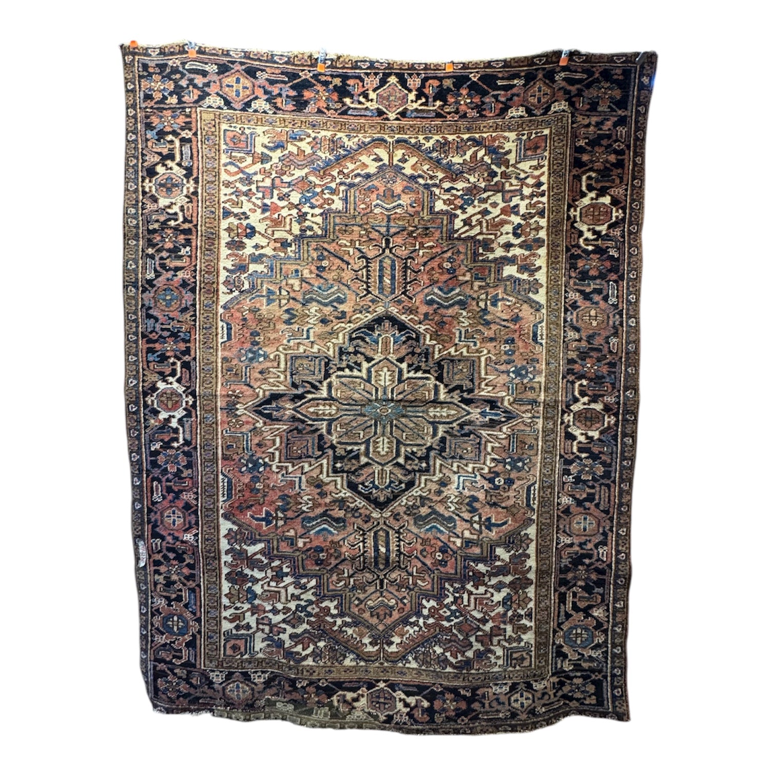 Bella alfombra persa Heriz, de origen Iraní, hecha de lana anudada y teñida a mano. Sus diseños, transmitidos por tribus nómadas persas, se caracterizan por formas geométricas llamativas, con motivos simétricos y angulares, a diferencia de otros diseños persas más curvos. Esta alfombra presenta un gran medallón central, delineado en un azul oscuro que atrae la vista hacia esa zona, una zona de jardín de fono naranjo con motivos geométricos y detalles en las esquinas color marfil. Su cenefa, de un grosor importante, hace una repetición geométrica que reutiliza los colores usados en la composición, construyendo una trenza que enmarca el hipnótico tejido interior.
