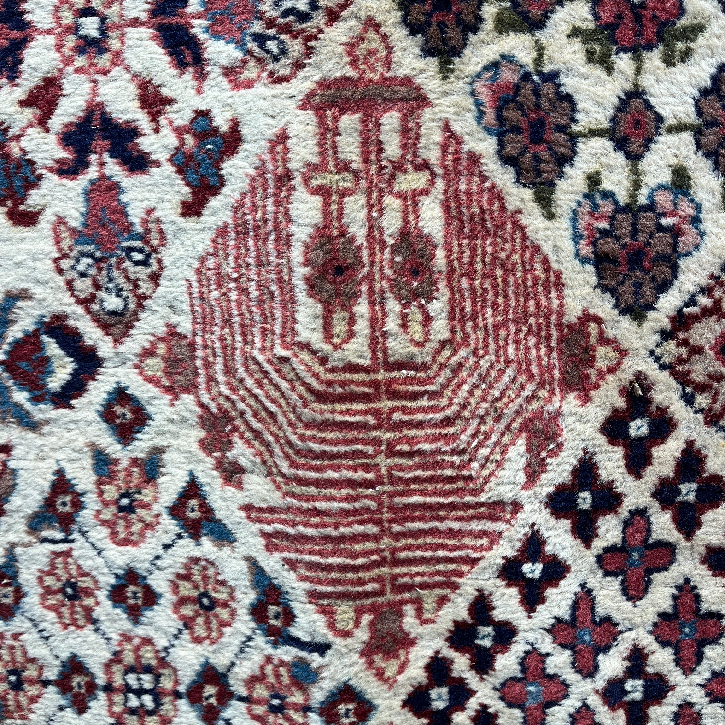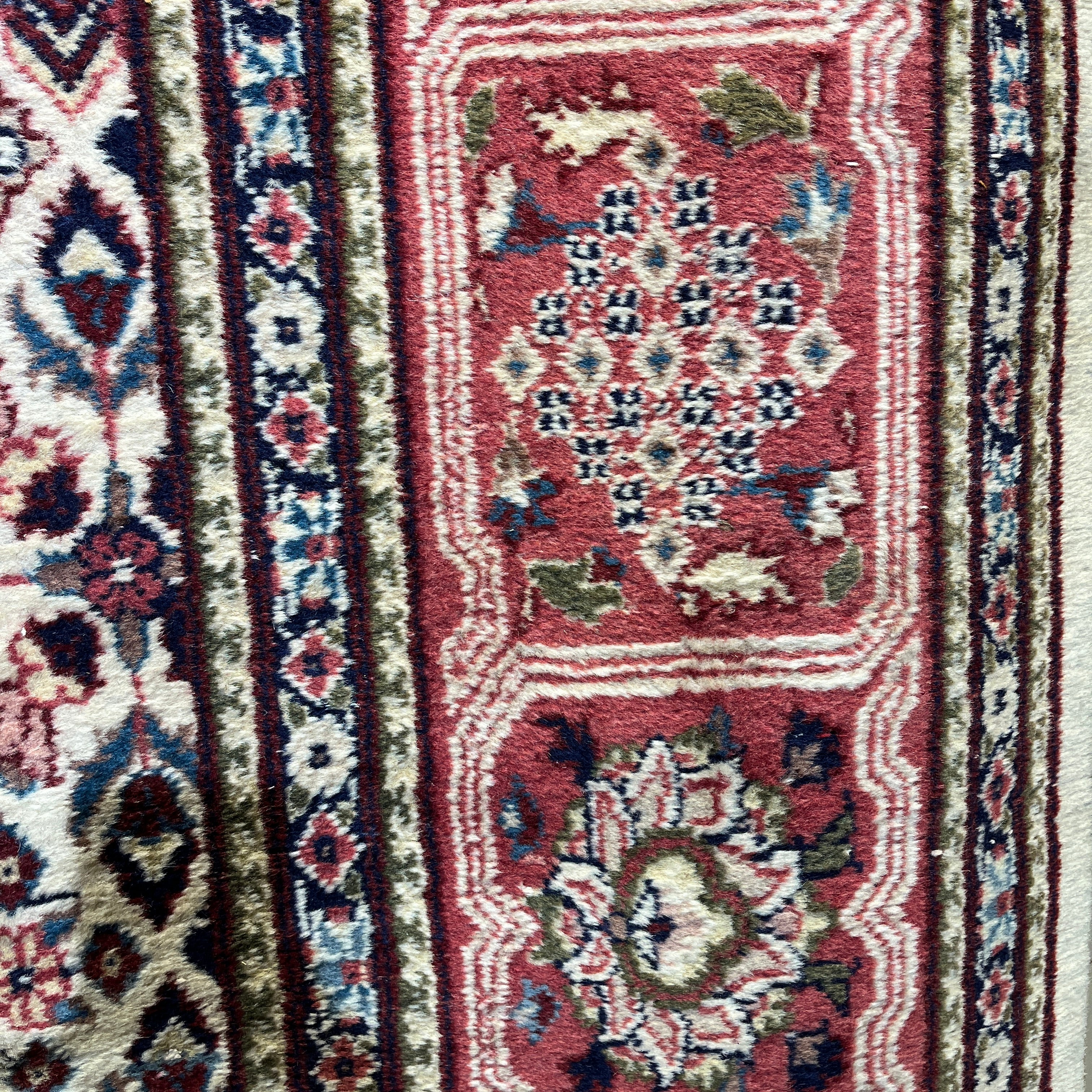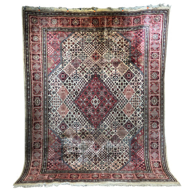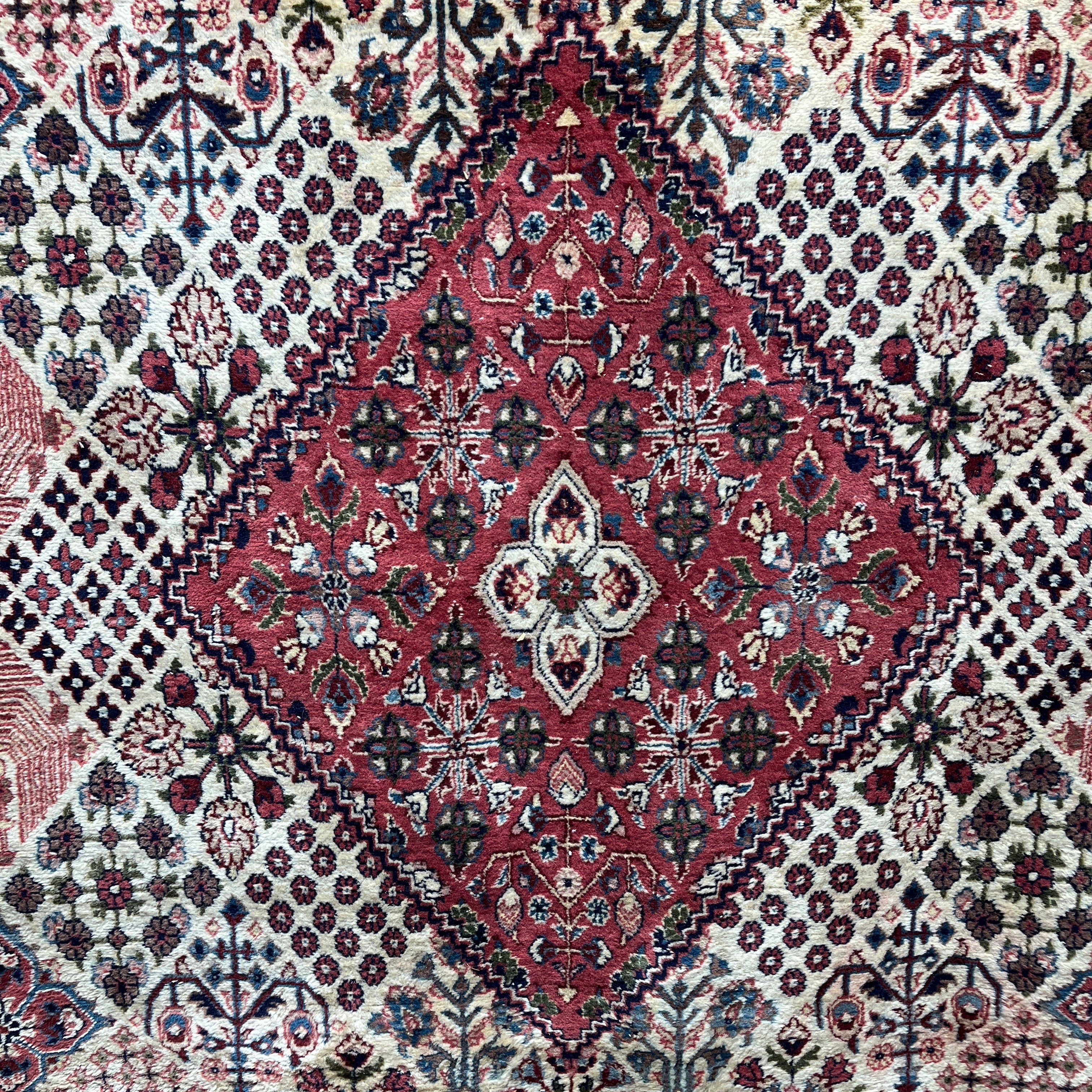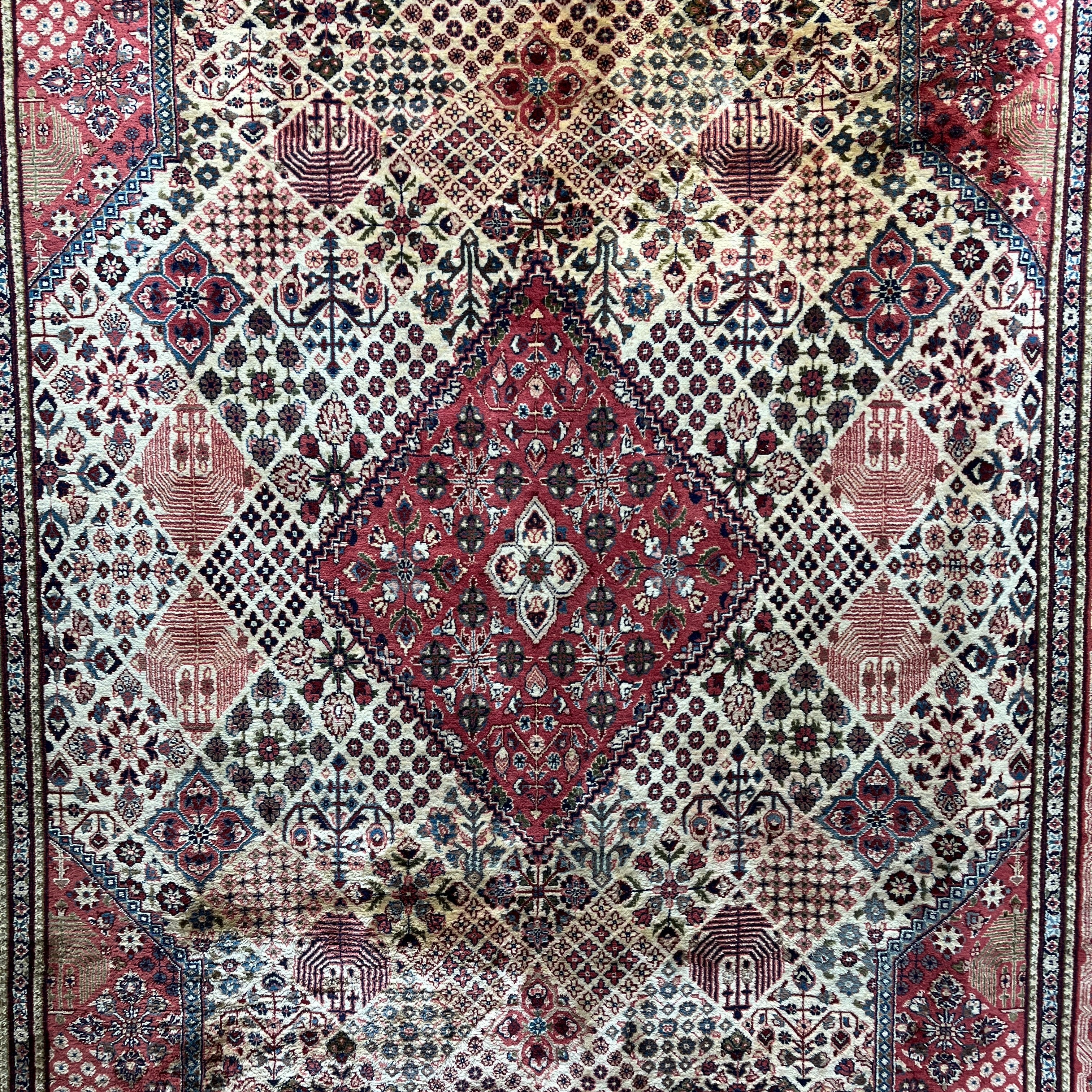 Bellísima alfombra persa Bijar, de origen iraní, hecha de lana anudada a mano y teñida con tintes vegetales. Su diseño de gran medallón central, característico del estilo Bijar, está rodeado de una zona de jardín de fondo color marfil con motivos vegetales, con detalles en verde e índigo,  en patrones similares a azulejos. Las esquinas irregulares tienen un fondo rosa, incorporando un nuevo patrón que mezcla geometría y motivos florales. Finalmente su cenefa tiene una cadena de motivos florales de gran tamaño, en combinaciones de rosa, azul y marfil.