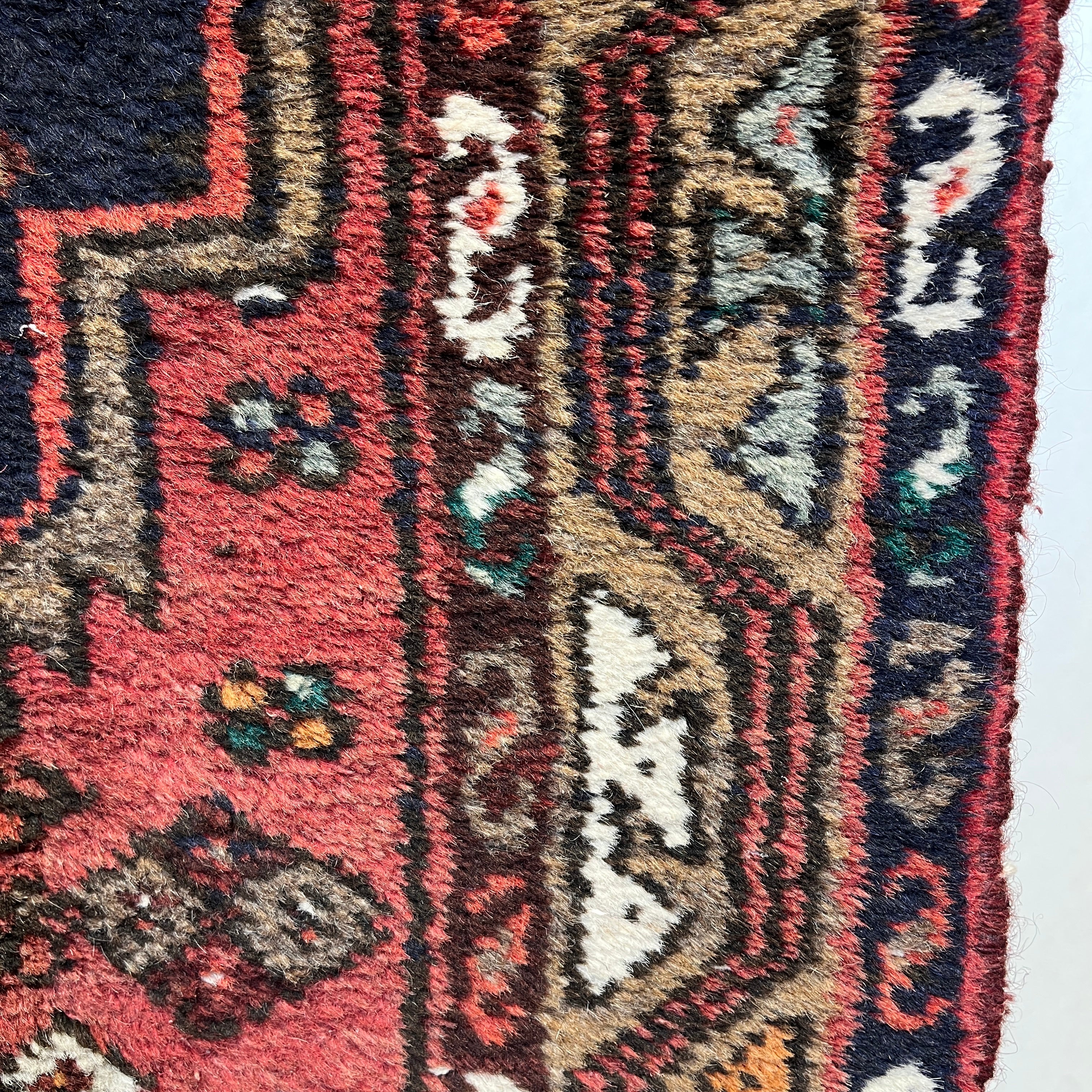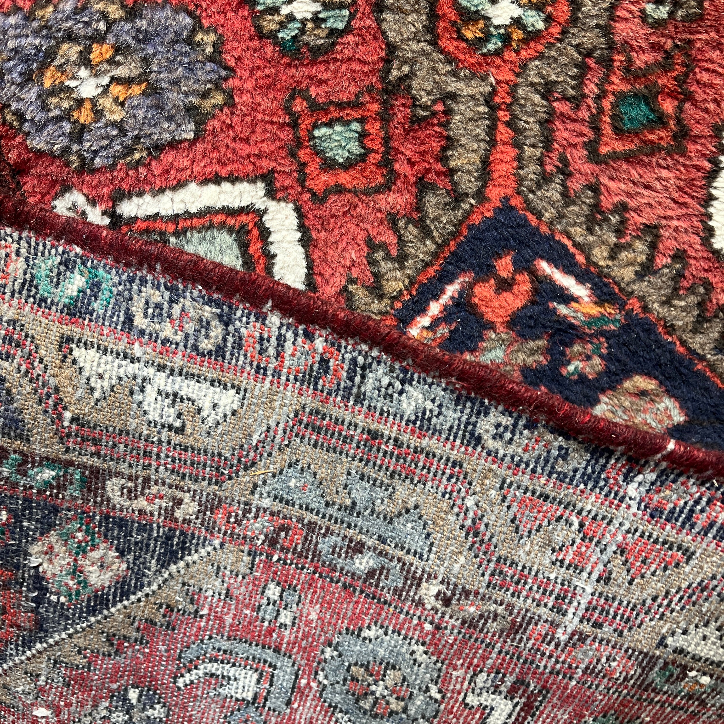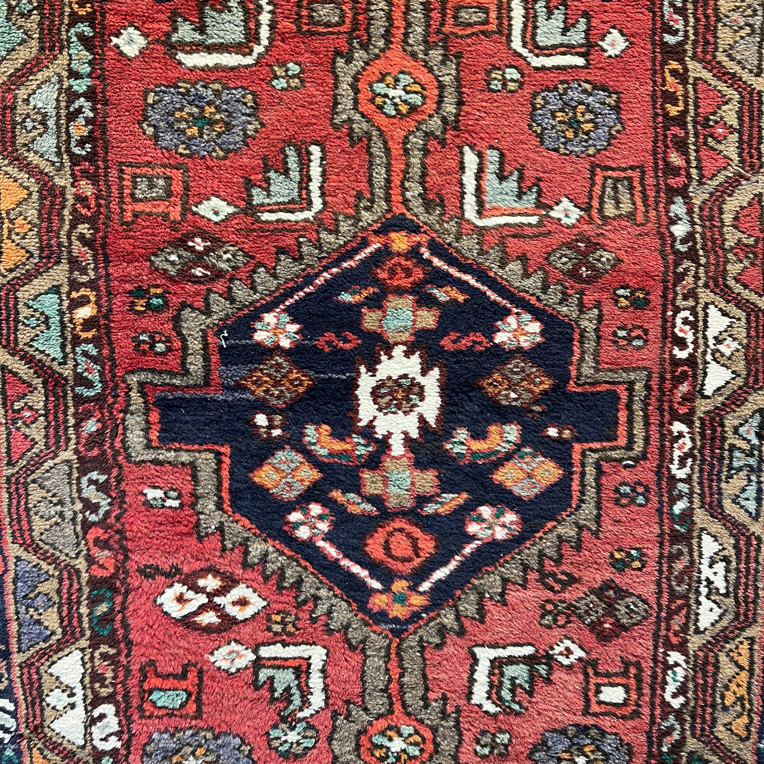 Preciosa alfombra pasillo de origen Iraní, hecha de lana anudada a mano, con diseños tribales. Esta pieza, en tonos rojos y azules, con detalles en blanco y amarillo, tiene un intrincado diseño geométrico que juega con la repetición de motivos, haciendo que se genere una trenza de medallones y decoraciones en su zona central. Esta pieza mezcla tanto figuras geométricas como motivos florales en su zona interior, mientras que sus cenefas, e las que el amarillo está más presente, hacen contrapunto al rojo y enmarcan el tejido.
