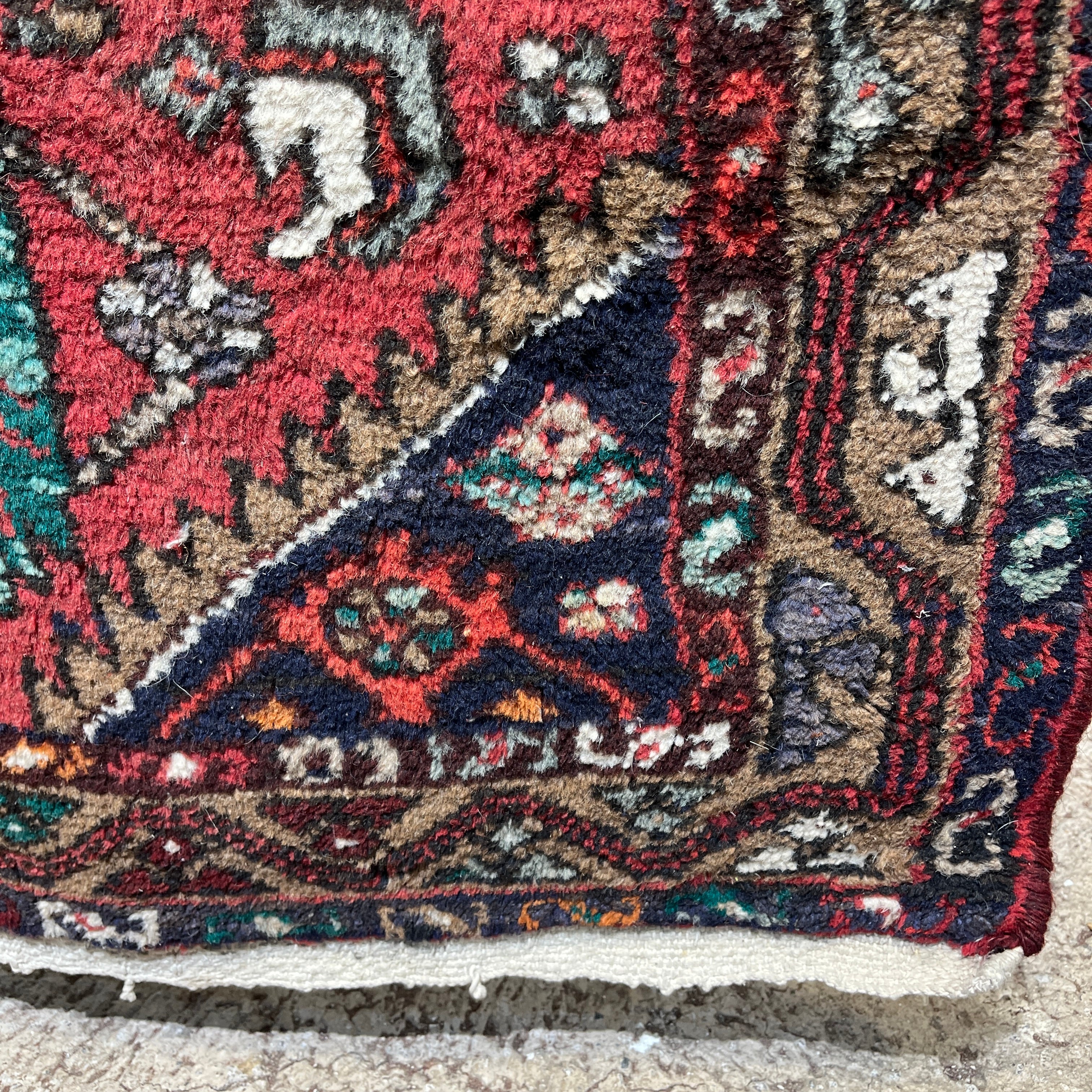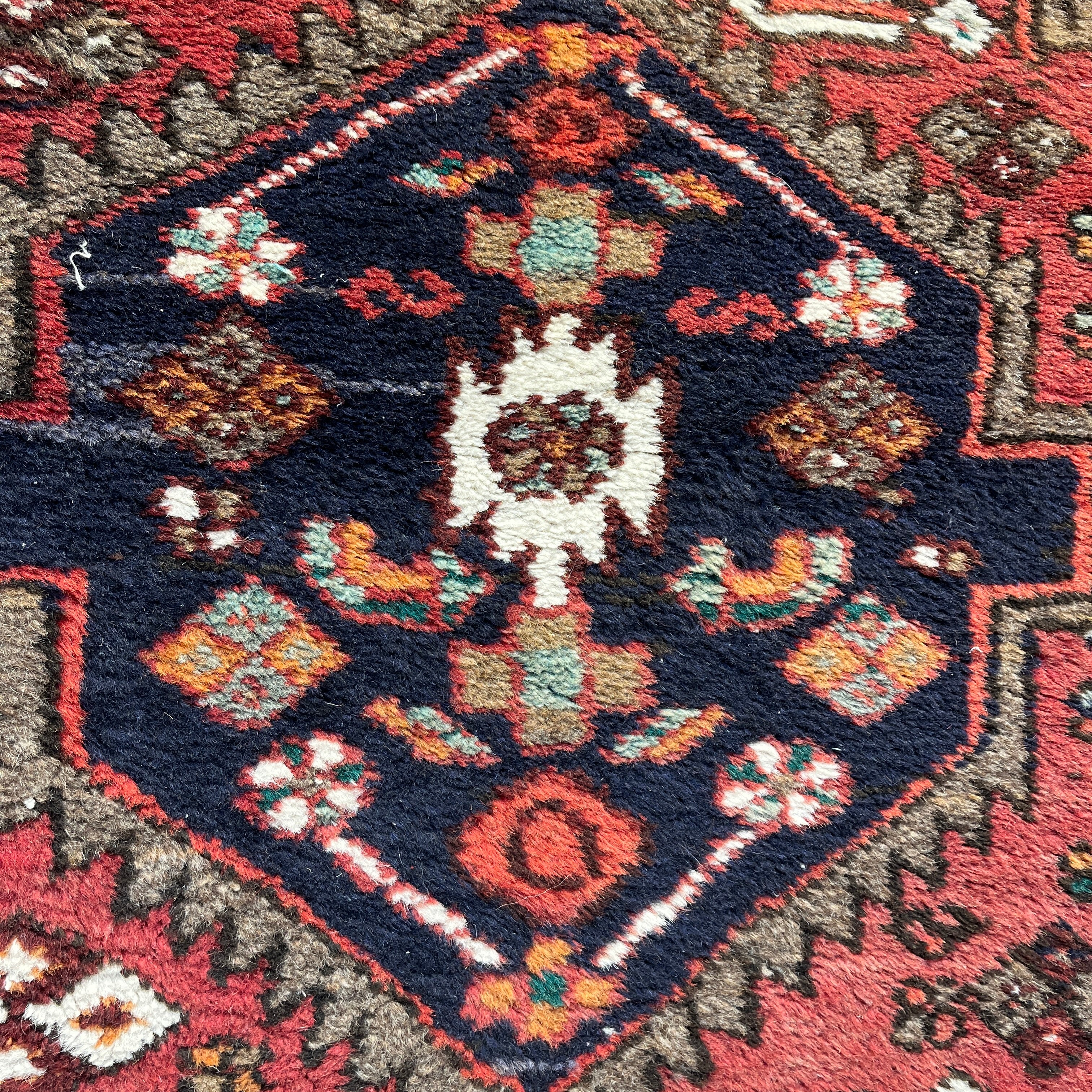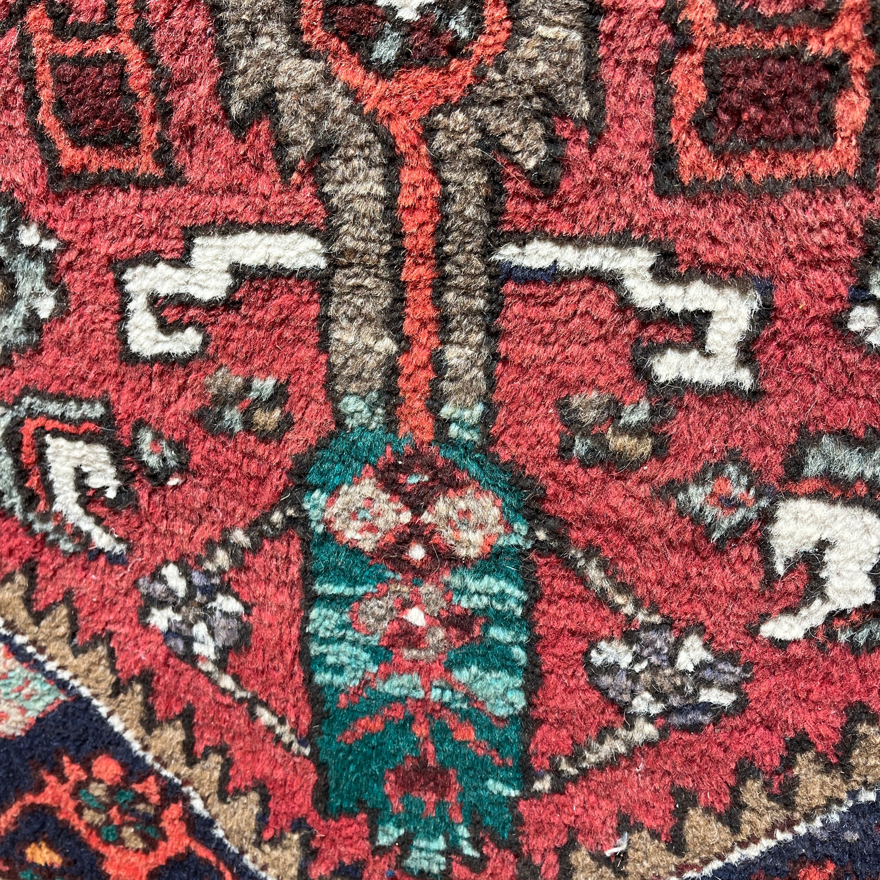 Preciosa alfombra pasillo de origen Iraní, hecha de lana anudada a mano, con diseños tribales. Esta pieza, en tonos rojos y azules, con detalles en blanco y amarillo, tiene un intrincado diseño geométrico que juega con la repetición de motivos, haciendo que se genere una trenza de medallones y decoraciones en su zona central. Esta pieza mezcla tanto figuras geométricas como motivos florales en su zona interior, mientras que sus cenefas, e las que el amarillo está más presente, hacen contrapunto al rojo y enmarcan el tejido.