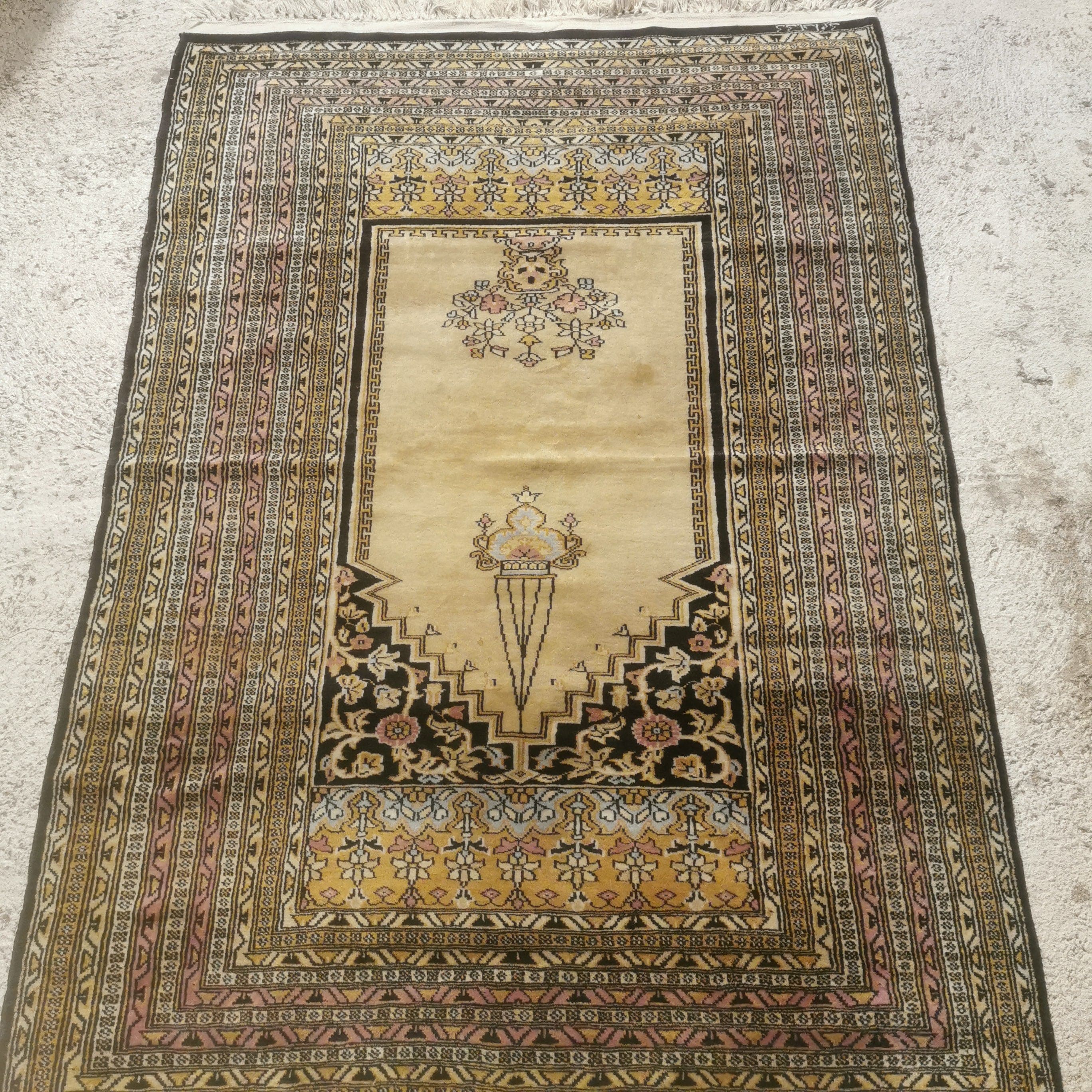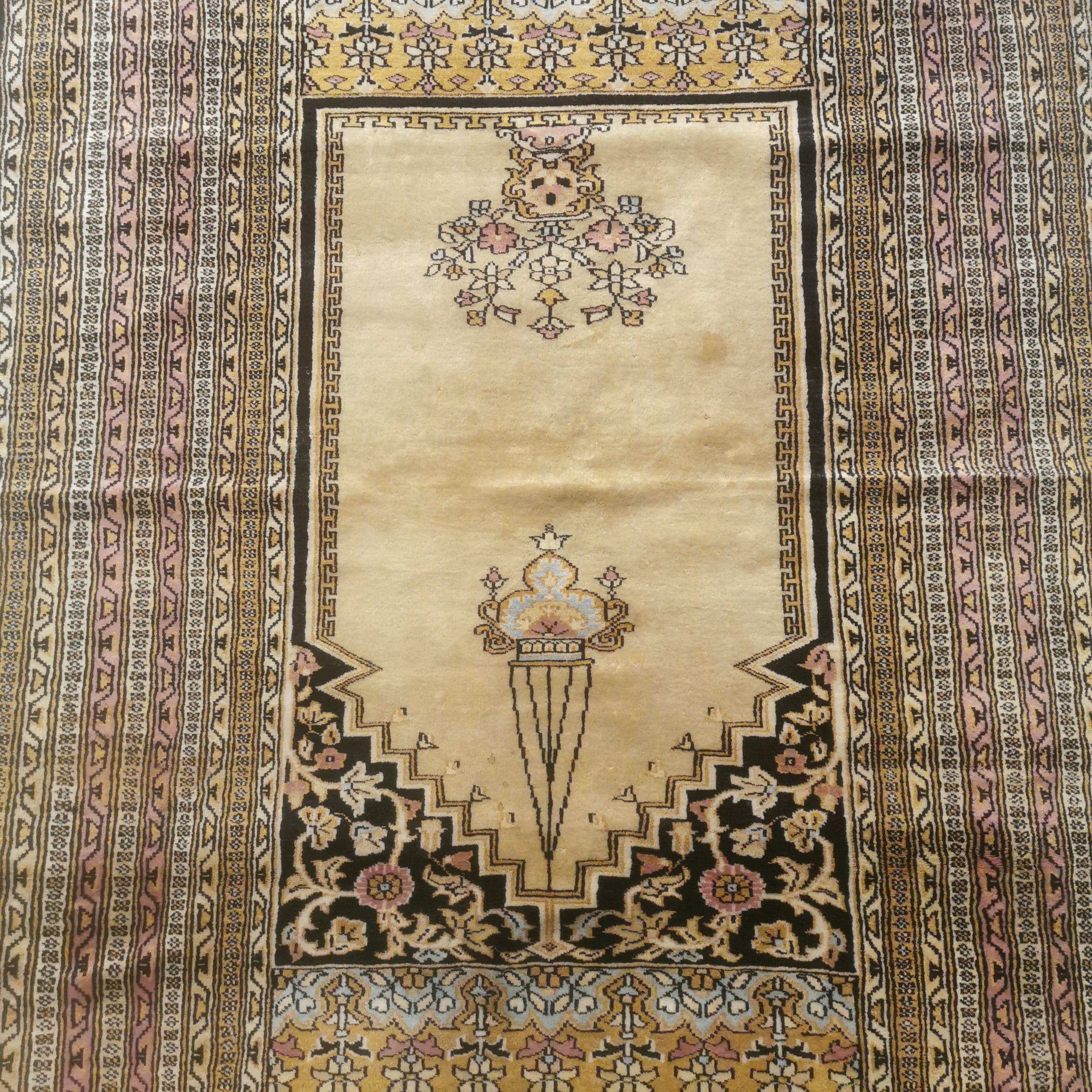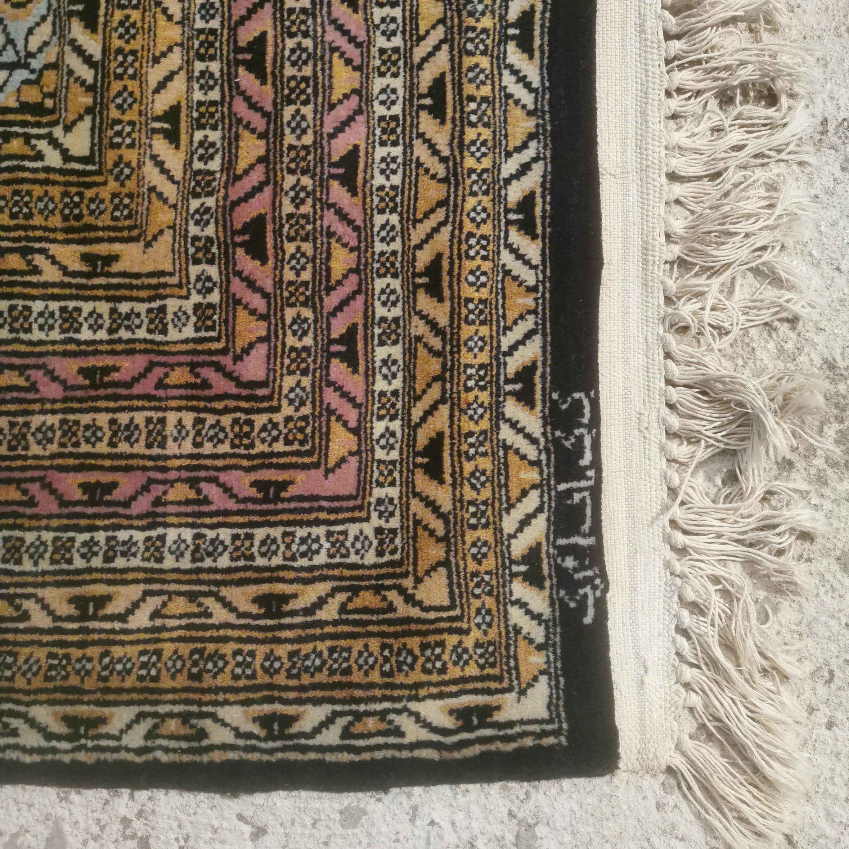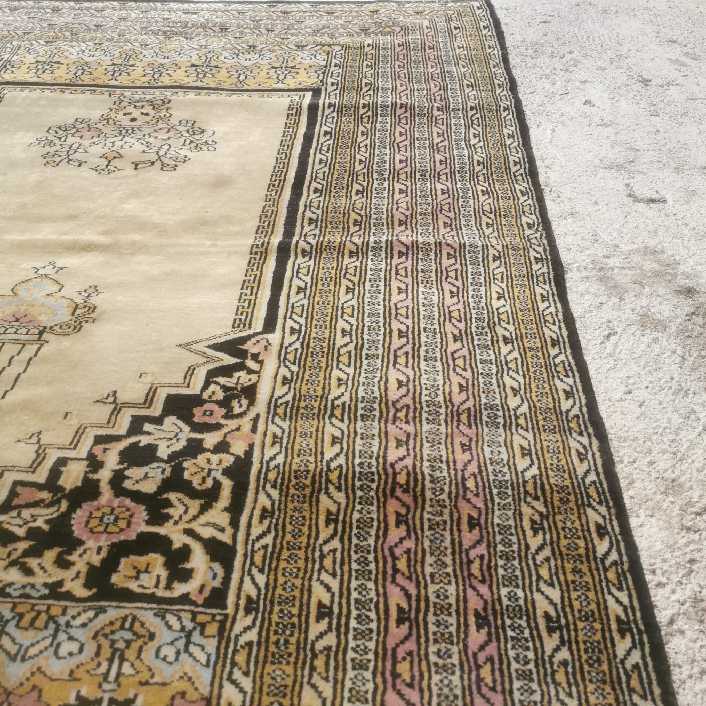 Hermosa alfombra Pakistaní de oración de lana y seda de unos 60 años de antigüedad.