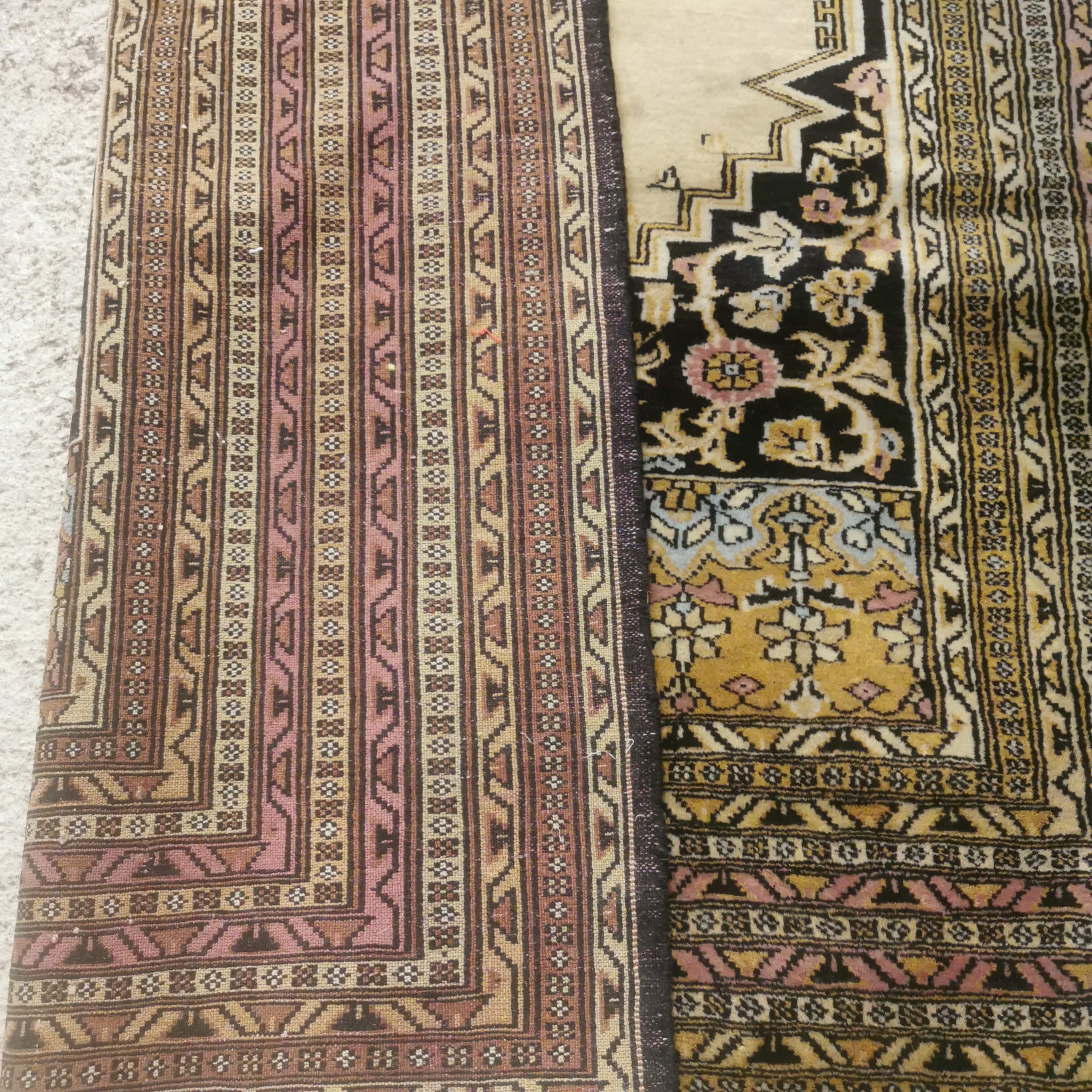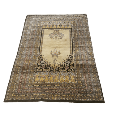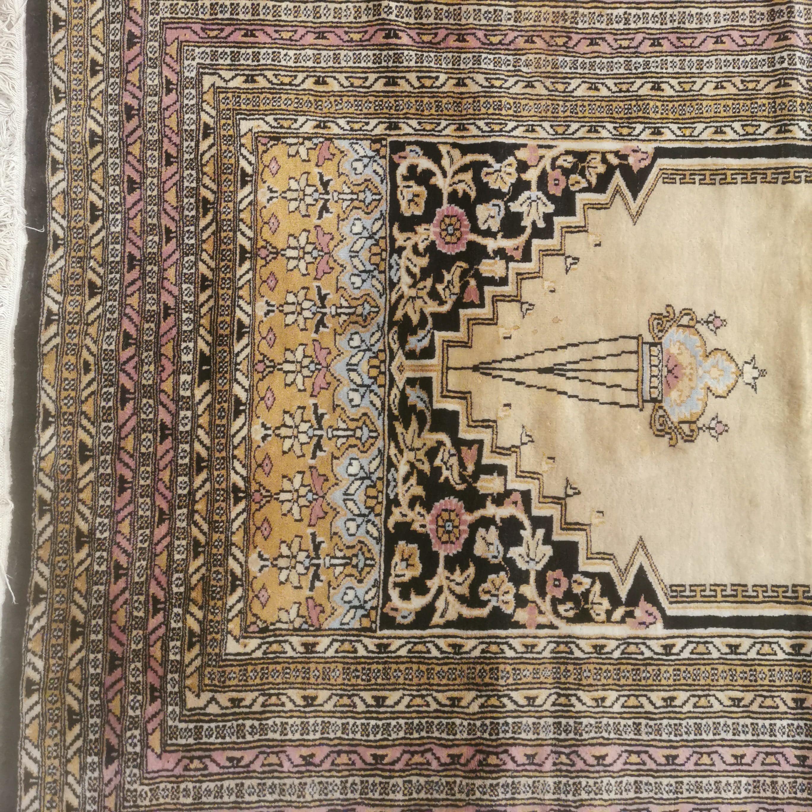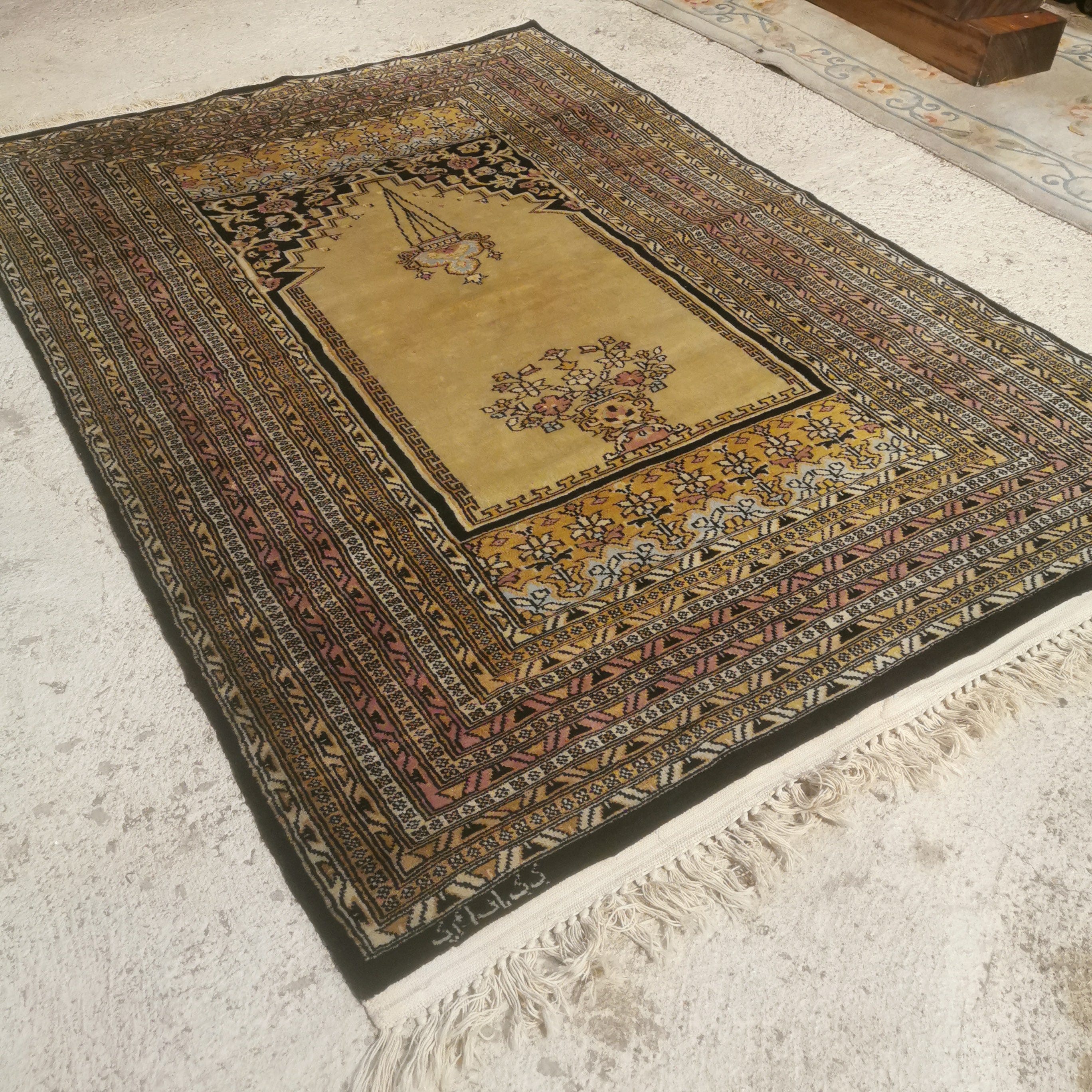Hermosa alfombra Pakistaní de oración de lana y seda de unos 60 años de antigüedad.