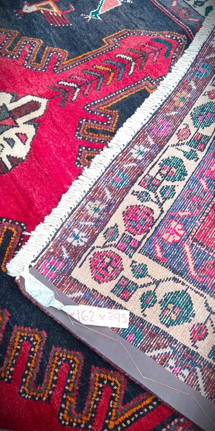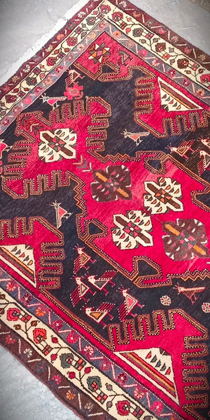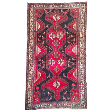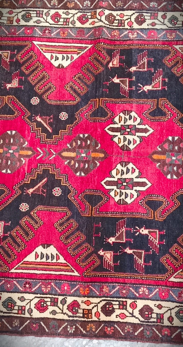 Bello contraste en sus colores, grandes y definidos diseños geométricos acompañados por figuras de aves.