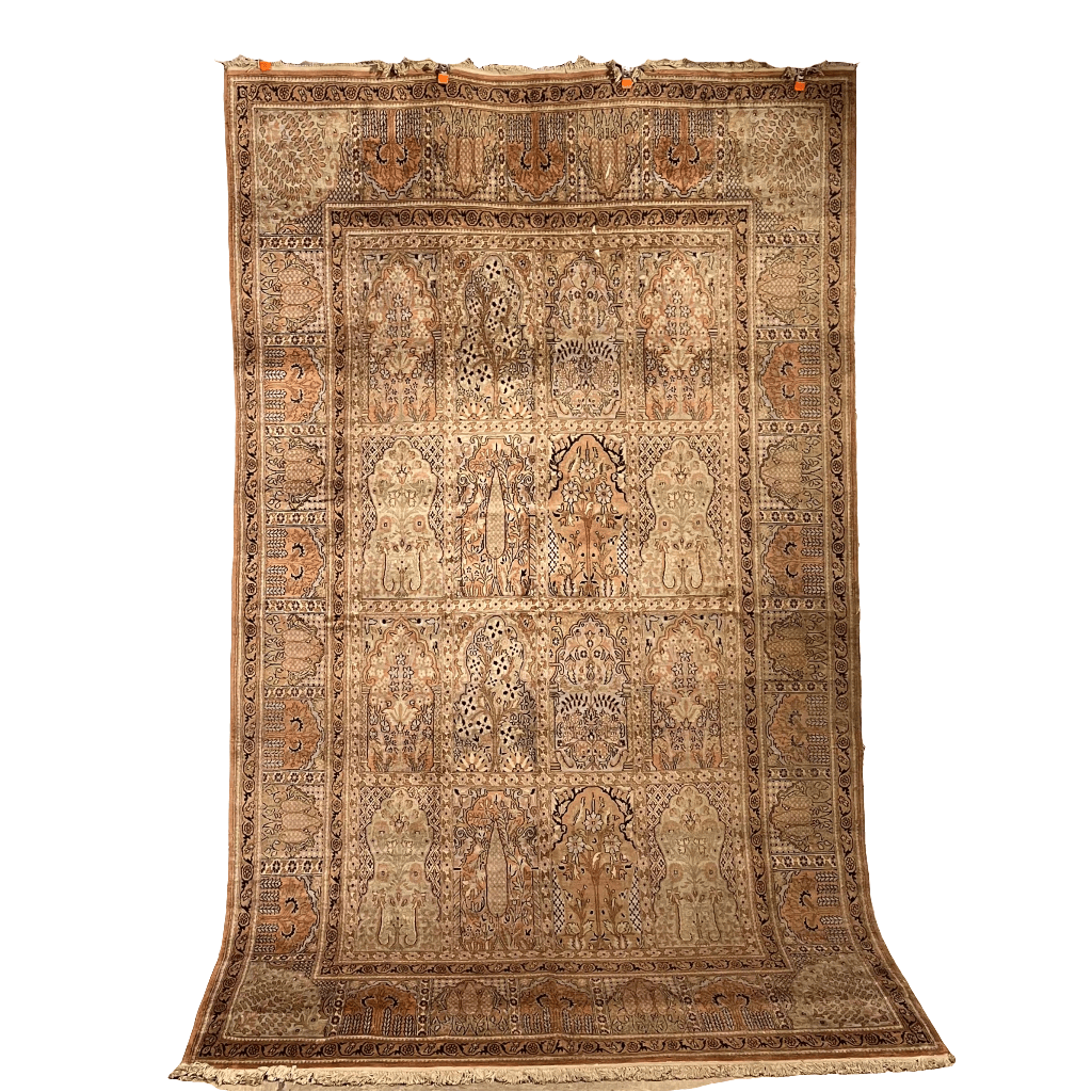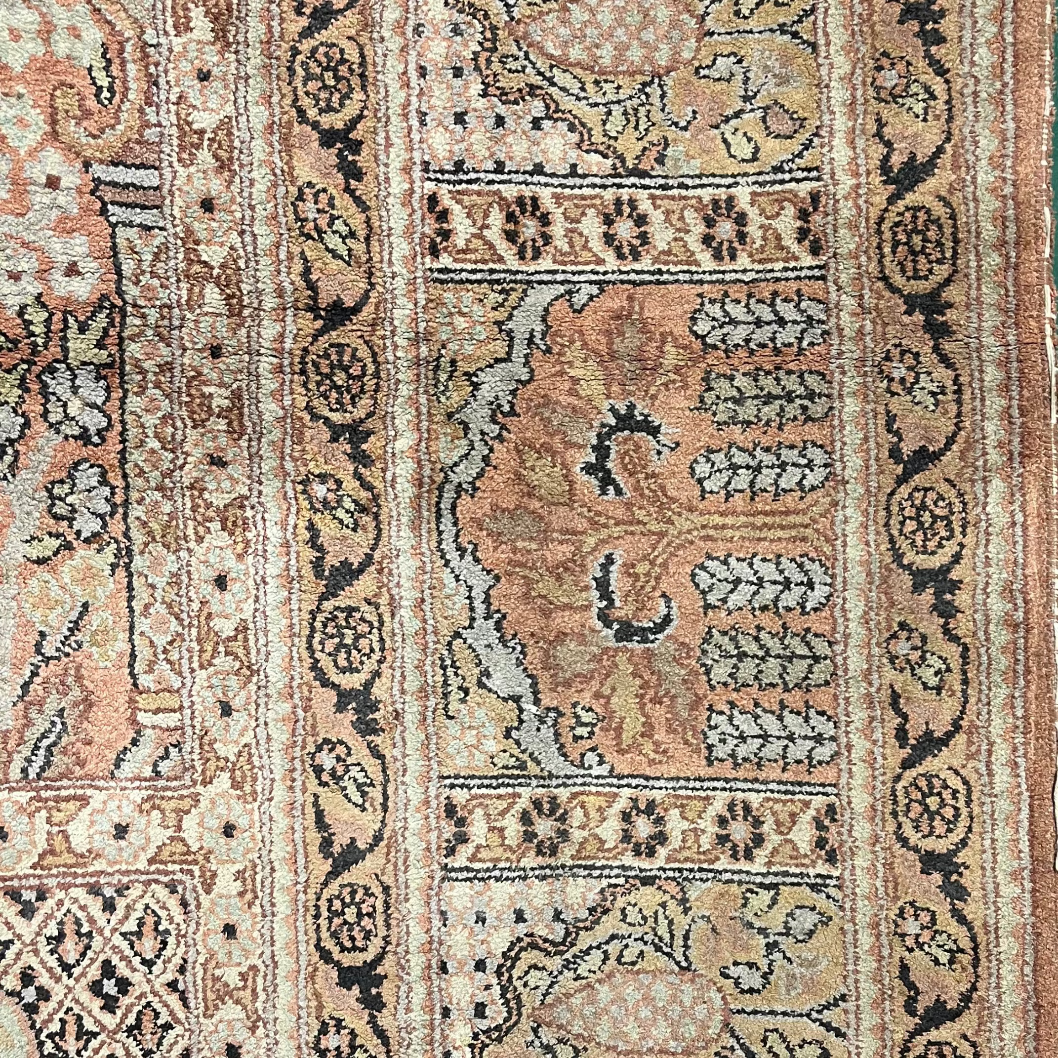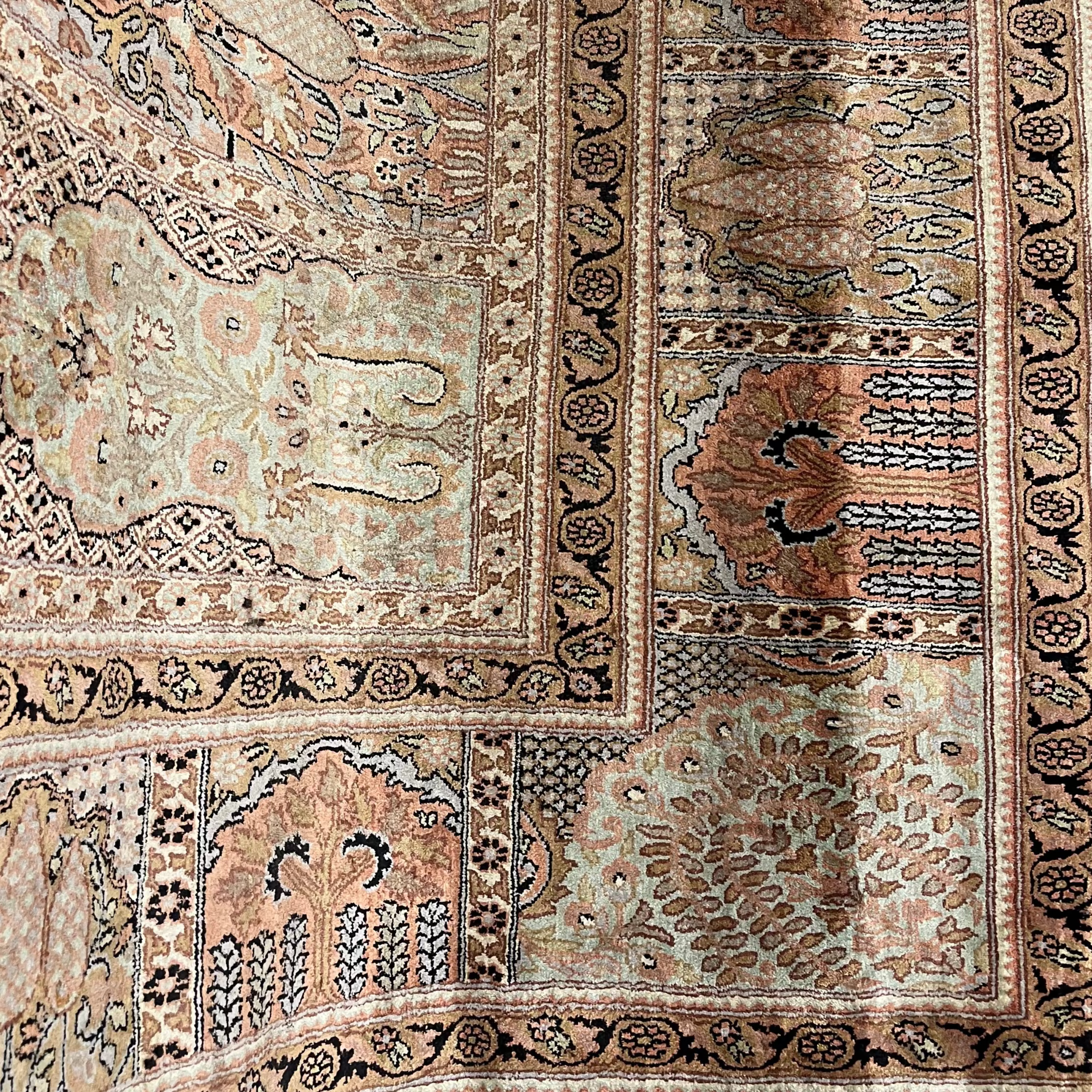 Fina y elegante alfombra india unidireccional, trabajada en lana y seda, con una guarda ancha y motivos tradicionales.