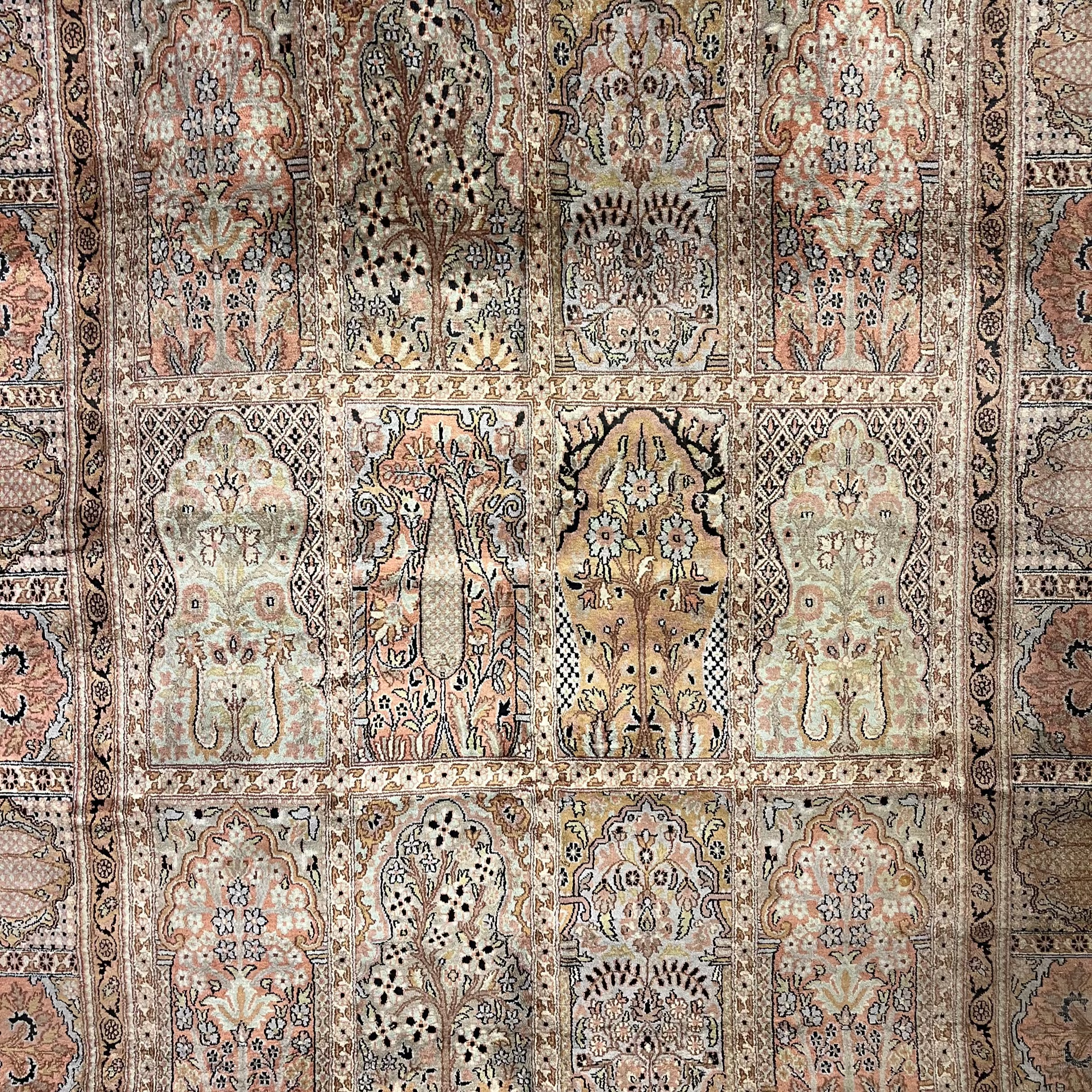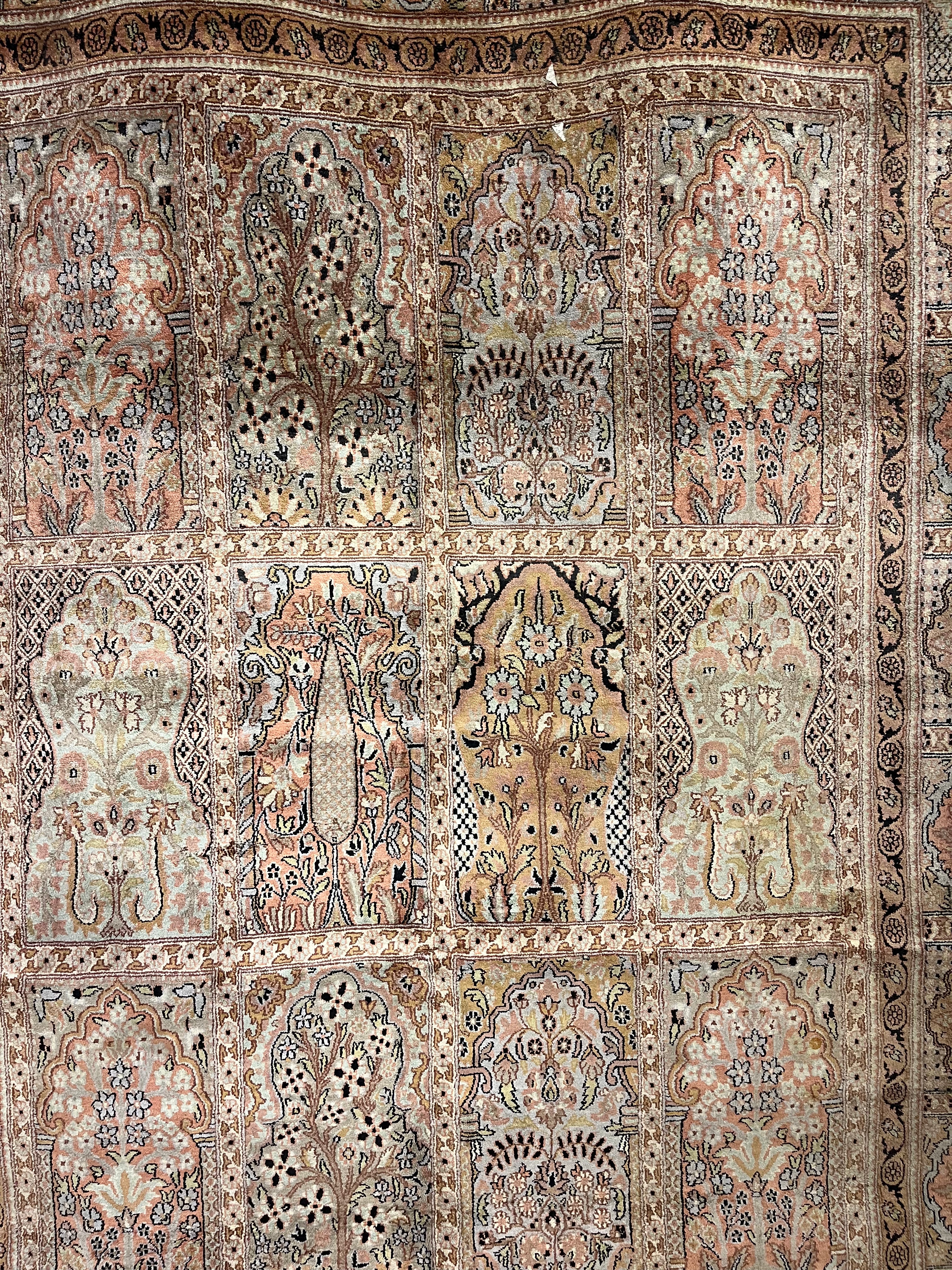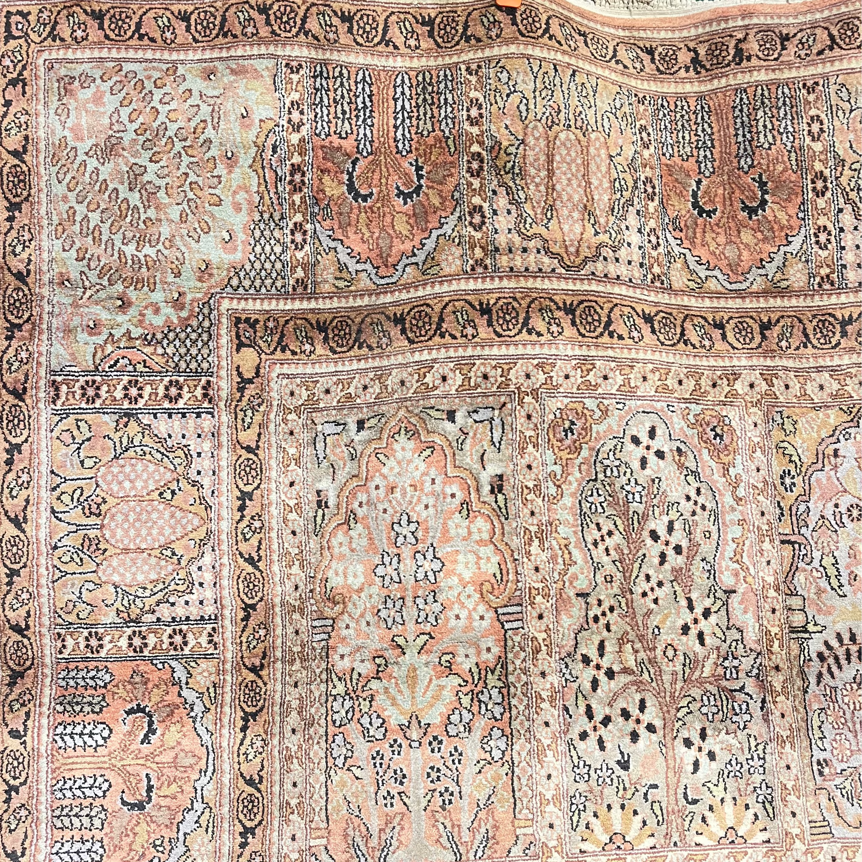 Fina y elegante alfombra india unidireccional, trabajada en lana y seda, con una guarda ancha y motivos tradicionales.