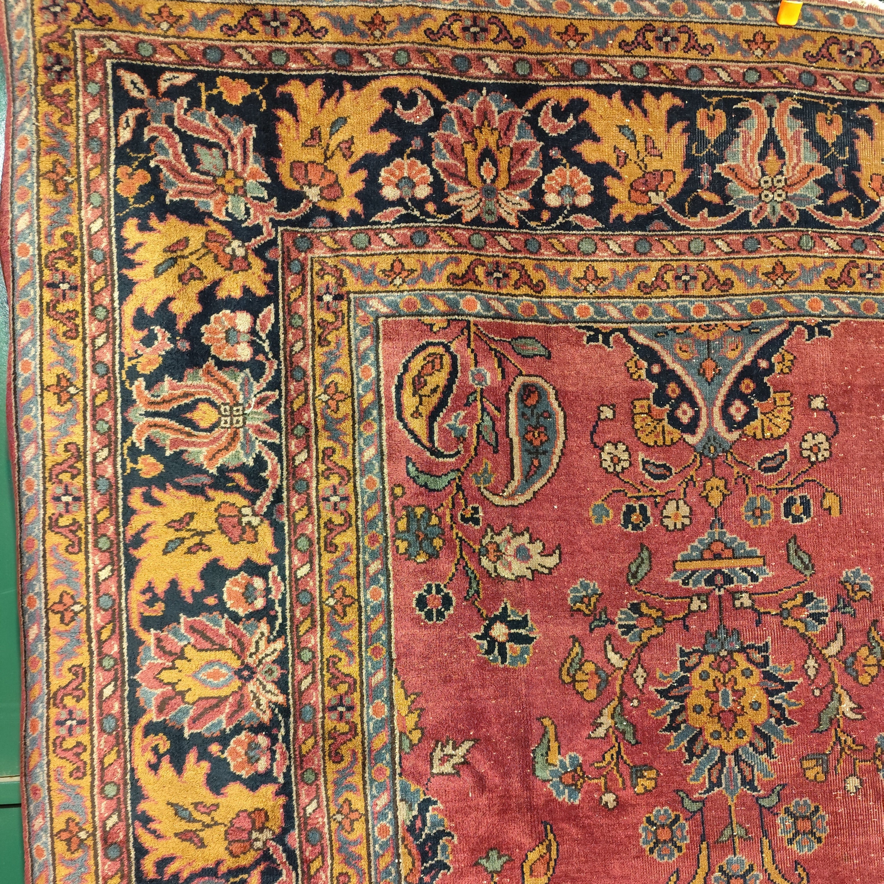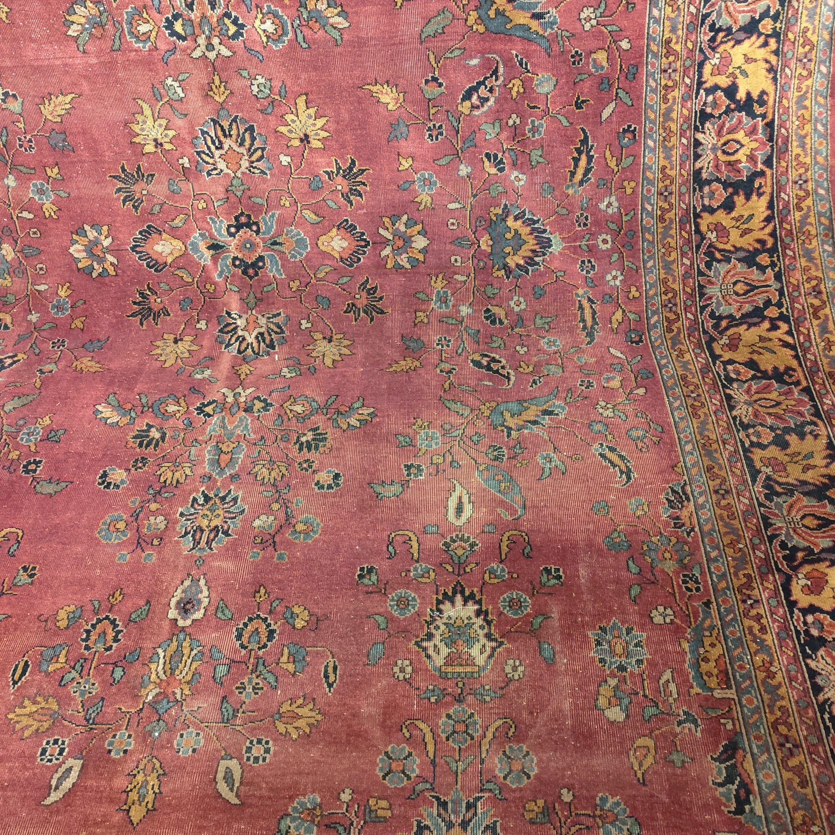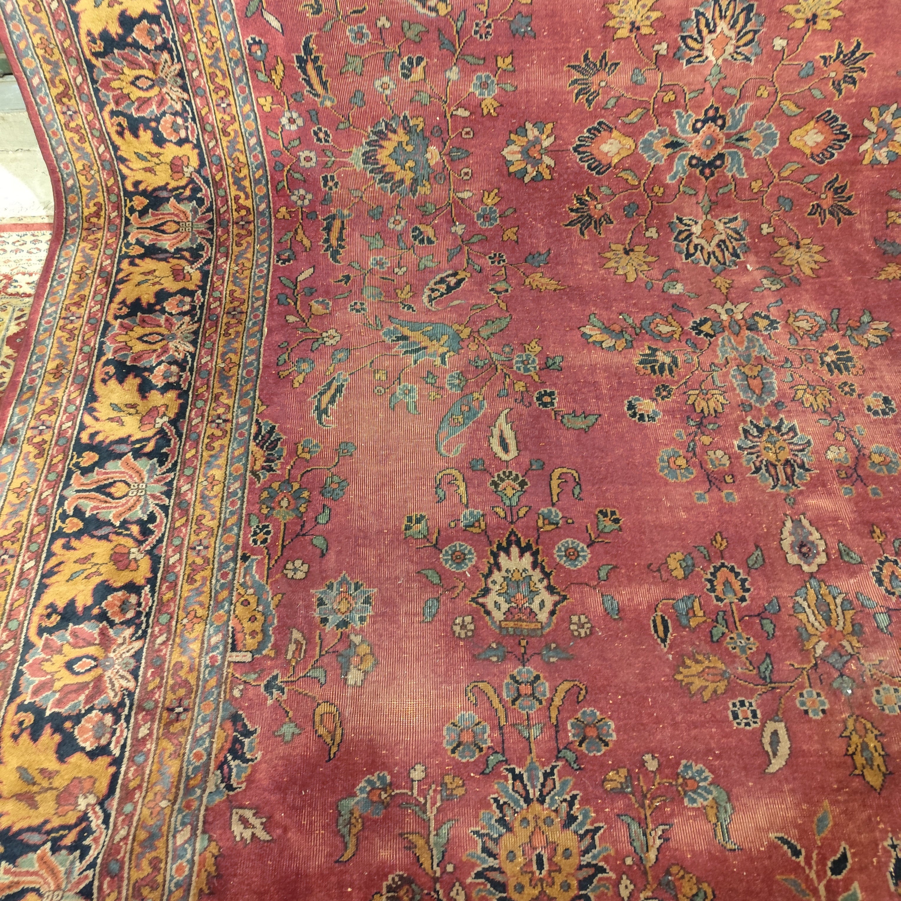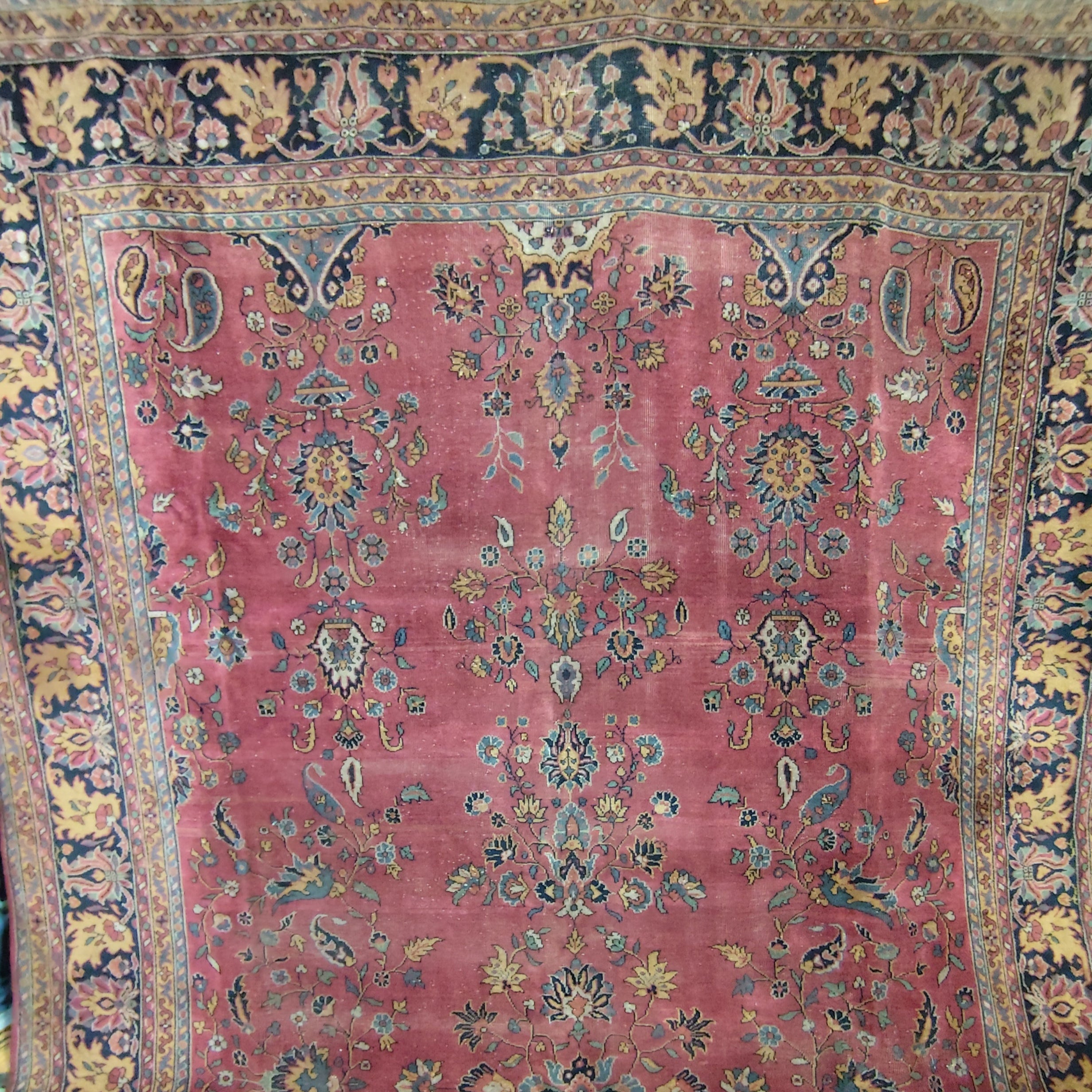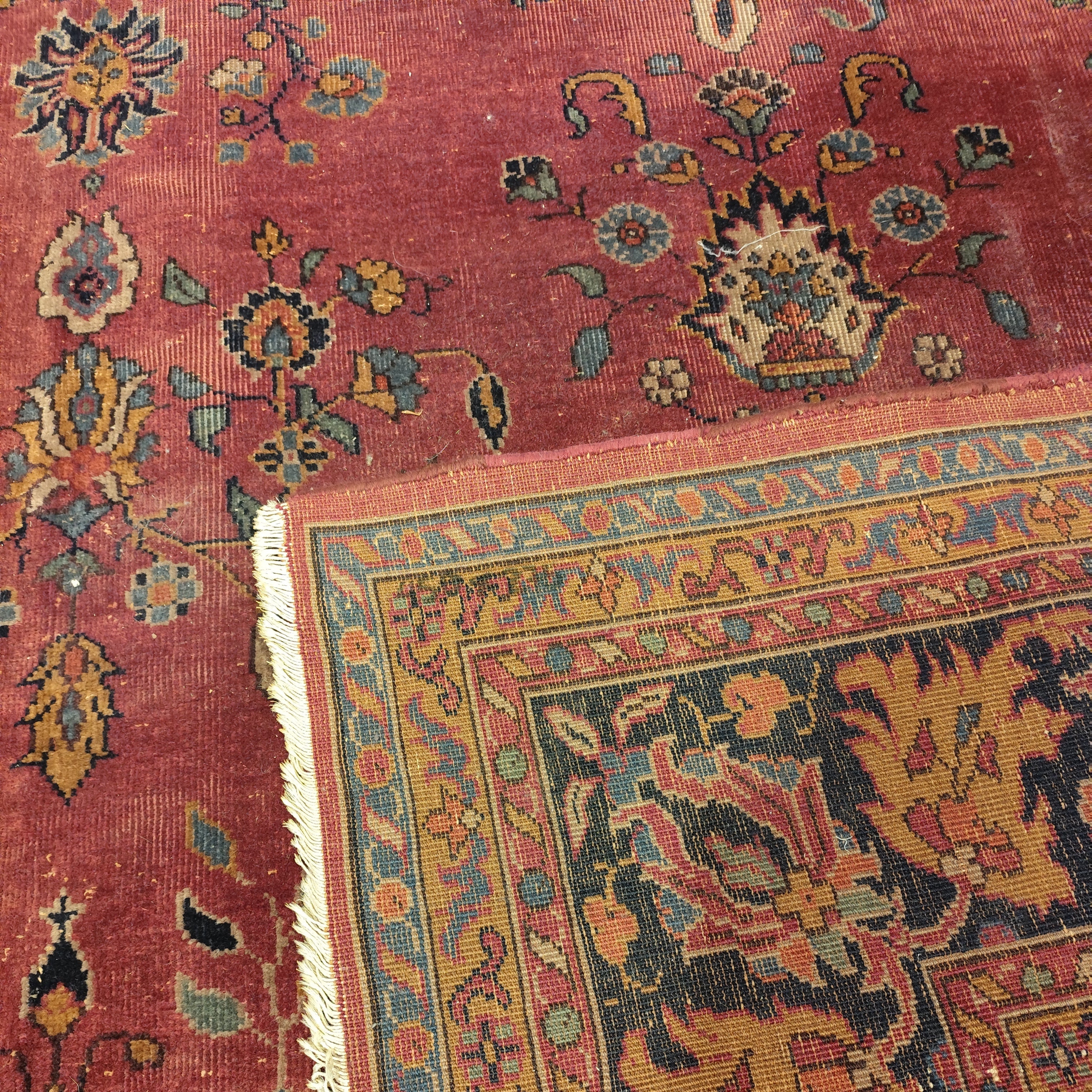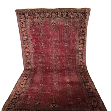 Maravillosa alfombra Persa tipo Saruk de lana y seda de entre 80 y 100 años de antigüedad. Predomina un hermoso guinda seca como color principal, que contrasta de manera espléndida con los otros colores presentes.