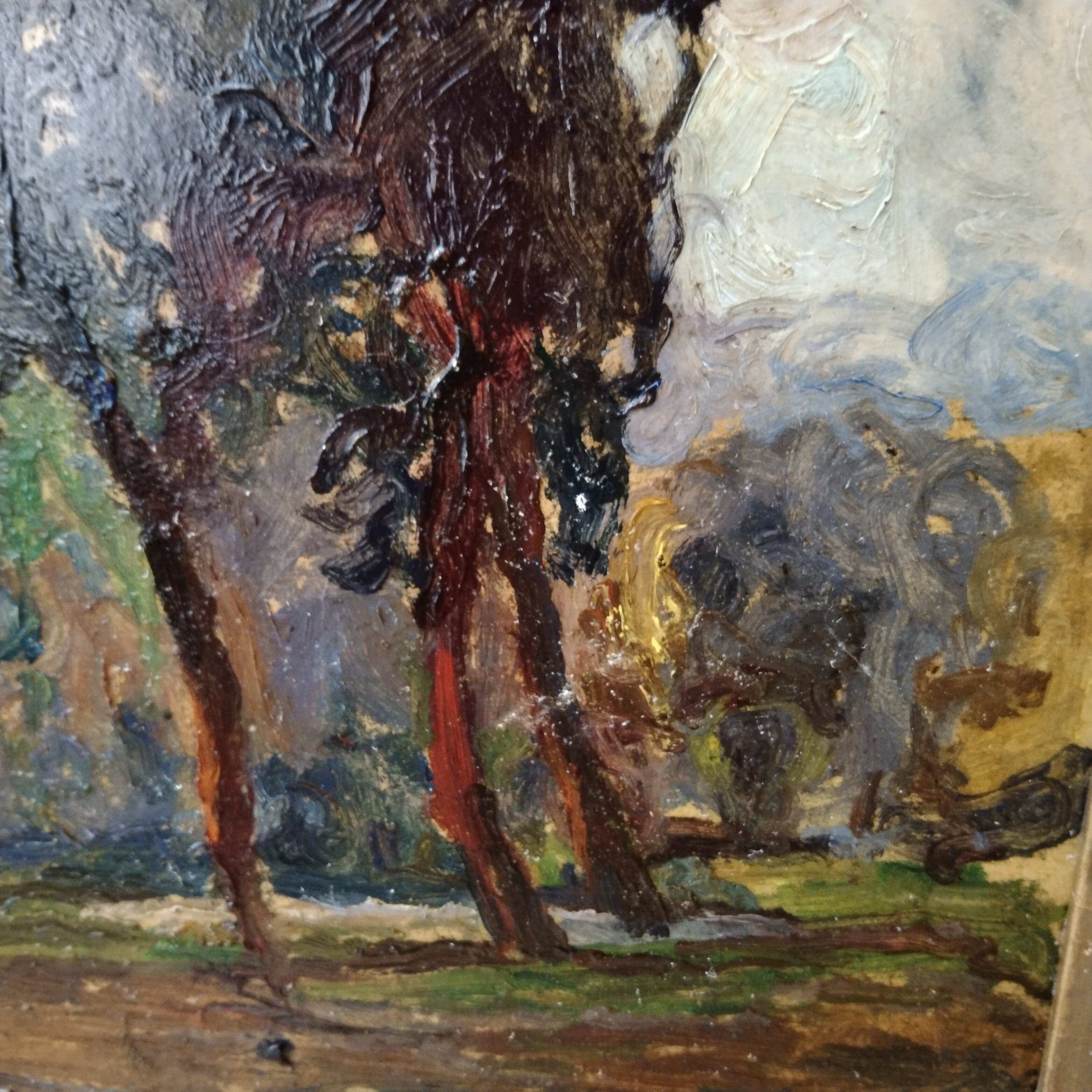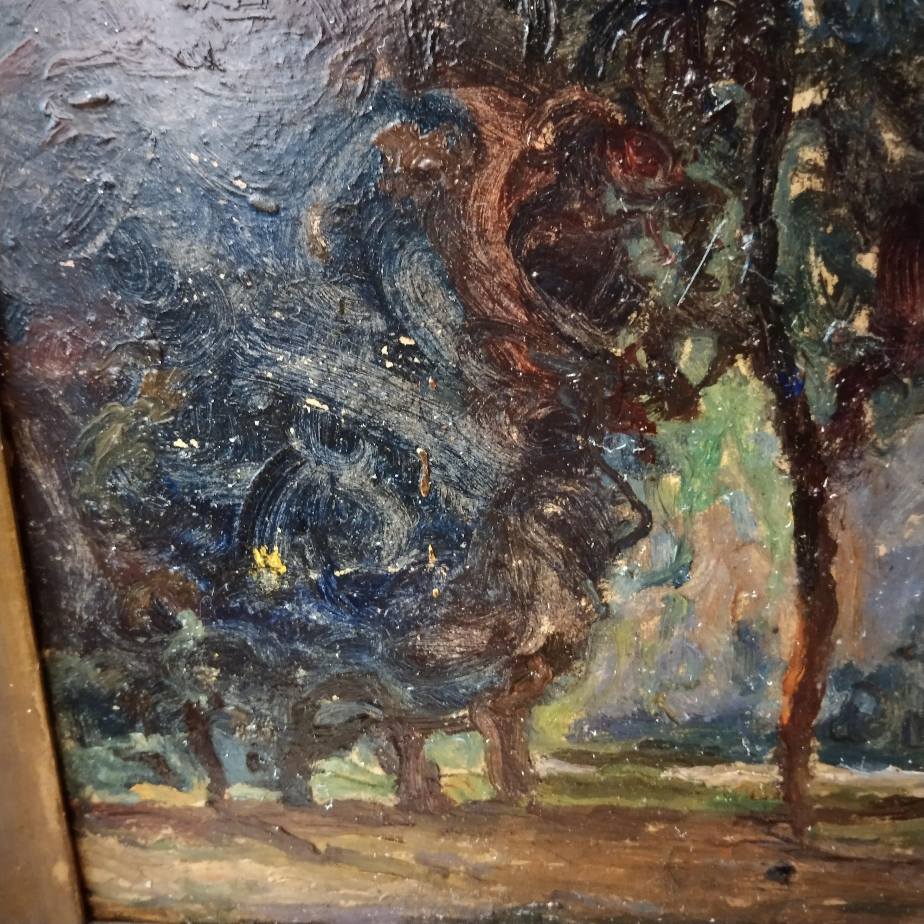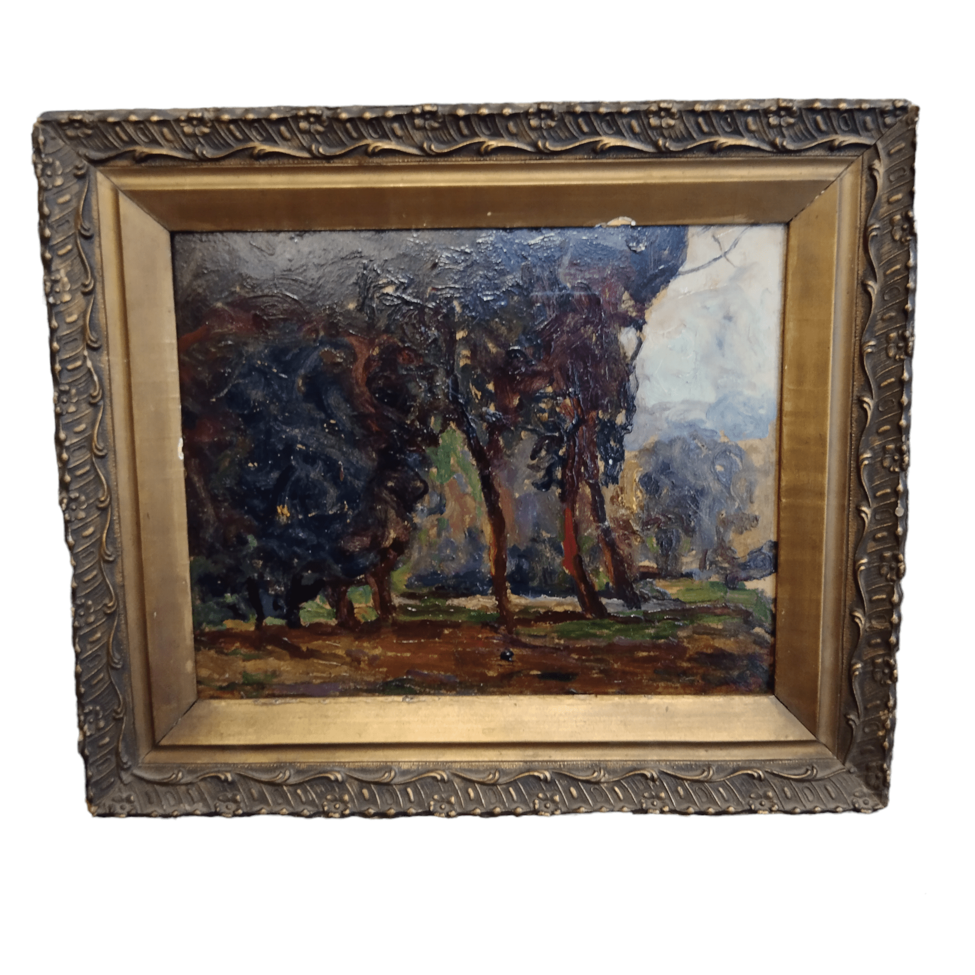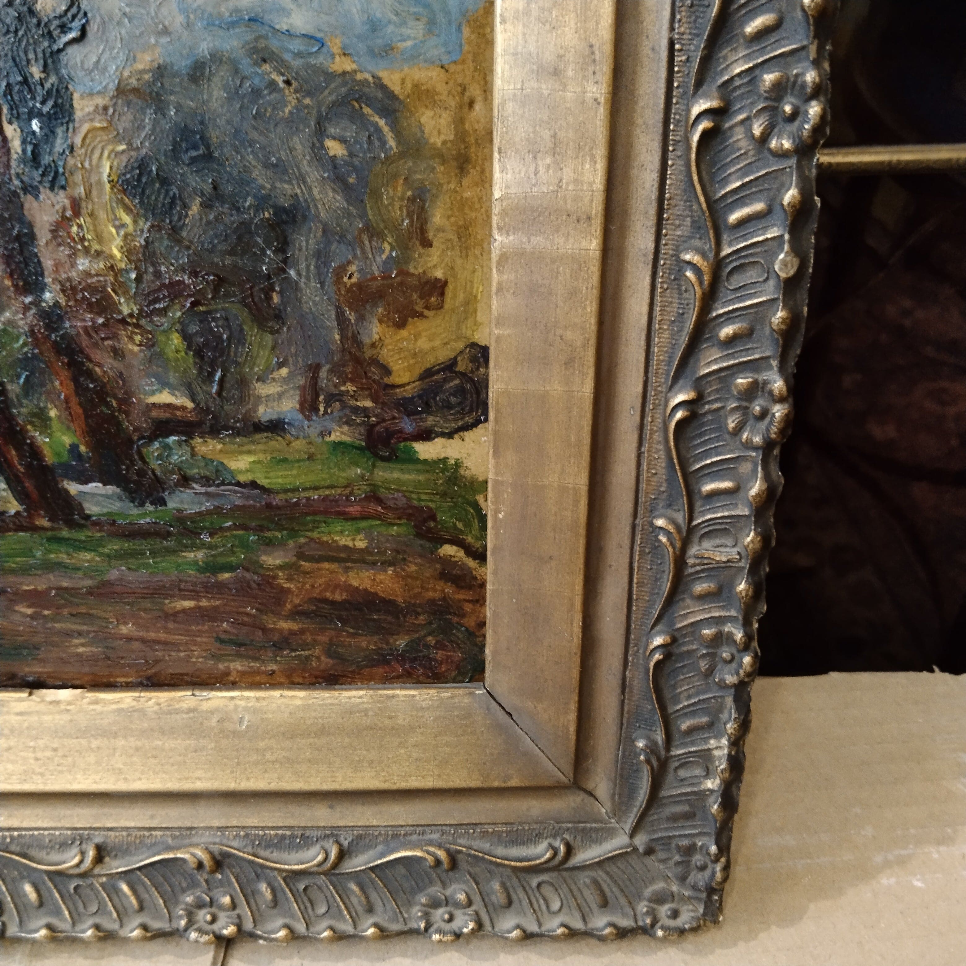 Óleo sobre madera representando un bosque con algunas luces rojizas en sus follajes. La obra está enmarcada en madera tallada y pintada en un dorado opaco.