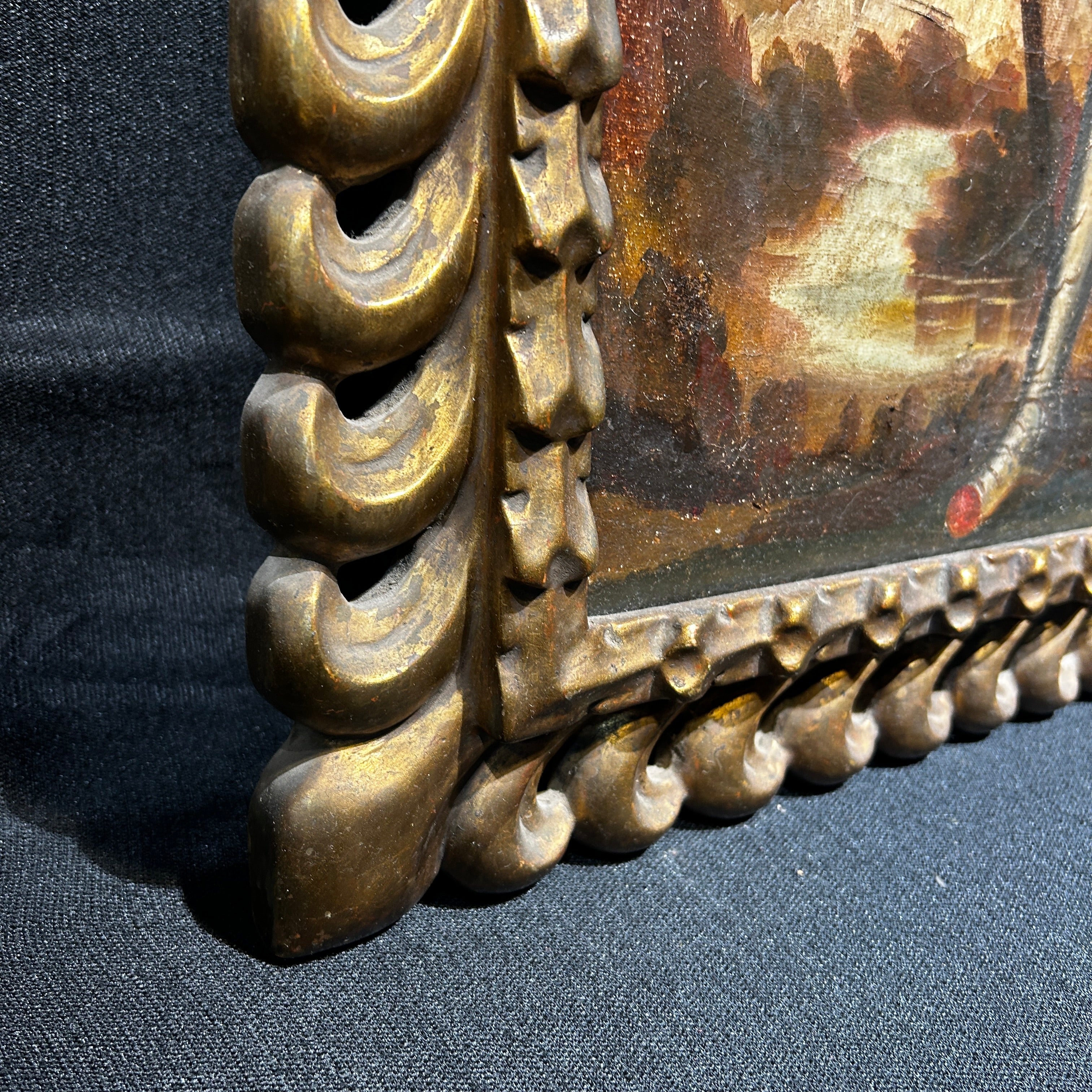 Óleo de la escuela cuzqueña con la figura de San Miguel Arcángel, en su tradicional representación de soldado con armadura, escudo, bastón y casco con plumaje. La sigue una línea similar a otras representaciones de este Santo en la escuela Cuzqueña, pero destaca en la fineza de sus detalles, que le dan textura al paisaje y su vestimenta, llena de detalles borados y brillos en sus telas. La obra tiene un marco de madera tallada en un llamativo y elegante diseño de puntas, terminado en luminoso dorado.