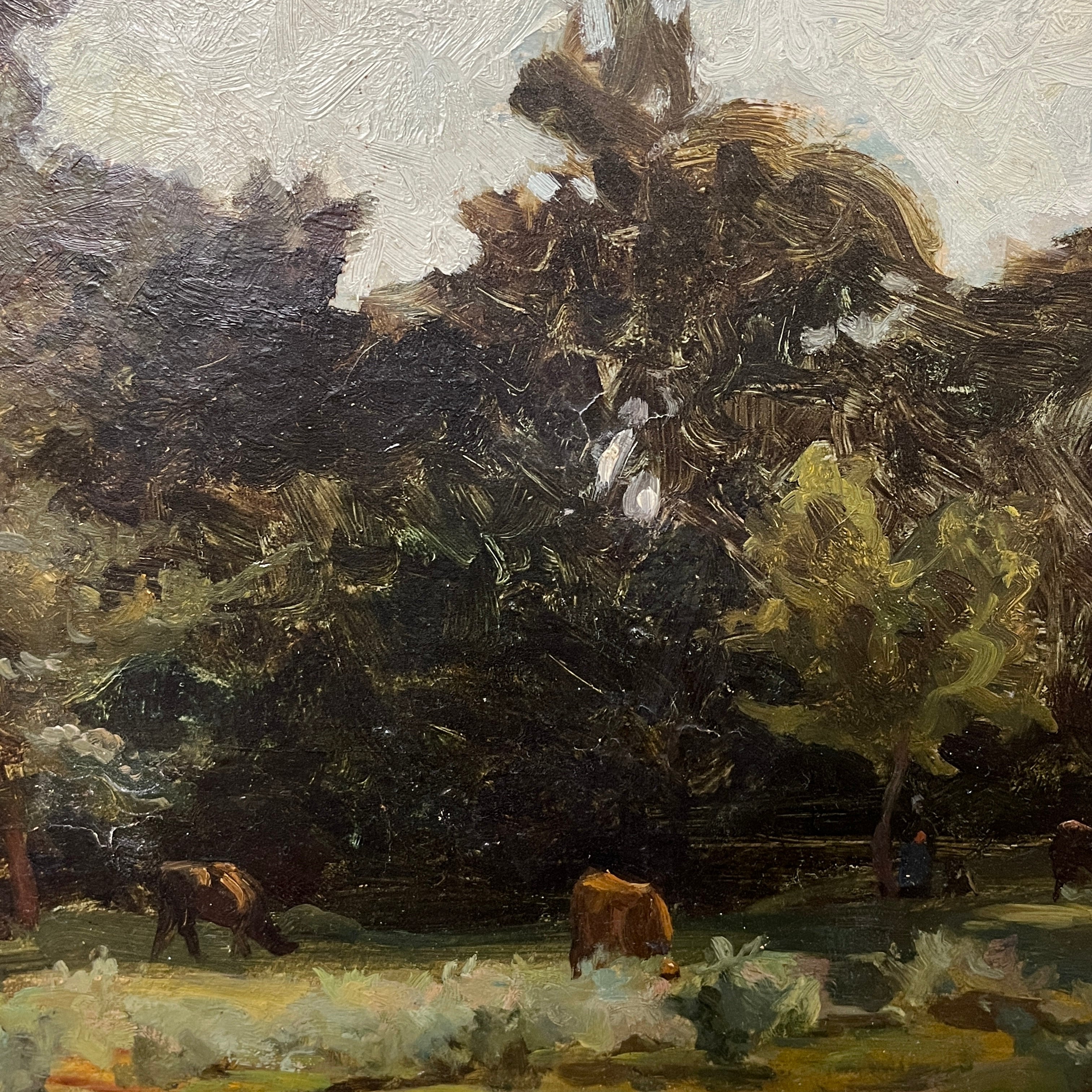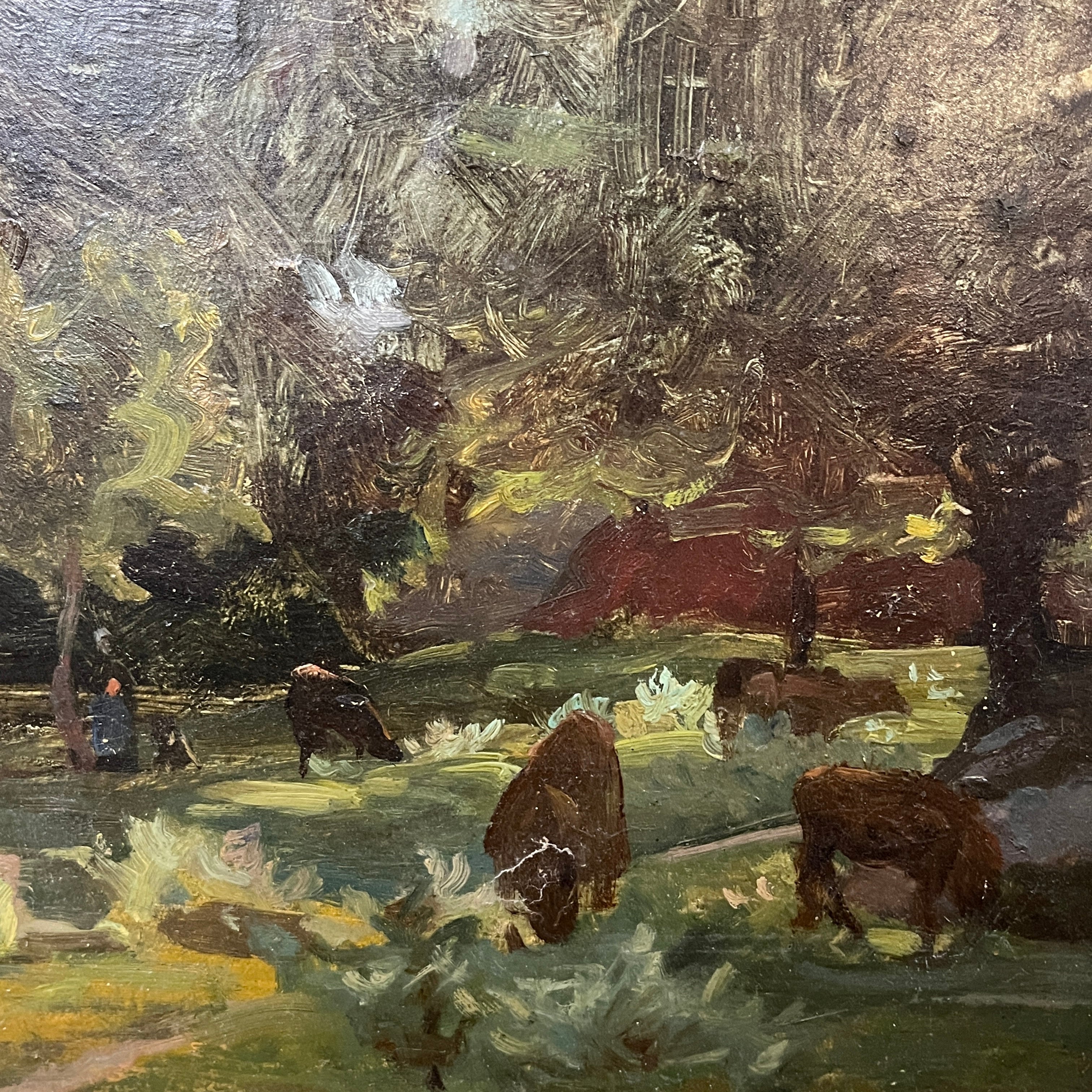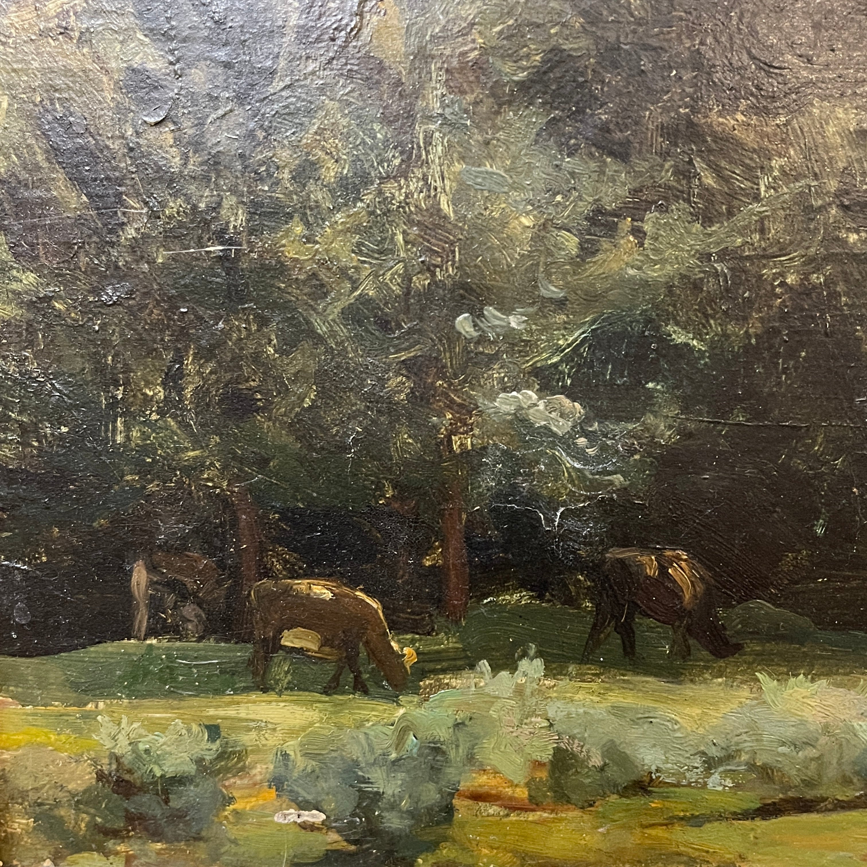 Óleo sobre tela anónimo, de posible origen europeo, representando un paisaje en el que un rebaño de vacas están pastando, en medio del claro de un bosque. Entre ellas se puede ver a su pastor acompañándolas a los lejos. Se trata de una obra de fuerte carga atmosférica, que utiliza la materia y los trazos expresivos para capturar las texturas del bosque, más que buscar una representación realista. La obra tiene un marco de madera dorada, que le entrega mucha luz a la obra.