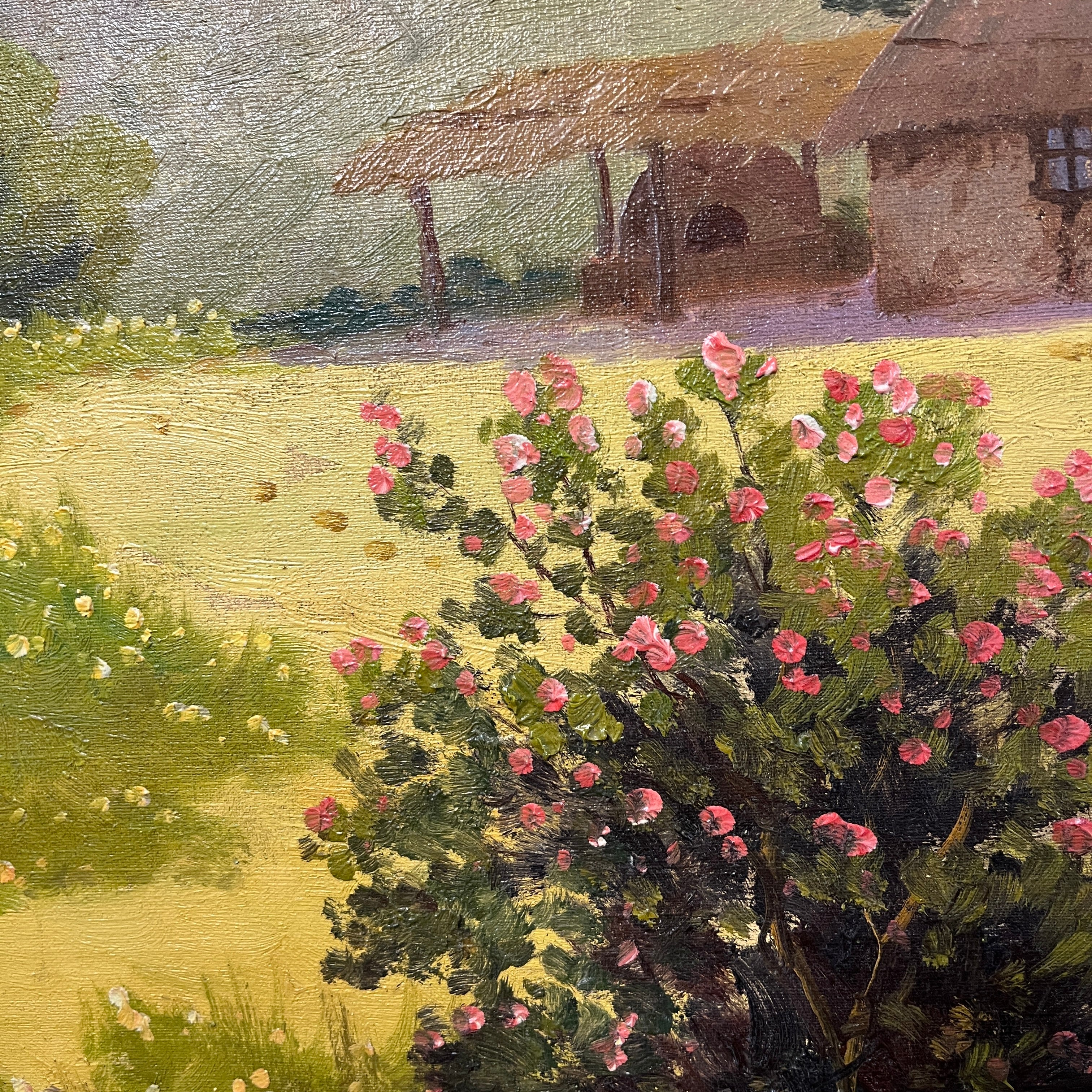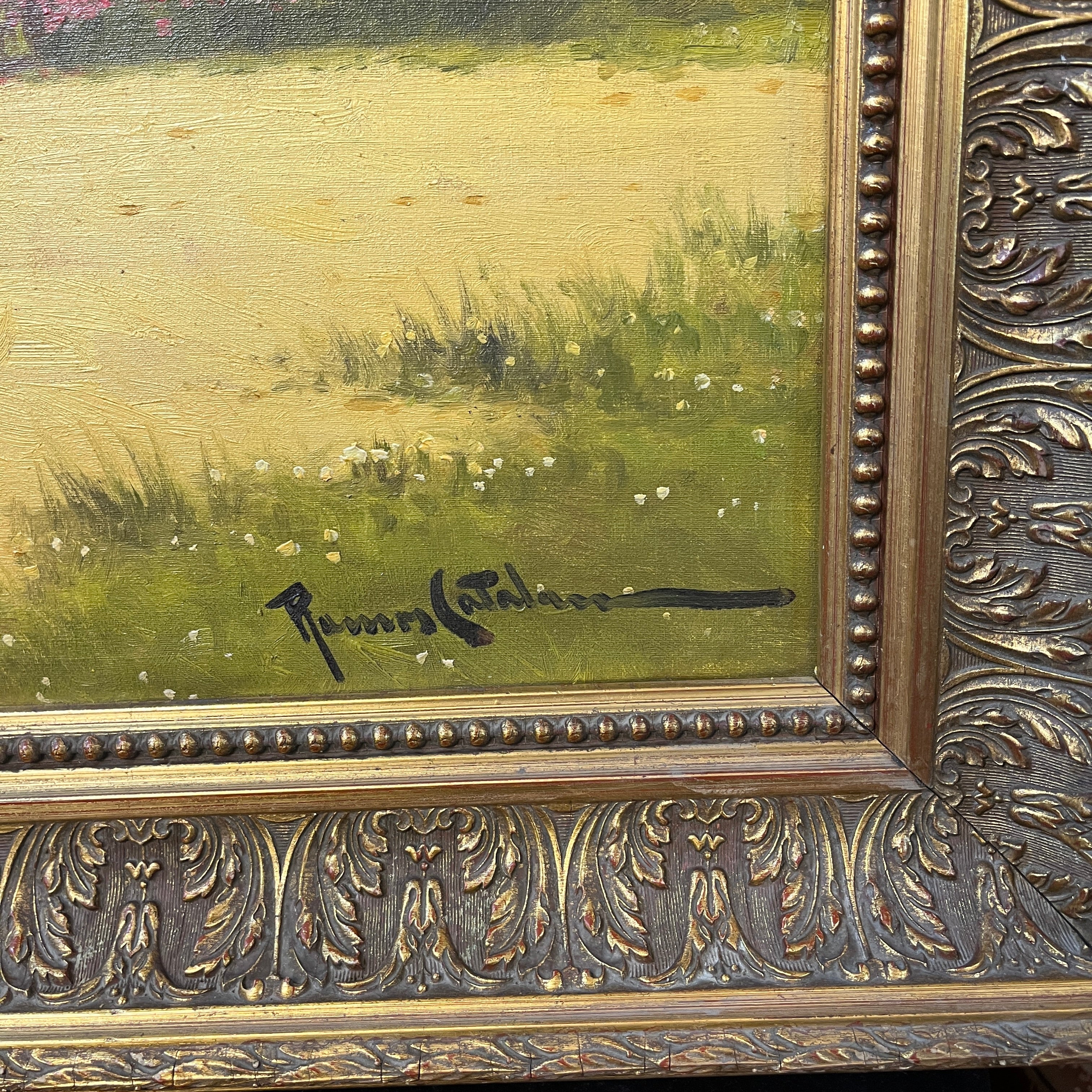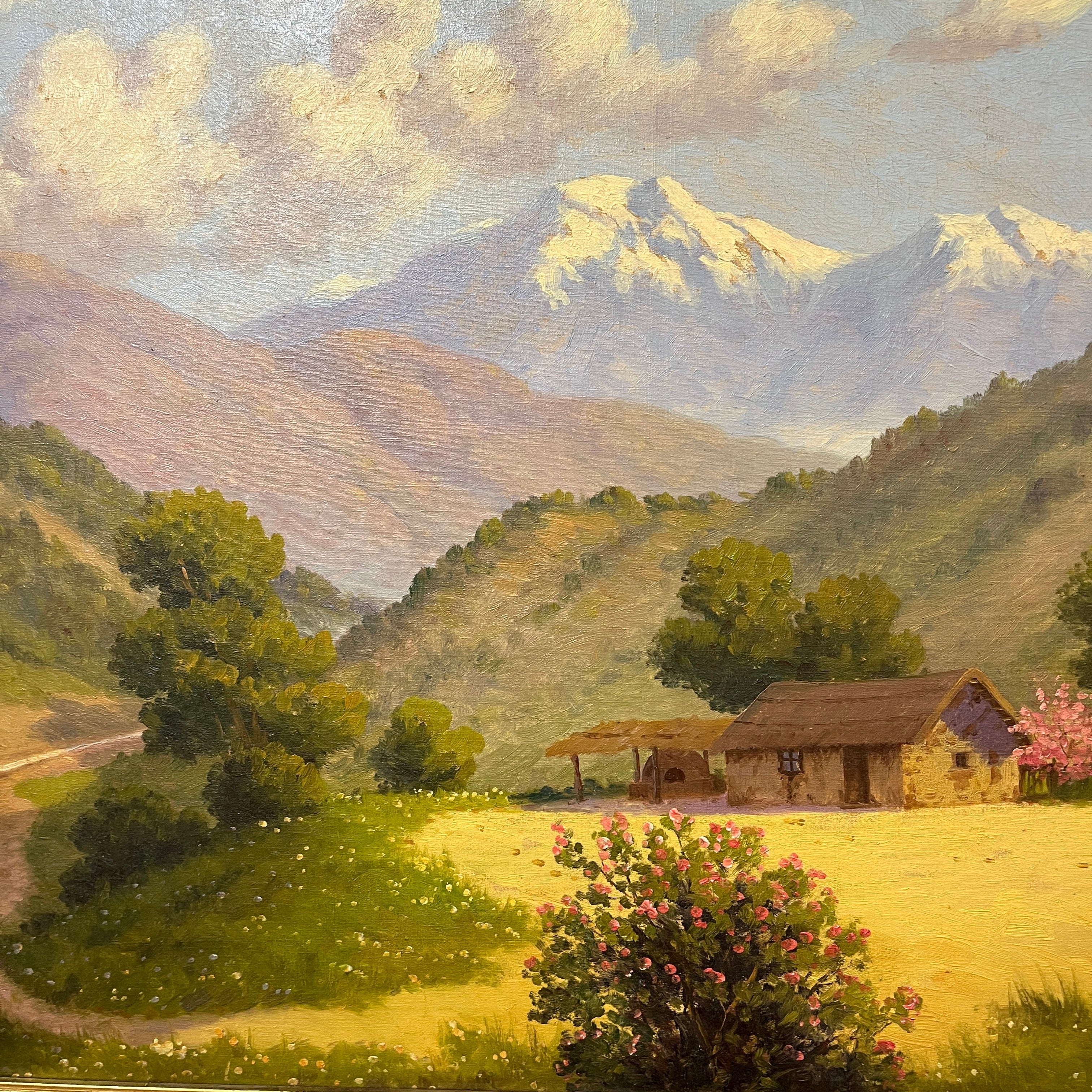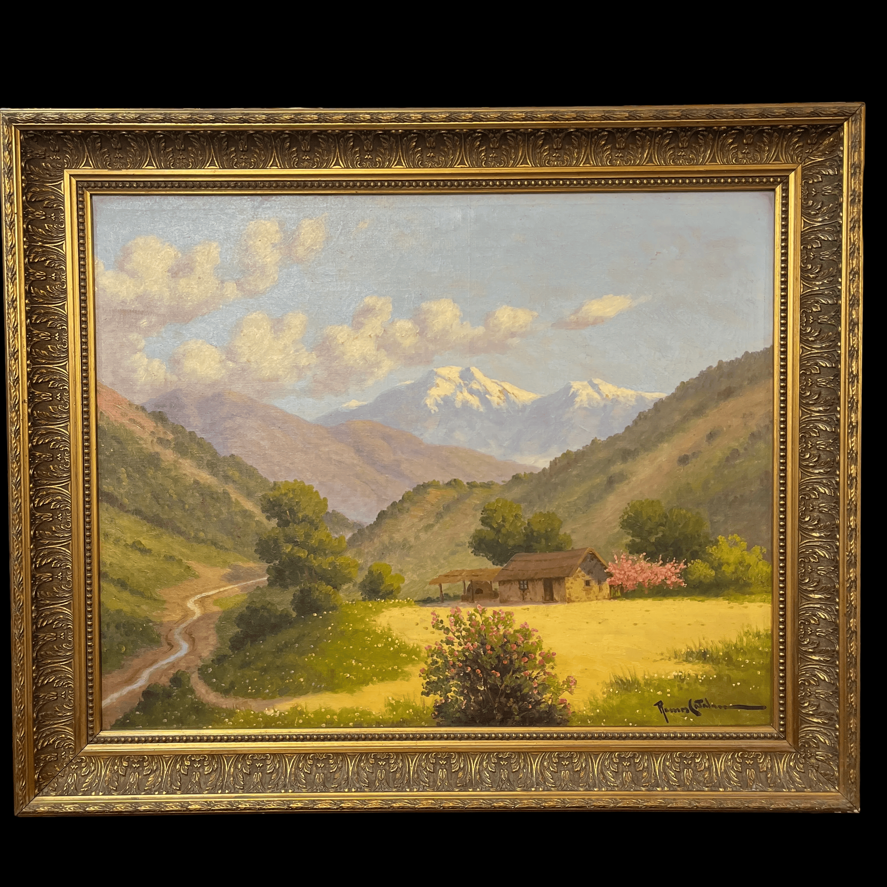Óleo sobre tela del reconocido pintor chileno Benito Ramos Catalán, representando un paisaje de campo con una sencilla casa de adobe con un horno de barro en su exterior, junto a un riachuelo, rodeada de un bellísimo valle a los pies de la cordillera de Los Andes. Sobre ella, el cielo de un celeste pálido con algunas nubes. El artista retrata las texturas y colores de este tipo de paisaje en detalle, dándole distintos planos de profundidad a la composición. La obra está enmarcada en madera tallada en relieves decorativos y pintada de luminoso dorado.