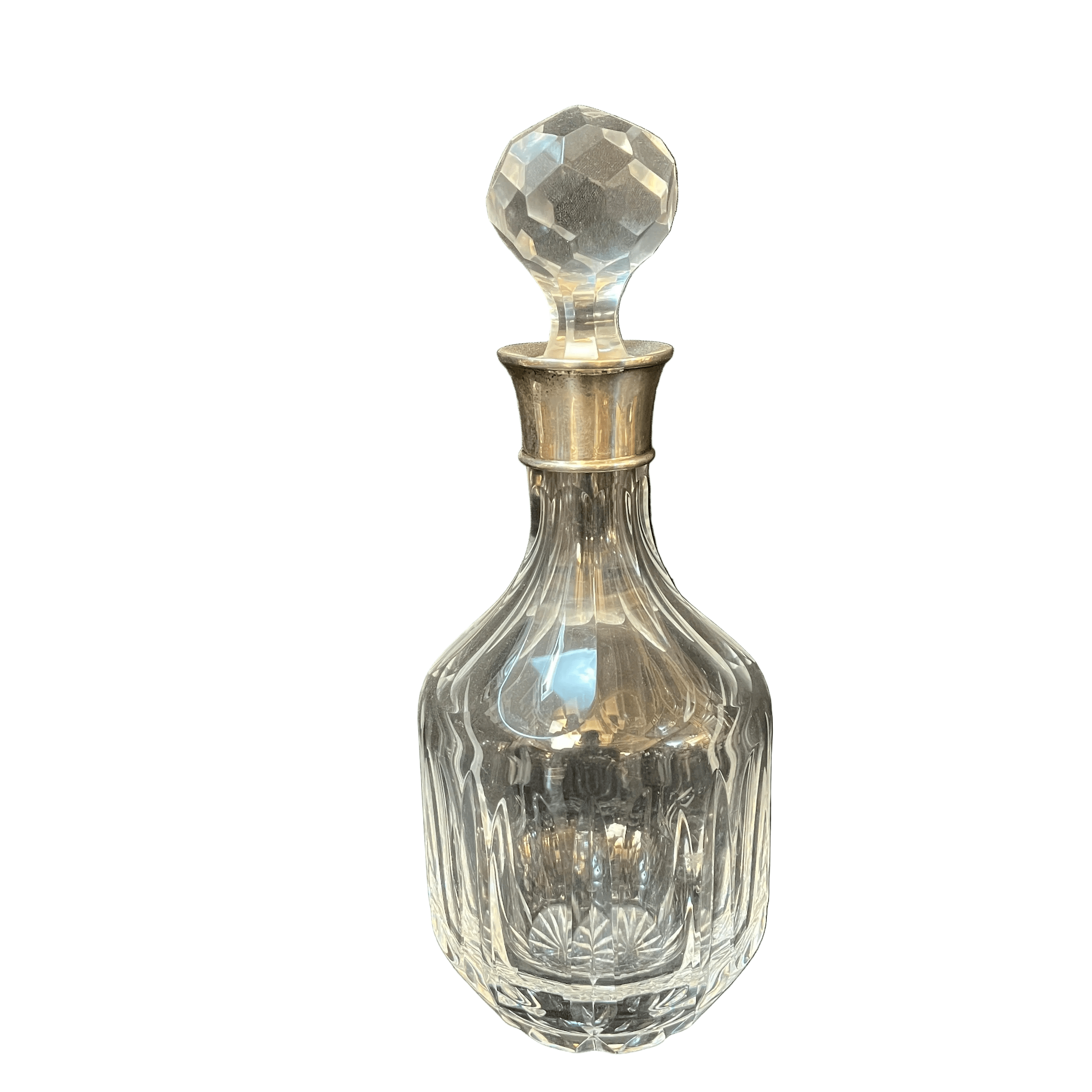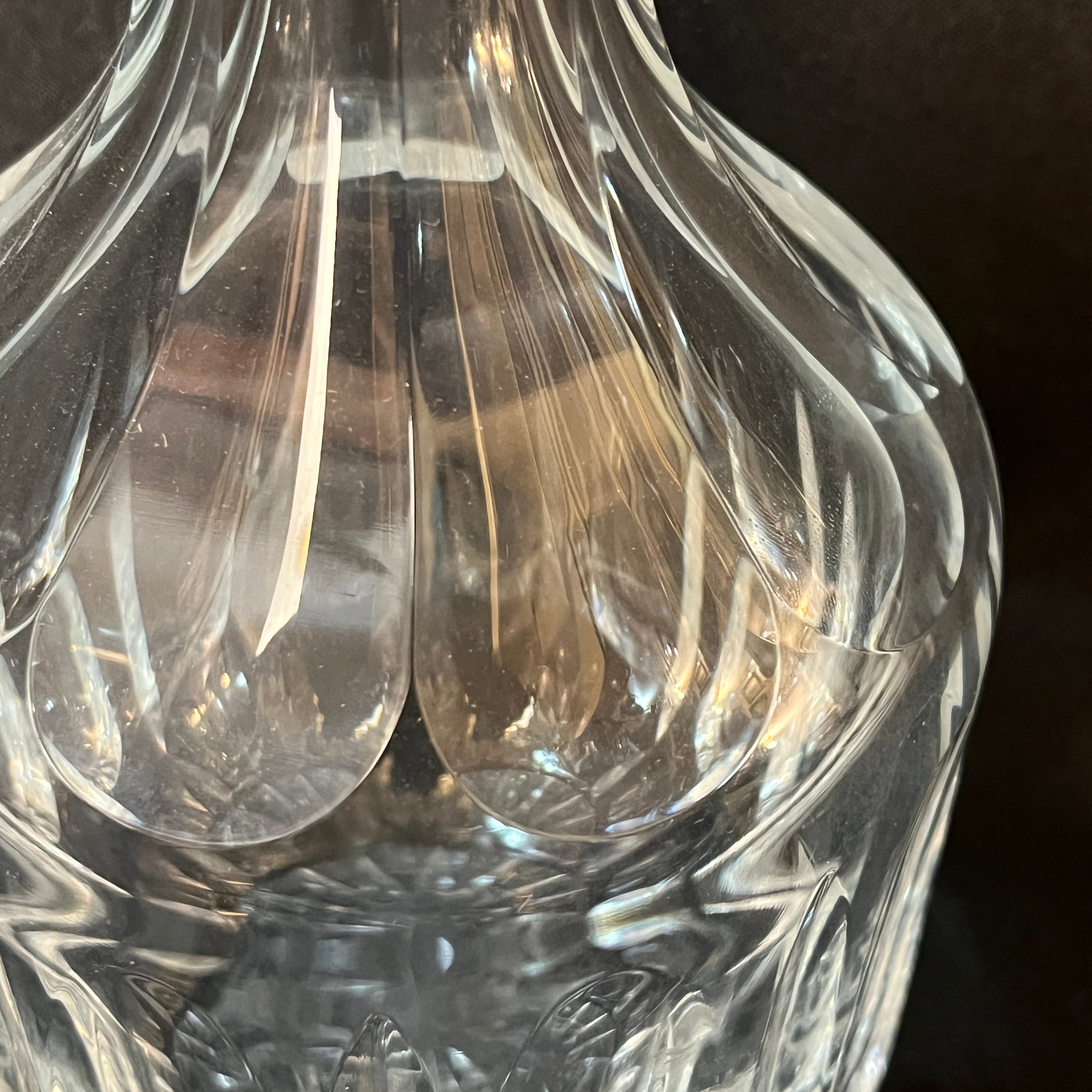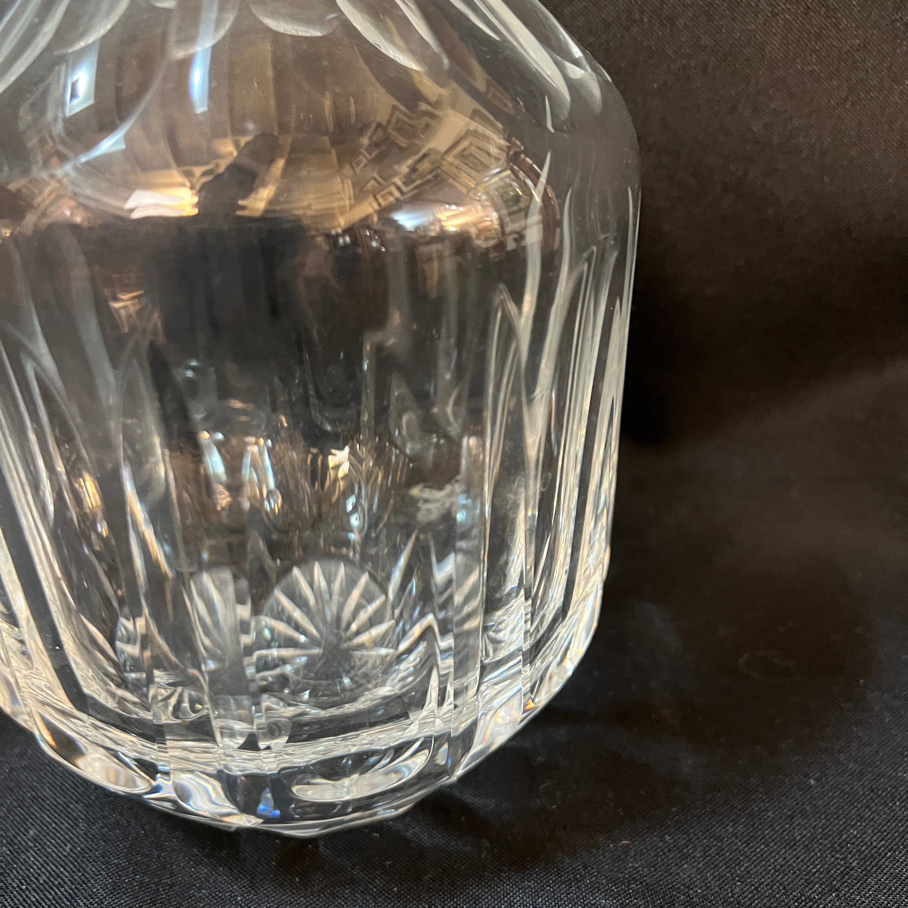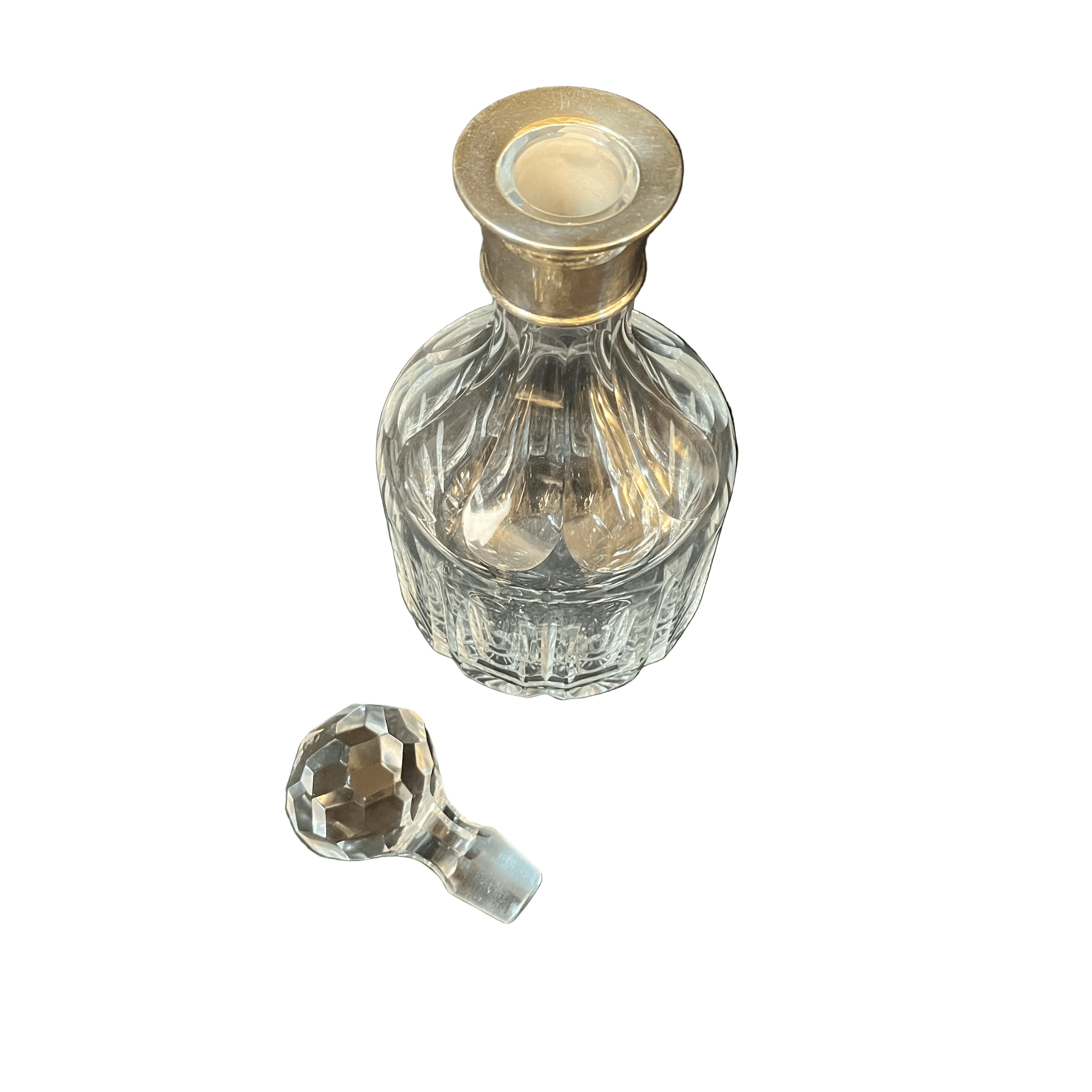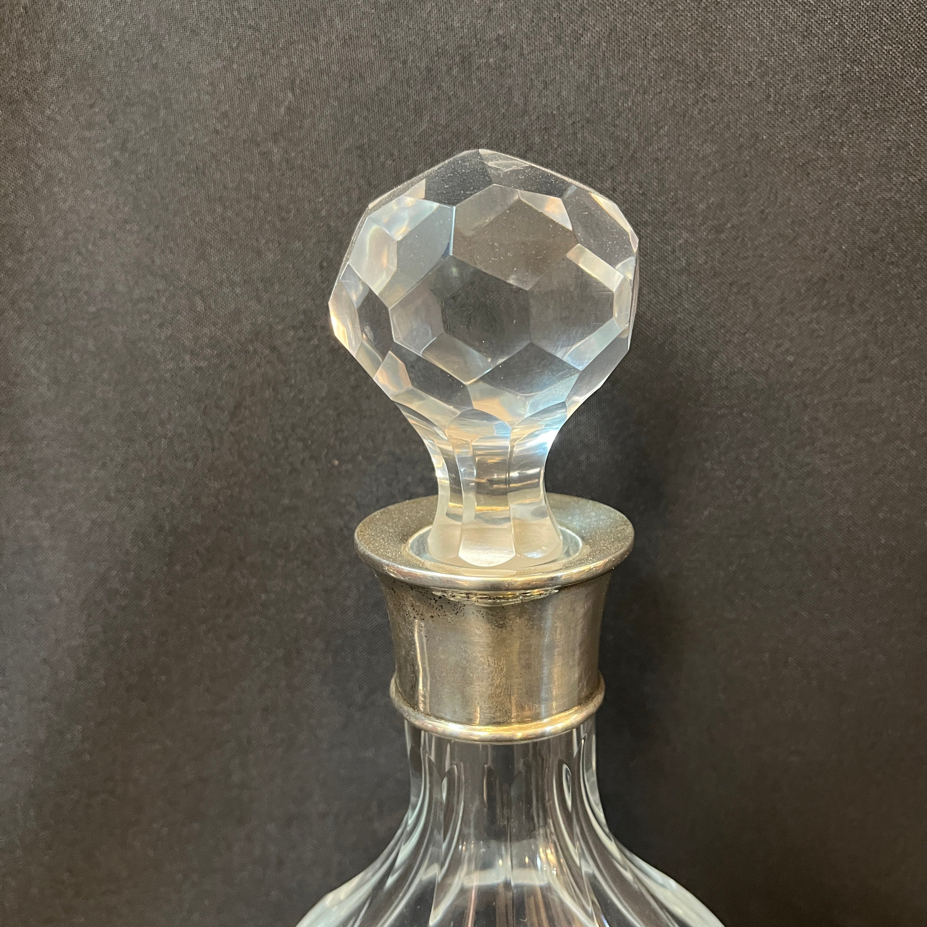 Elegante botella whiskera de cristal con diseño de de lonjas, cuello en aplicación de plaqué y tapa con cortes geométricos.