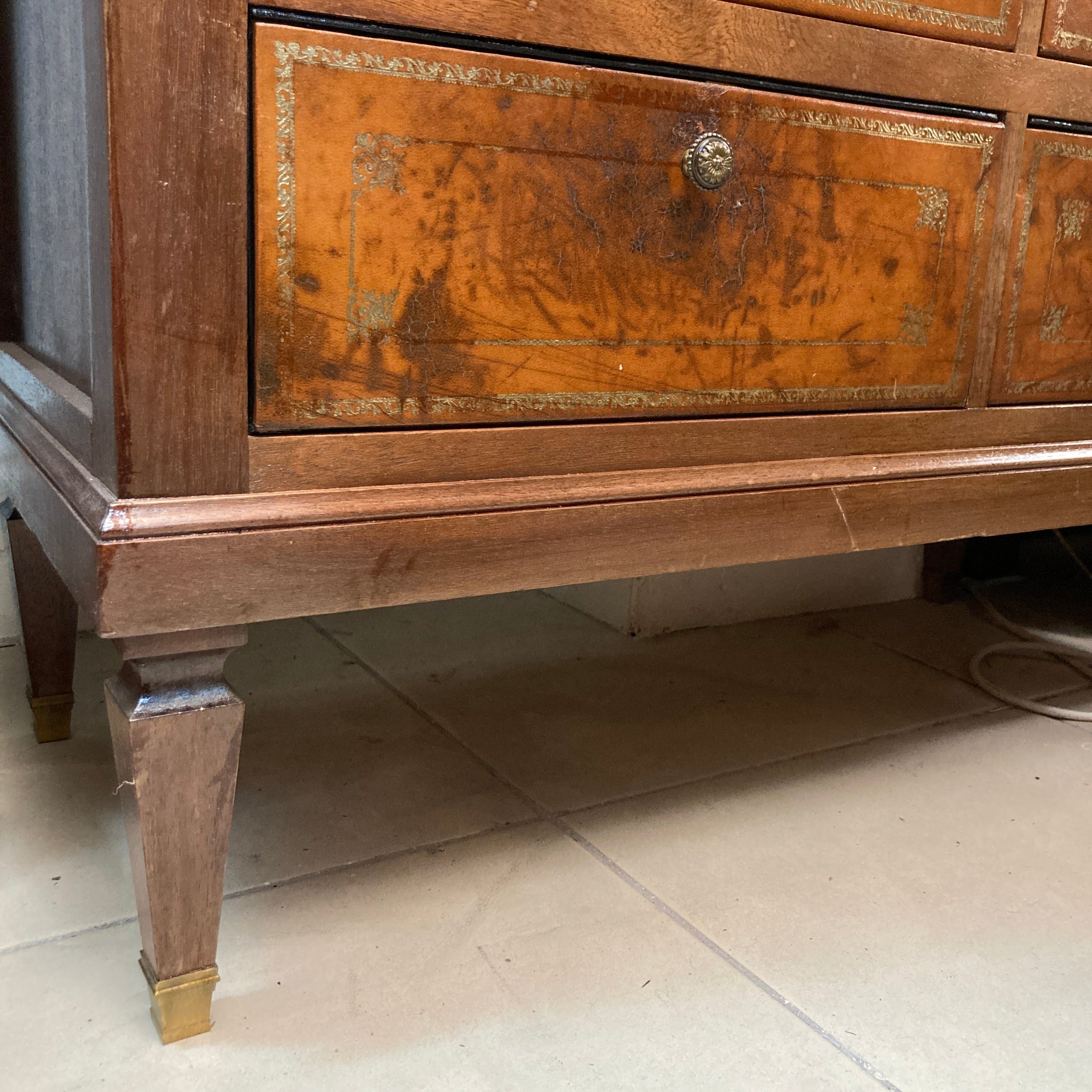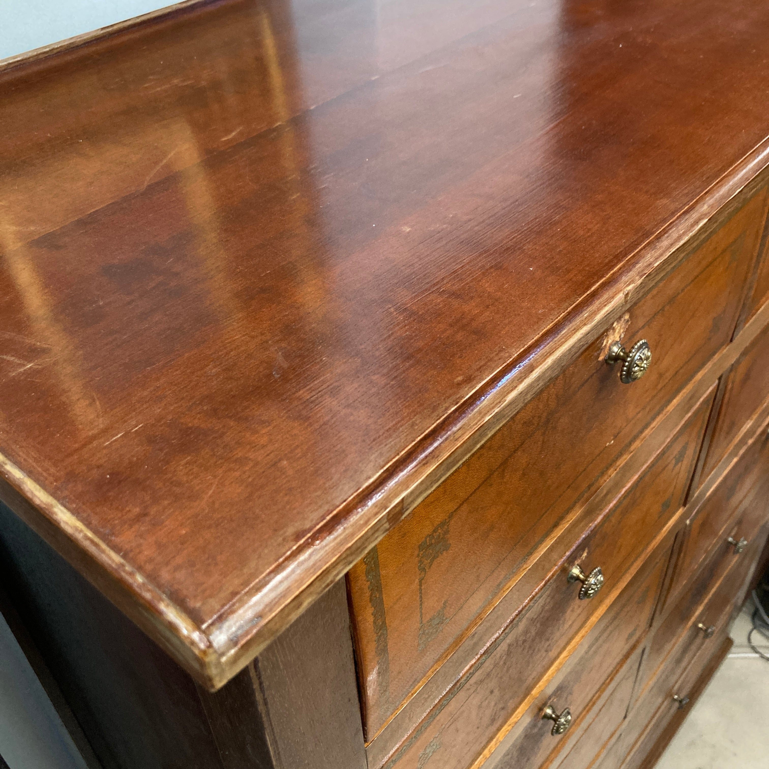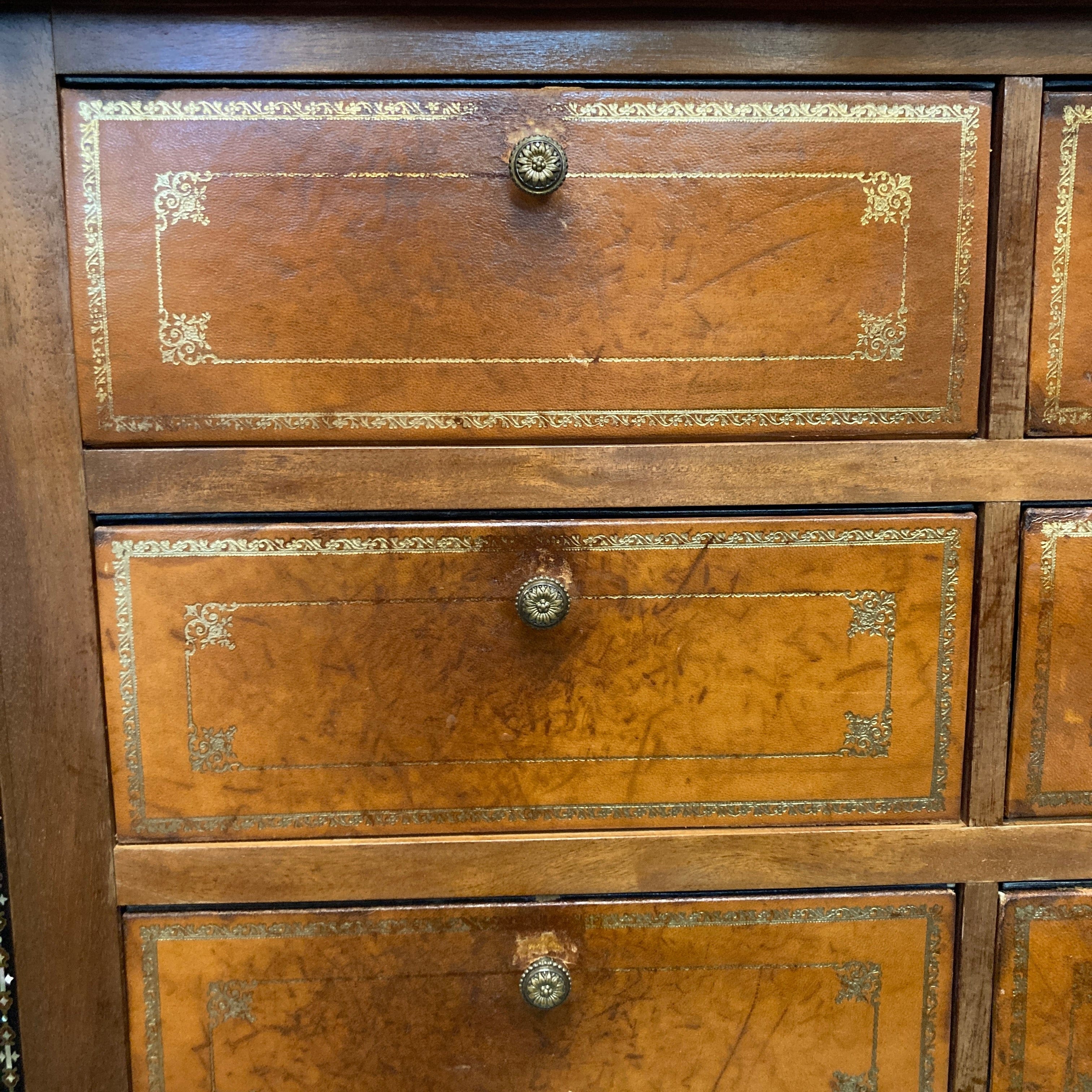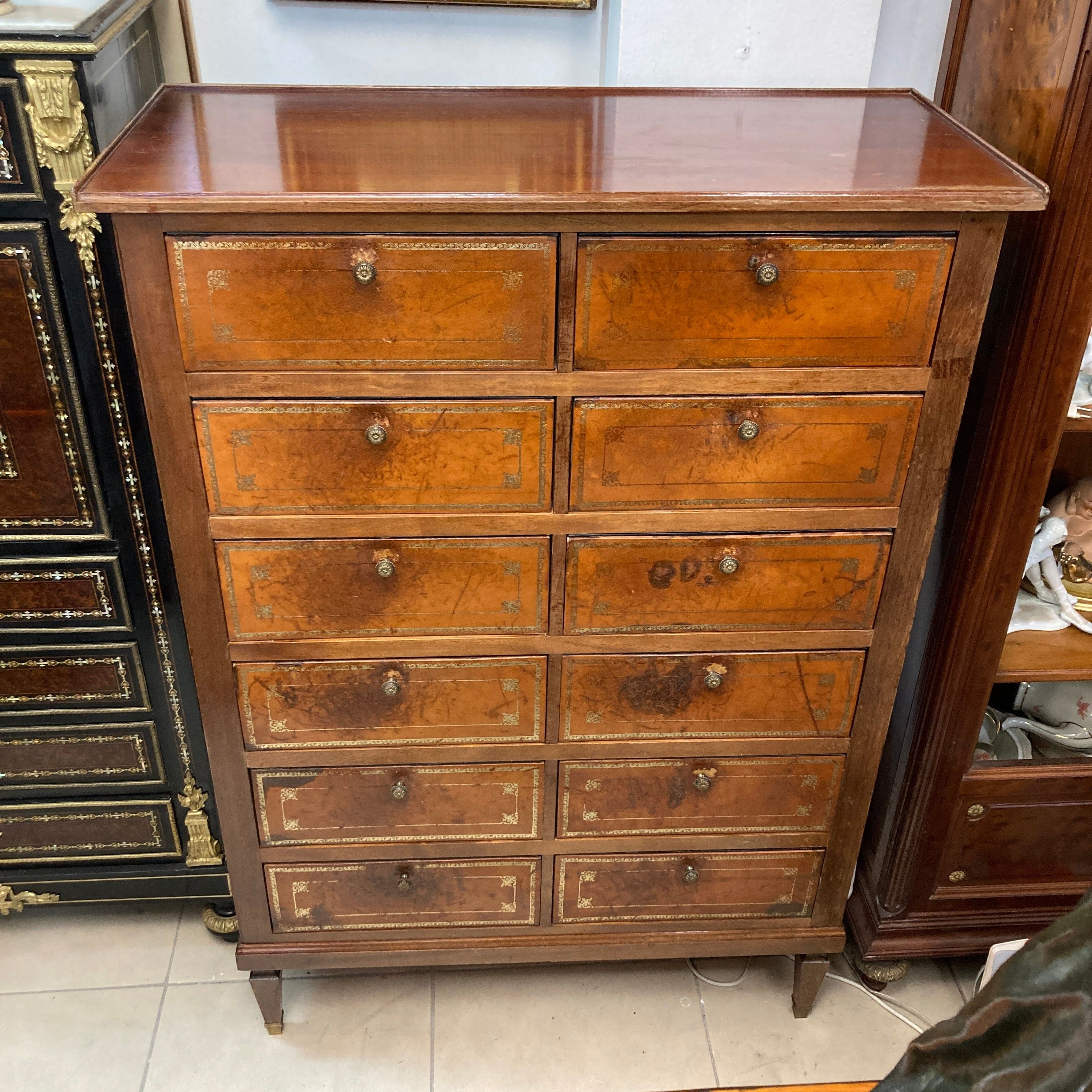 Antiguo cartonero en raíz de nogal. Contiene 12 cajones recubiertos en cuero reglado e interior de cartón. Tiradores y tacos de bronce.