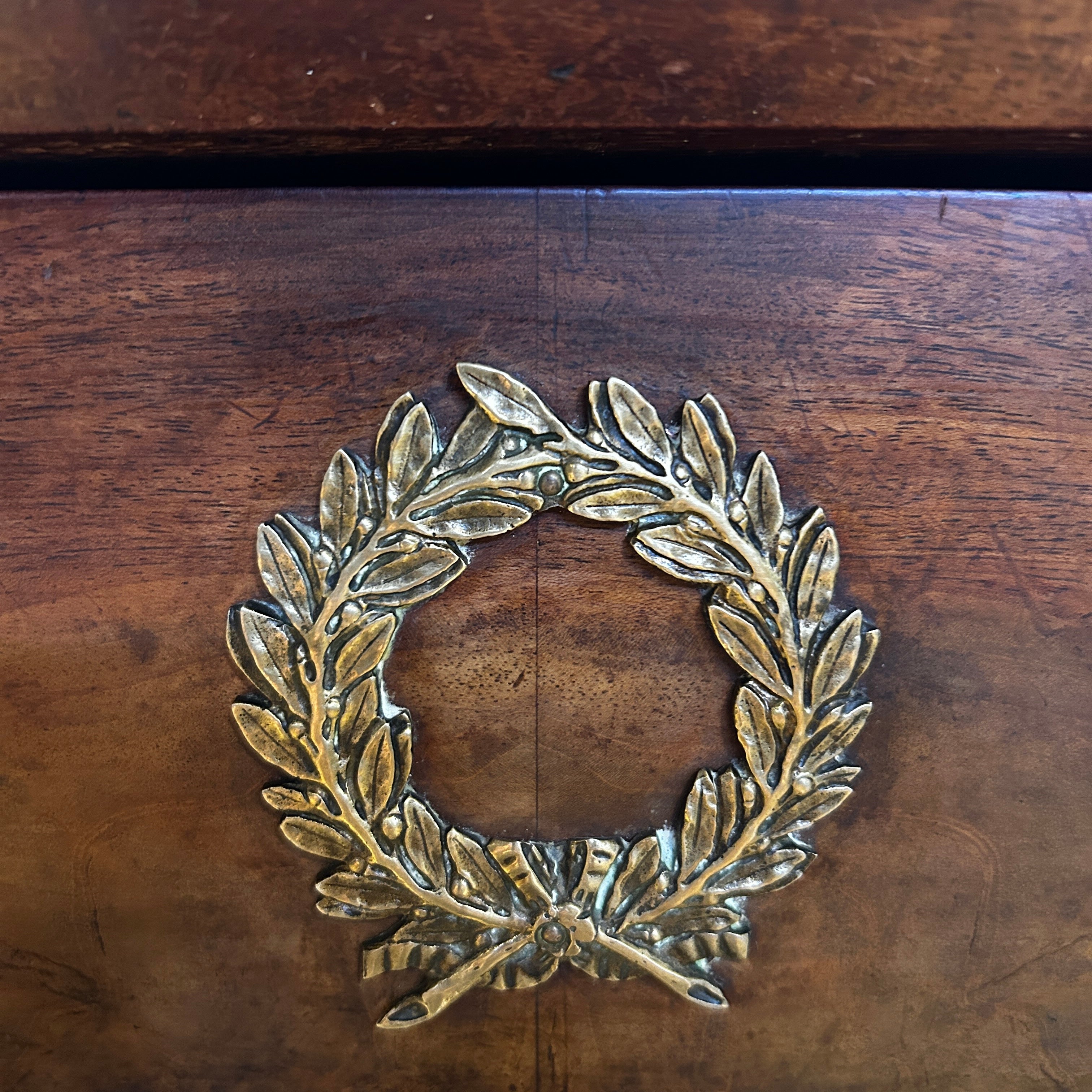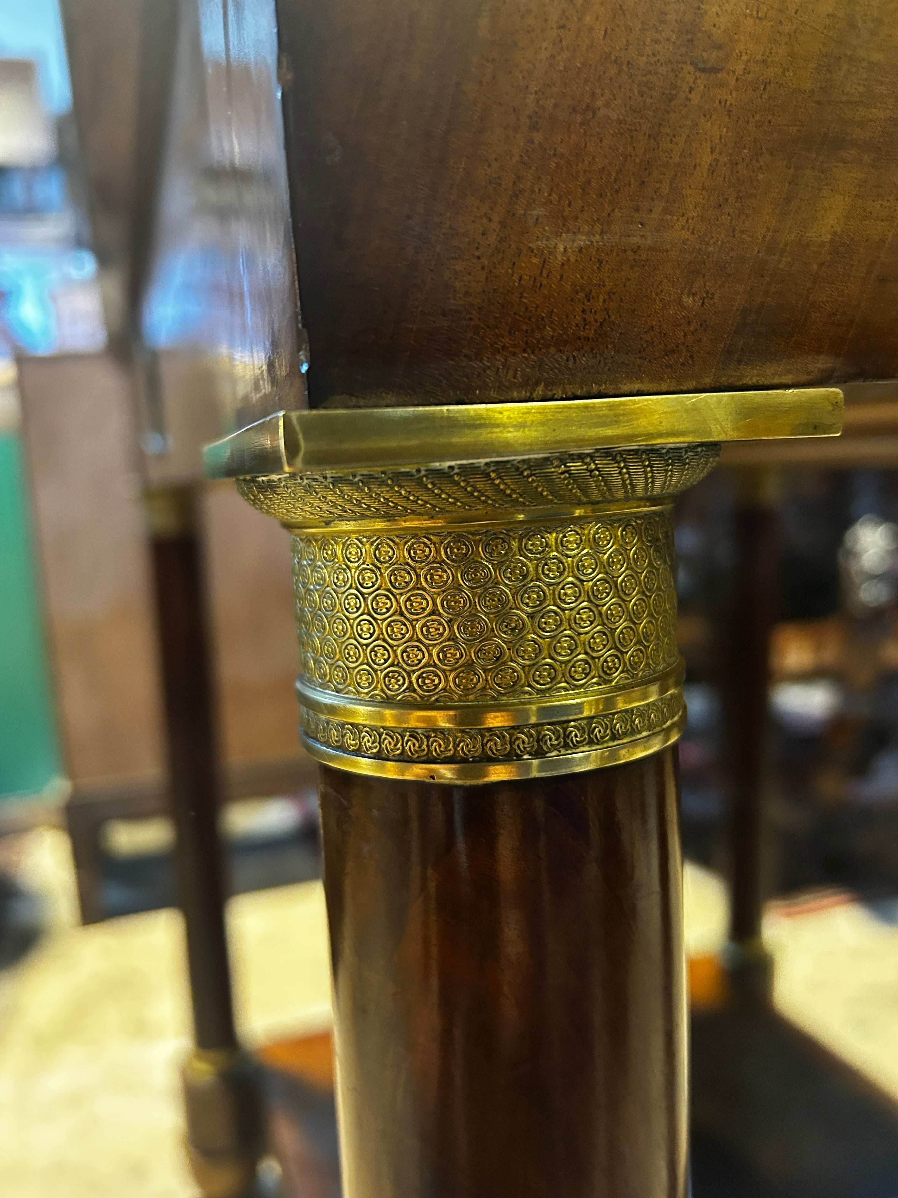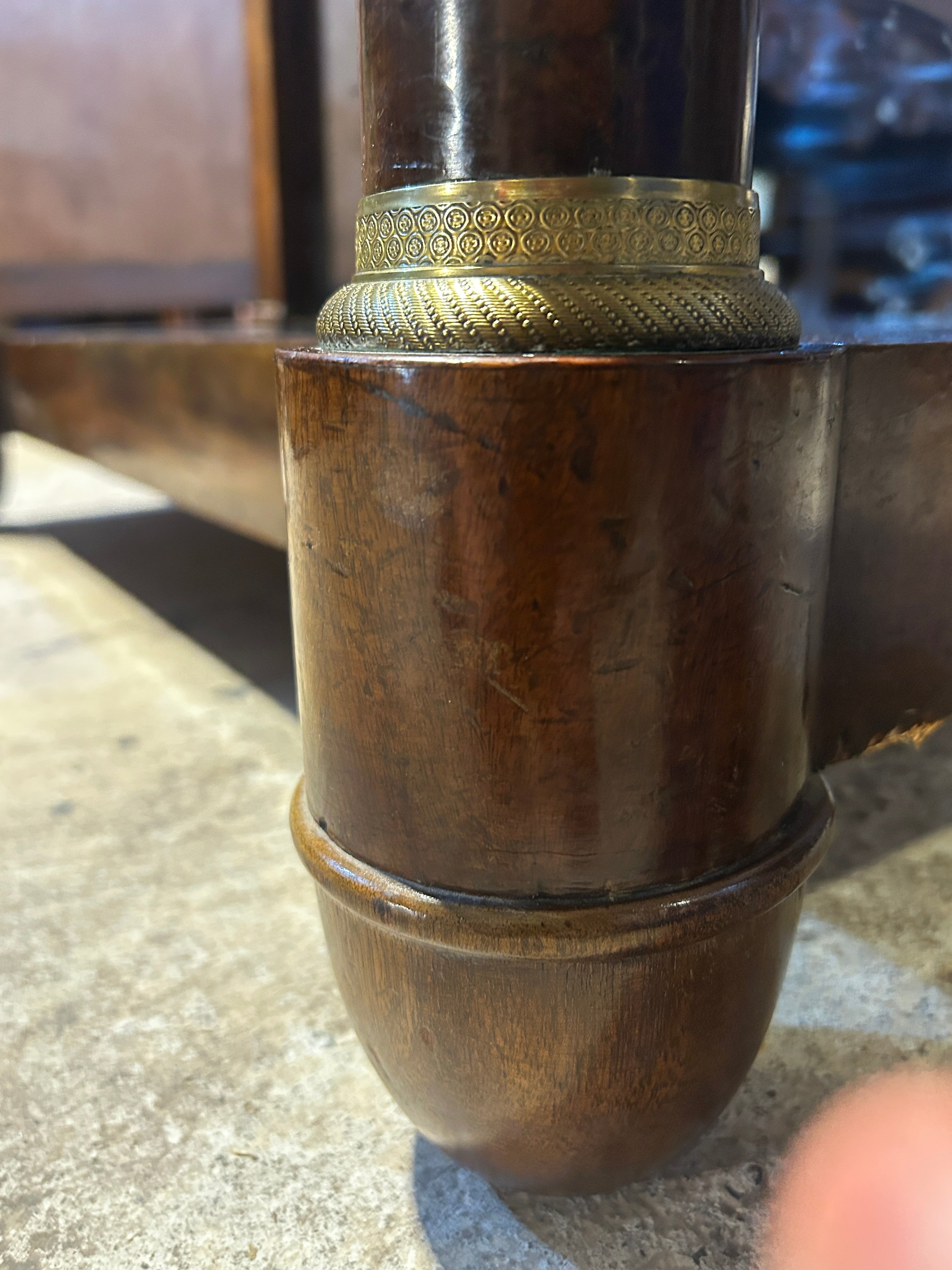 Imponente arrimo estilo imperio de roble enchapado en en caoba, con dos maravillosas columnas de caoba con capiteles de bronce. Posee un cajón central con una corona de laurel en bronce. Su cubierta de mármol original gris Sainte Anne está en excelentes condiciones. Además, destaca un precioso espejo, también de origen, con una sutil oxidación que le otorga una prestancia histórica propia del paso del tiempo de un mueble de la primera mitad del siglo XX.