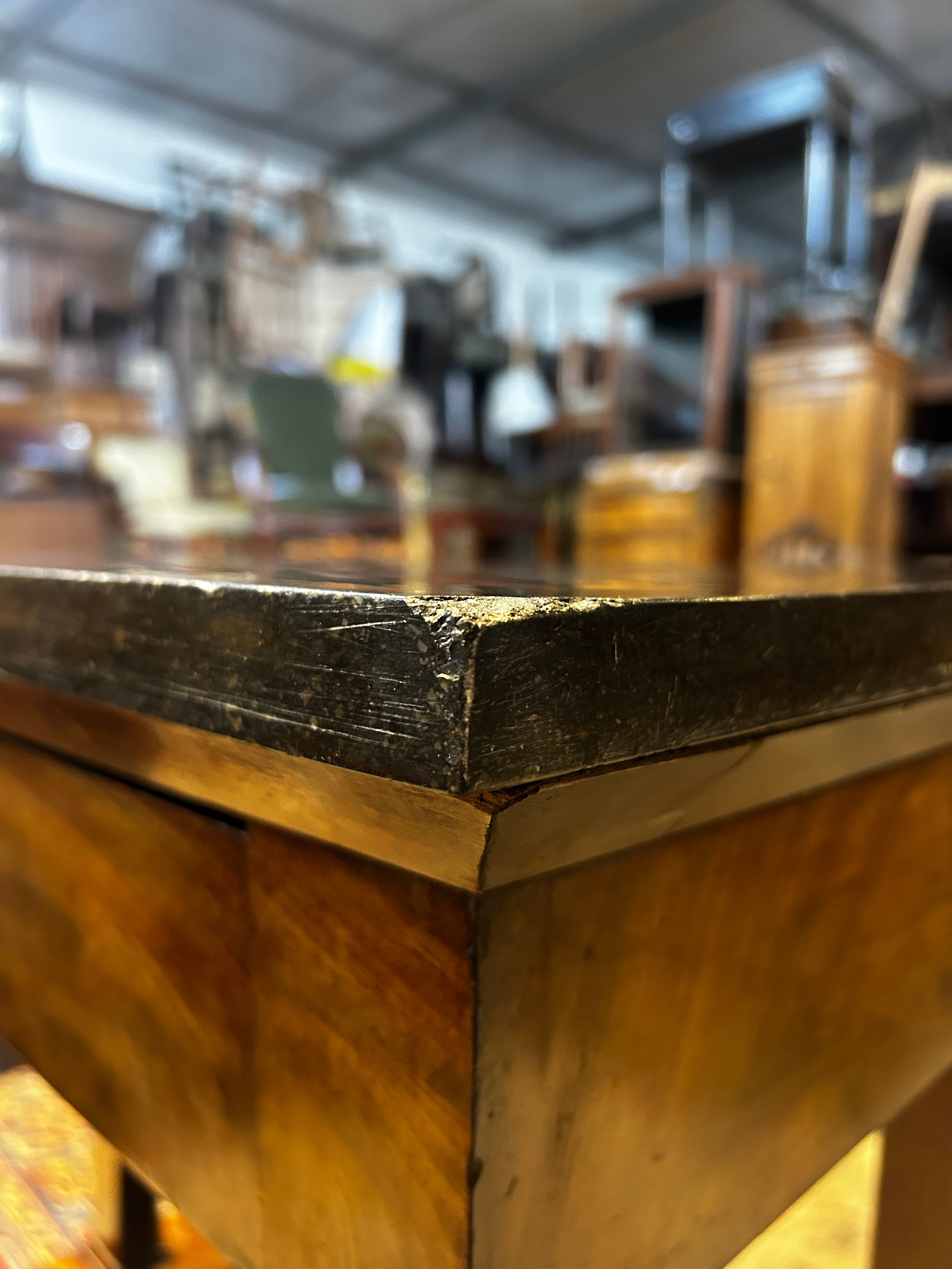 Estado: Buen estado, con desgaste en el espejo, saltaduras leves en una esquina del mármol y saltaduras en enchapado inferior. Cada detalle se puede apreciar en las fotos. Se entrega restaurado.