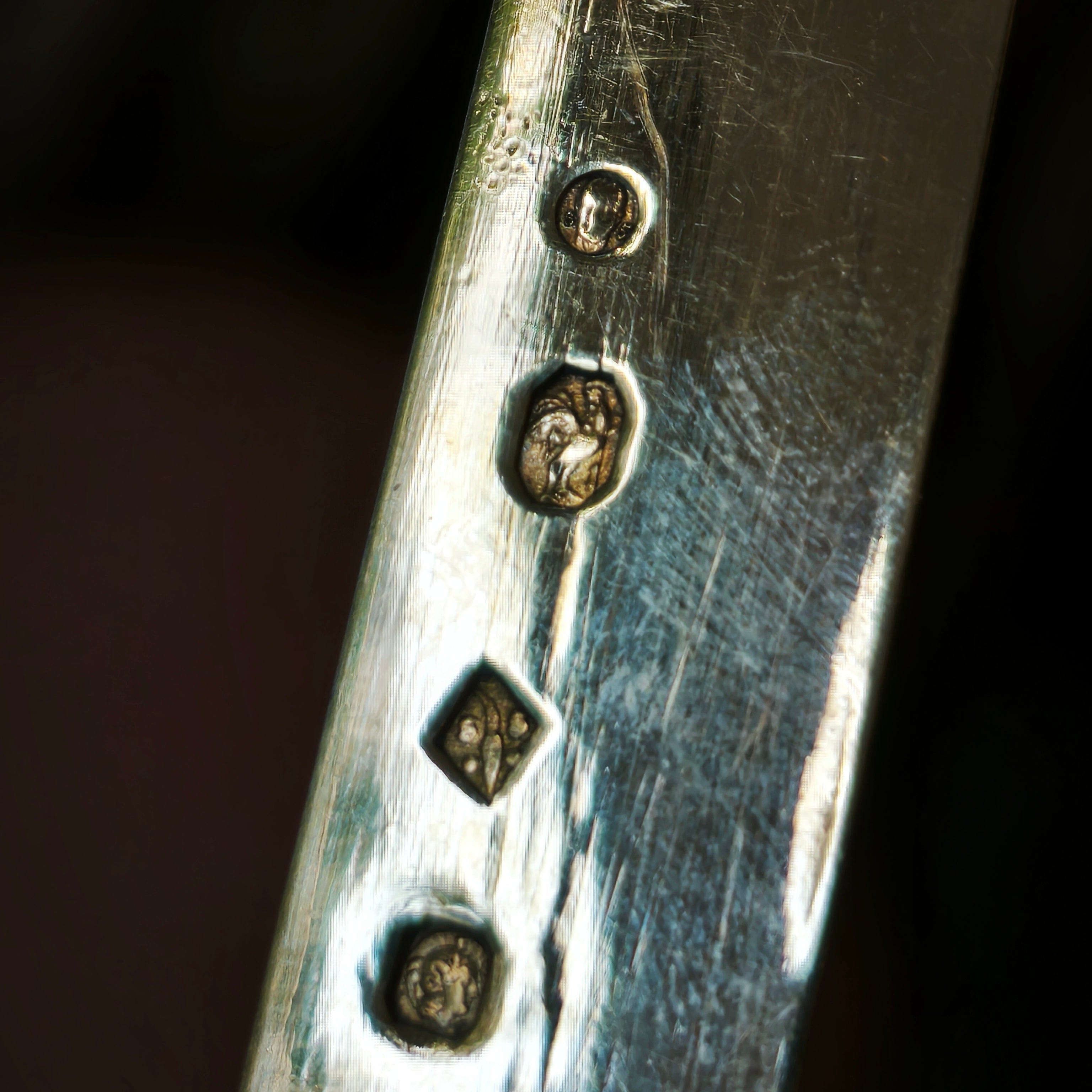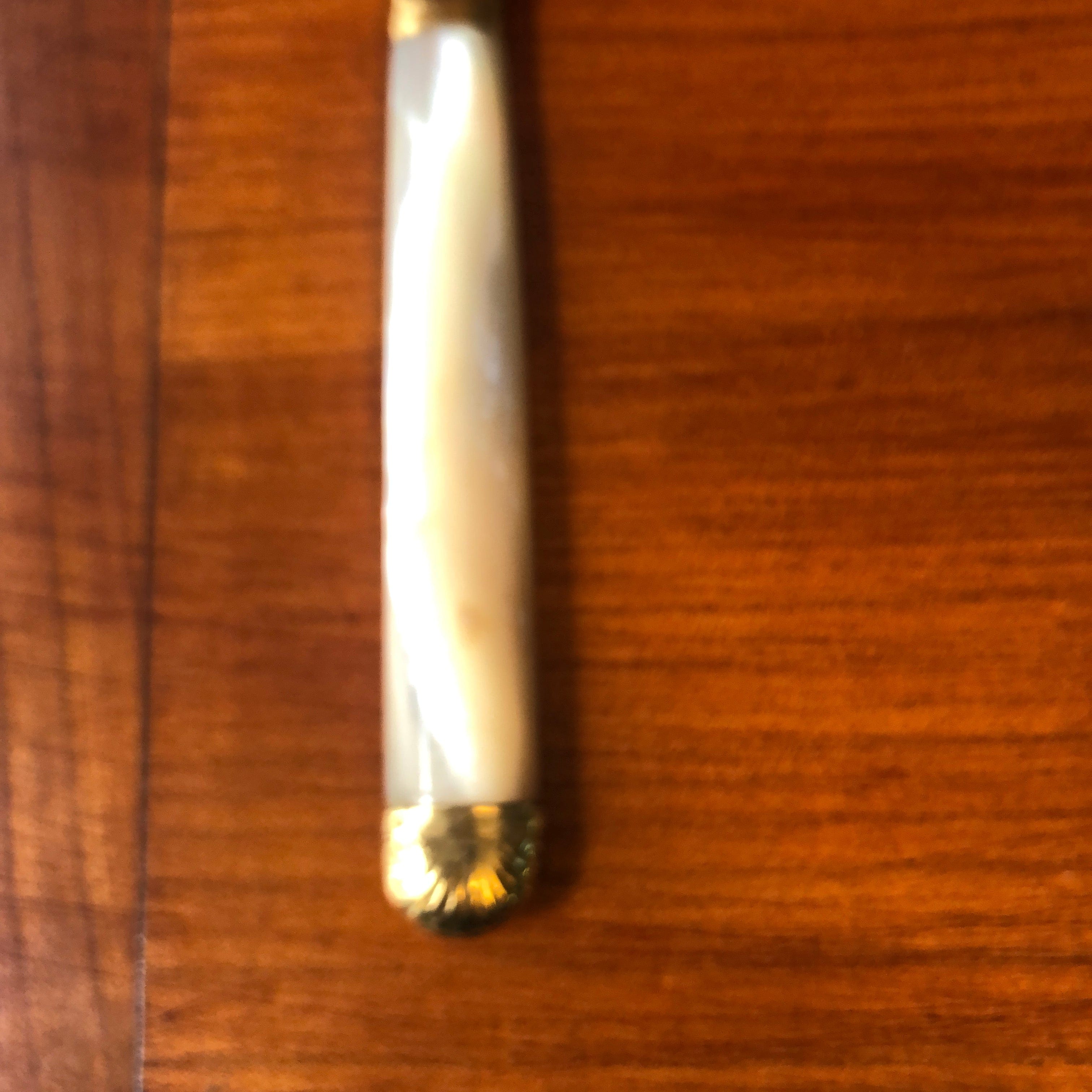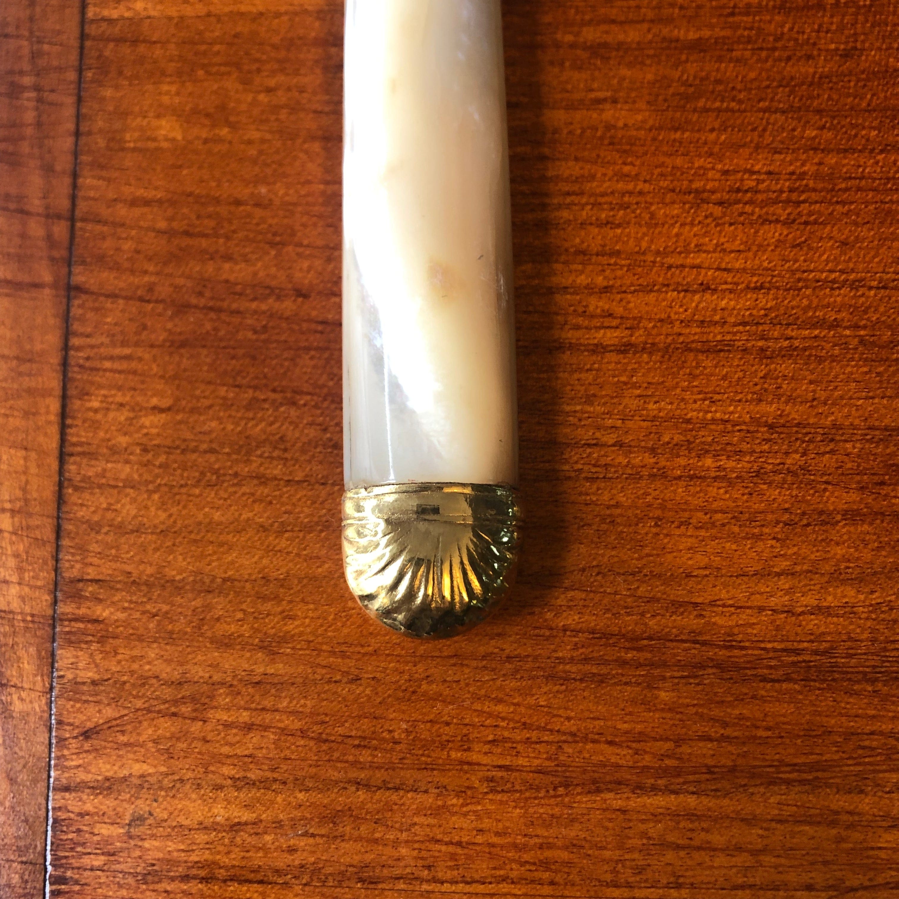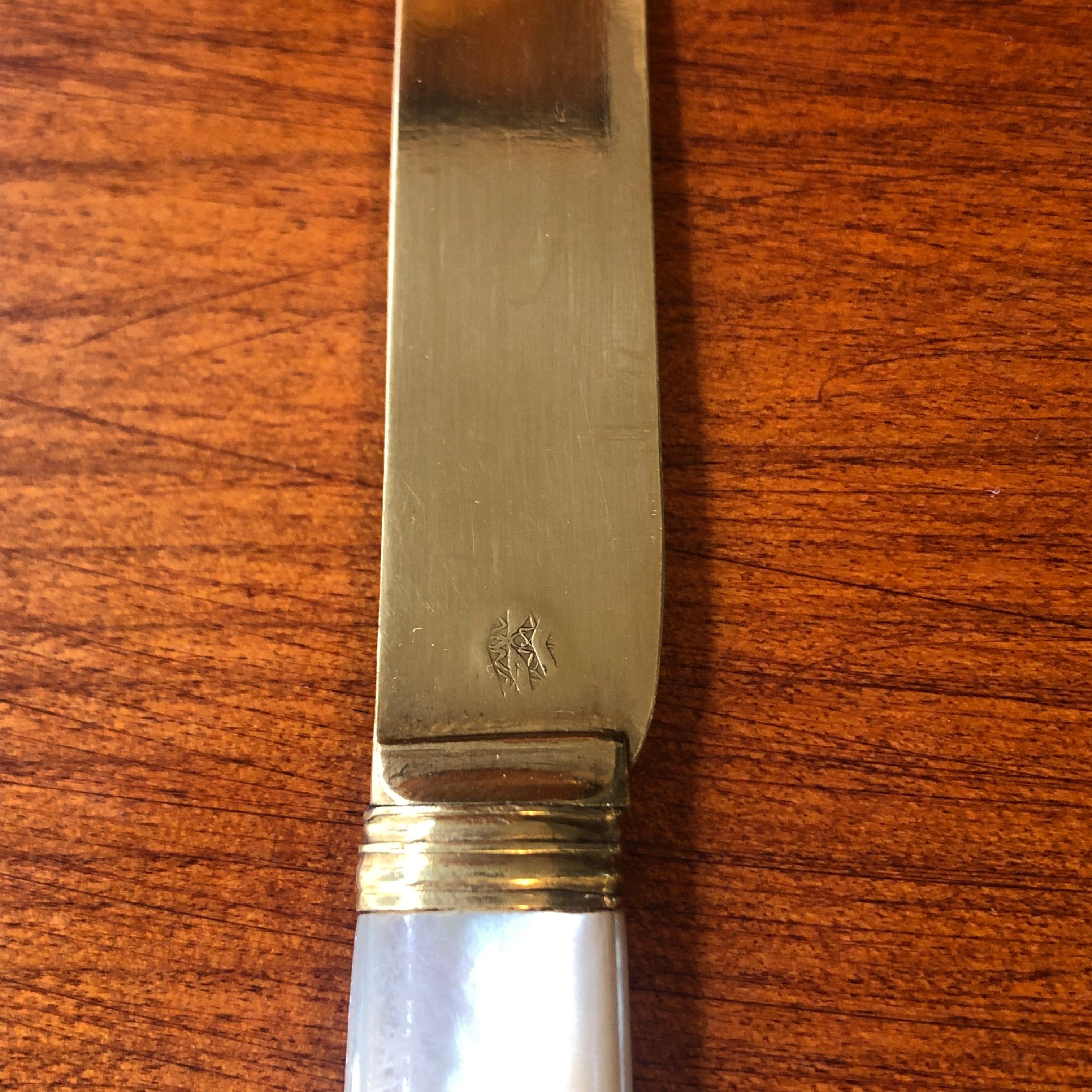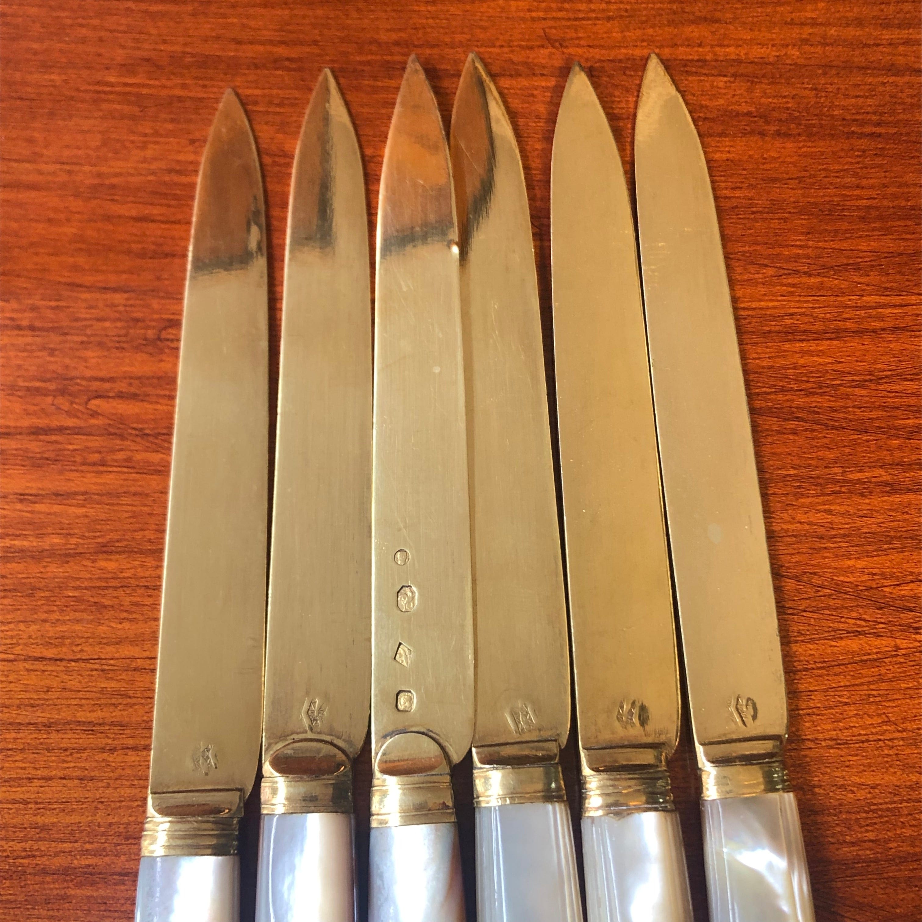 Hermoso juego de 6 cuchillos en técnica vermeil en sus hojas y viróla, es decir, de plata de ley bañada en oro, con mangos de nácar. Cada pieza tiene diferentes sellos del rostro de Sócrates, además de otras figuras.