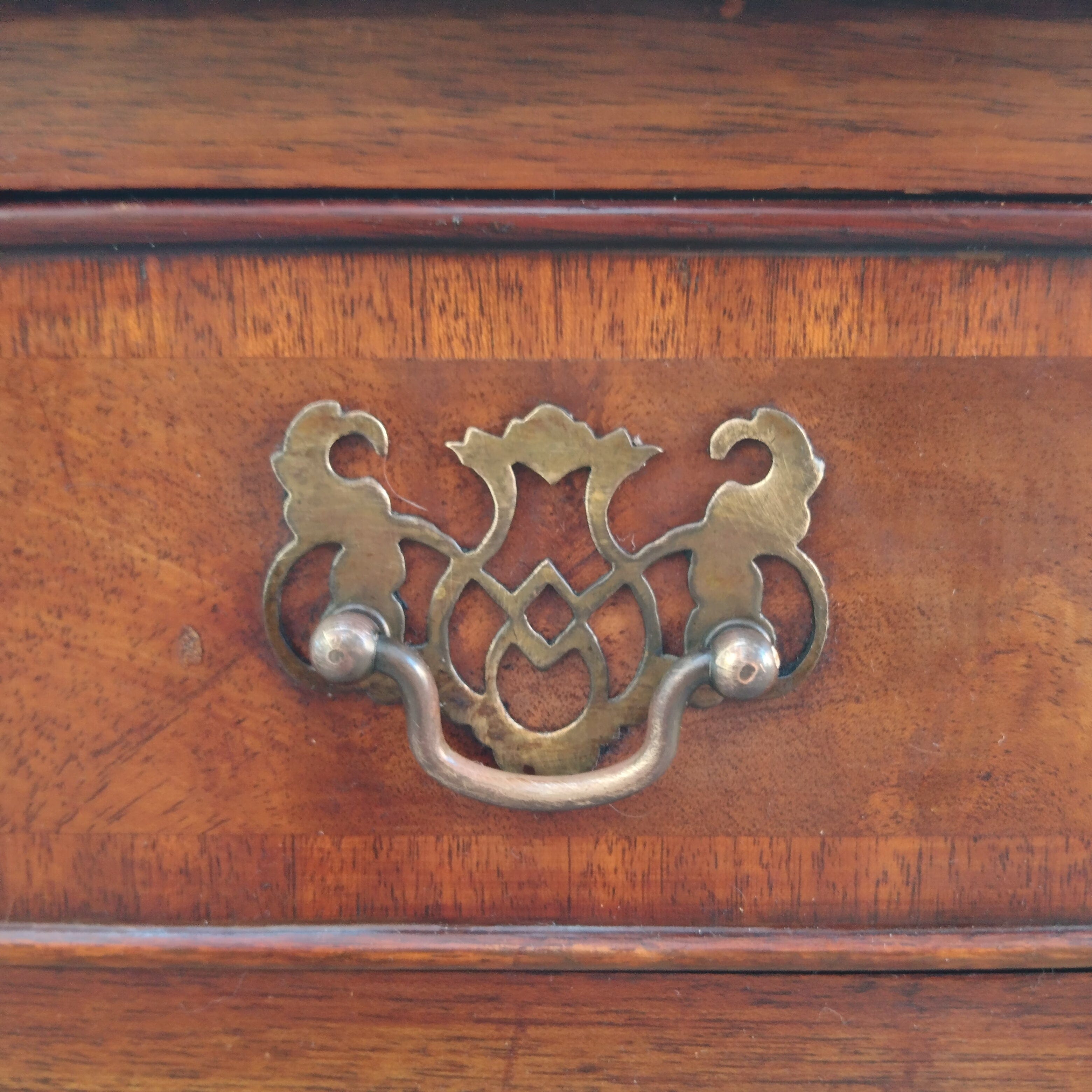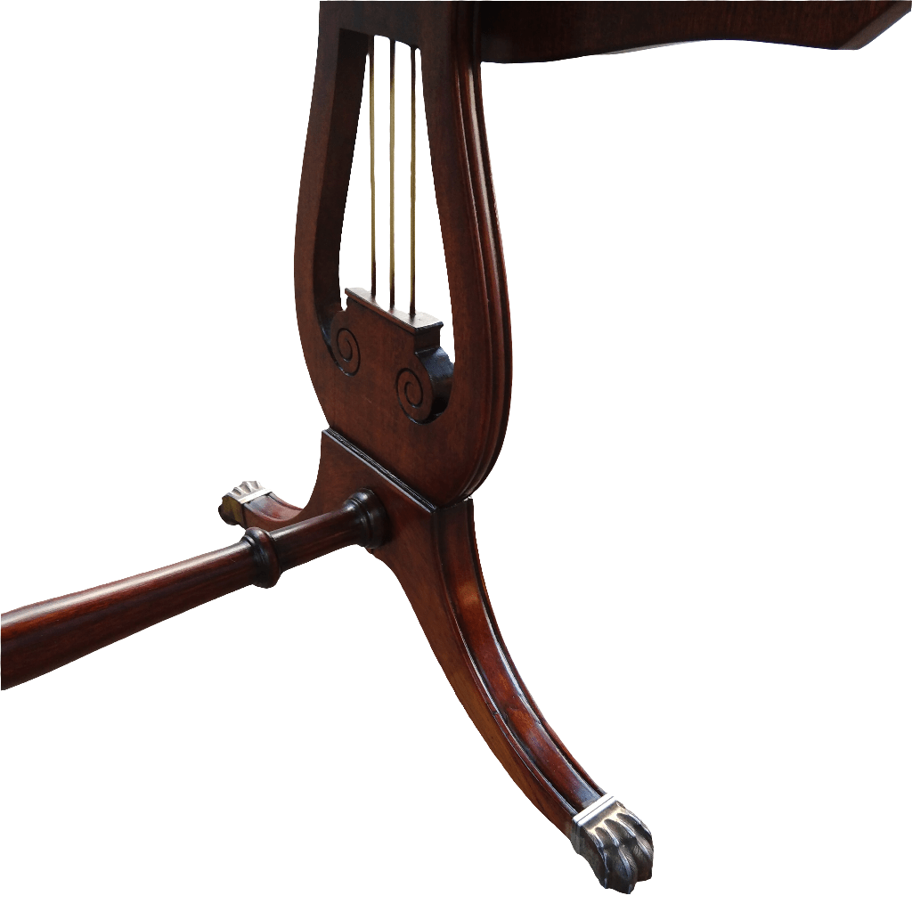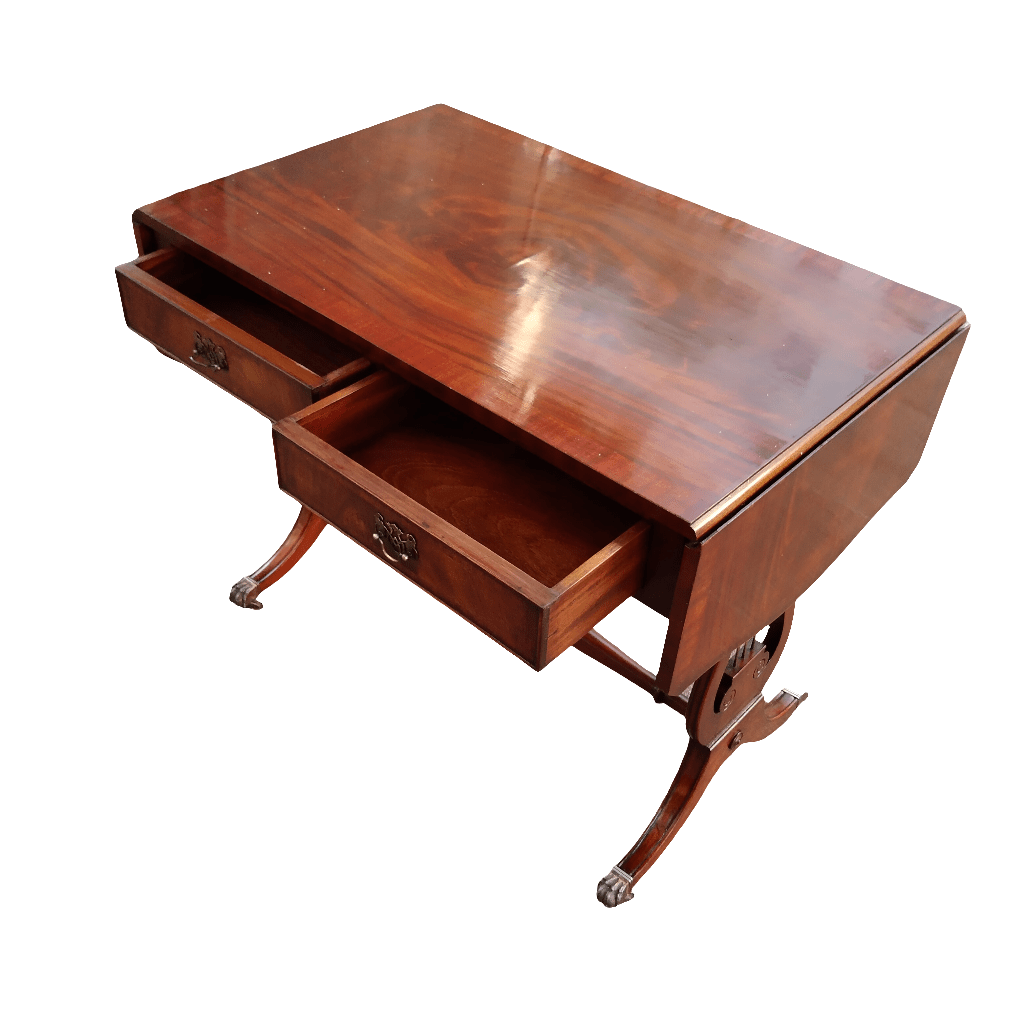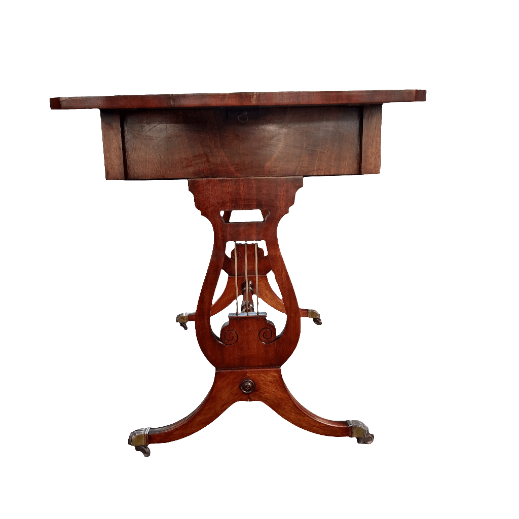 Elegante escritorio inglés extensible en caoba con tiradores y patas de bronce. Bello diseño de patas con forma de arpa y pieza central torneada. El escritorio cuenta con dos cajones.