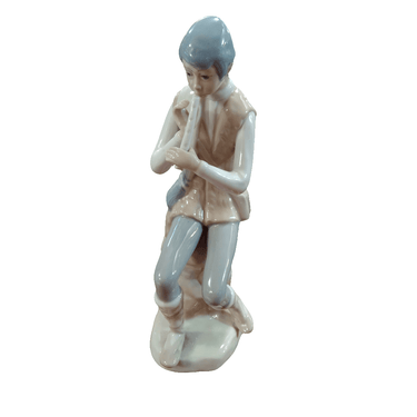 Delicada figura de porcelana española de la marca Casades, fabricada en los años 70. La figura representa a un jóven sentado y tocando una flauta dulce. La pieza está pintada a mano en los clásicos tonos de azulino, blanco y beige, típicos de este estilo de porcelana.