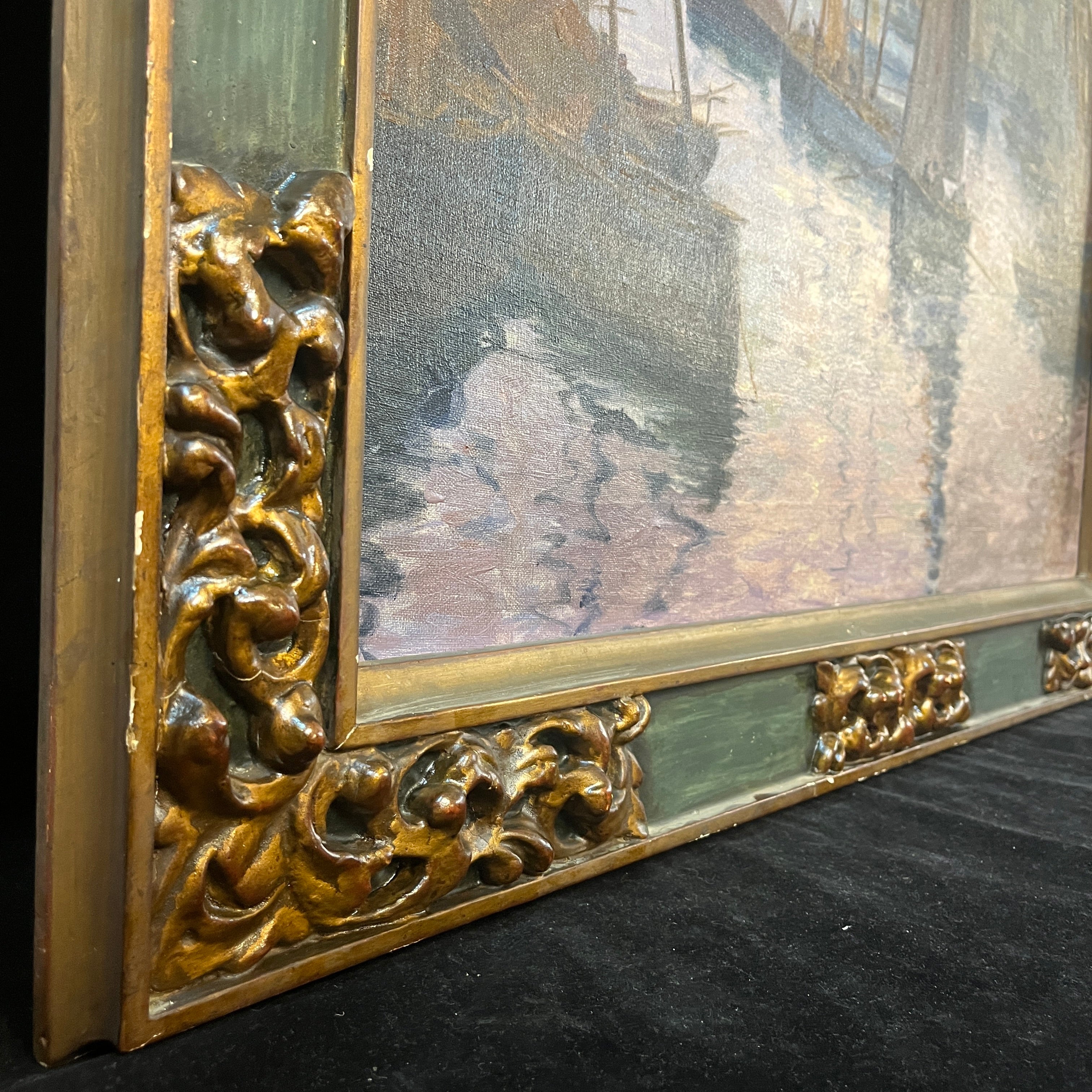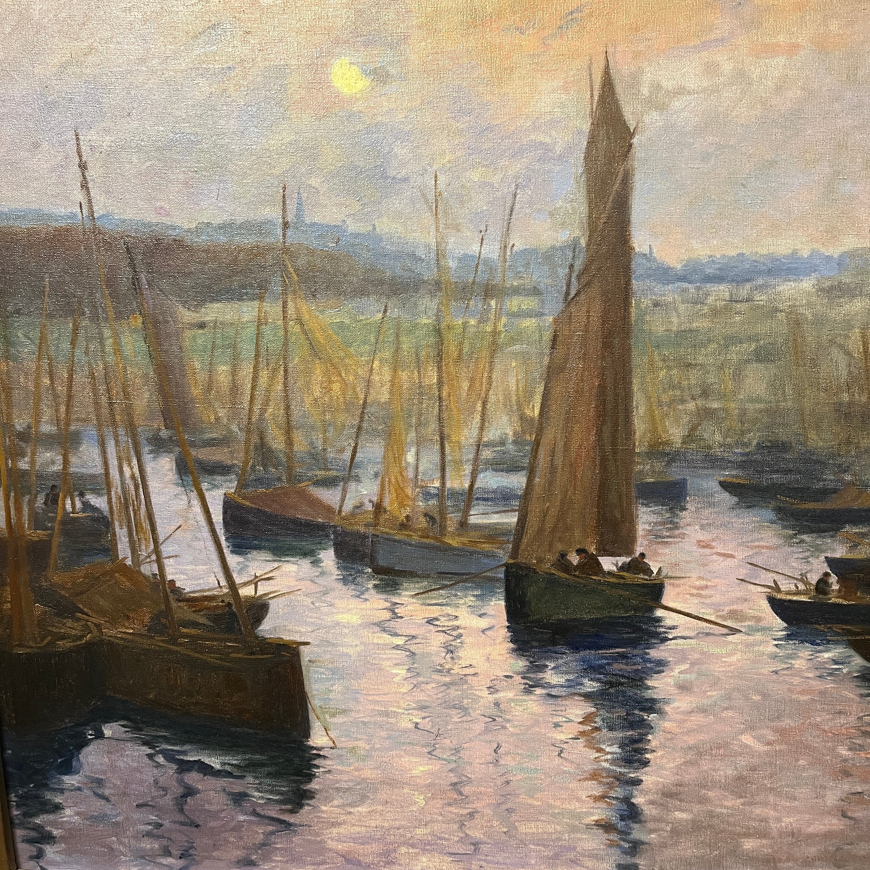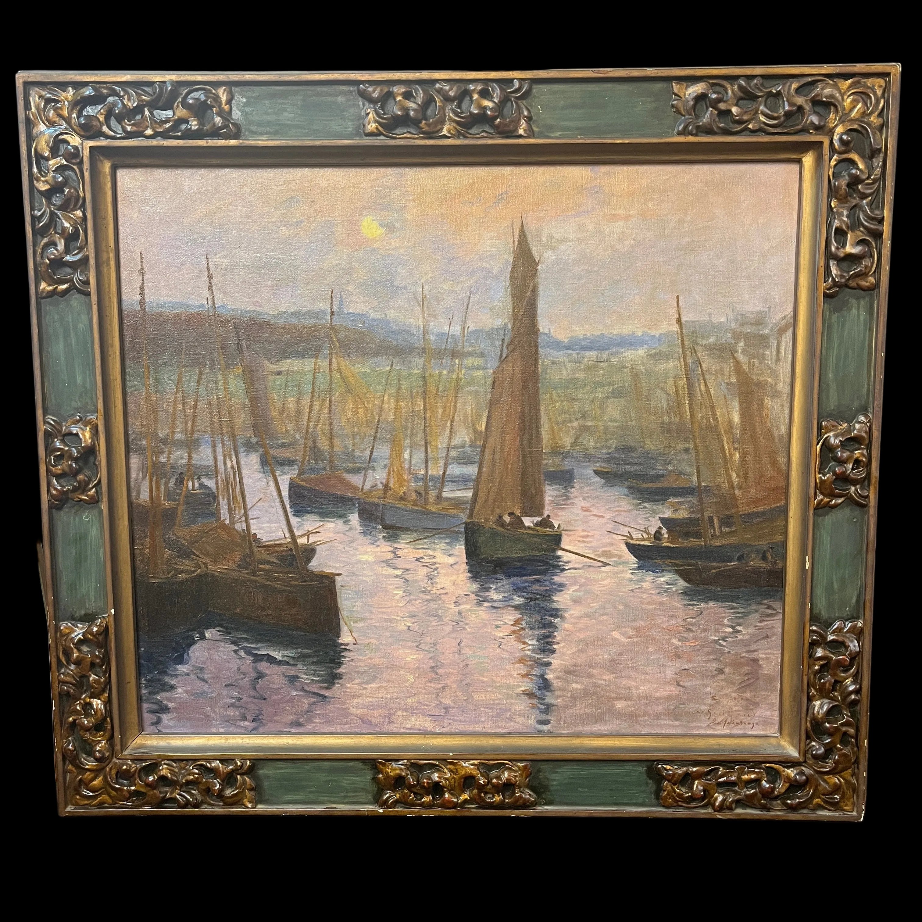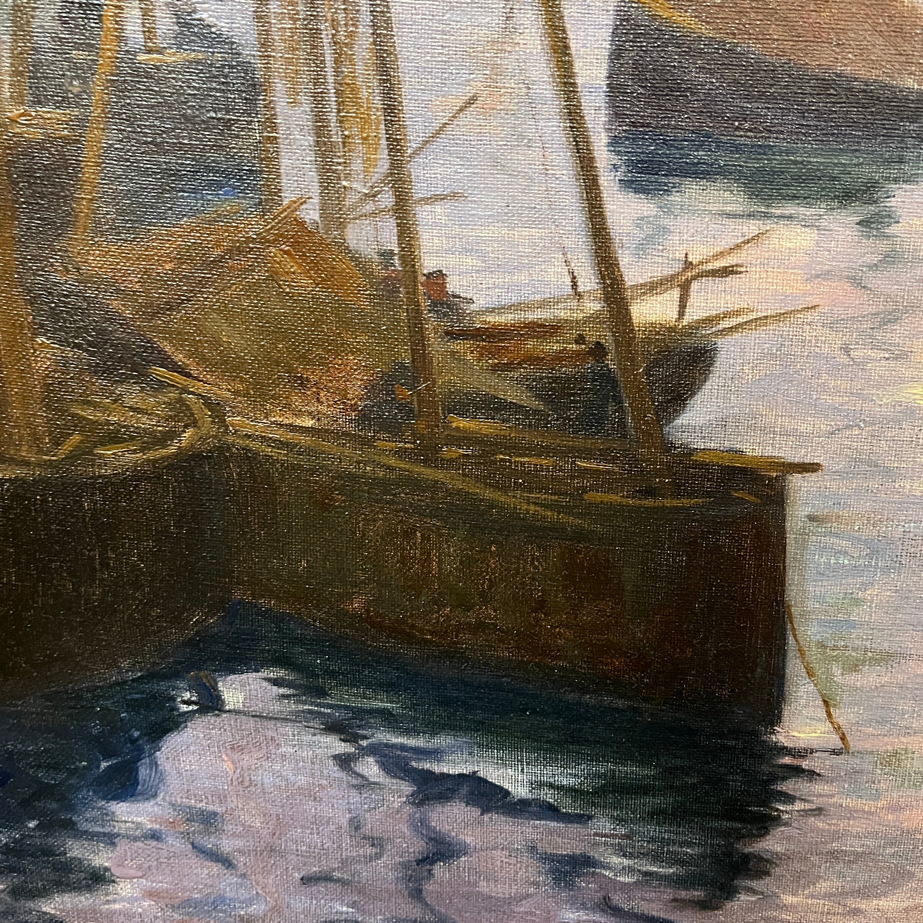 Óleo sobre tela del artista chileno Andrés Madariaga (1878-1920), representando un puerto con muchos botes a vela amarrados, bajo un cielo en tonos rosas, que nos sugiere un amanecer, haciendo delicados reflejos en el agua. La pintura es parte de la breve obra del pintor, debido a su muerte a temprana edad. La obra es un buen ejemplo de la influencia de la escuela del maestro español Fernando Álvarez de Sotomayor en los pintores chilenos de la generación del trece, caracterizada por temáticas realistas, retratando la vida del proletariado con sus luces y sombras, cargadas de melancolía. Está enmarcada en madera tallada en relieves decorativos pintados en verde y dorado.
