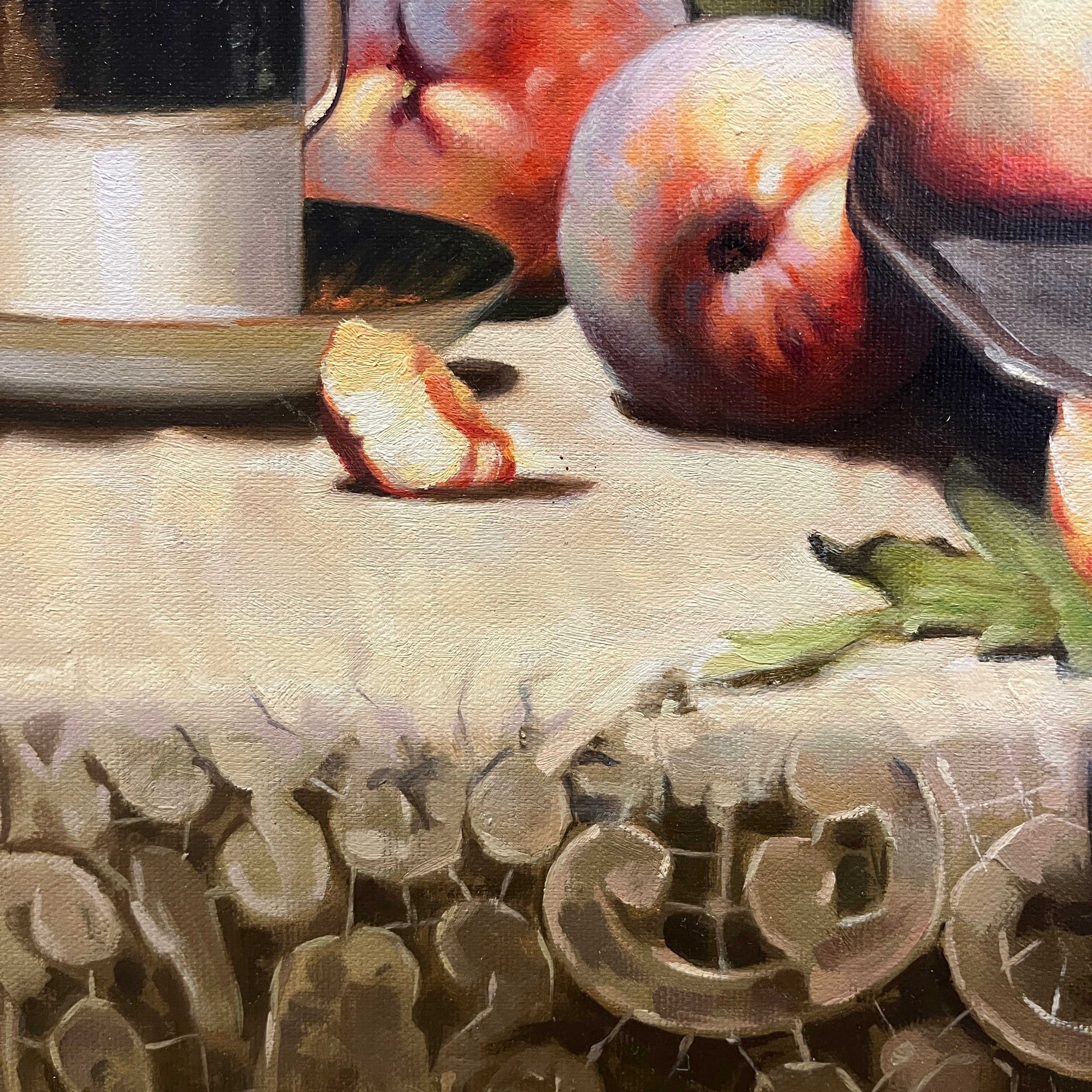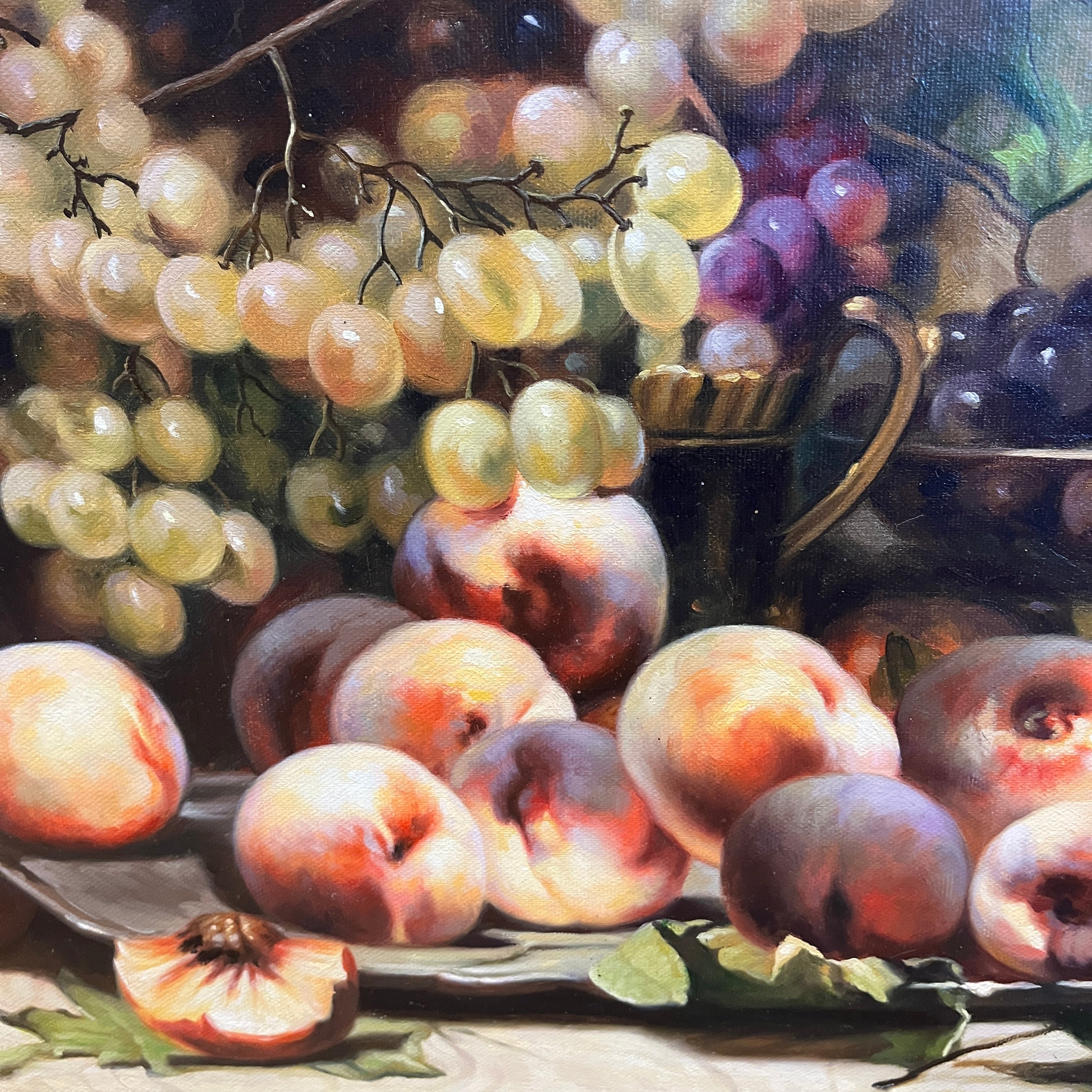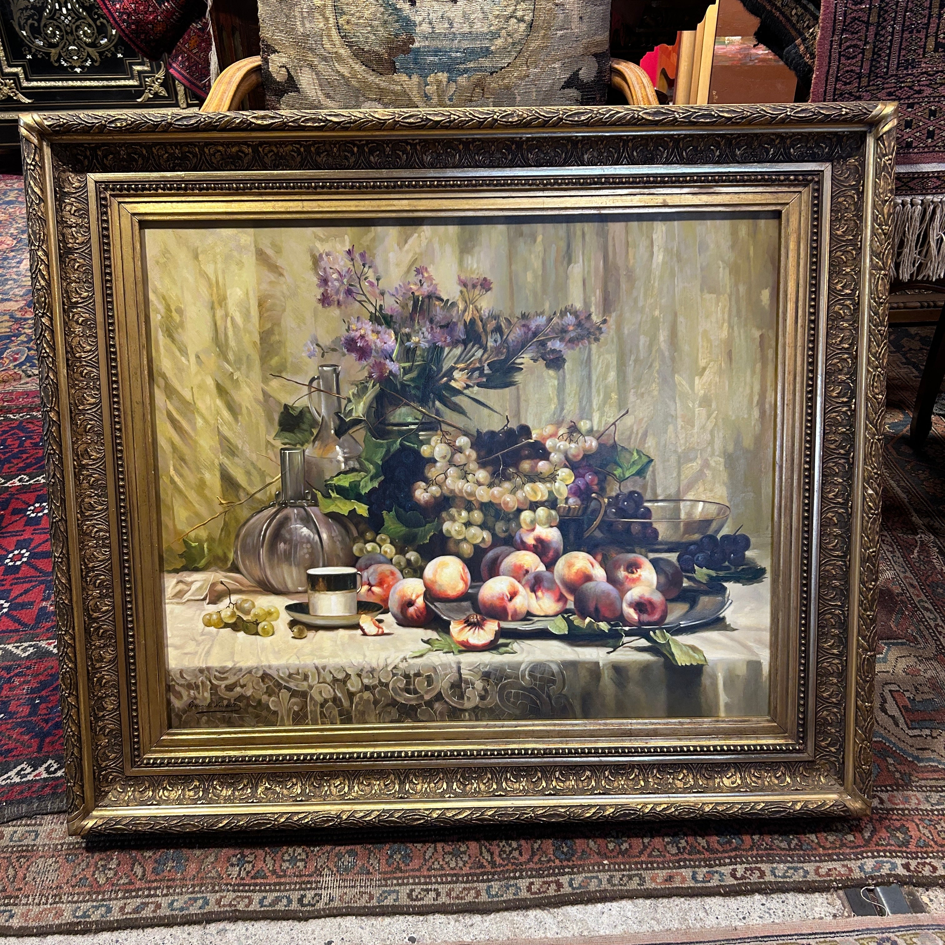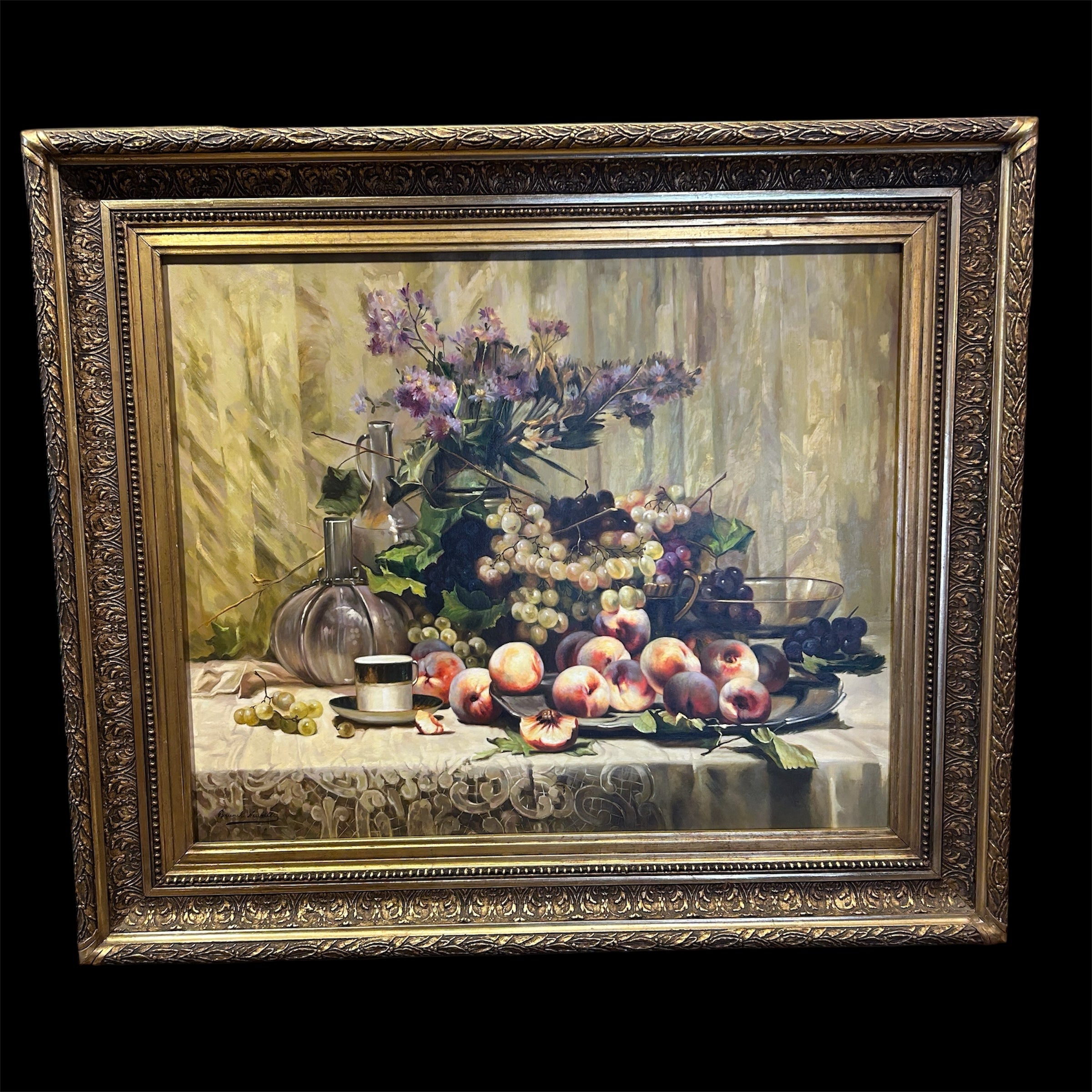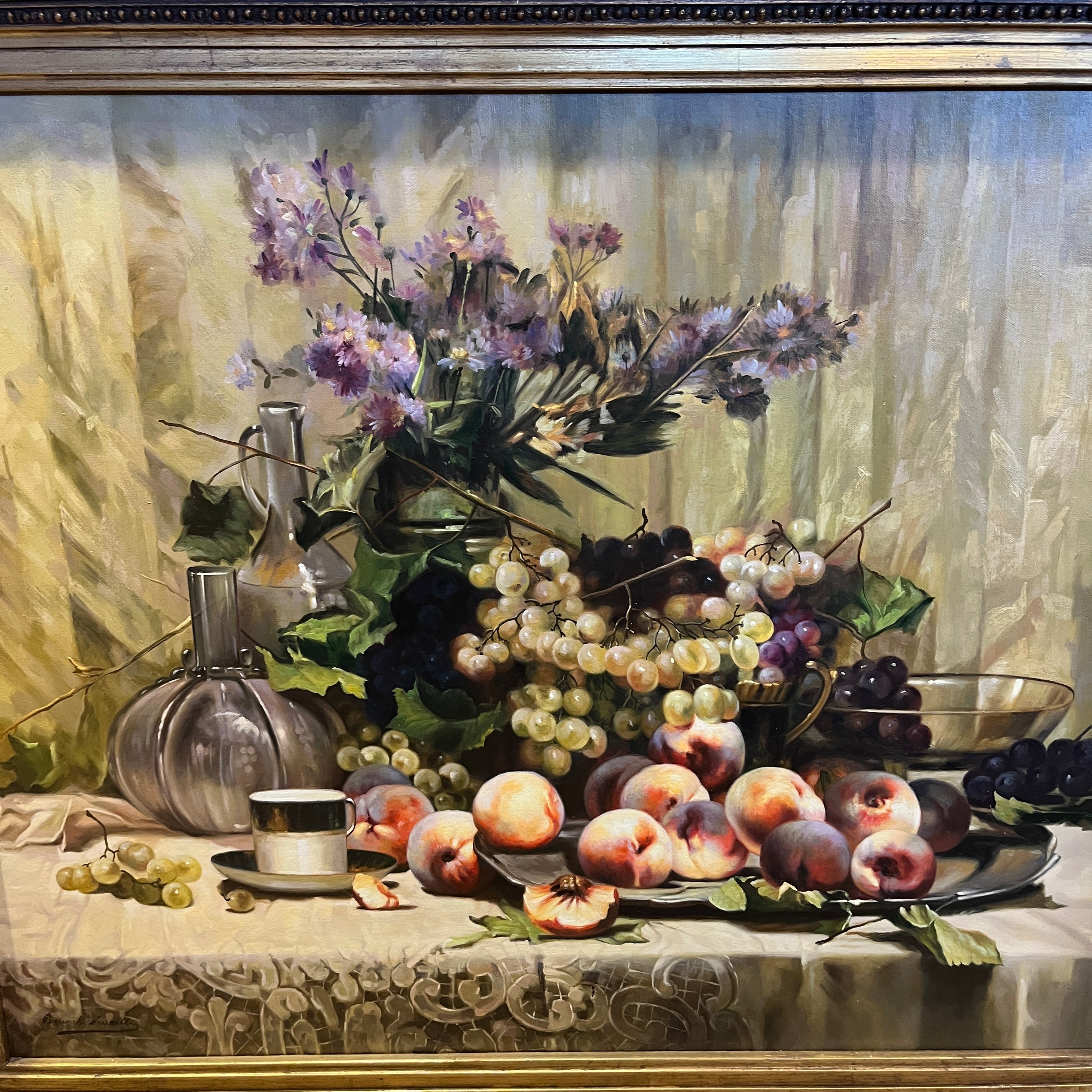 Espectacular óleo sobre tela del artista francés Laurent Brunel-Neuville (1852-1941), representando un bodegón de flores y frutas sobre una mesa. la composición incluye uvas, duraznos, flores en un jarrón, y varios recipientes de vidrio y metal. Otro elemento destacable es el detalle de encaje en el mantel. Se trata de una obra de muy lograda técnica realista, trabajo de luz, color y texturas. La obra está enmarcada en madera tallada en relieves decorados, terminados en un elegante y luminoso dorado.
