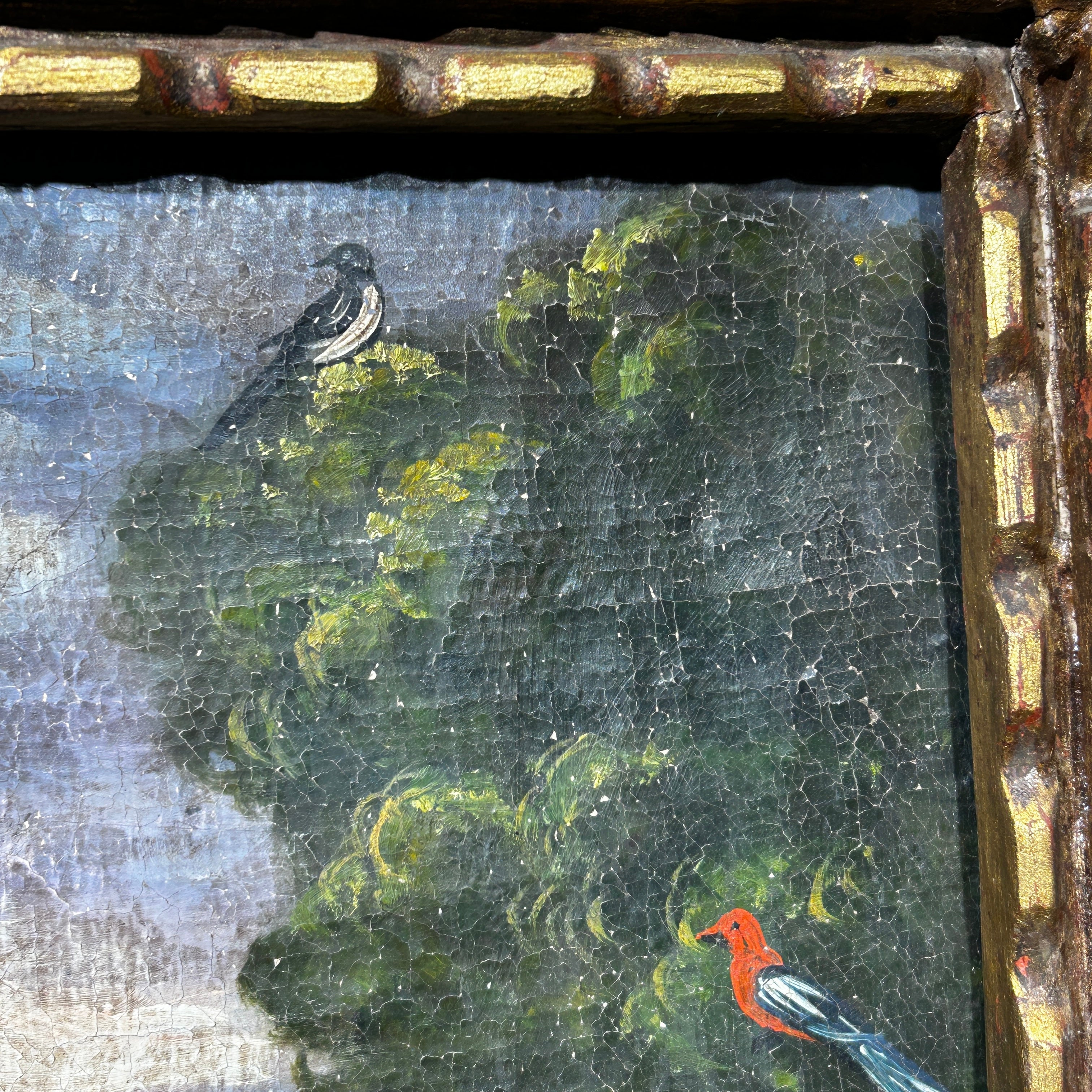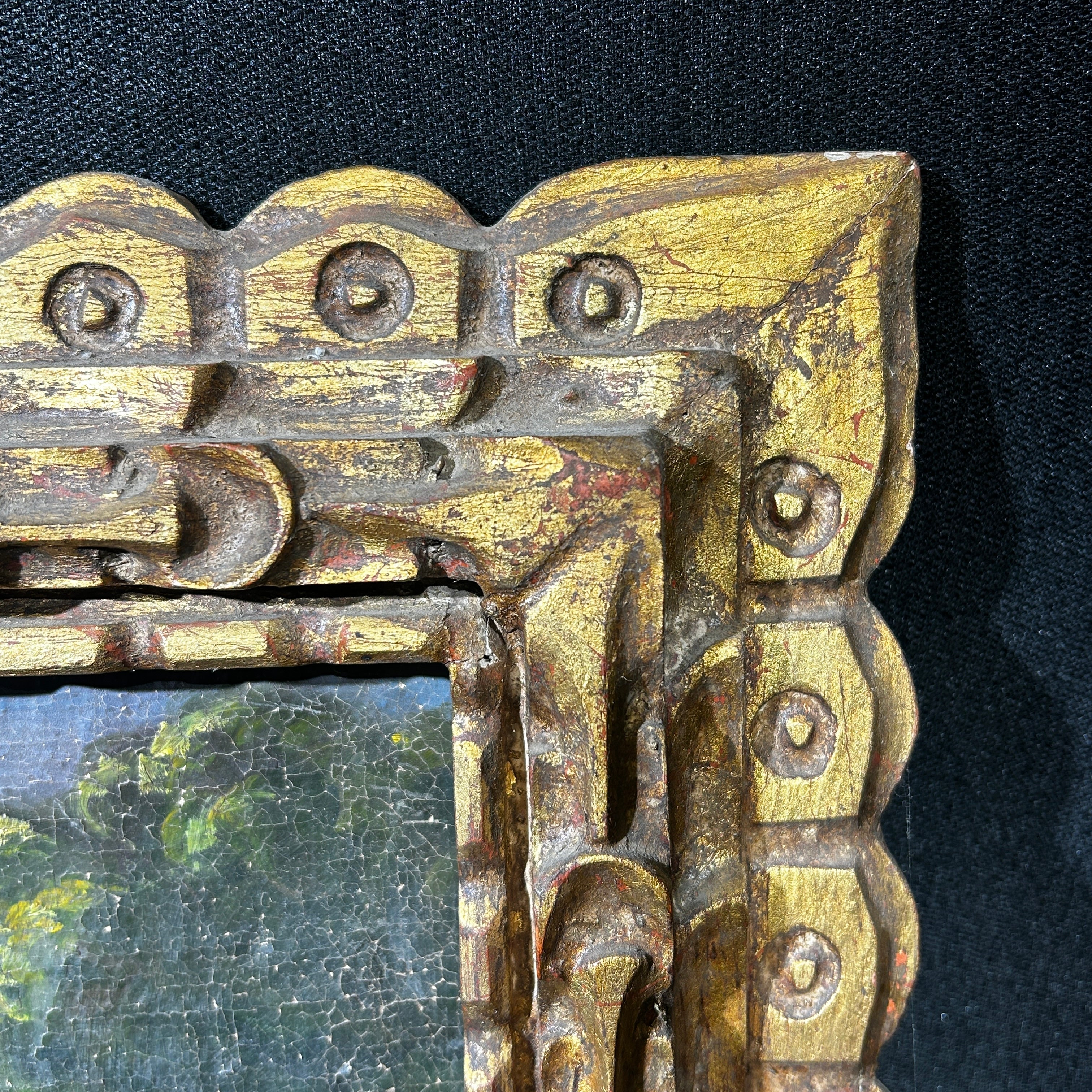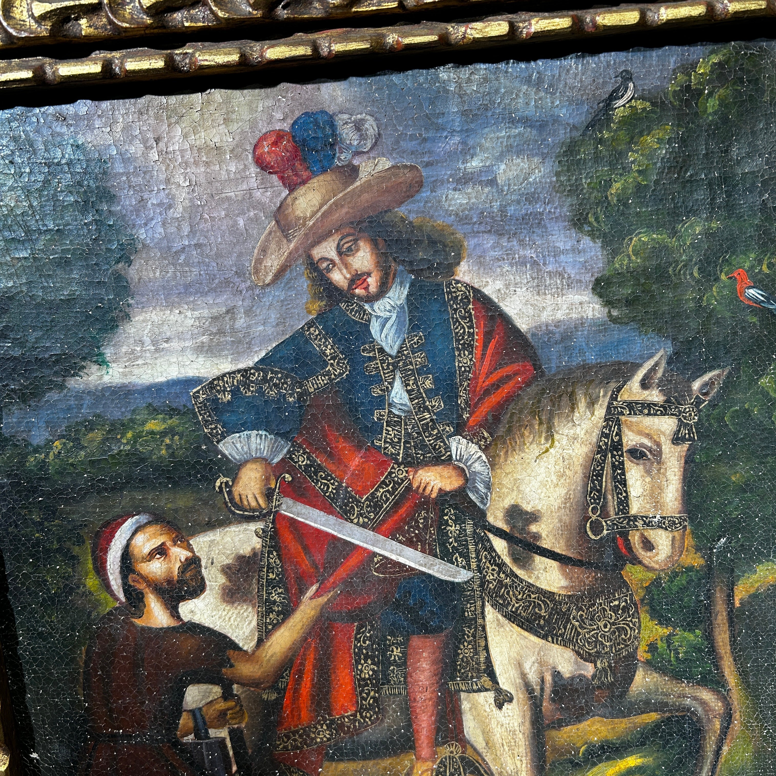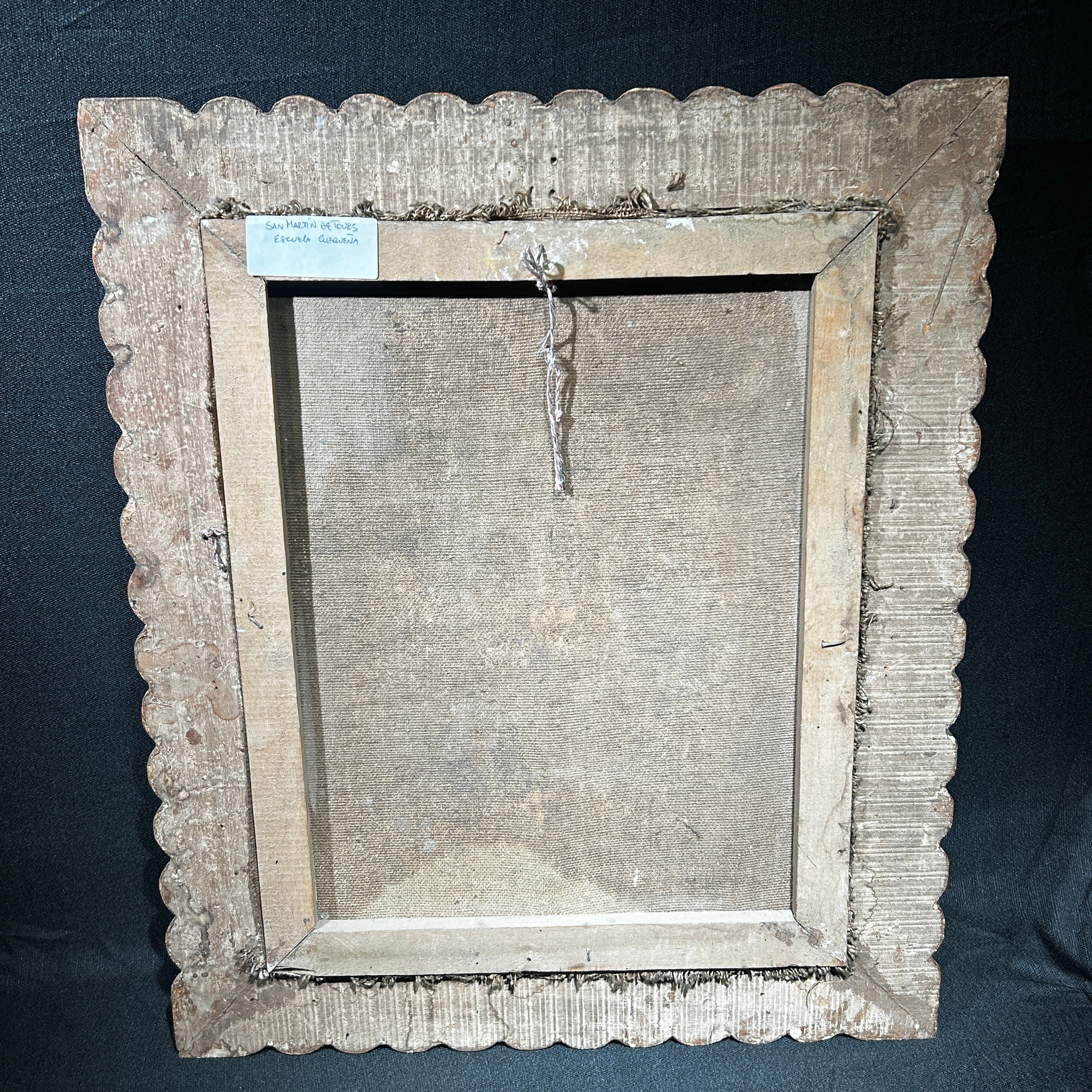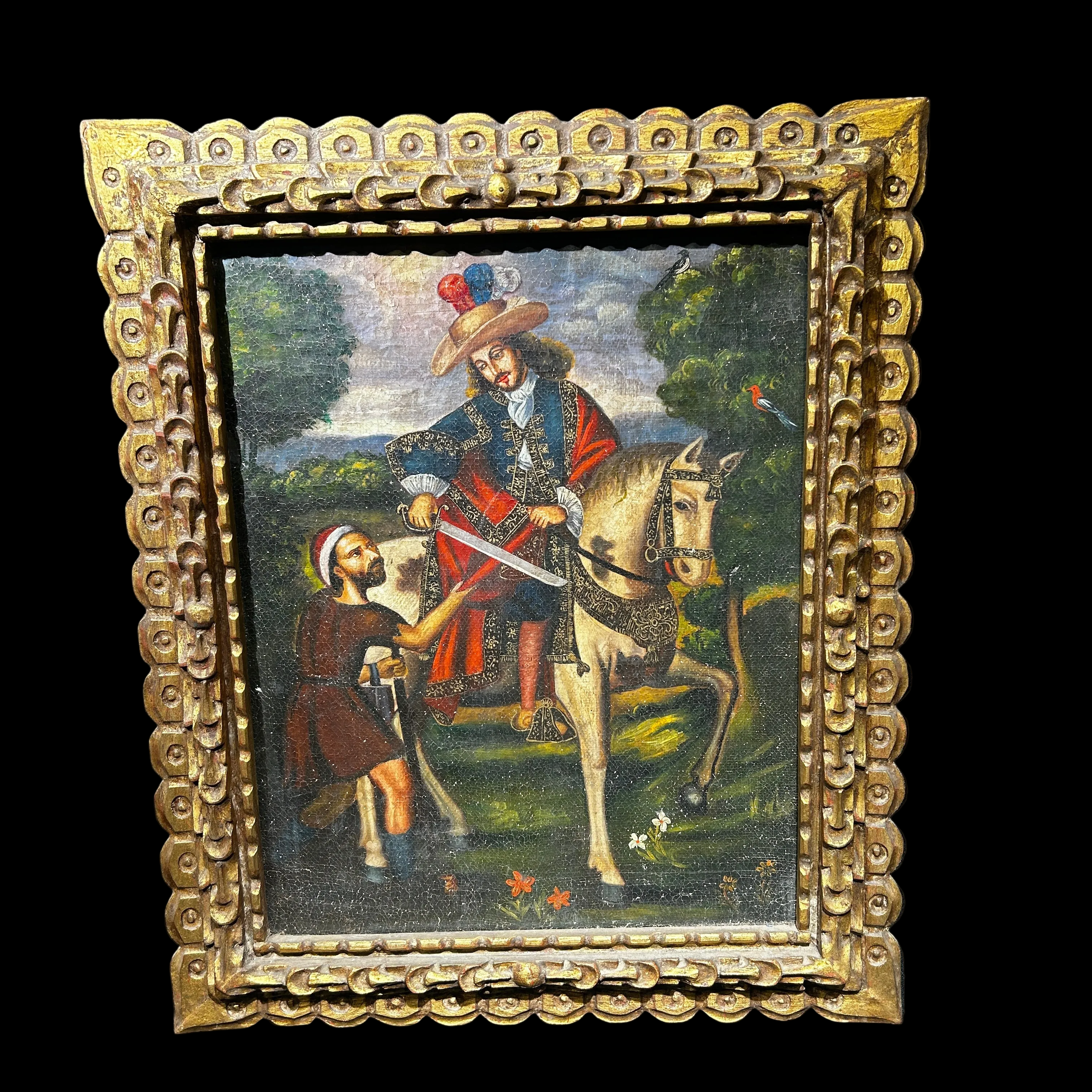 Óleo sobre tela de la escuela cuzqueña, representando a San Martín De Tours, obispo católico elevado a santo y patrono de diferentes localidades en Francia. la obra tiene un elegante marco de madera tallada y pintada de luminoso dorado.