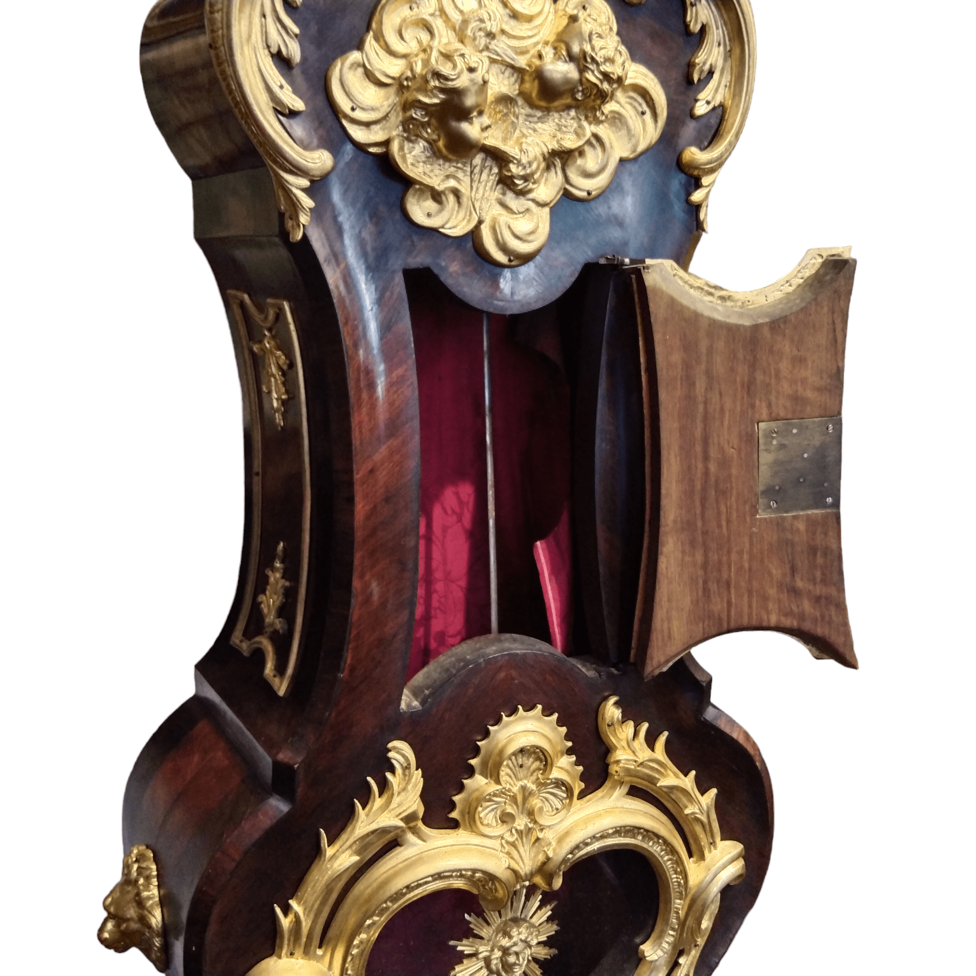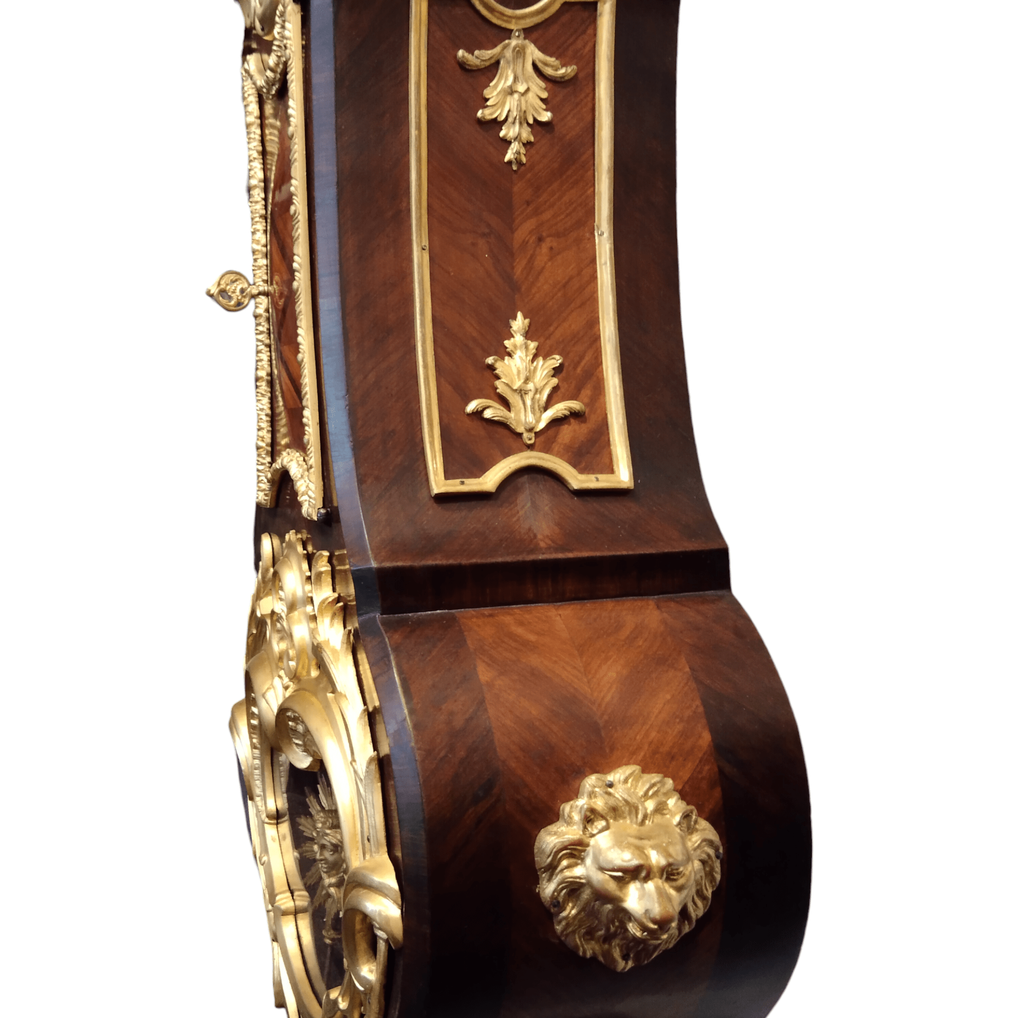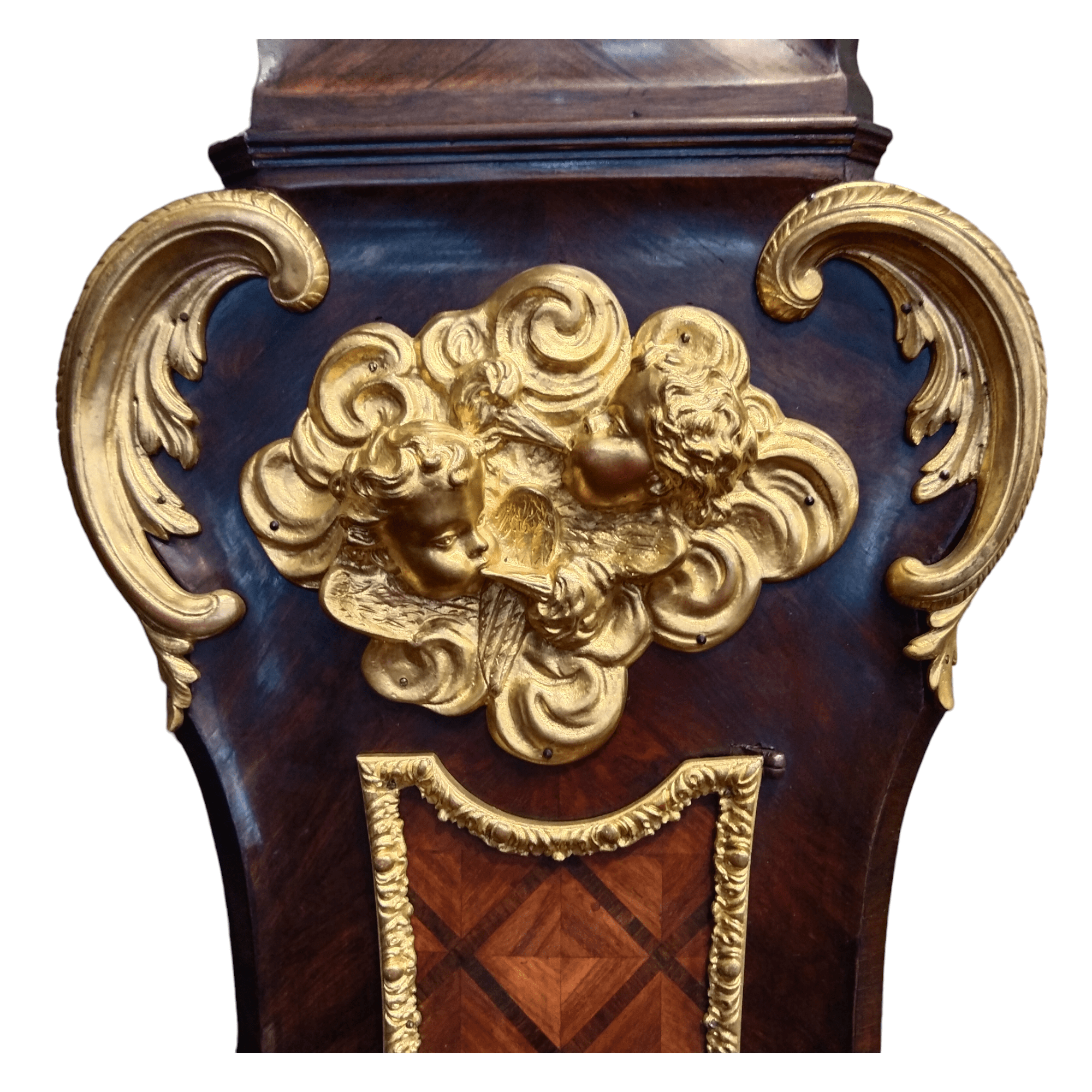 Reloj de caja larga estilo Luis XV, de origen y fabricación francesa del siglo XIX, con magníficas y detalladas aplicaciones en bronce ormolú.