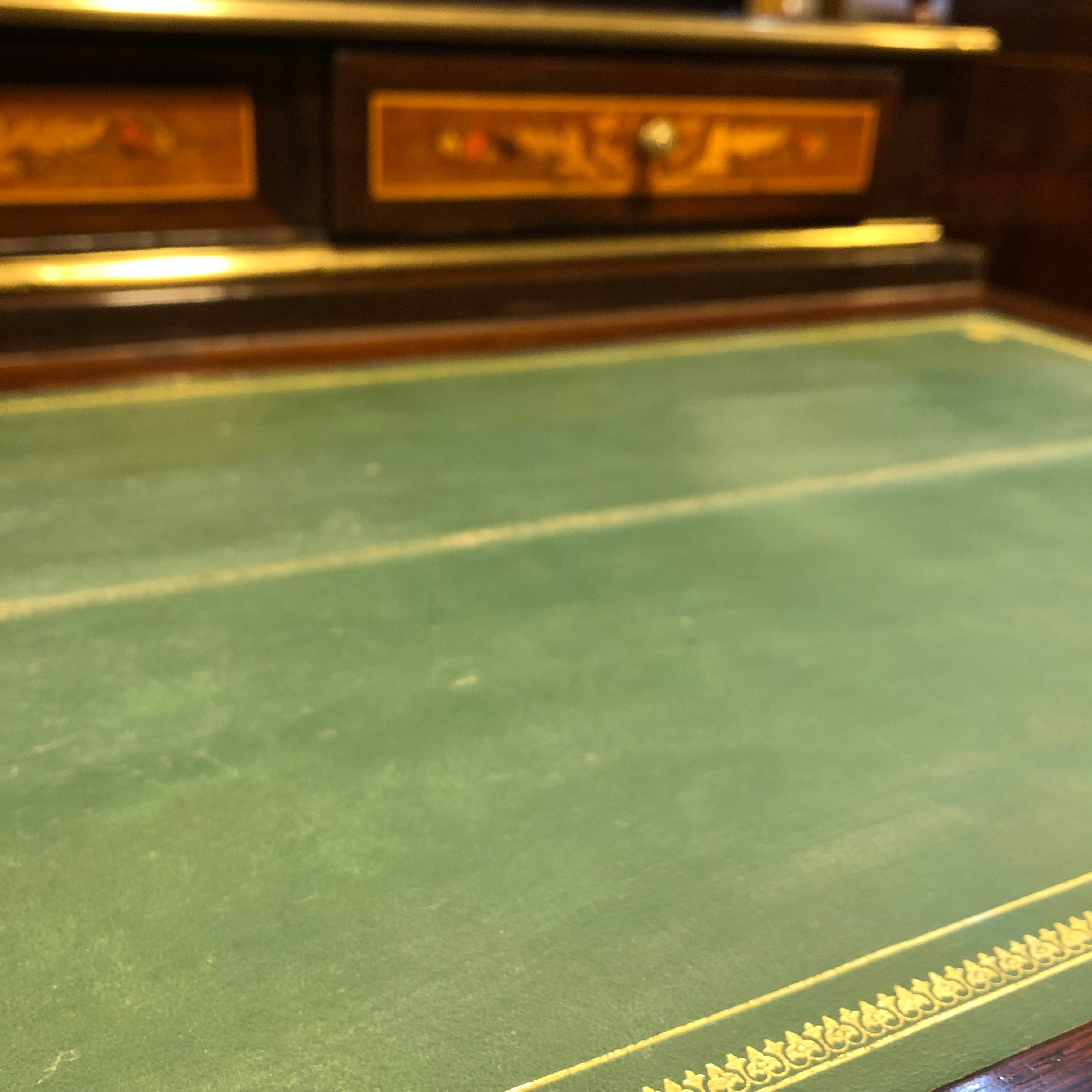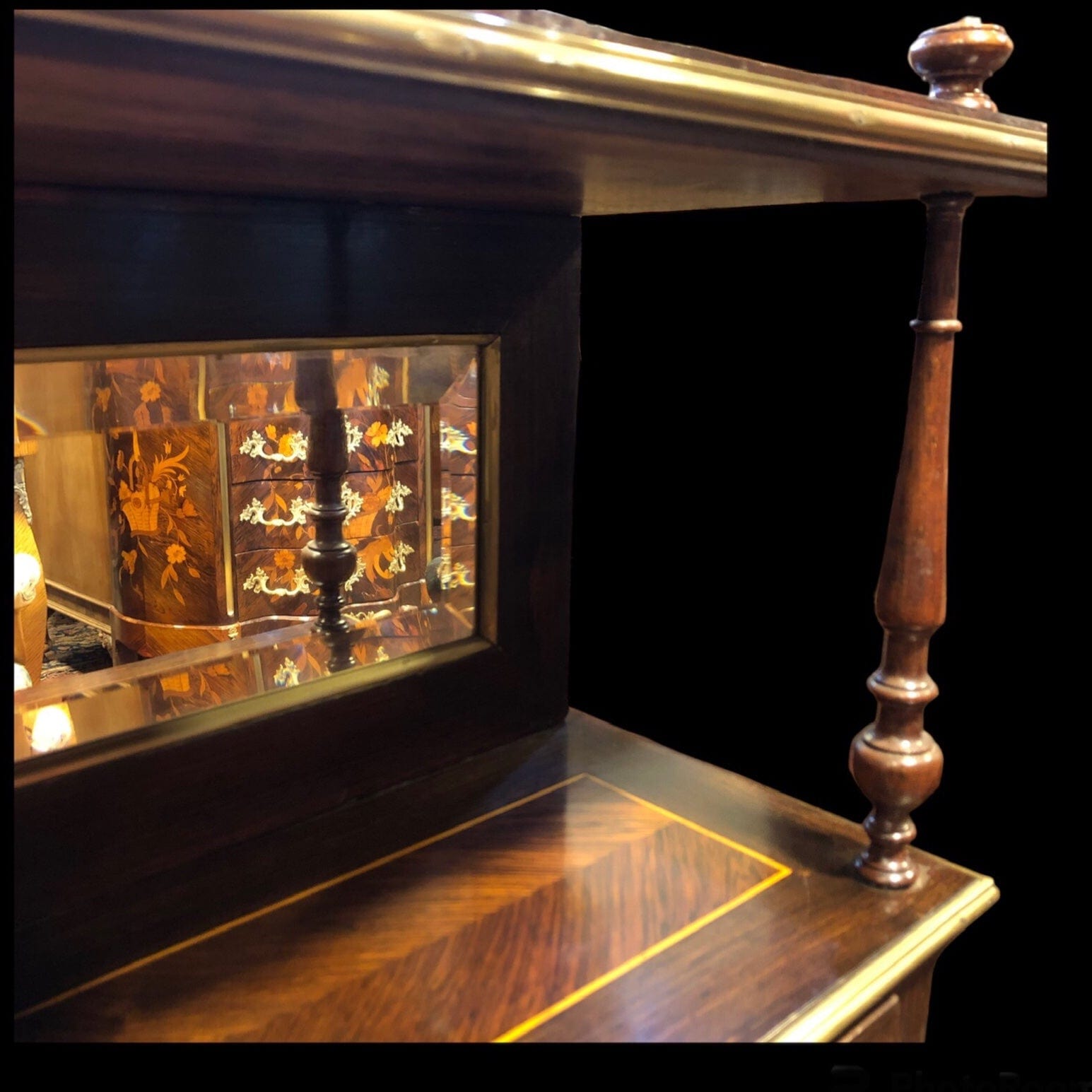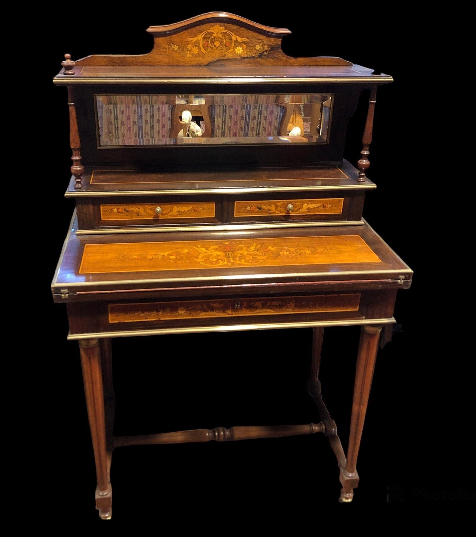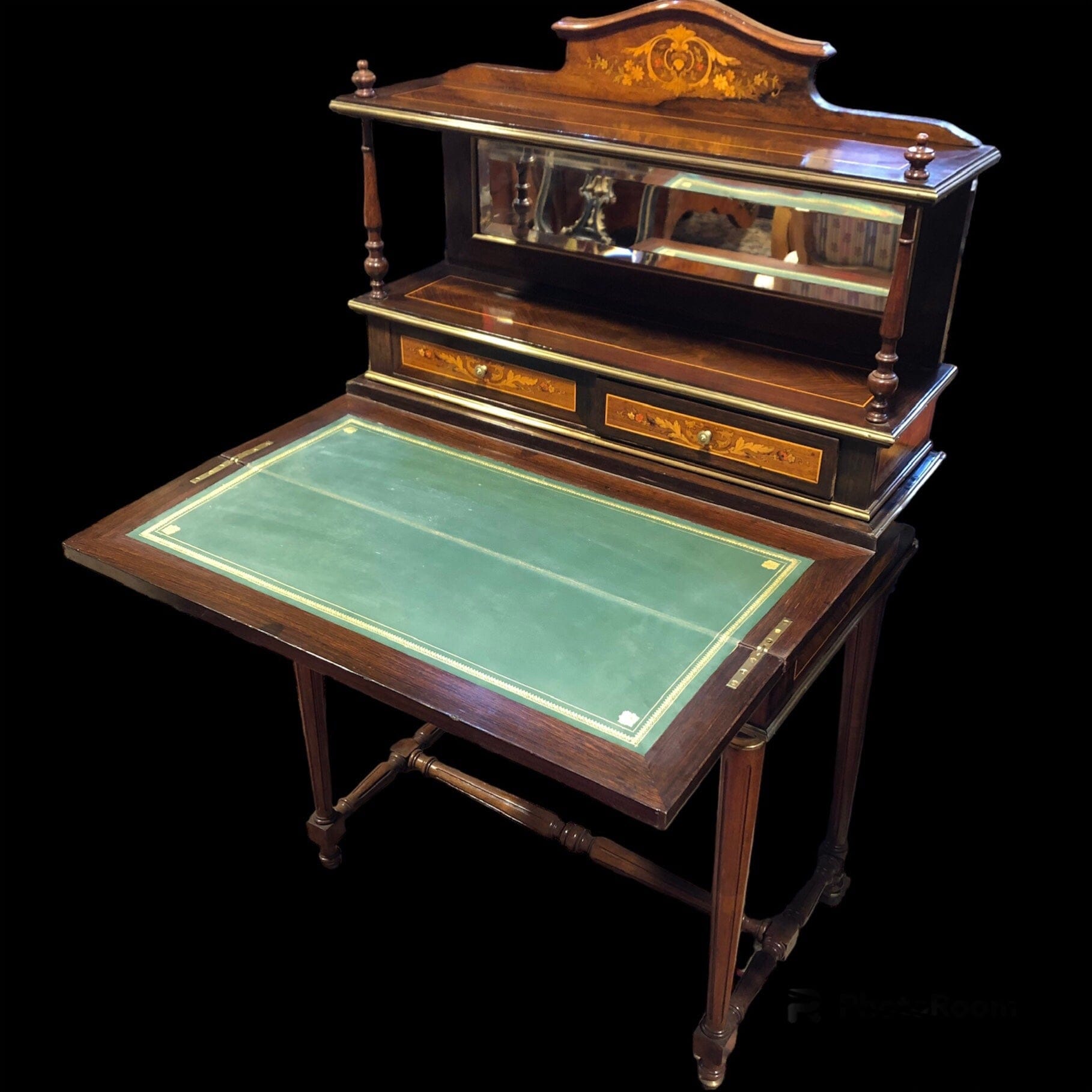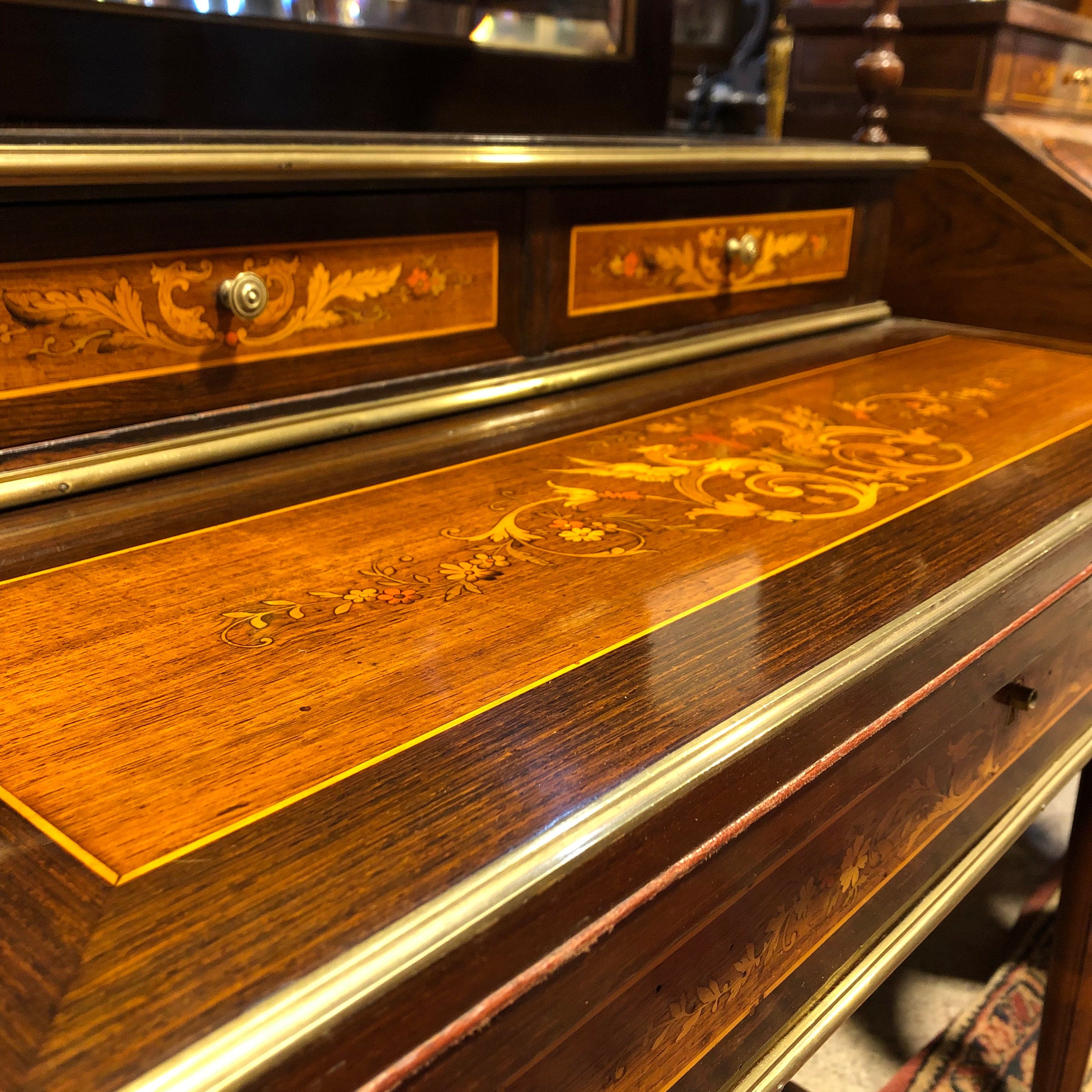 Elegante secretaire en madera de jacarandá, palo rosa, con delicadas marqueterías florales. Escritorio abatible con cubierta de cuero. Sus molduras, tacos y capiteles de columnas son de bronce. Espejo biselado. Cuenta con un cajón central, una pequeña repisa, y dos cajones superiores.
