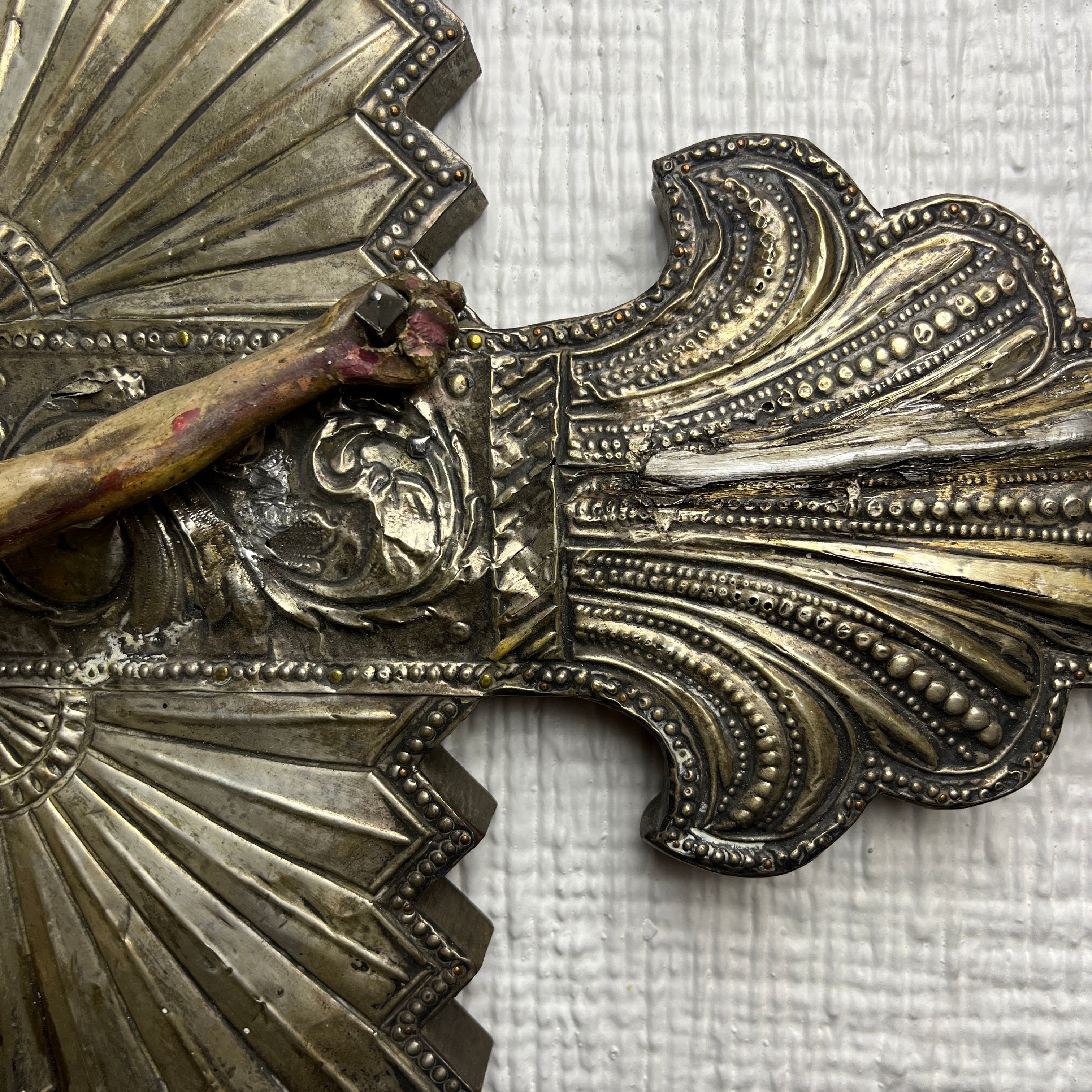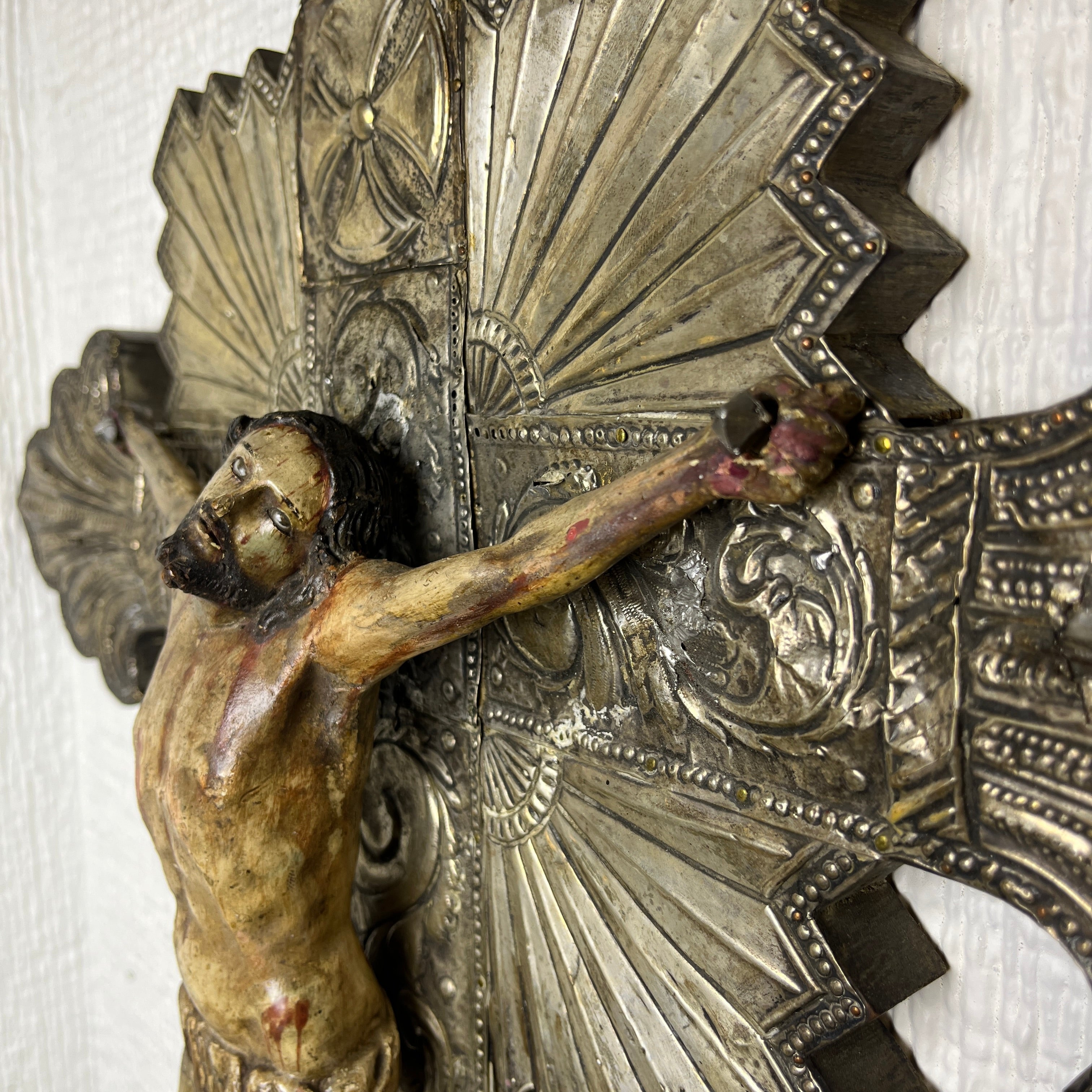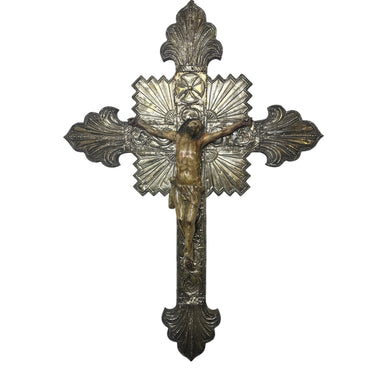 Está pieza es una representación de muerte de Cristo colgado en la cruz. La cruz está cubierta por una moldura de plata fina tallada a mano, llena de detalles, sobre una base de madera. Por el trabajo de la plata, se puede deducir que es de origen Peruano. El Cristo, también de madera tallada a mano, tiene una expresión solemne y no posee la corona de espinas. Año 1900 aprox.