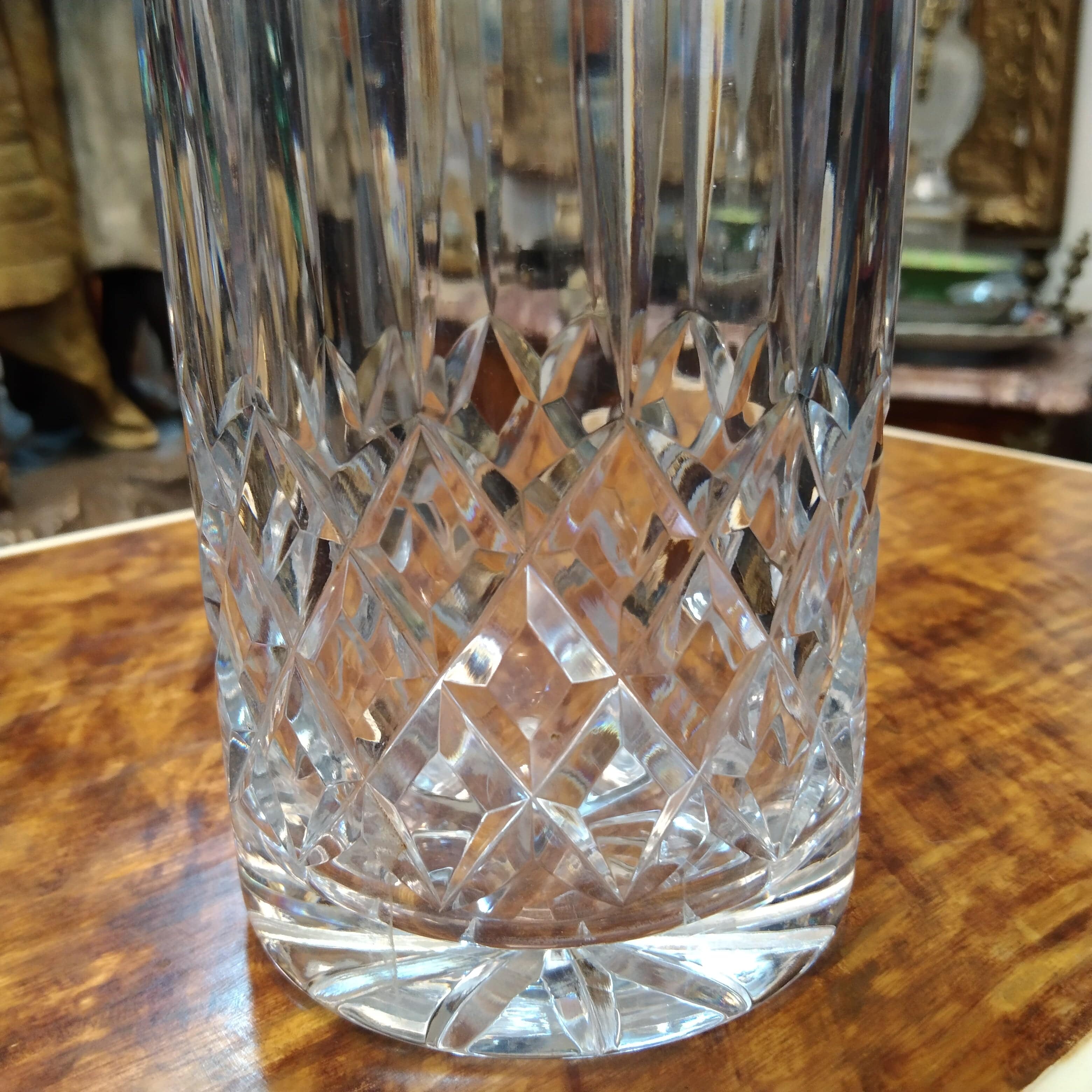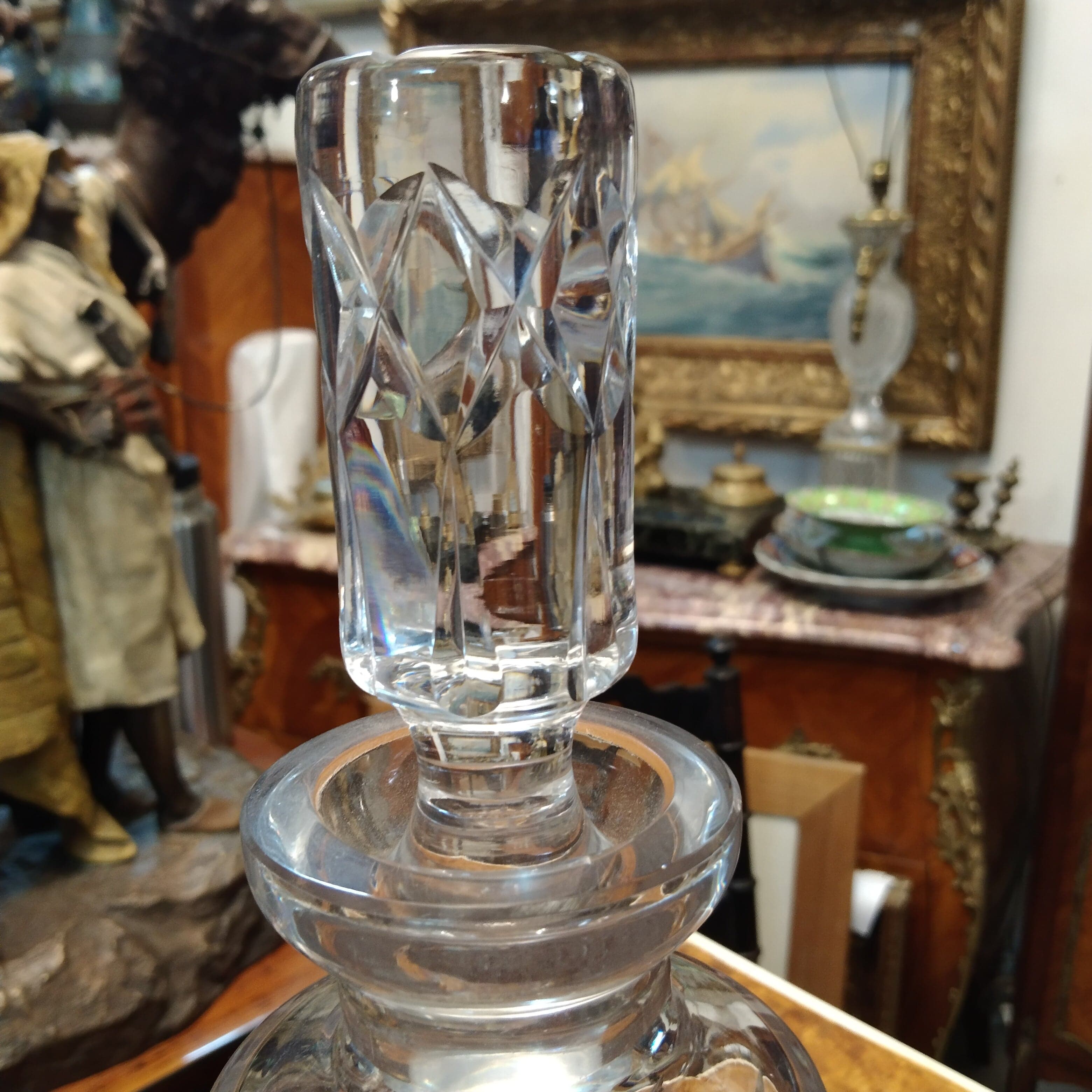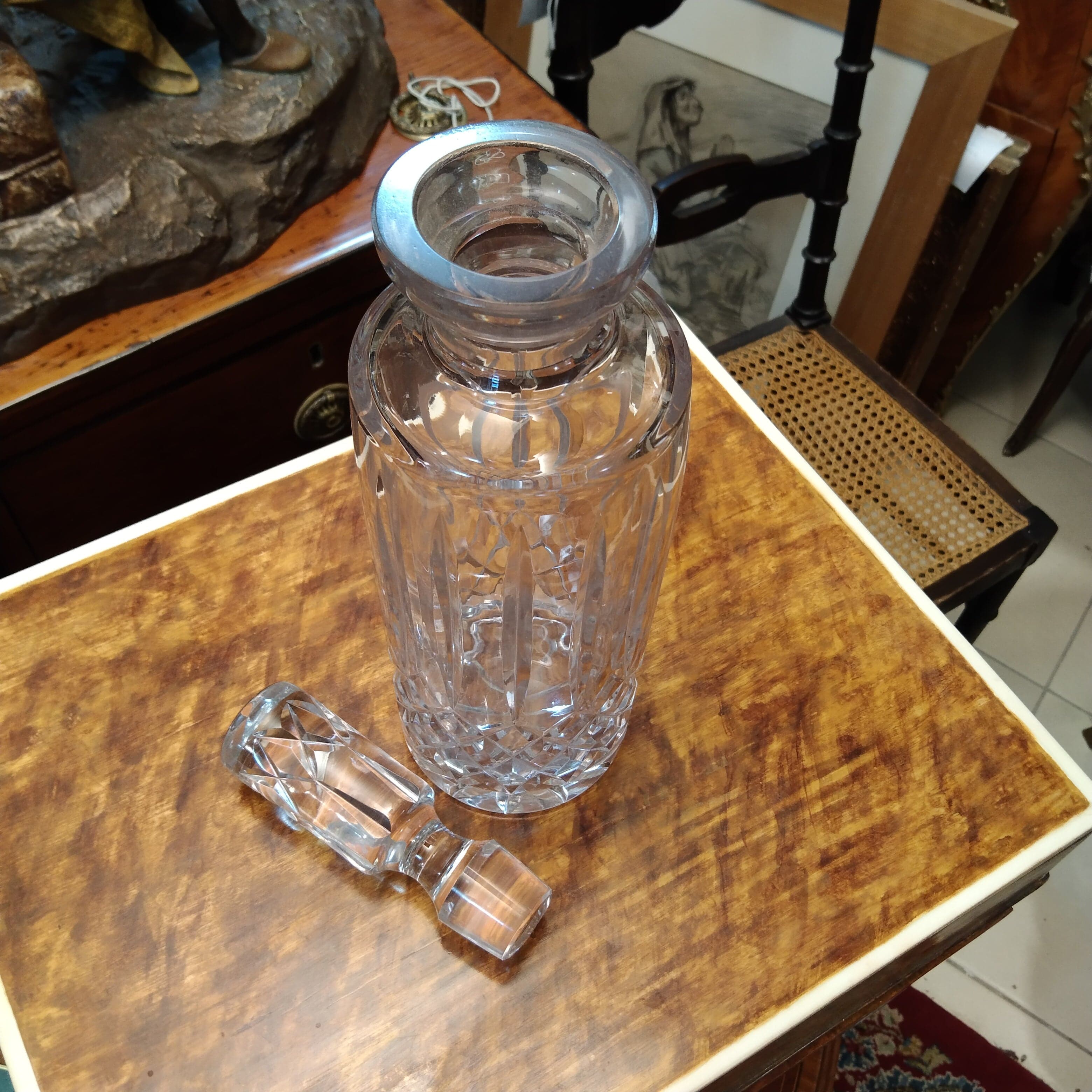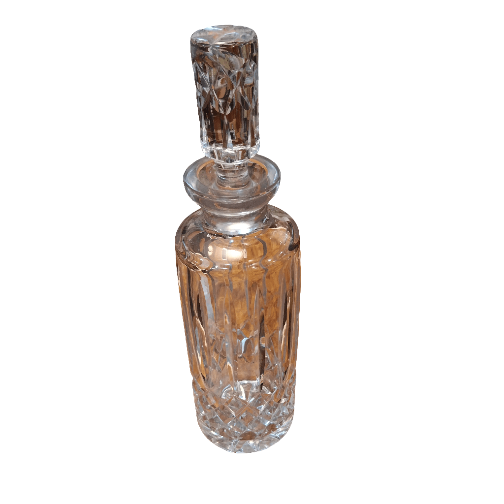 Elegante botella de vidrio, de origen francés, con un bello diseño de cortes geométricos hechos con técnica molde.