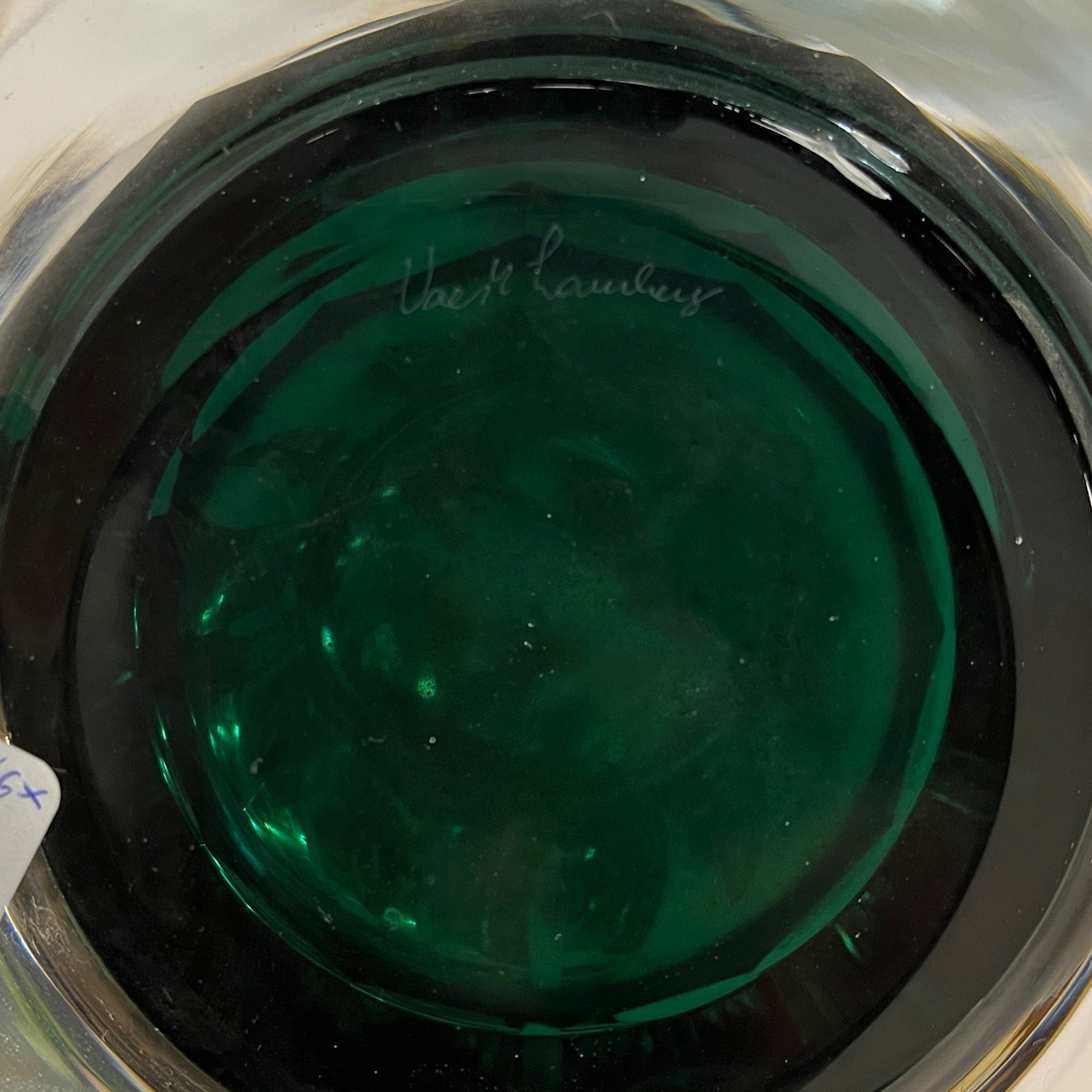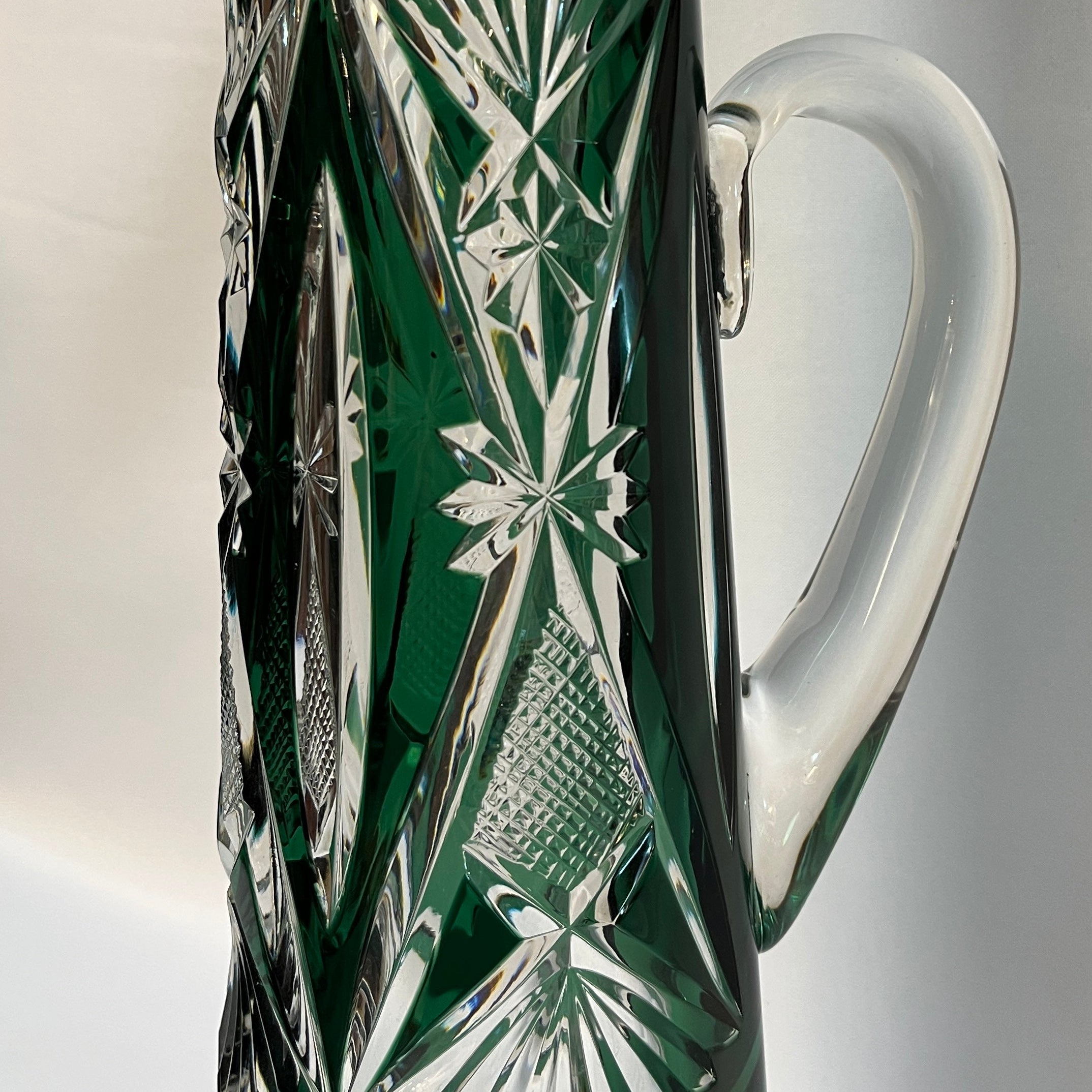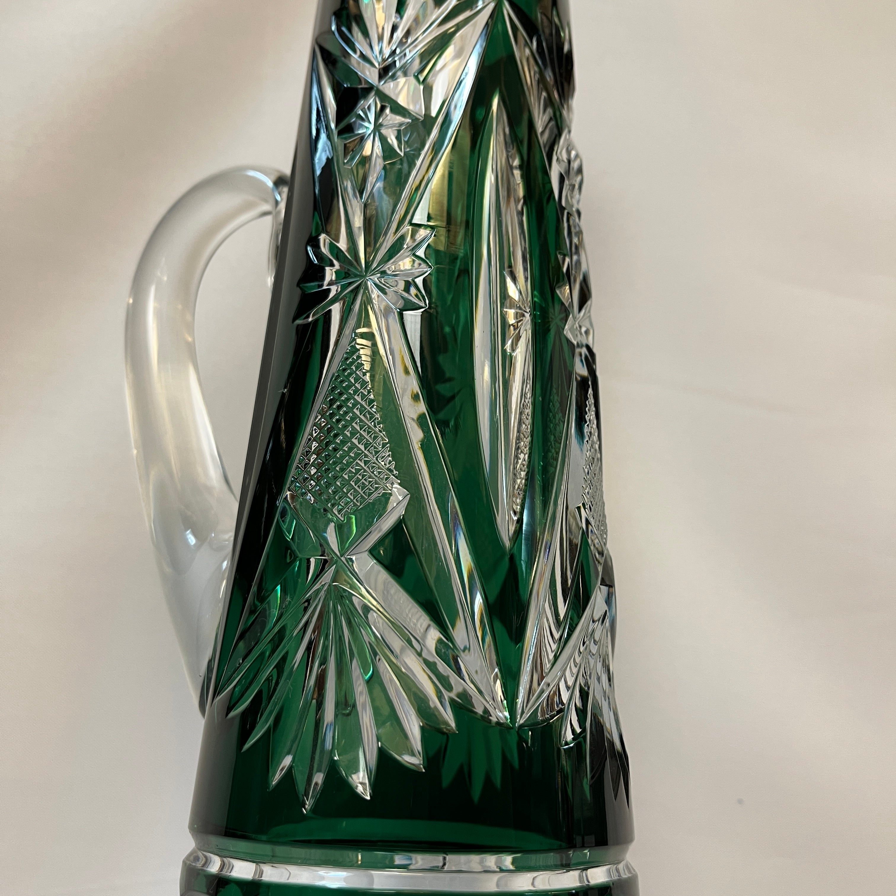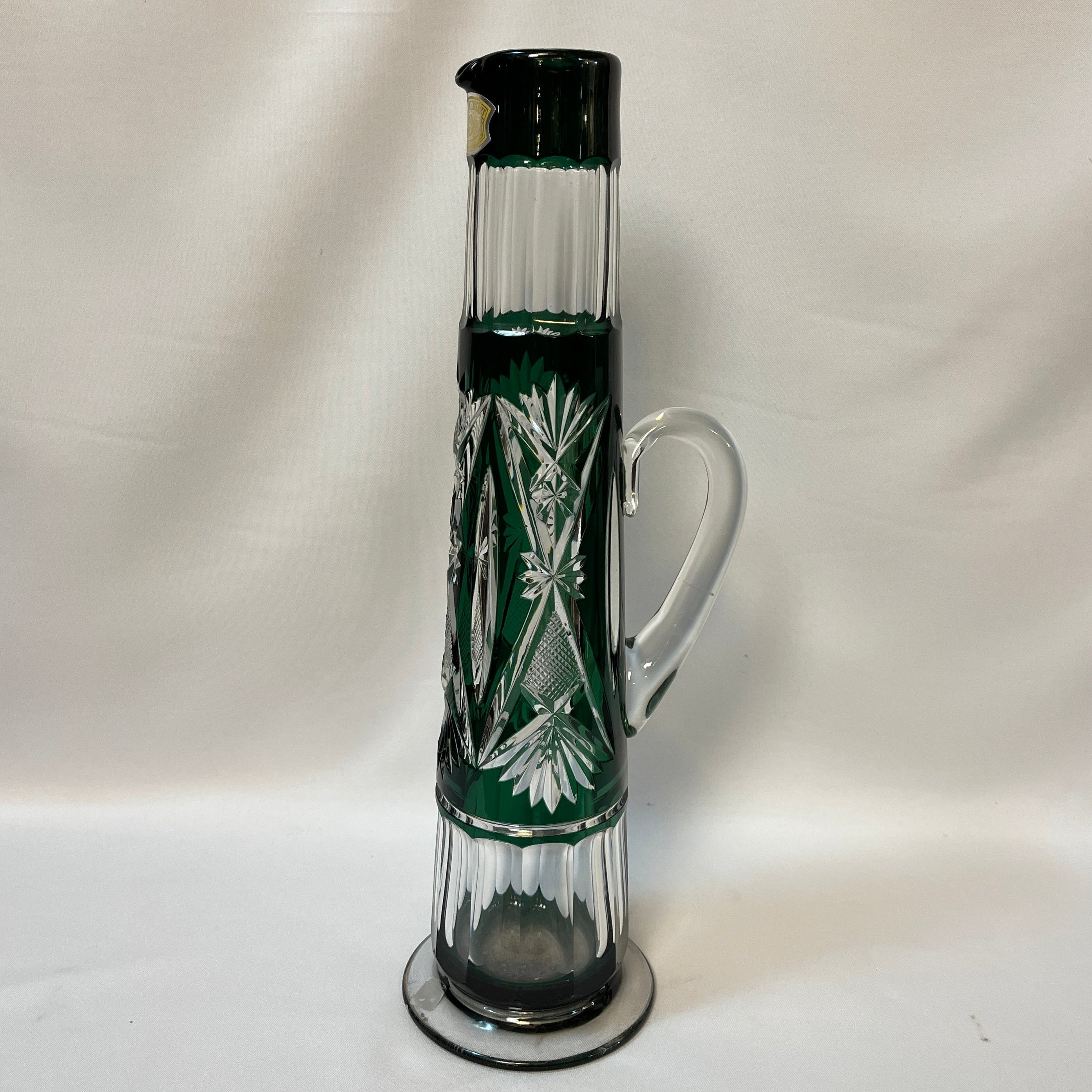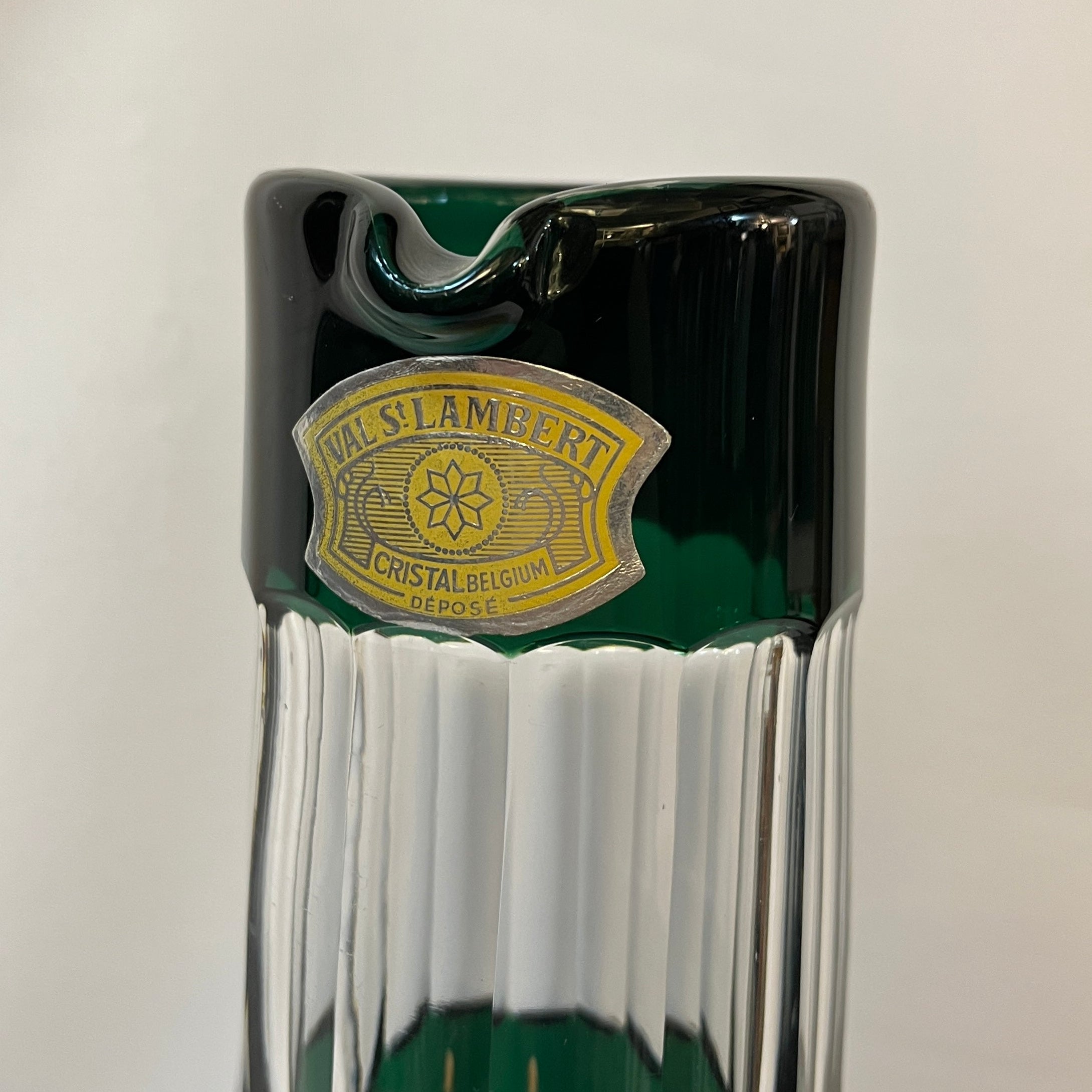 Hermosa jarra de cristal tallado y teñido de la prestigiosa firma Val Saint Lambert. Su elegante altura le otorga una presencia sofisticada, mientras que su delicado tono verde aporta frescura y distinción a cualquier espacio. La calidad del cristal y el fino trabajo de tallado reflejan la maestría característica de esta reconocida casa belga.