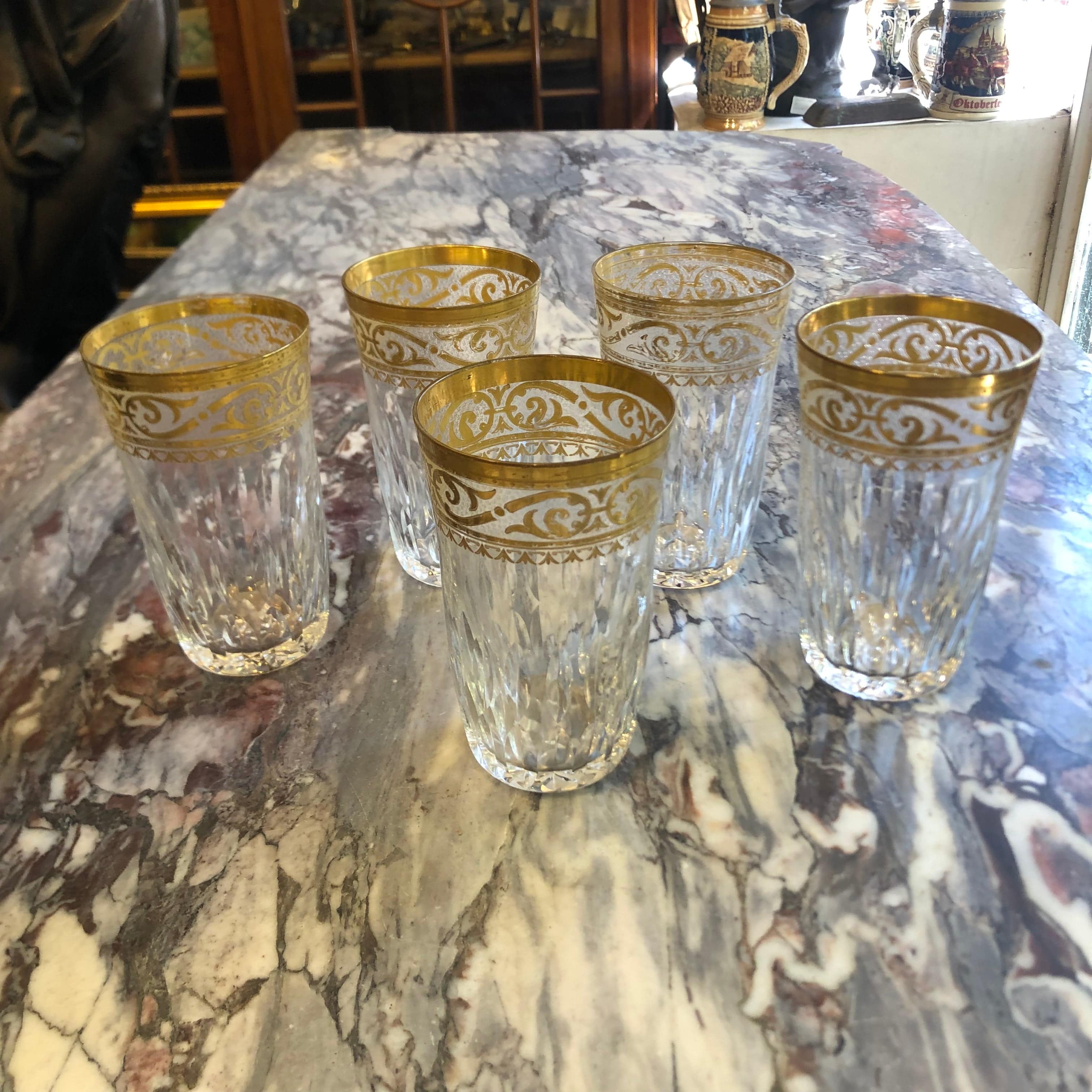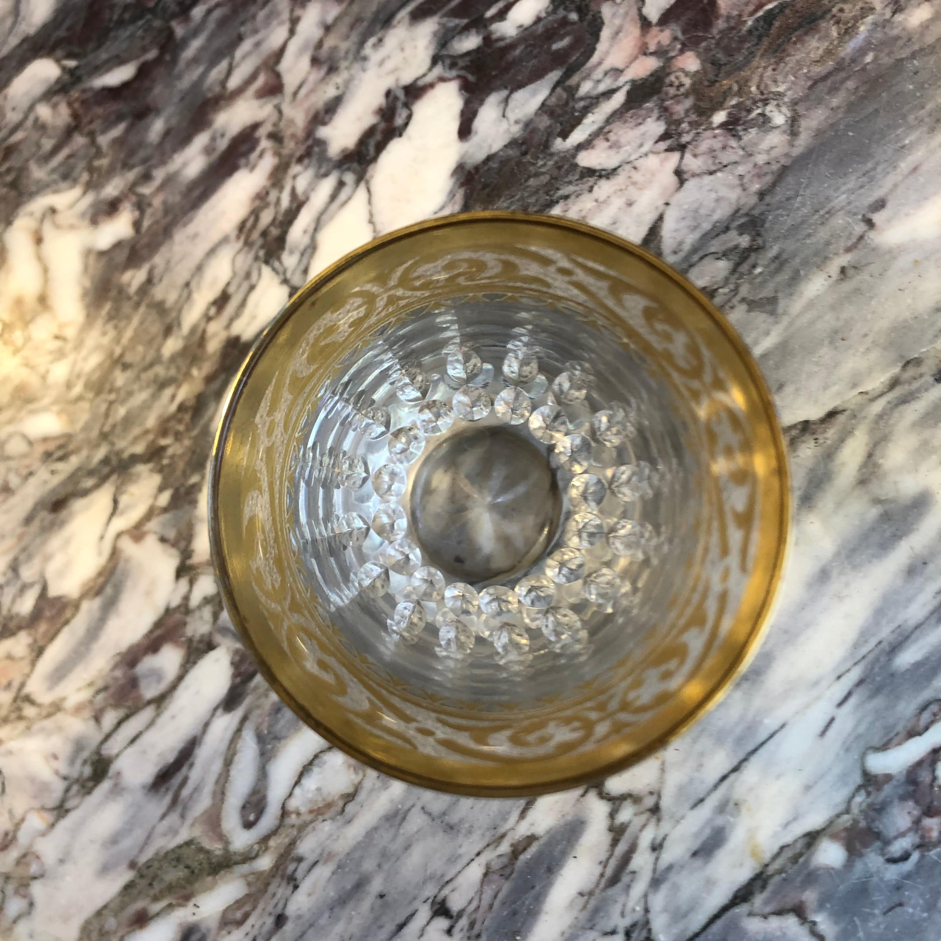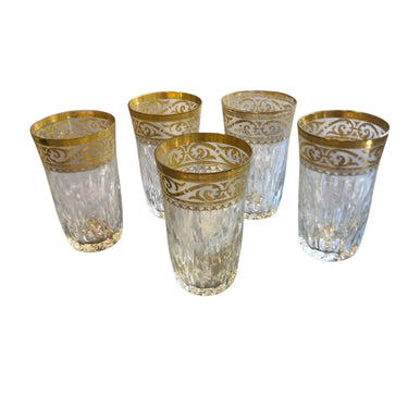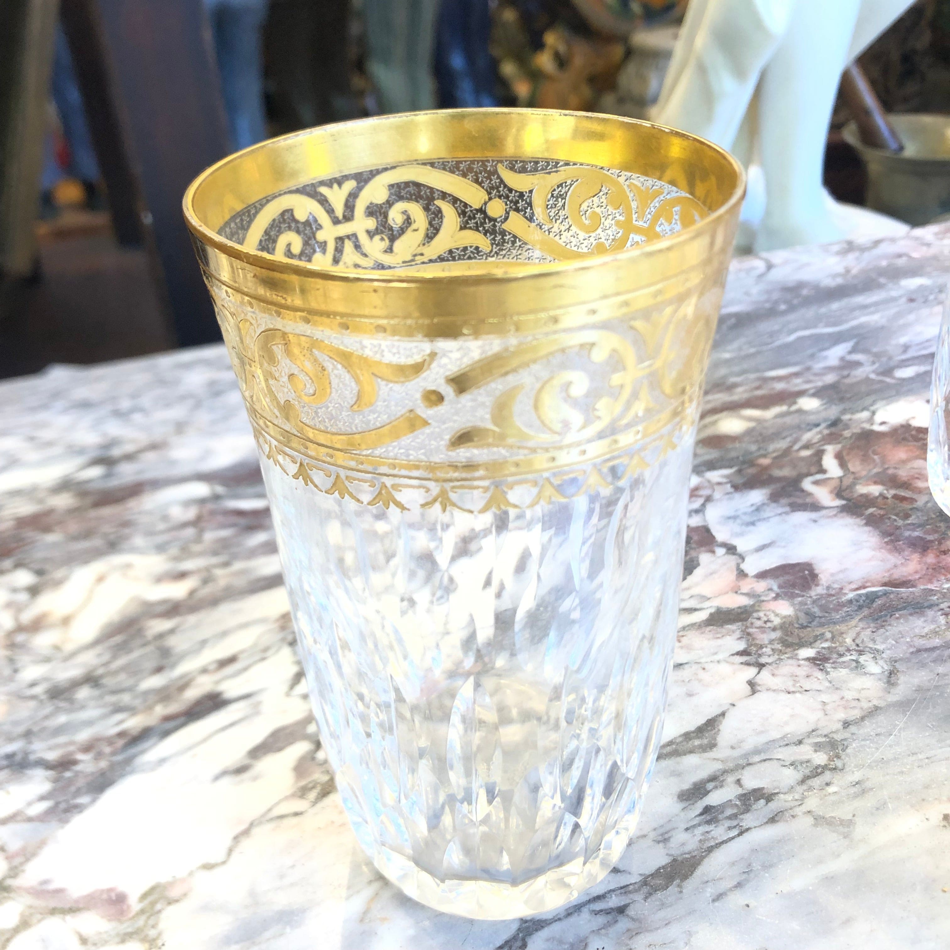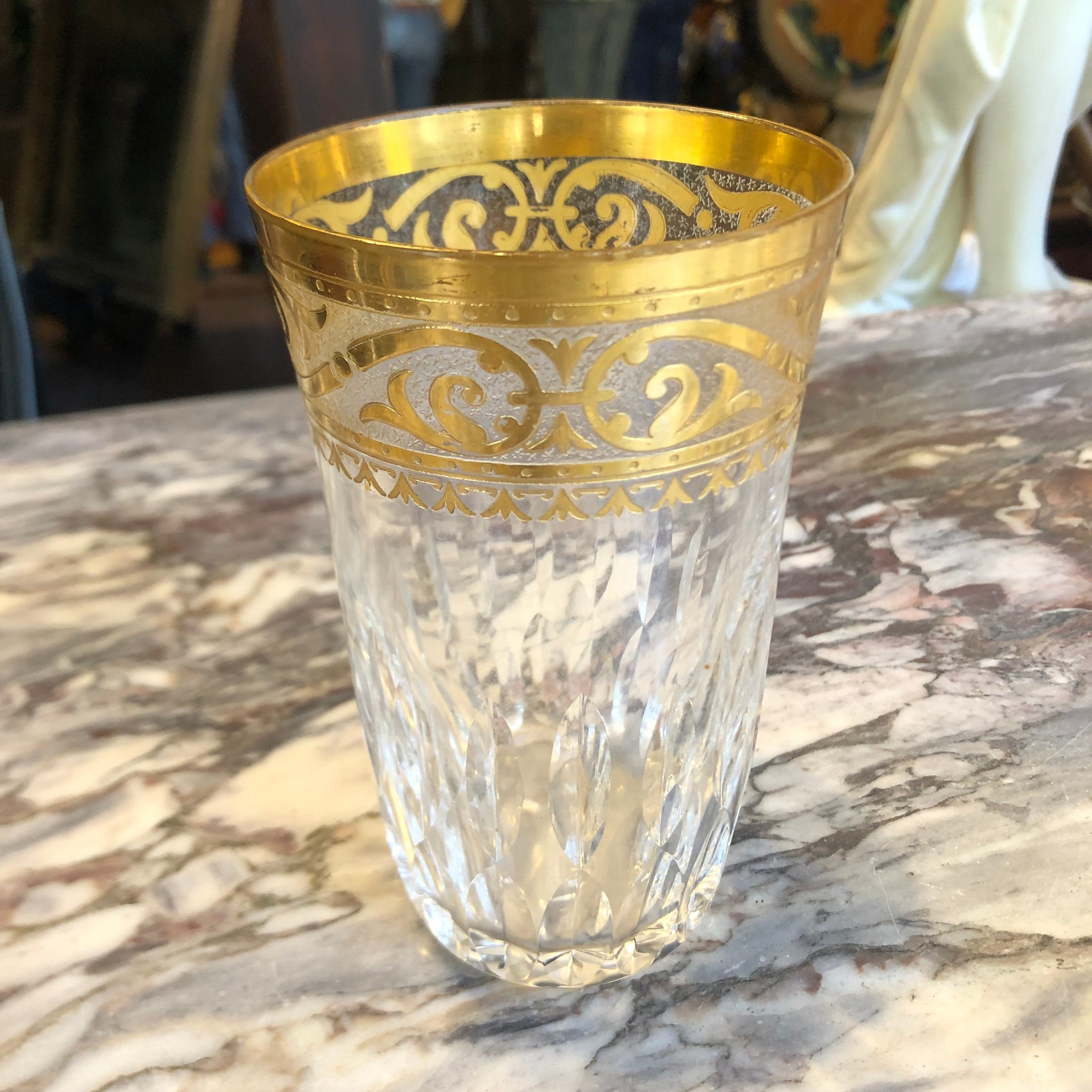 Hermosos y elegantes vasos de Cristal francés de la prestigiosa marca Saint Louis tallados con borde dorado años 60s. Tienen detalles tallados y en muselina.