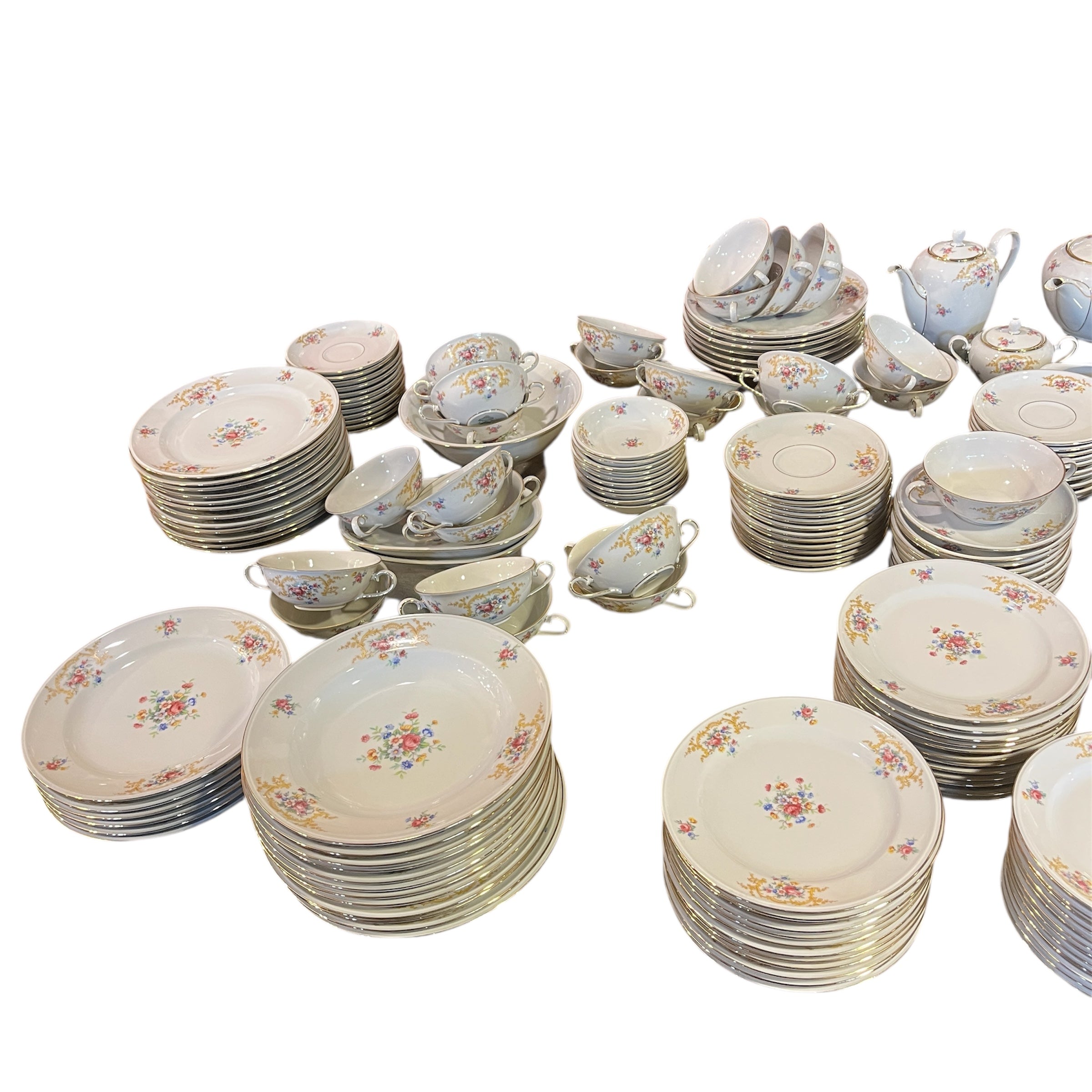 Gran juego de porcelana alemana Hutschenreuter, con un delicado diseño de flores y guirnaldas doradas, con terminaciones en dorado en sus asas y bordes. El juego incluye el juego de mesa, juego de té, café y diversas piezas de servir.