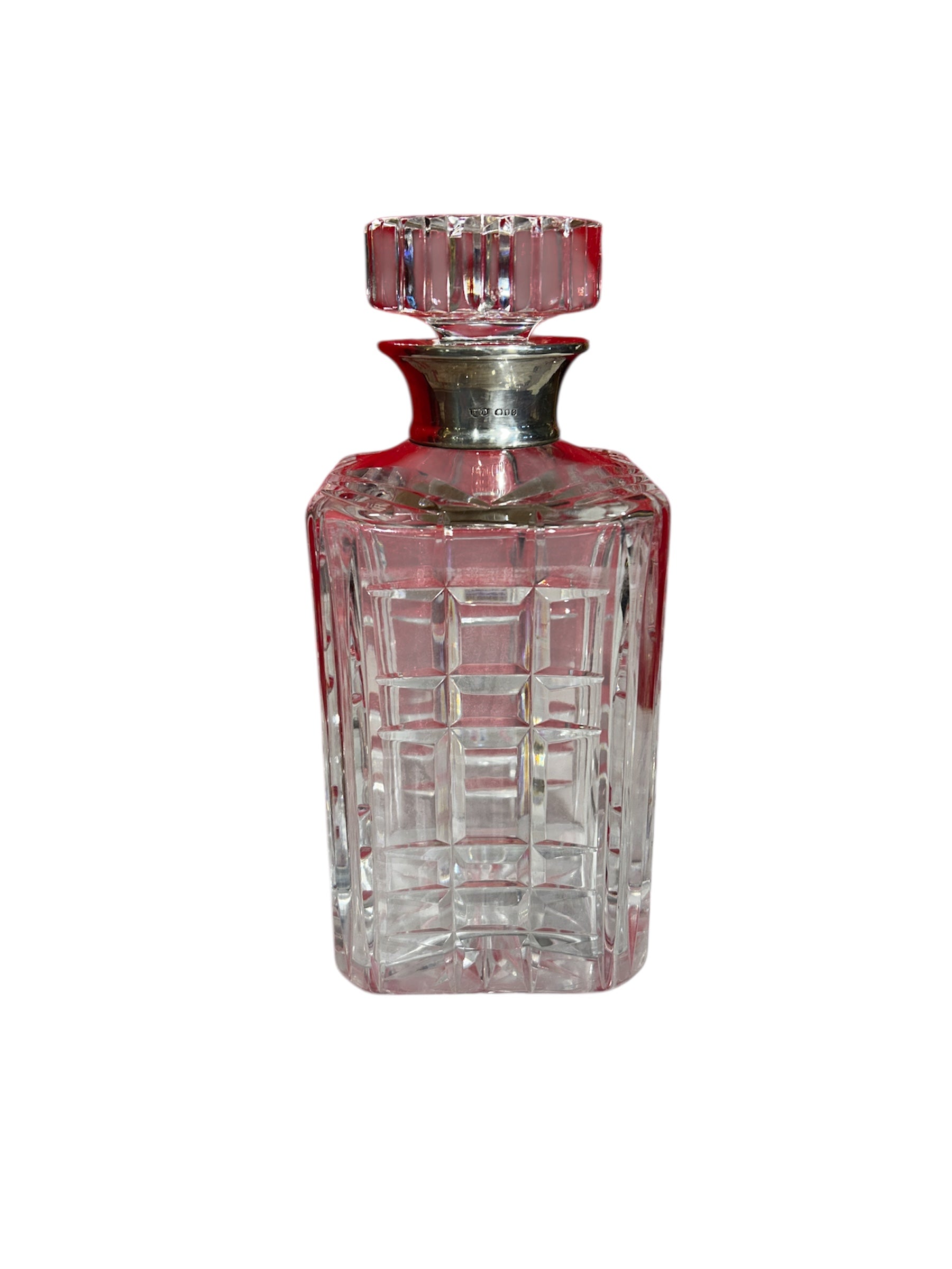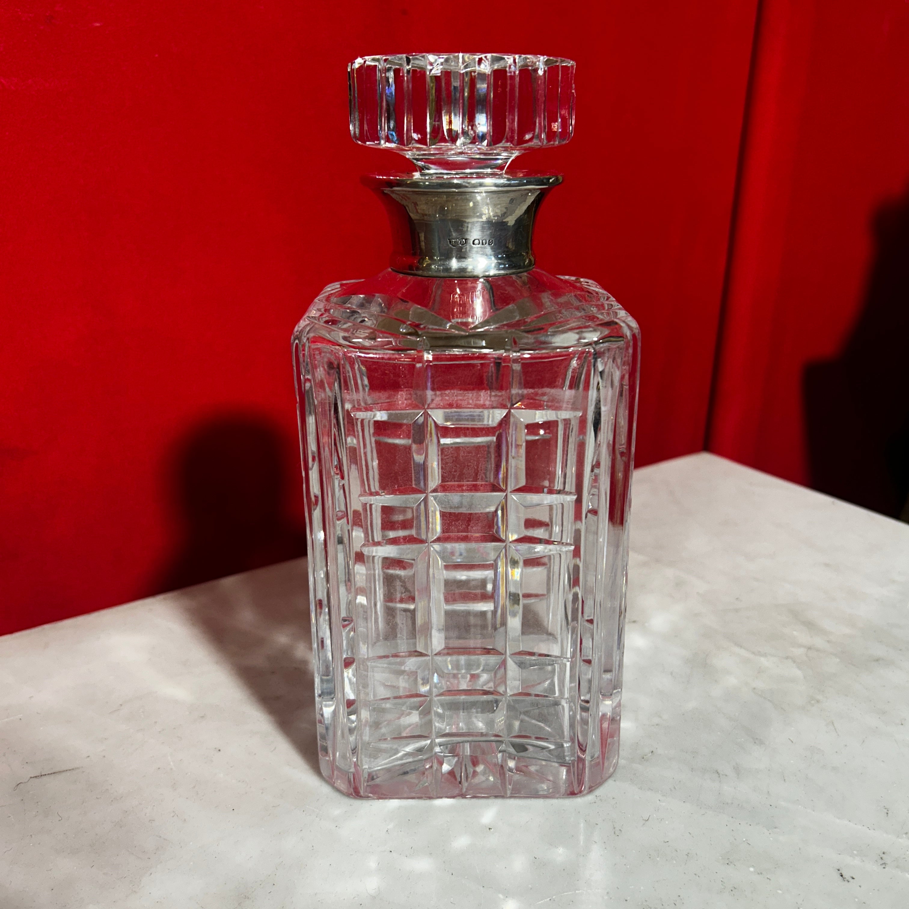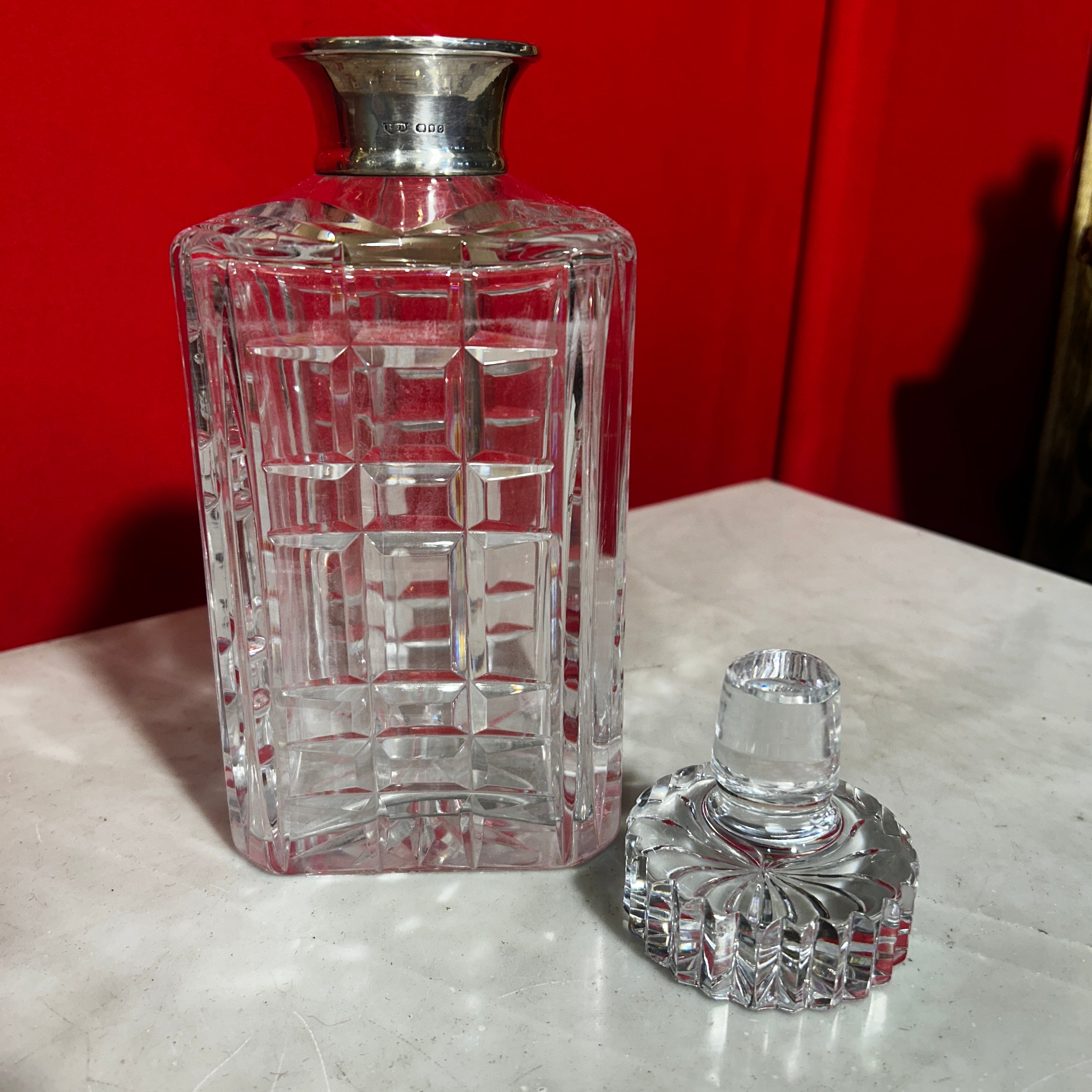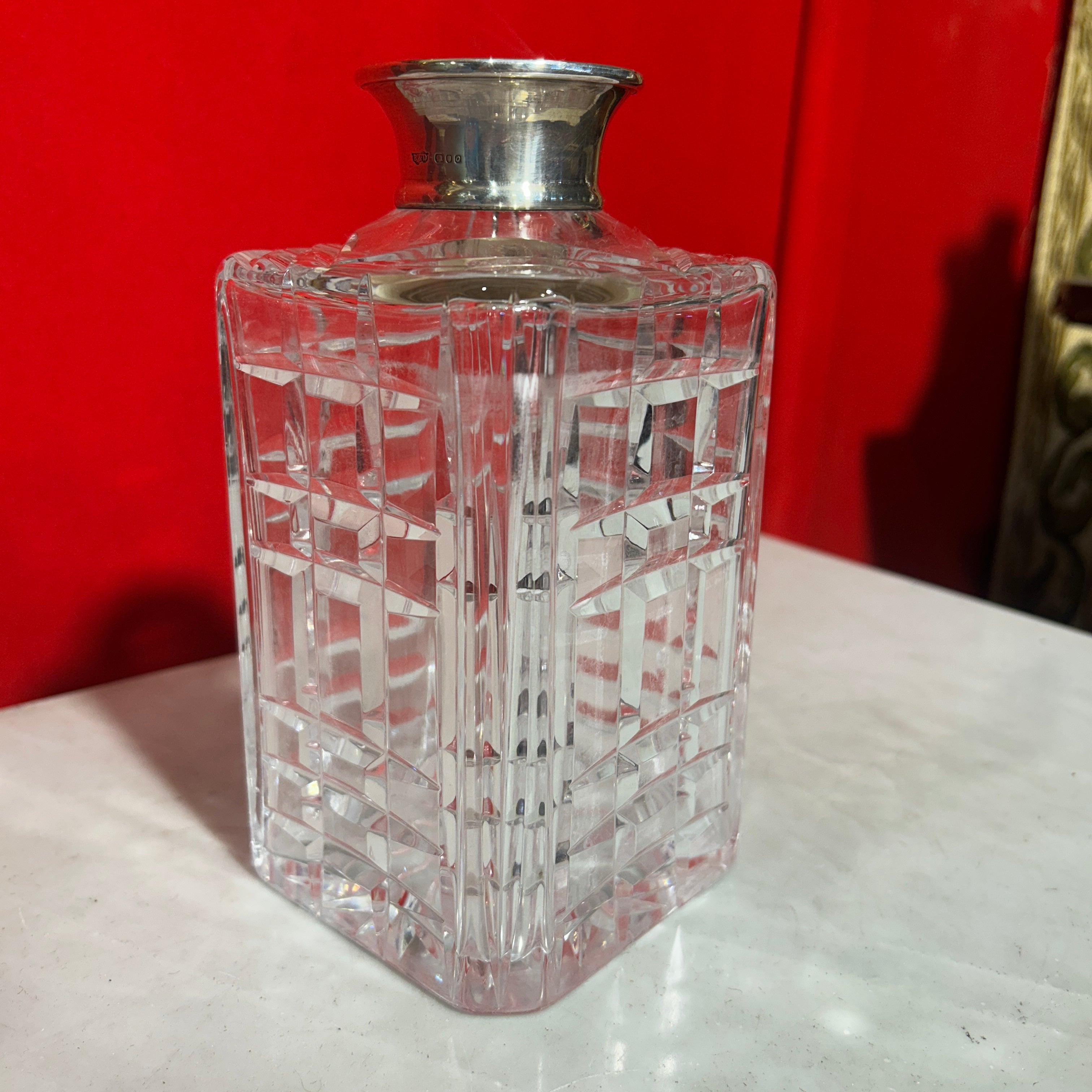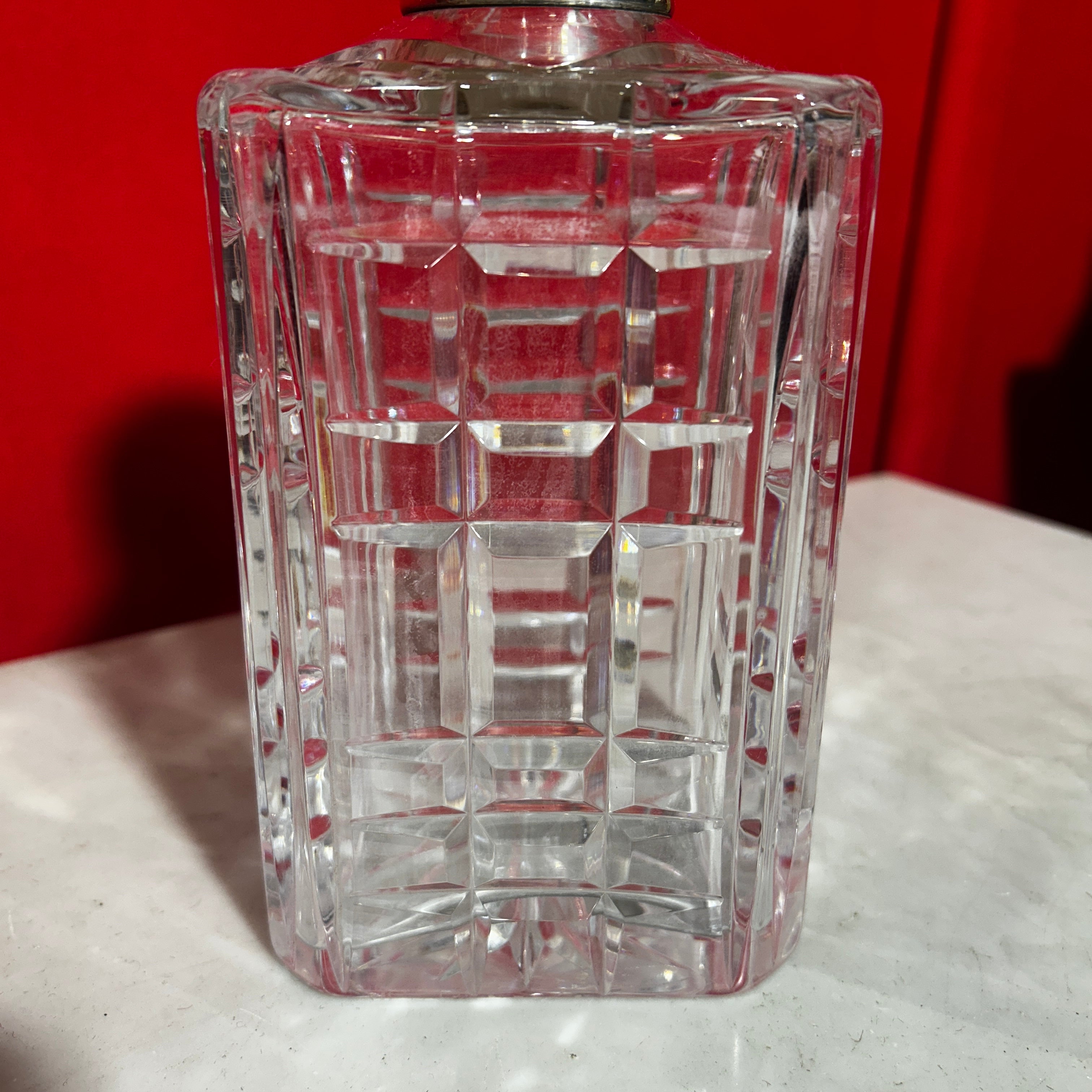 Elegante licorera francesa de bello cristal con gollete de plata. Presenta un diseño cuadrado y tapa circular.
