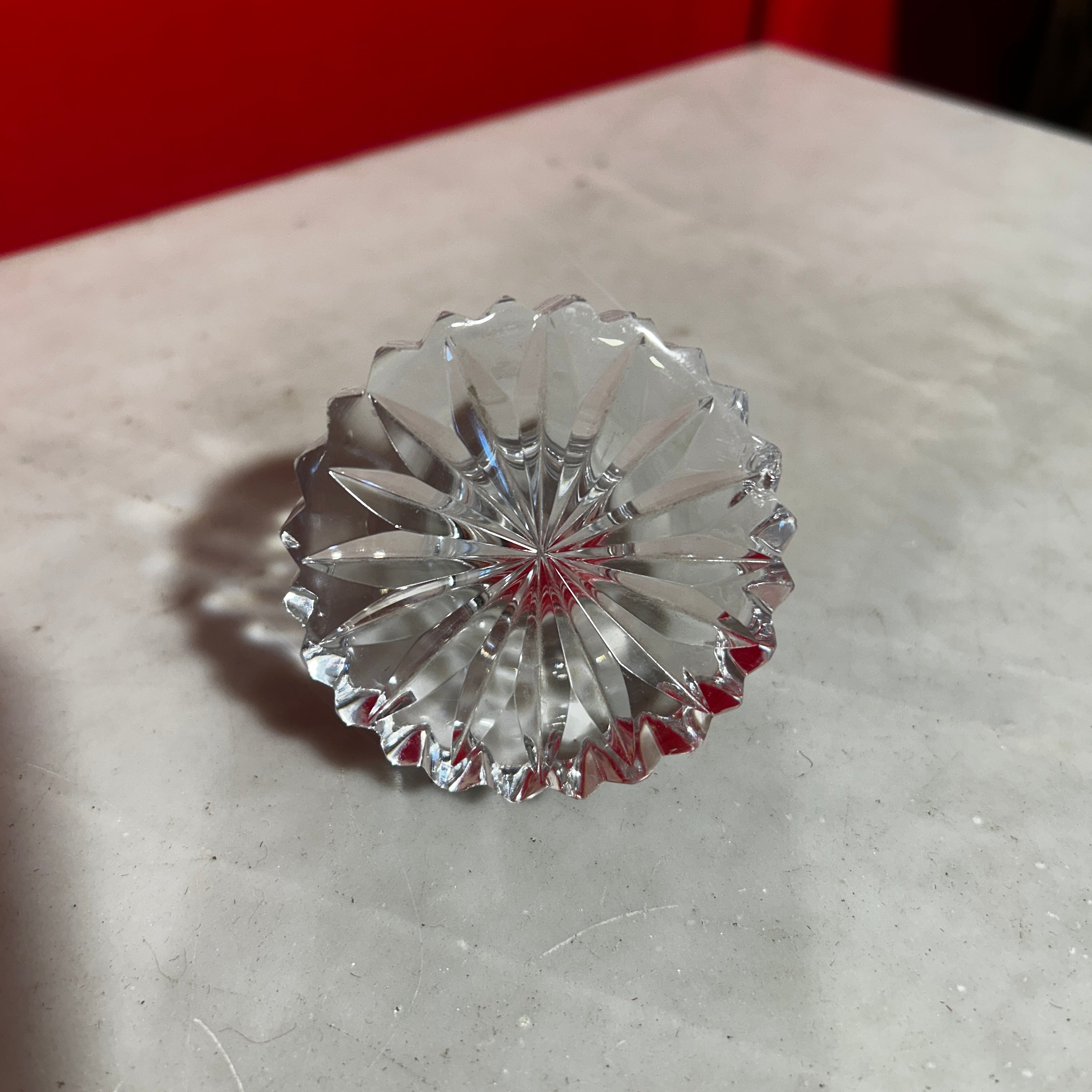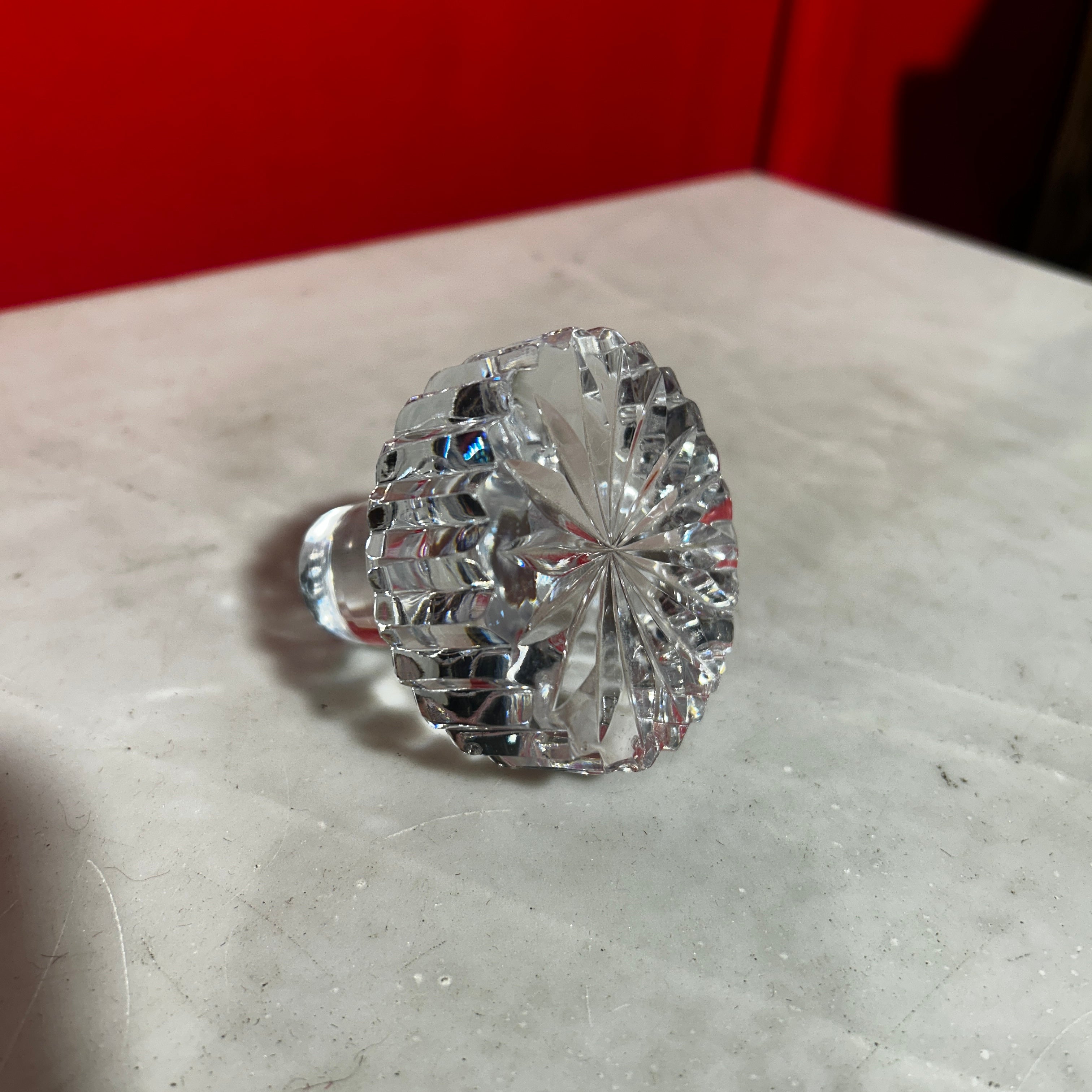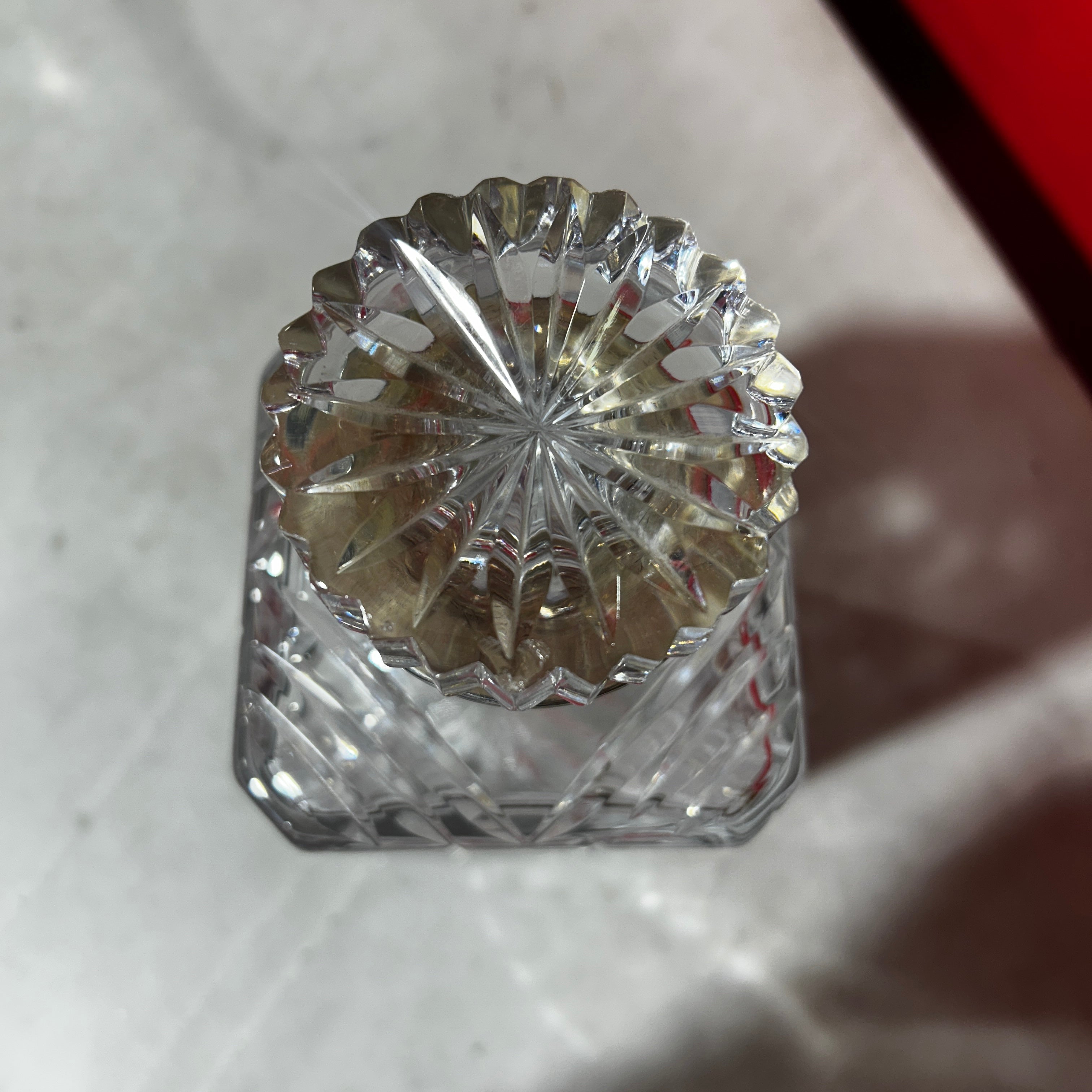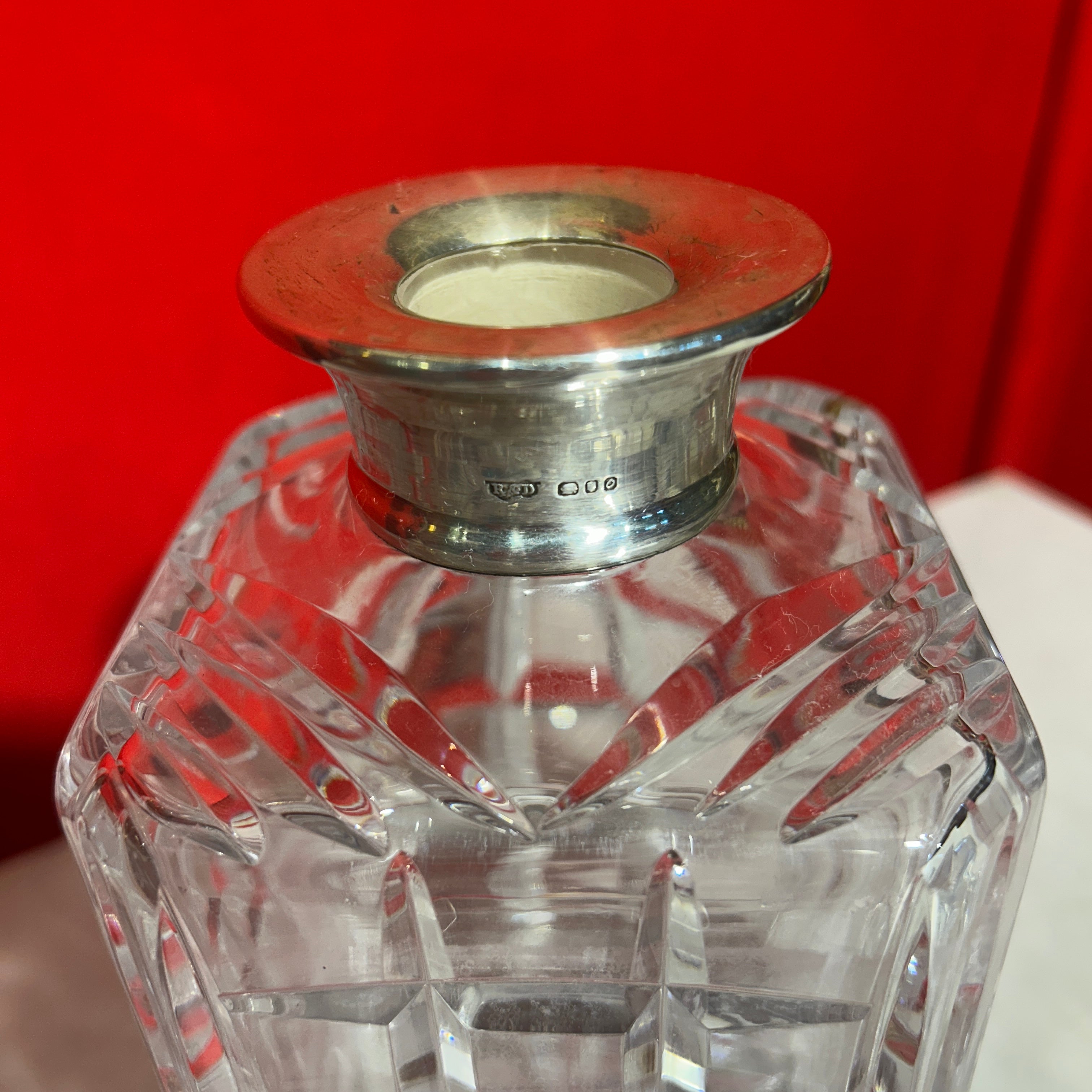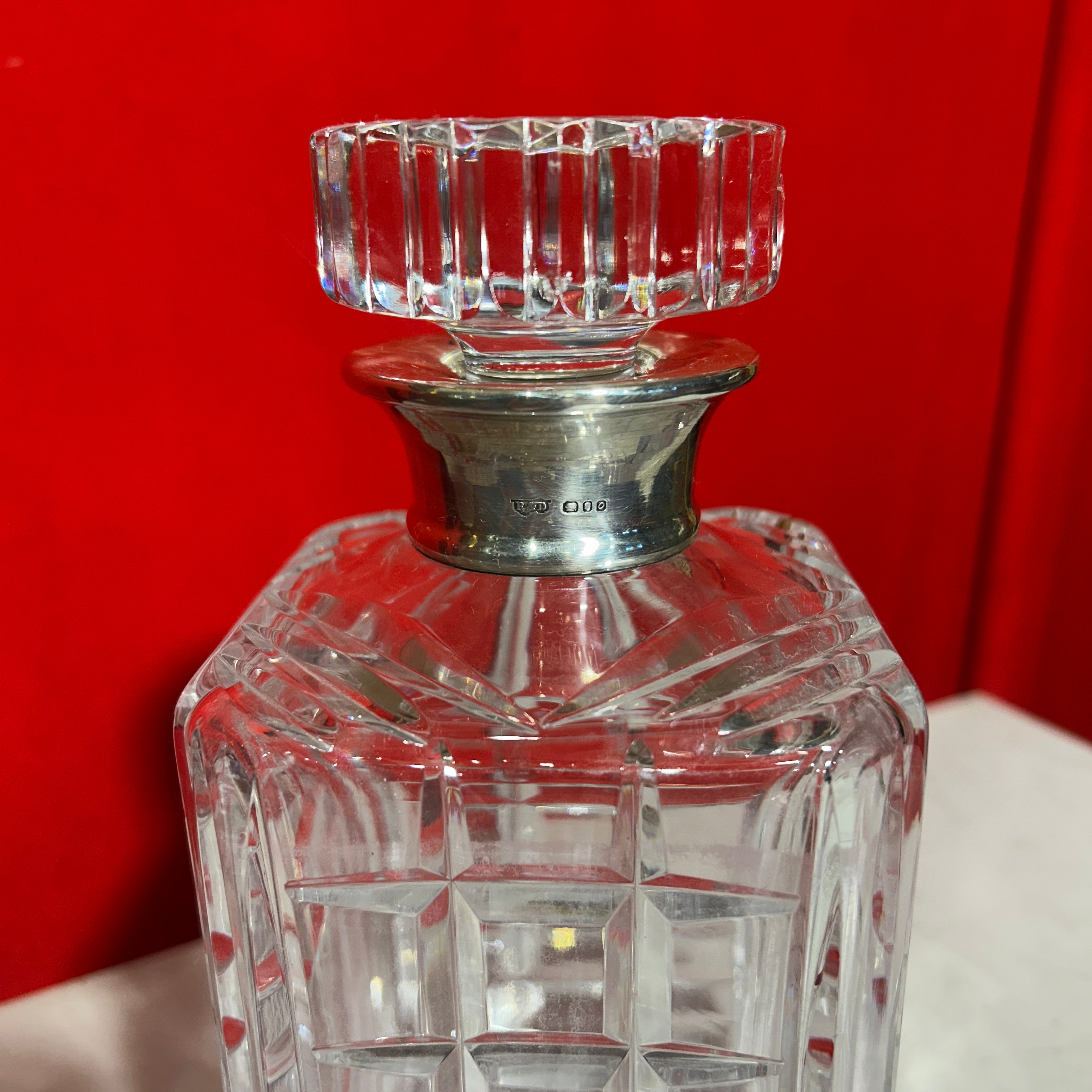 Elegante licorera francesa de bello cristal con gollete de plata. Presenta un diseño cuadrado y tapa circular.