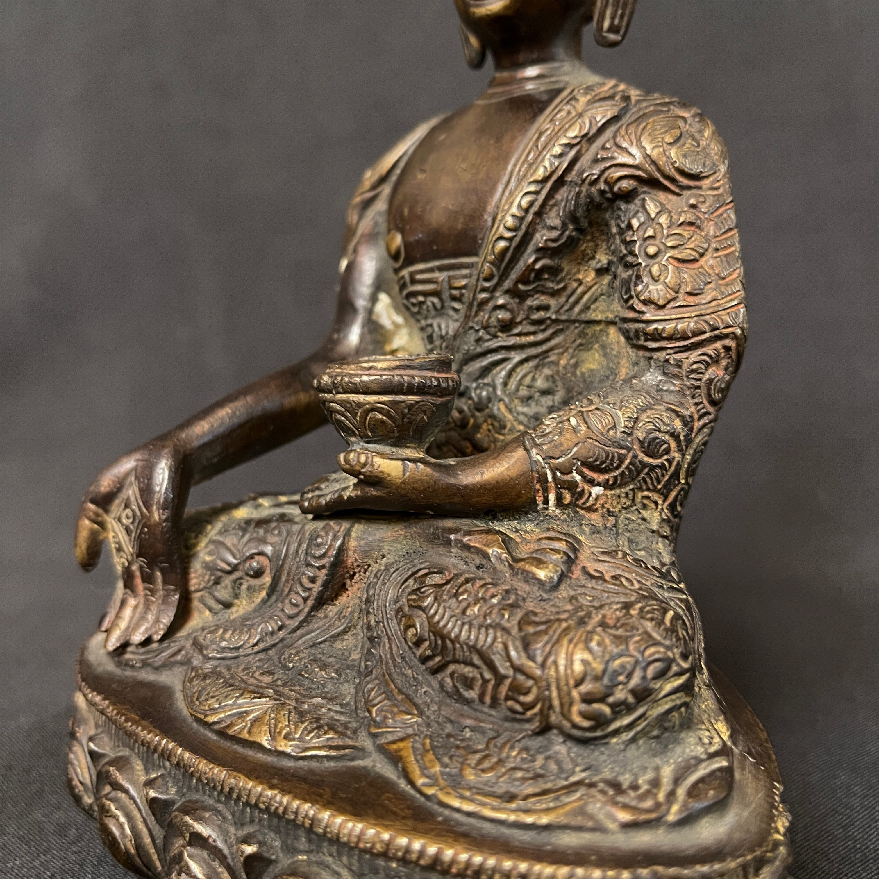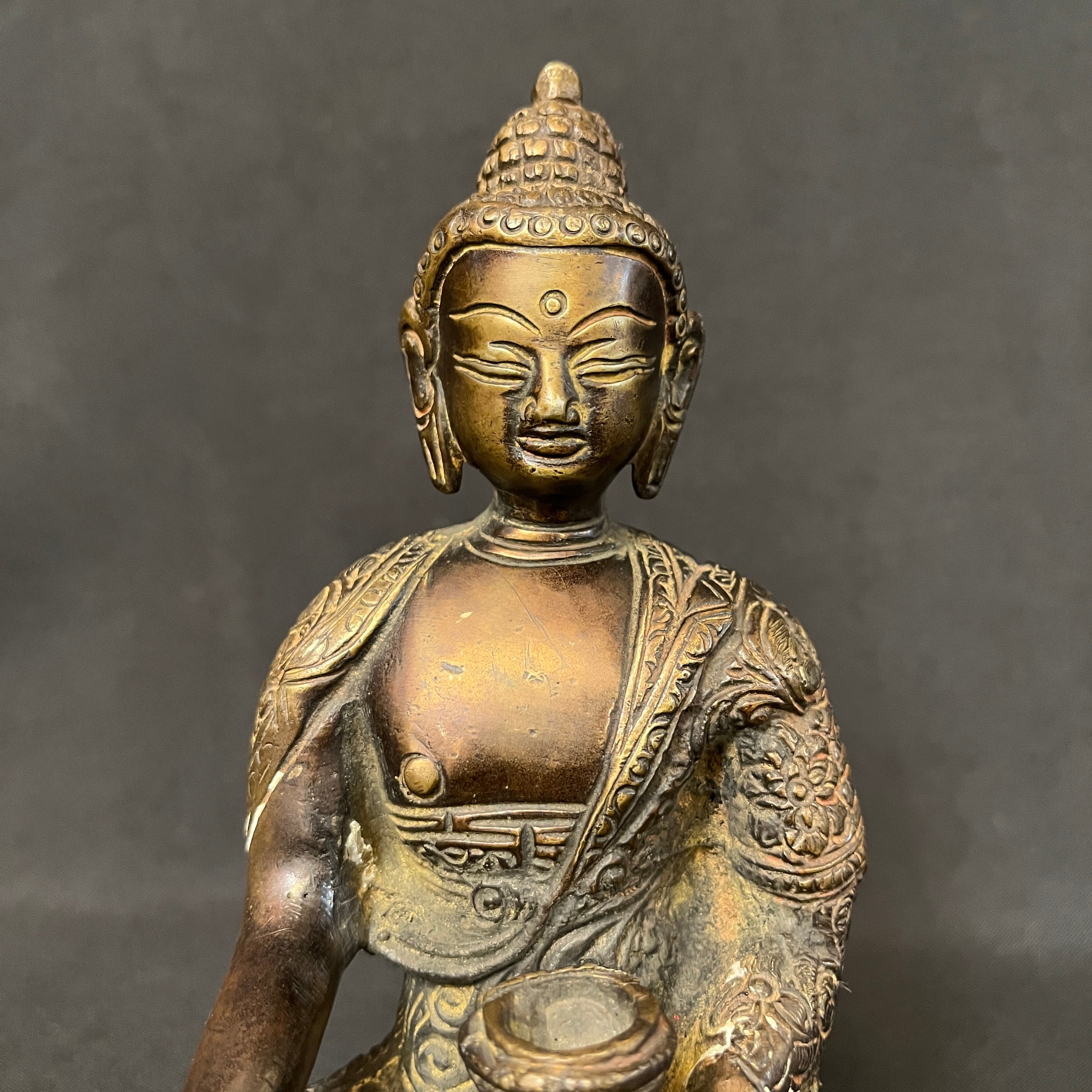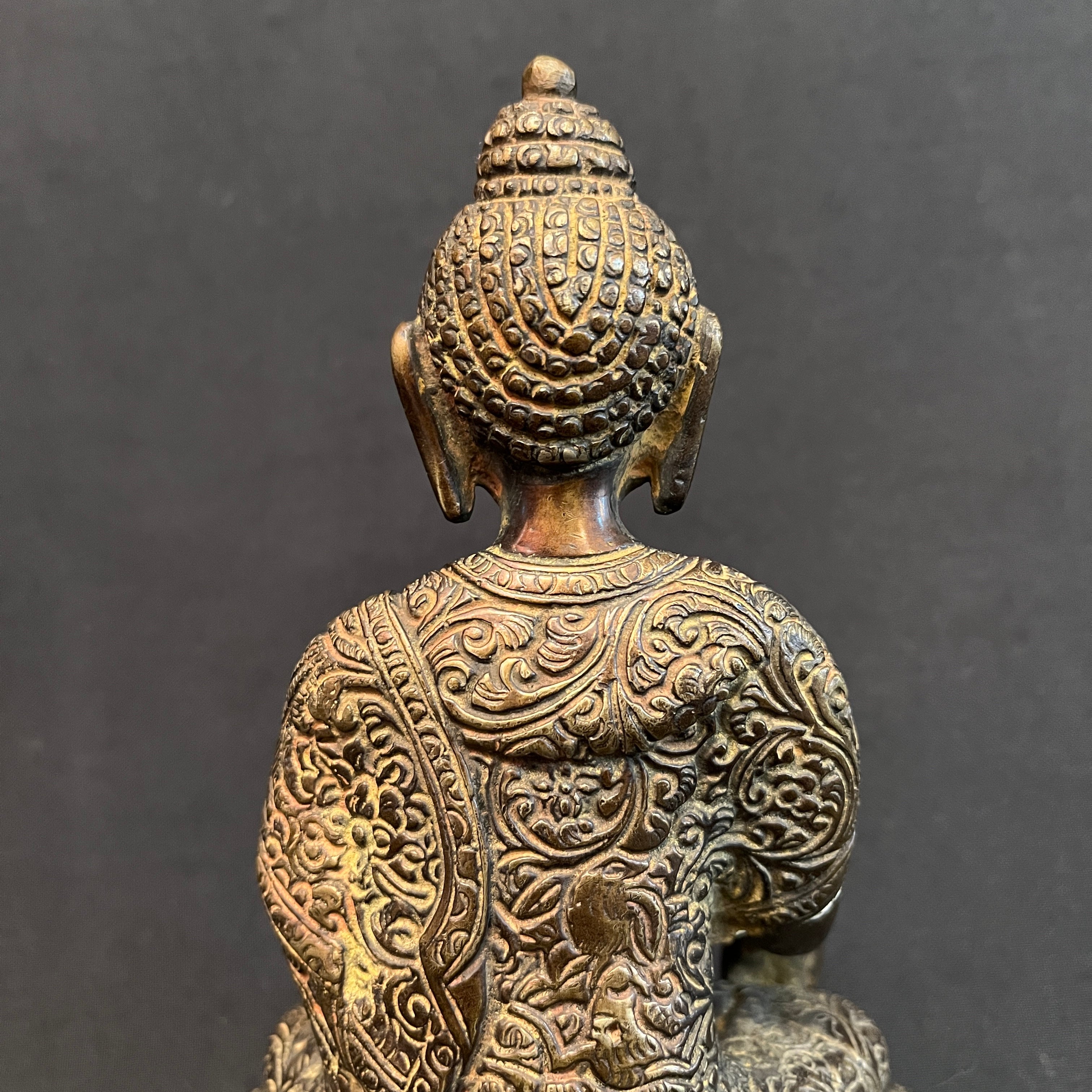 Bello Buda tibetano de bronce, sentado en posición de loto, increíble dedicación en trabajar los detalles, en el rostro, cuerpo y vestuario. Es una figura de principio del s. XIX