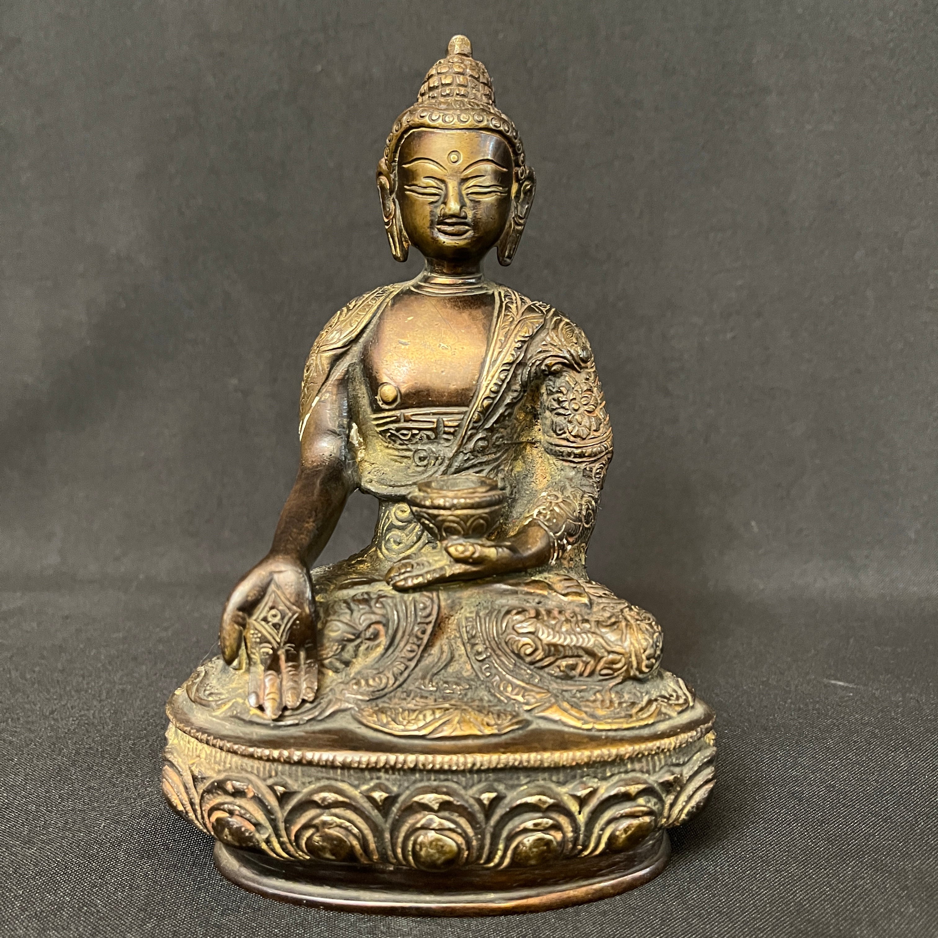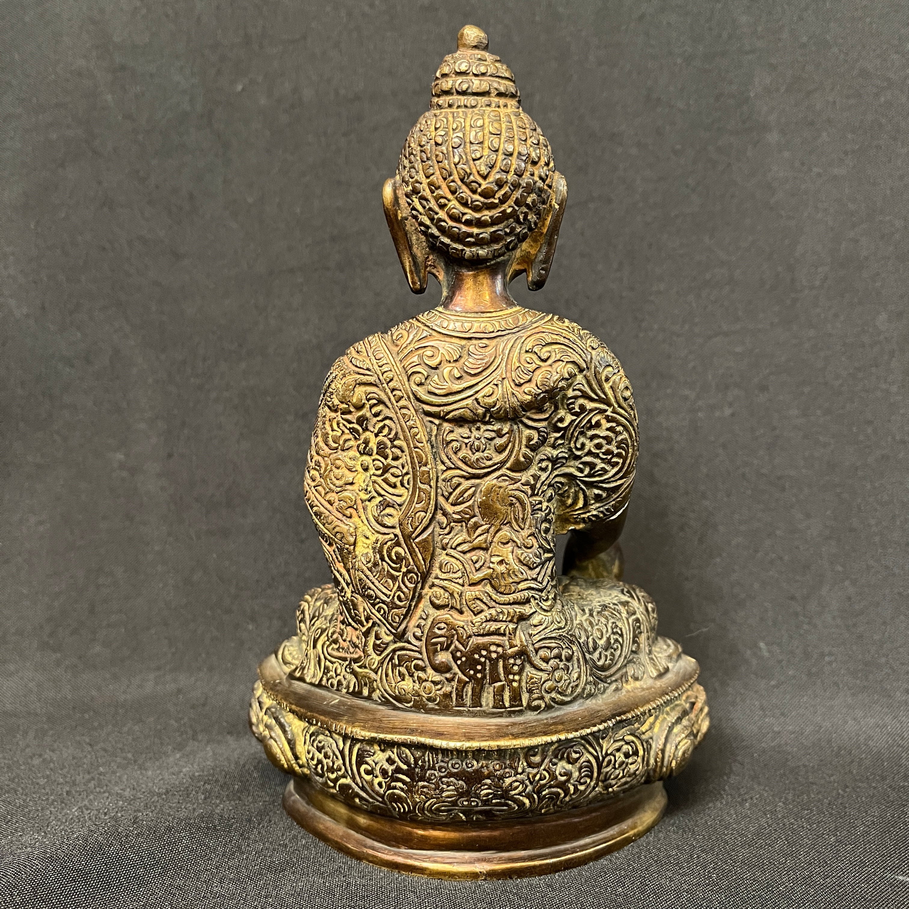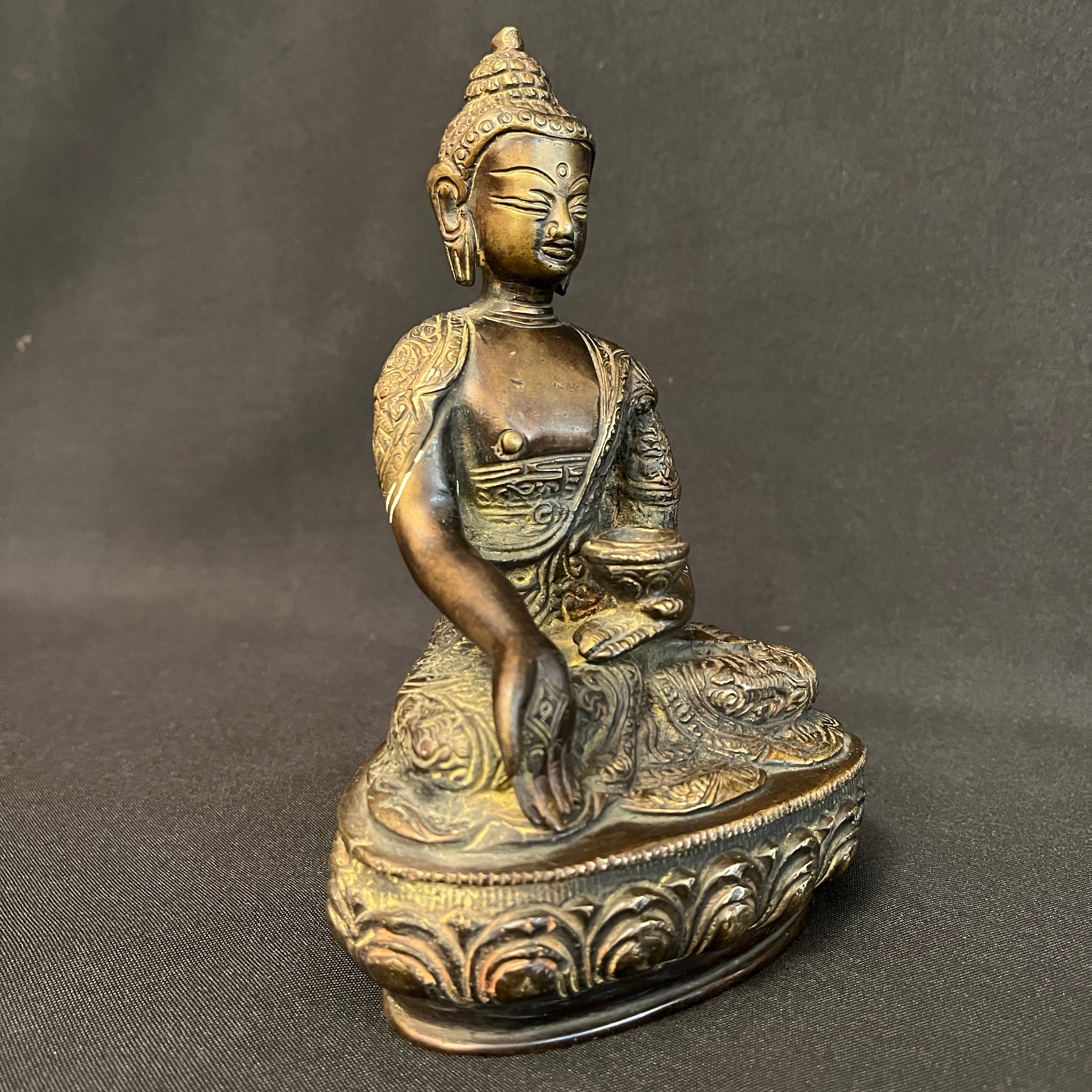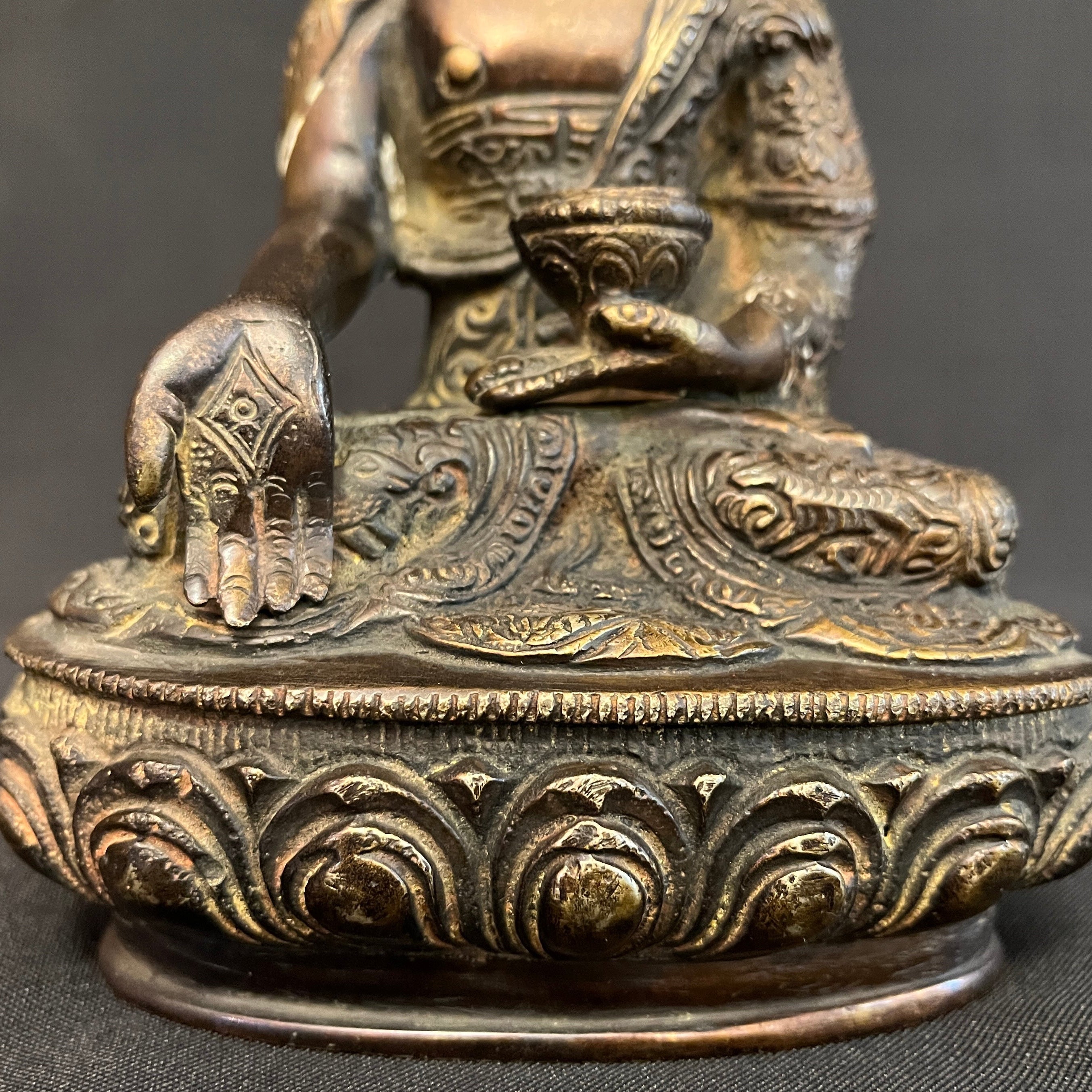 Bello Buda tibetano de bronce, sentado en posición de loto, increíble dedicación en trabajar los detalles, en el rostro, cuerpo y vestuario. Es una figura de principio del s. XIX