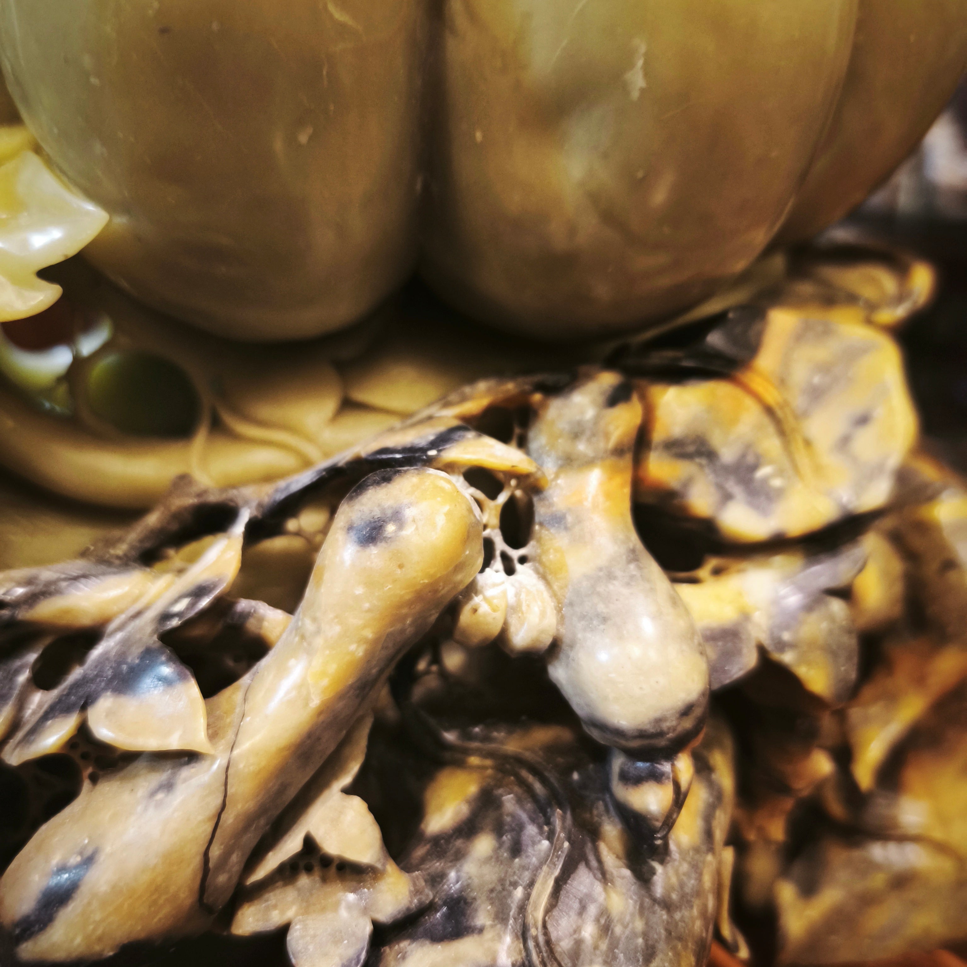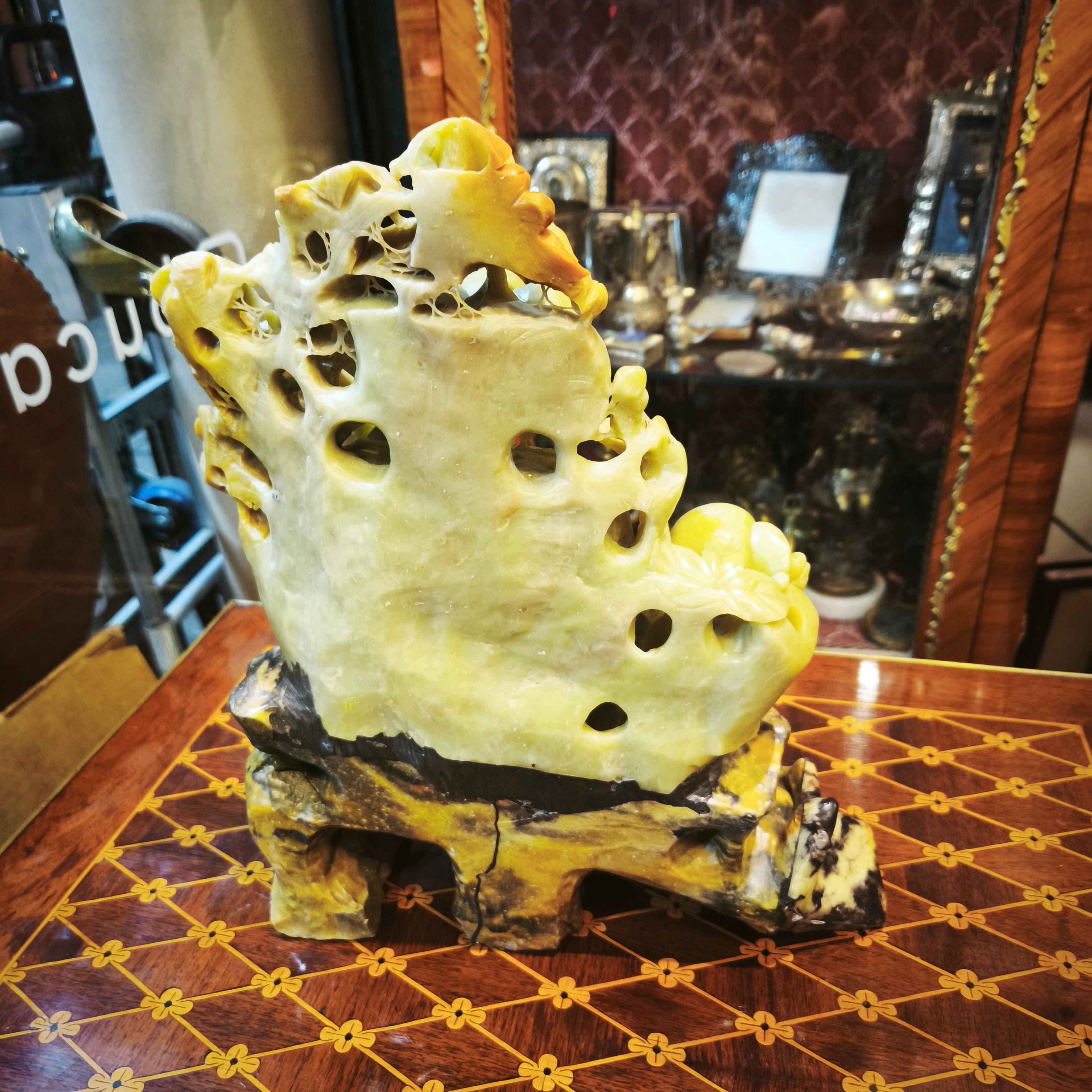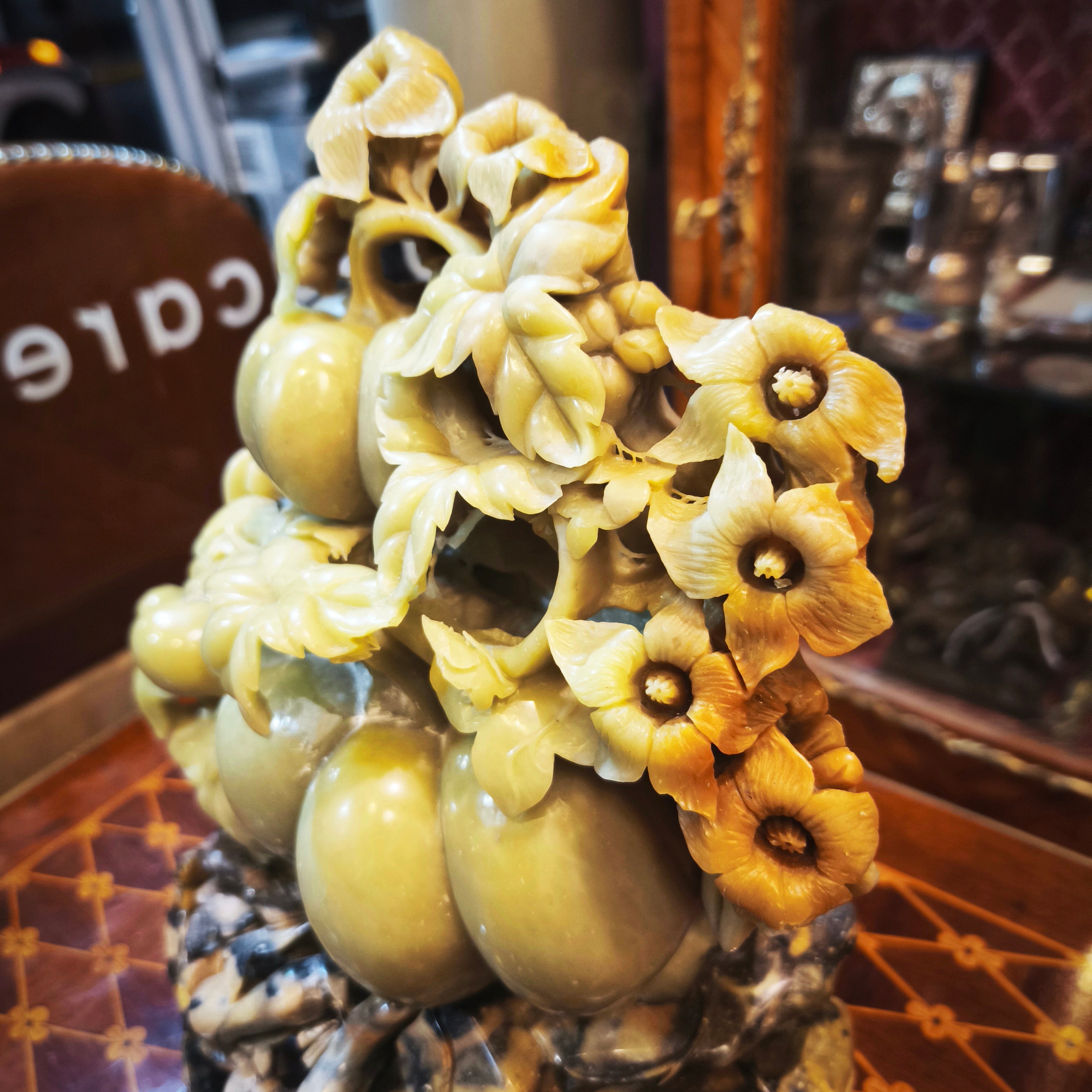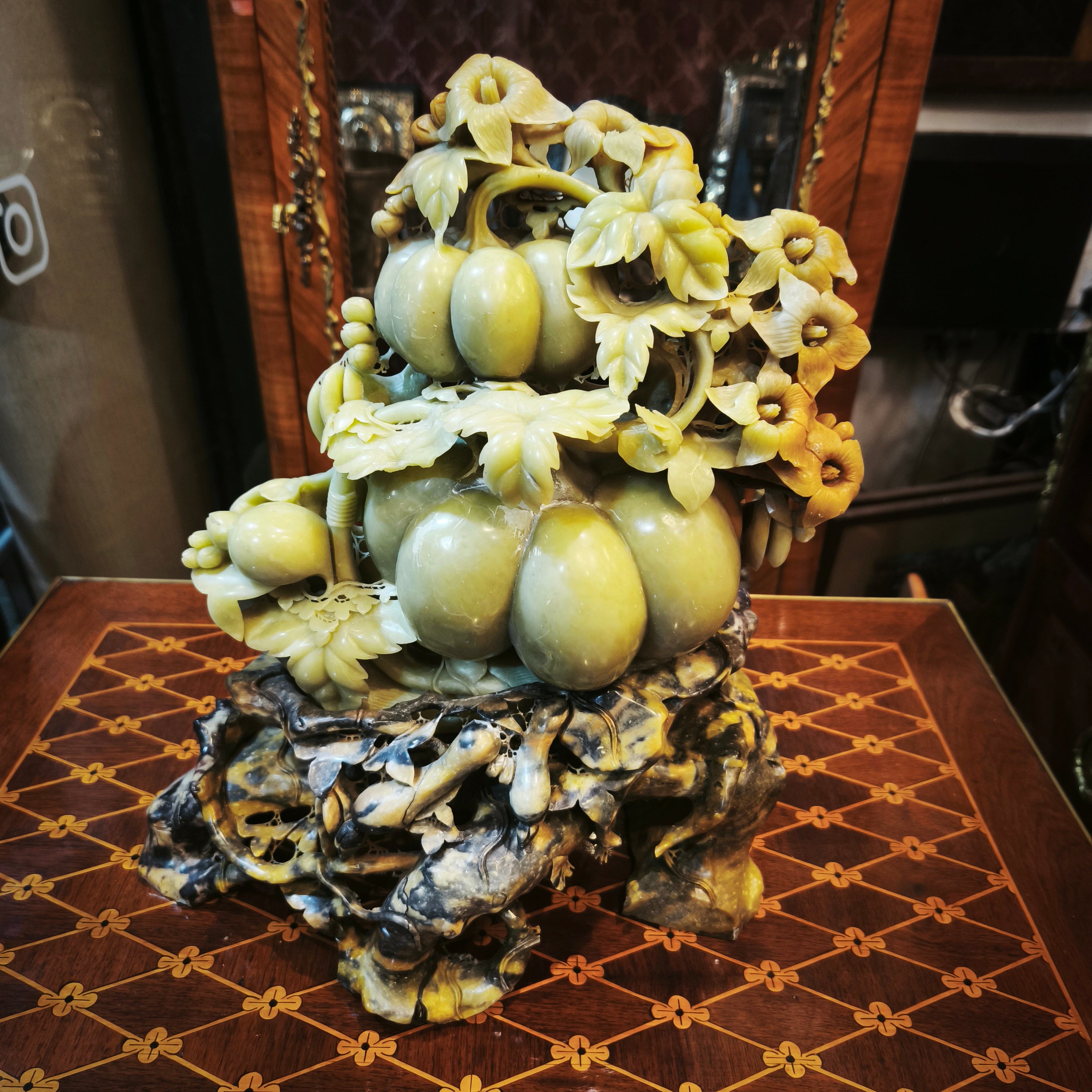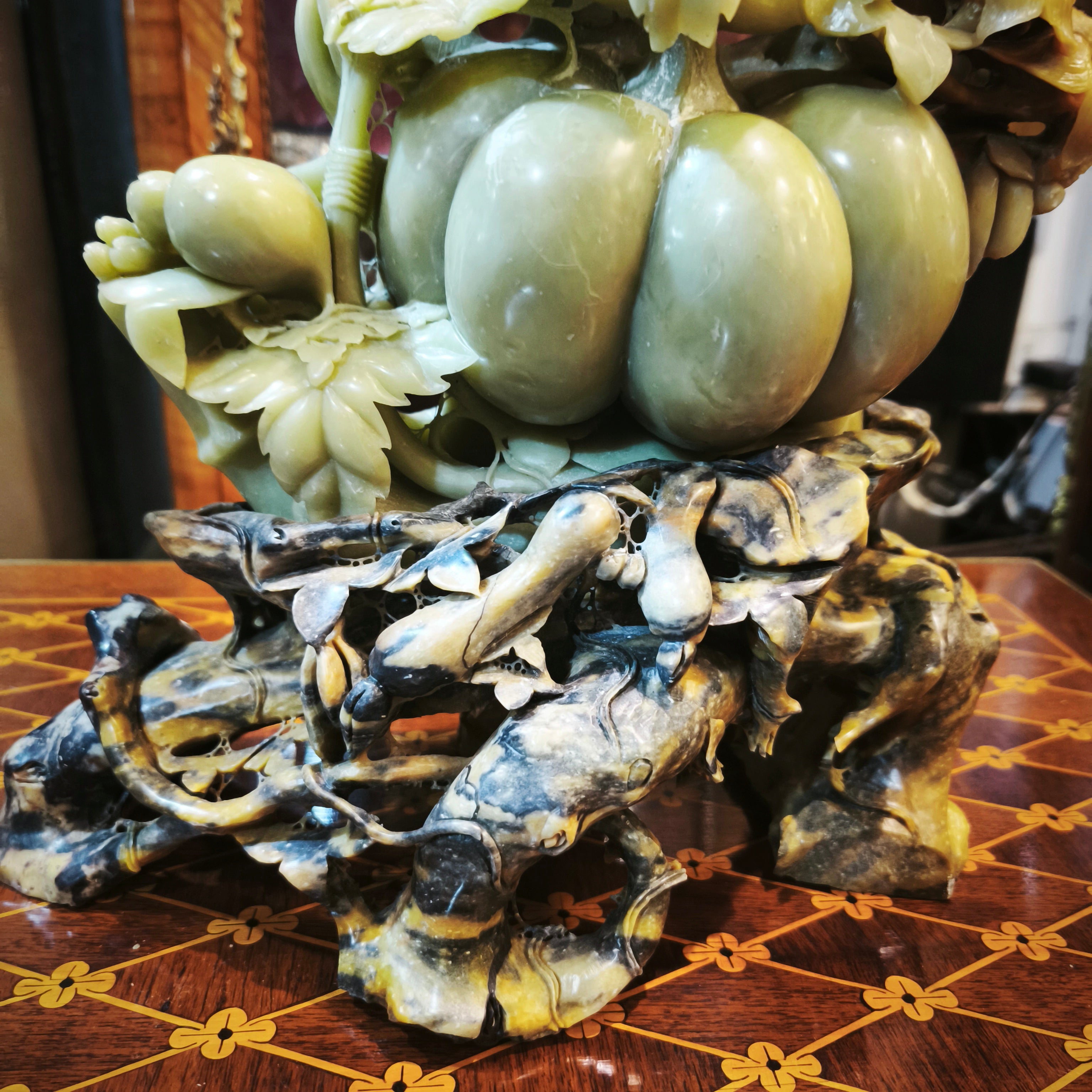 Bellísima y llamativa escultura en piedra dura, de origen asiático, en dos tonos, representando una enredadera con grandes frutos y flores colgando. La pieza tiene un tono verde, similar al jade, en la parte superior y un tono marmolado para su parte inferior, dando la sensación de una escultura con una base esculpida.