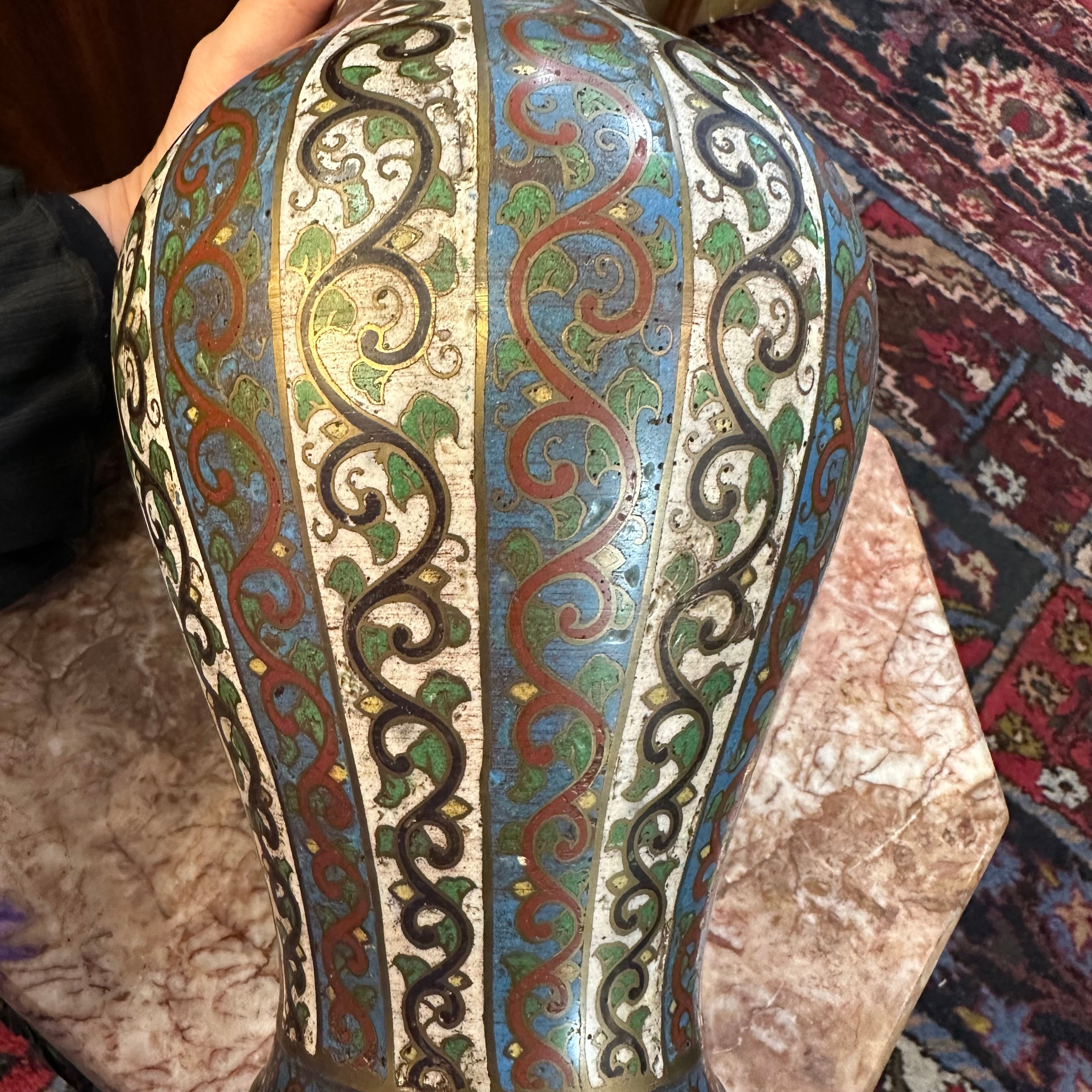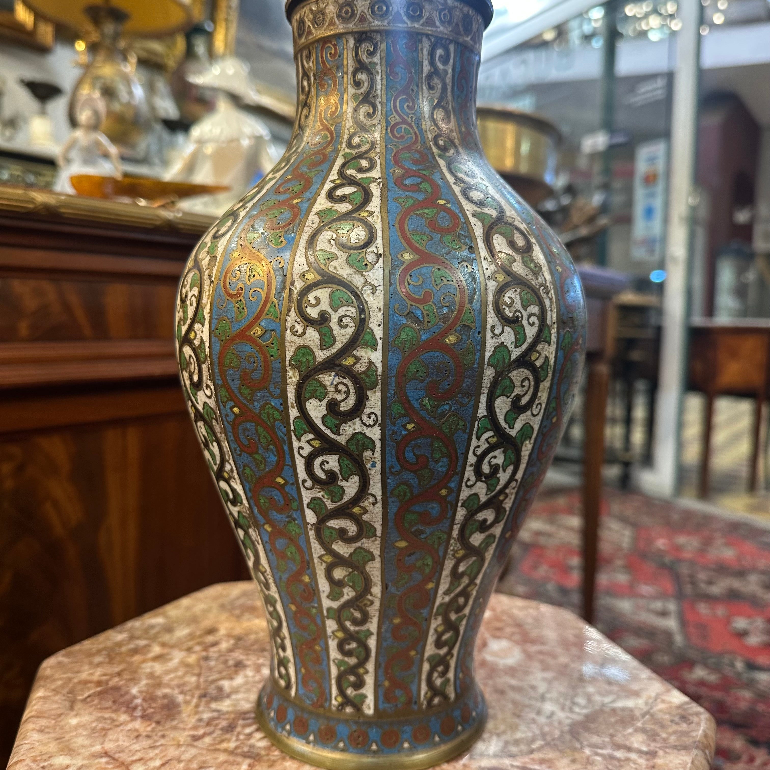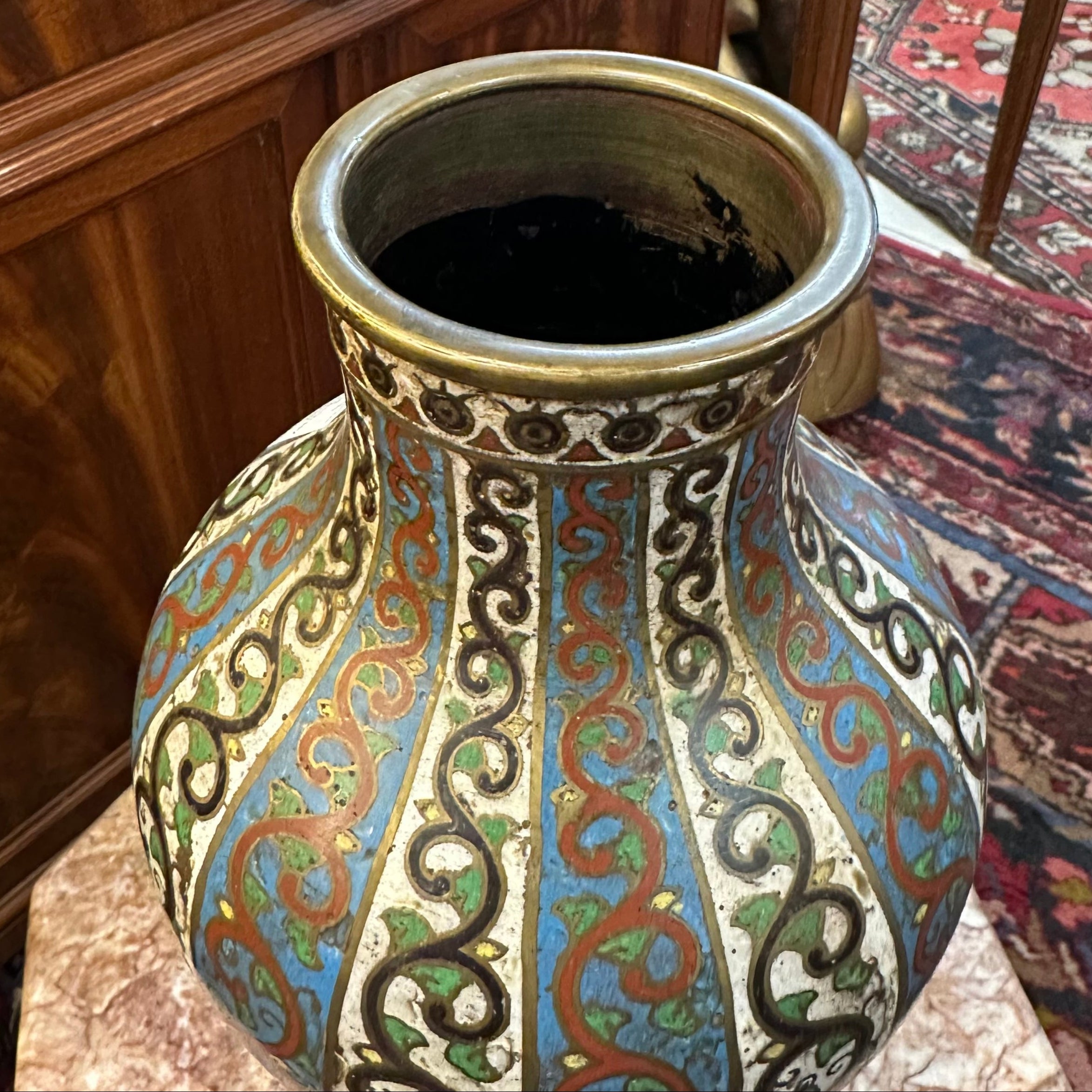 Espectacular jarrón cloissoné japonés de bronce, de mediados del siglo XIX de la era Meiji. Presenta un bello diseño con patrones que se repiten y que representan la naturaleza.