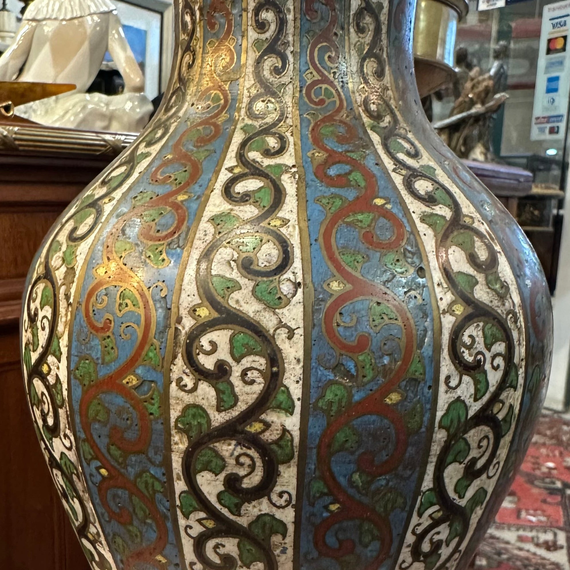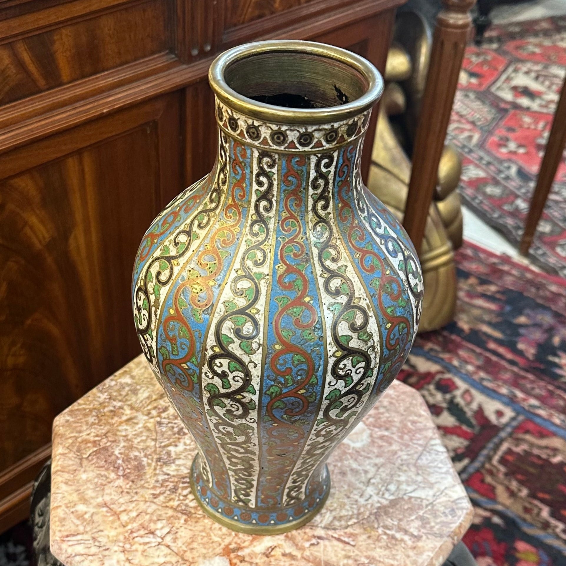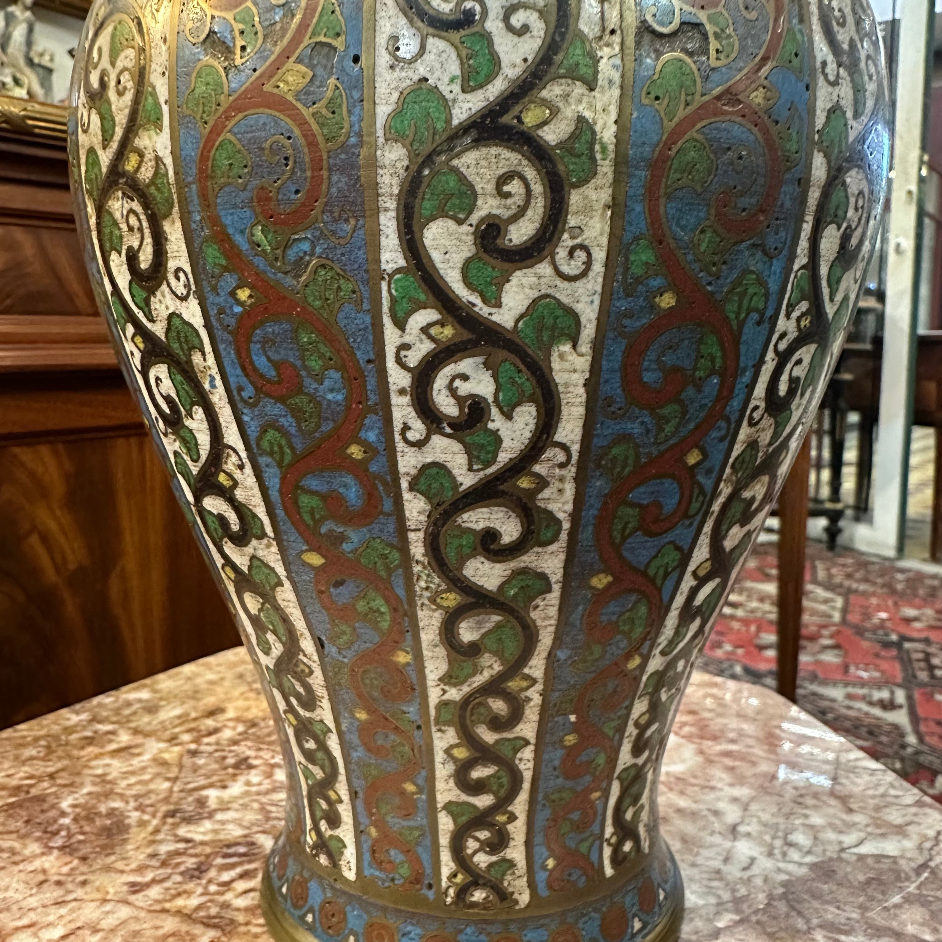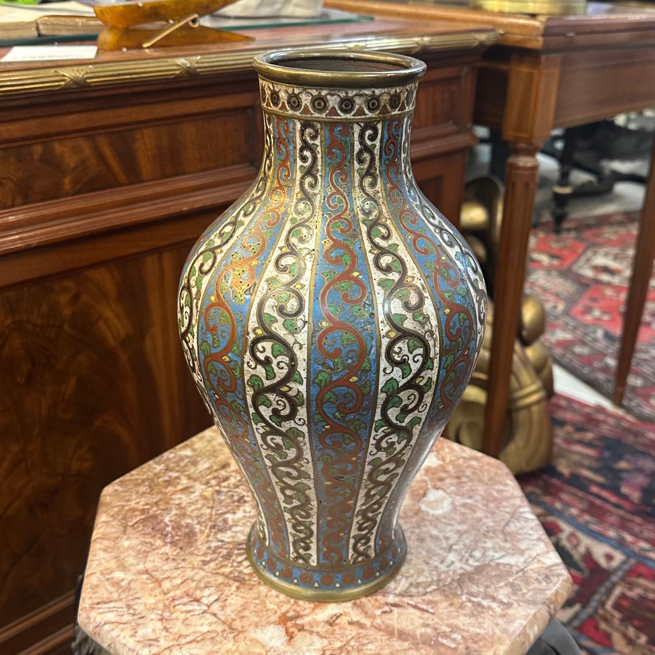 Espectacular jarrón cloissoné japonés de bronce, de mediados del siglo XIX de la era Meiji. Presenta un bello diseño con patrones que se repiten y que representan la naturaleza.