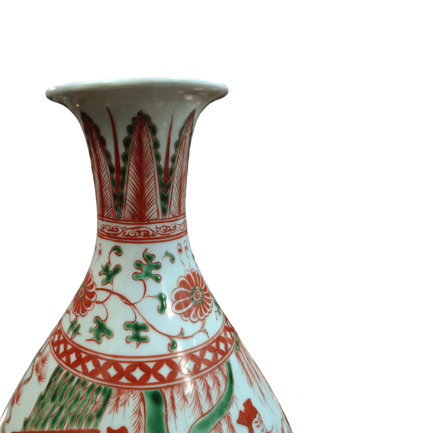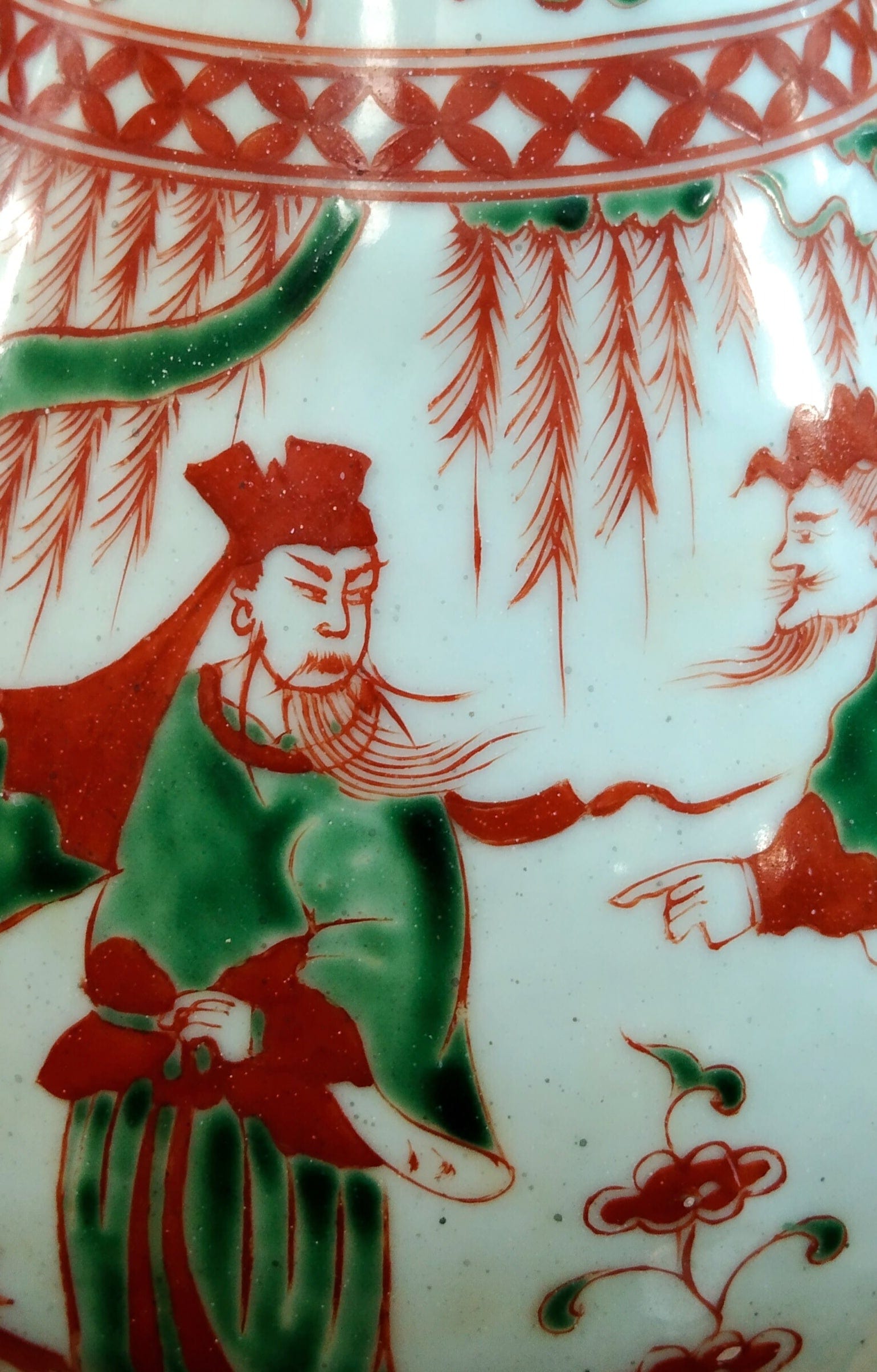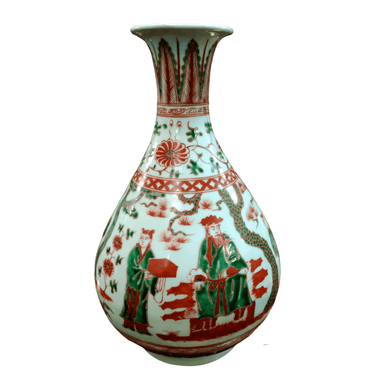 Bello arrón de porcelana china, pintada a mano, escenas de la época en verde y rojo, representando a personajes en un jardín. El jarrón también cuenta con bellos detalles de diseños florales en su cuello.