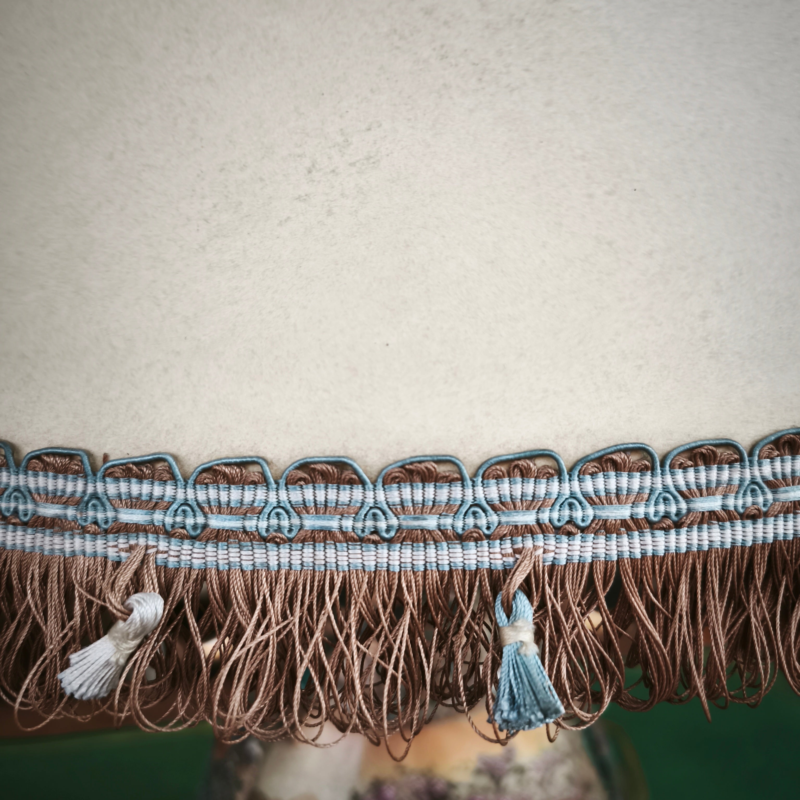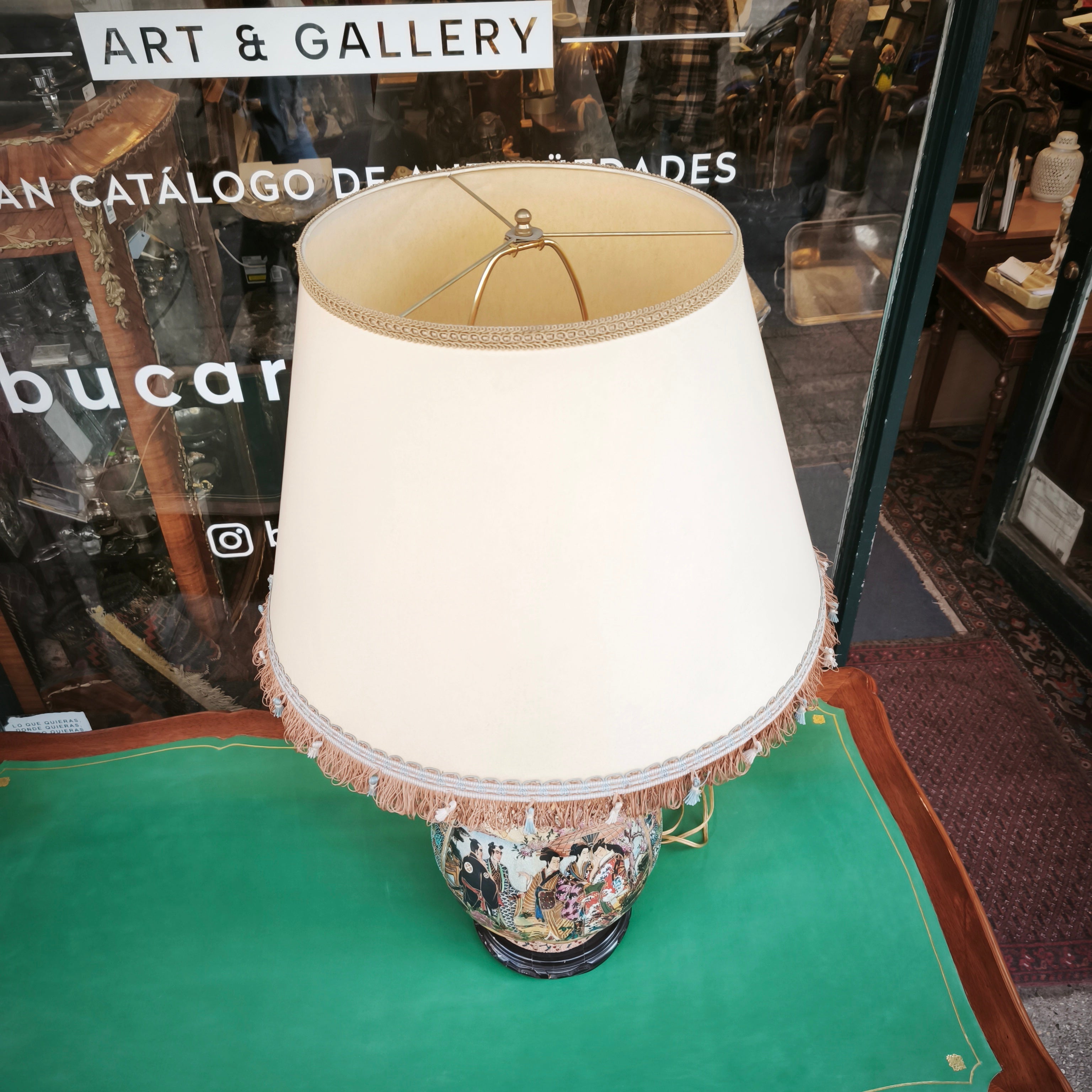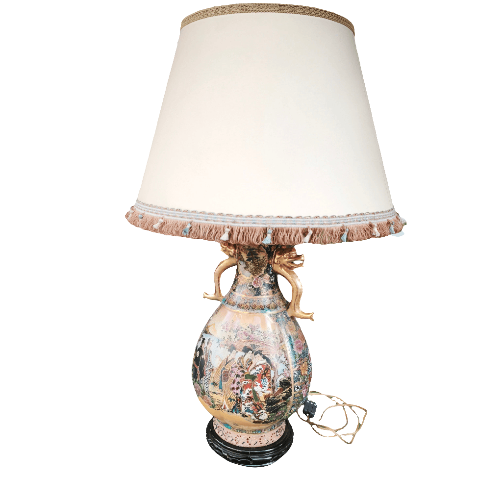 Lámpara de origen chino en estilo Satsuma y fabricación contemporánea, con bellos diseños florales y decorados y asas terminadas en elegante dorado, además de varias representaciones de escenas con personajes con coloridas vestimentas en jardines. La pieza tiene una pena de madera tallada que se encuentra con algunos detalles. La pantalla es color crema con decorados en hilo cobrizo, dorado y celeste.