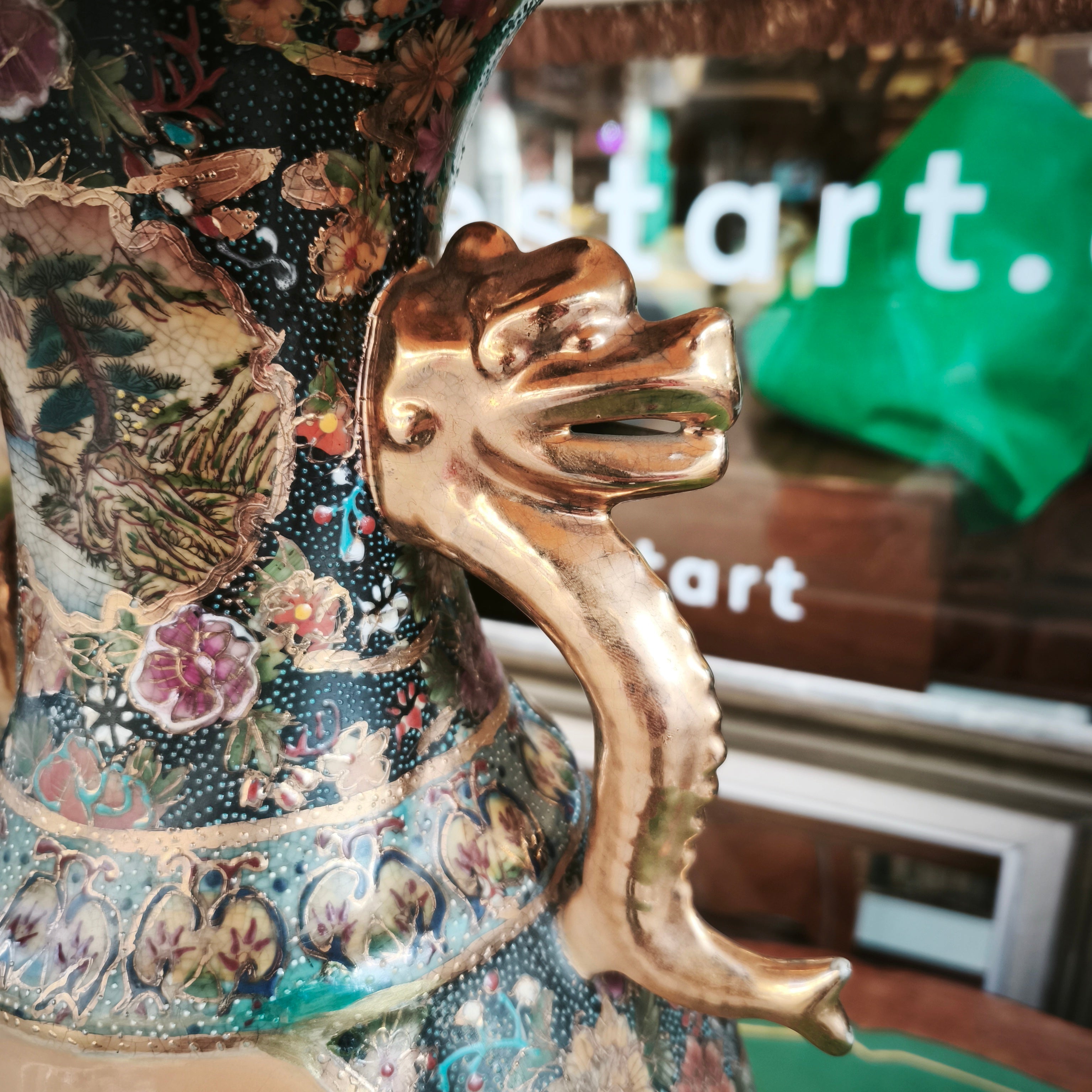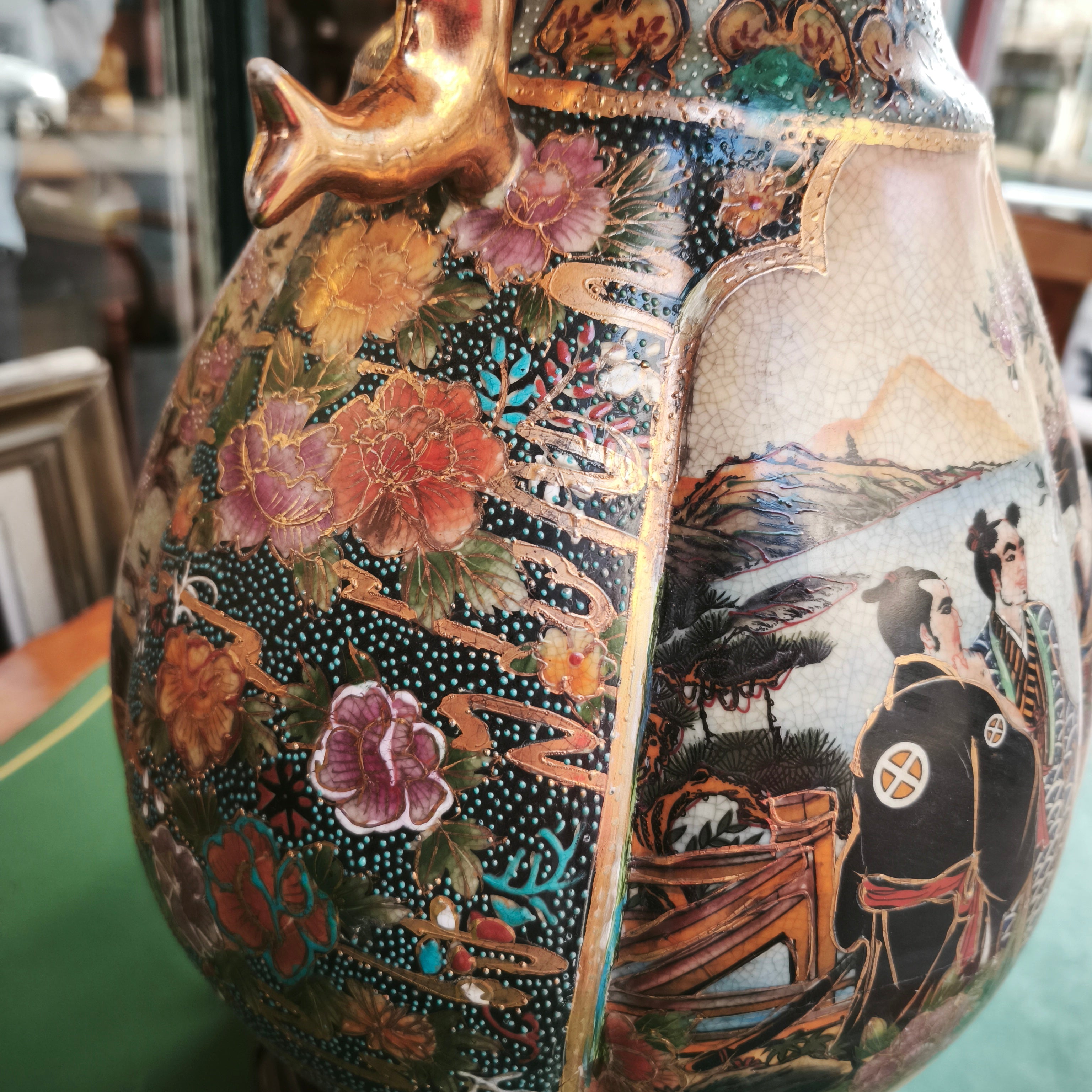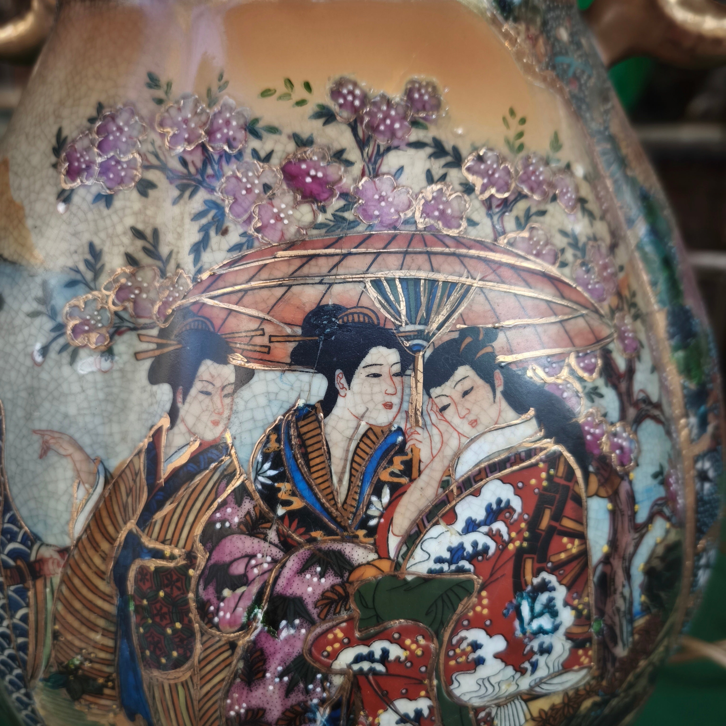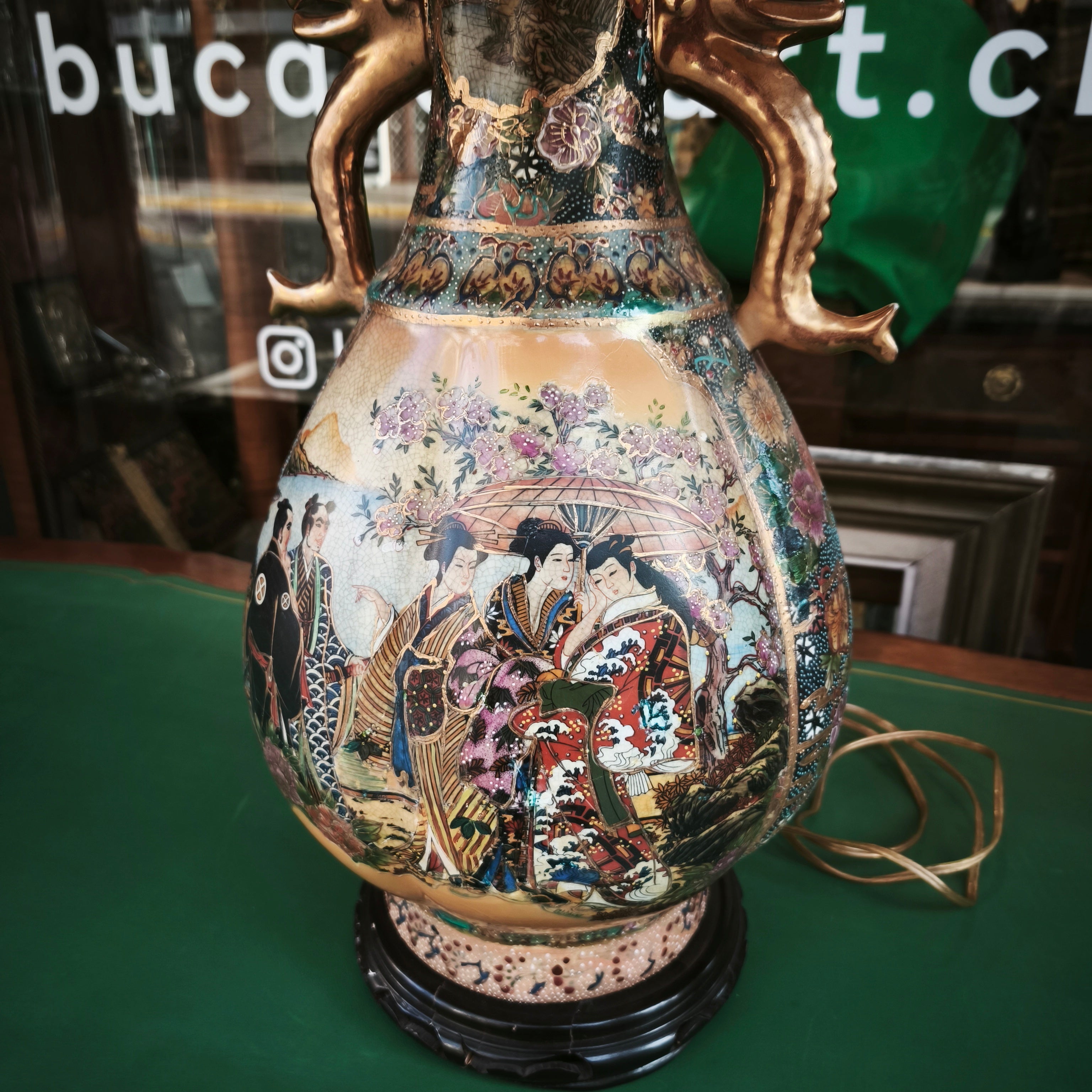 Lámpara china estilo Satsuma con peana diseño dorado y floral
