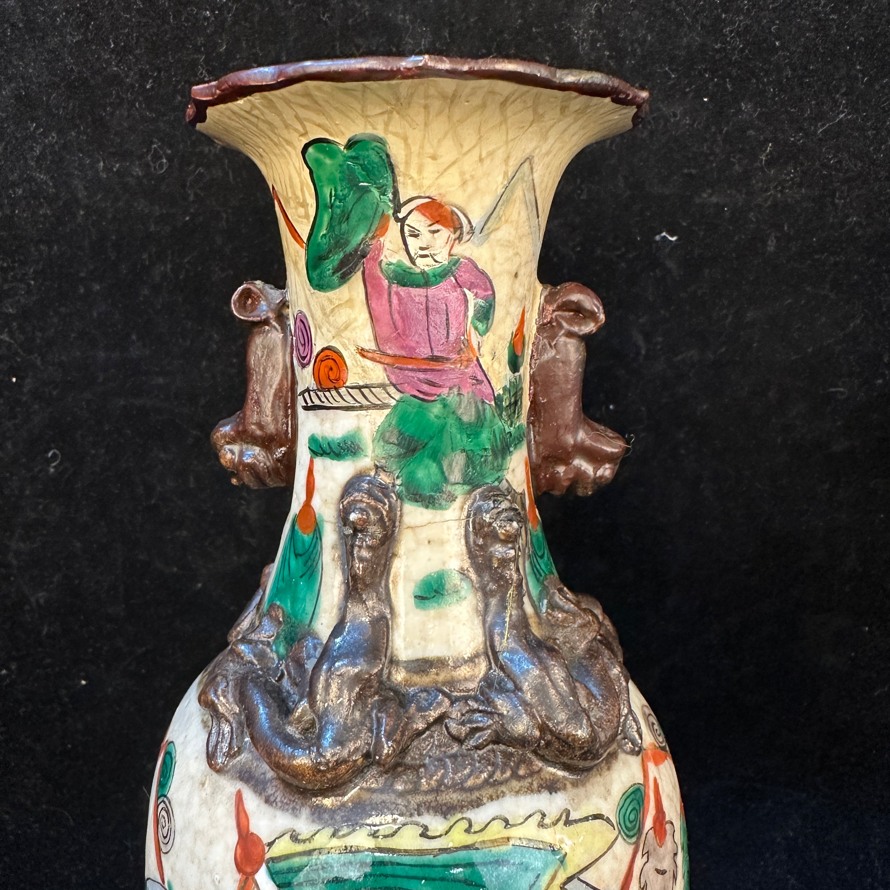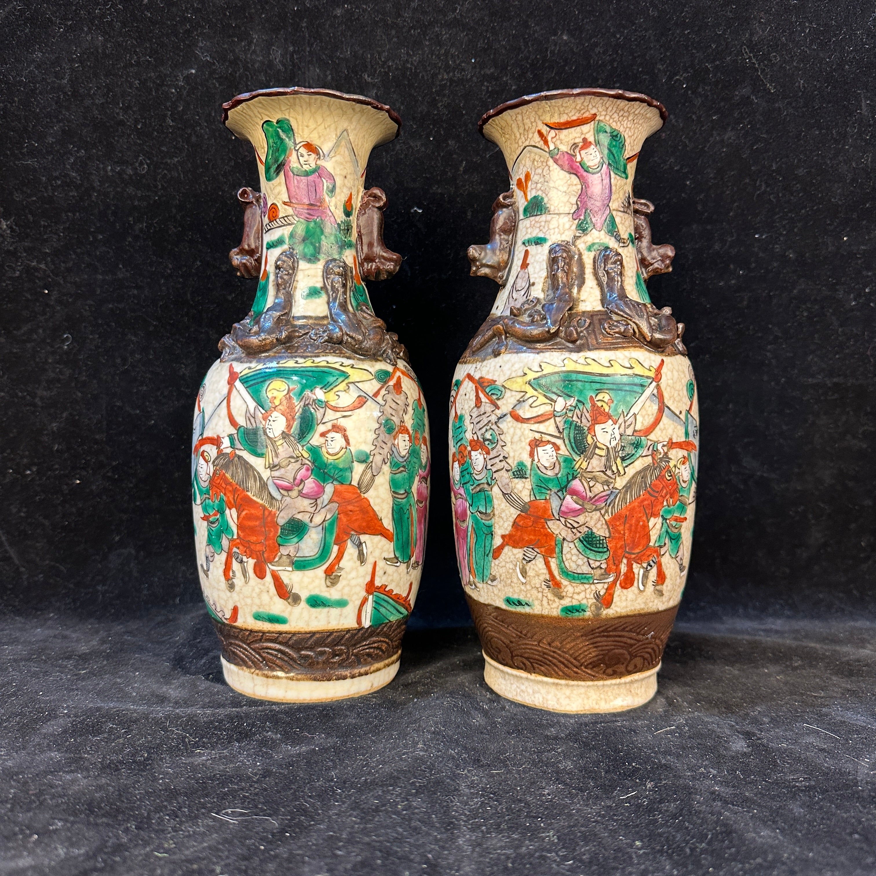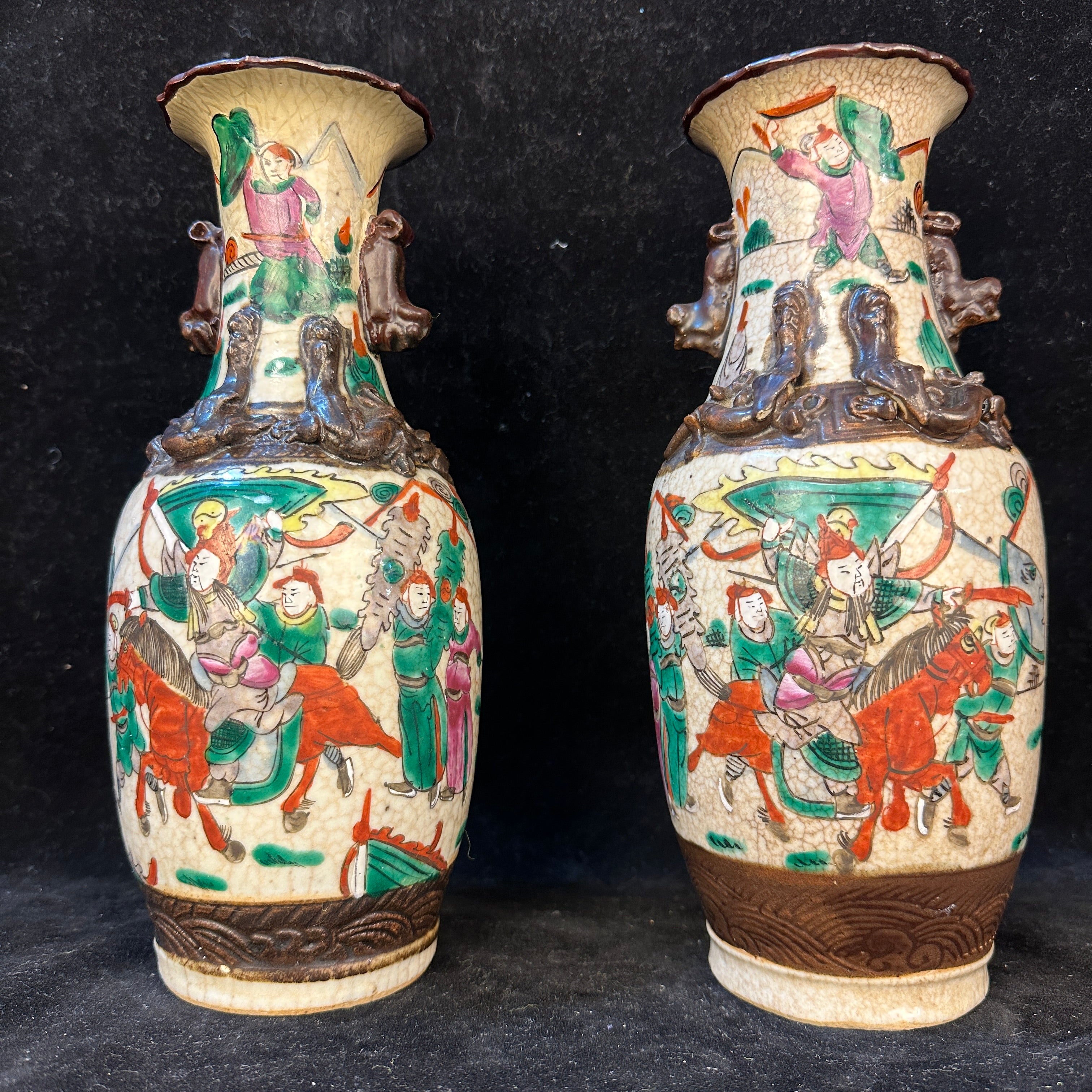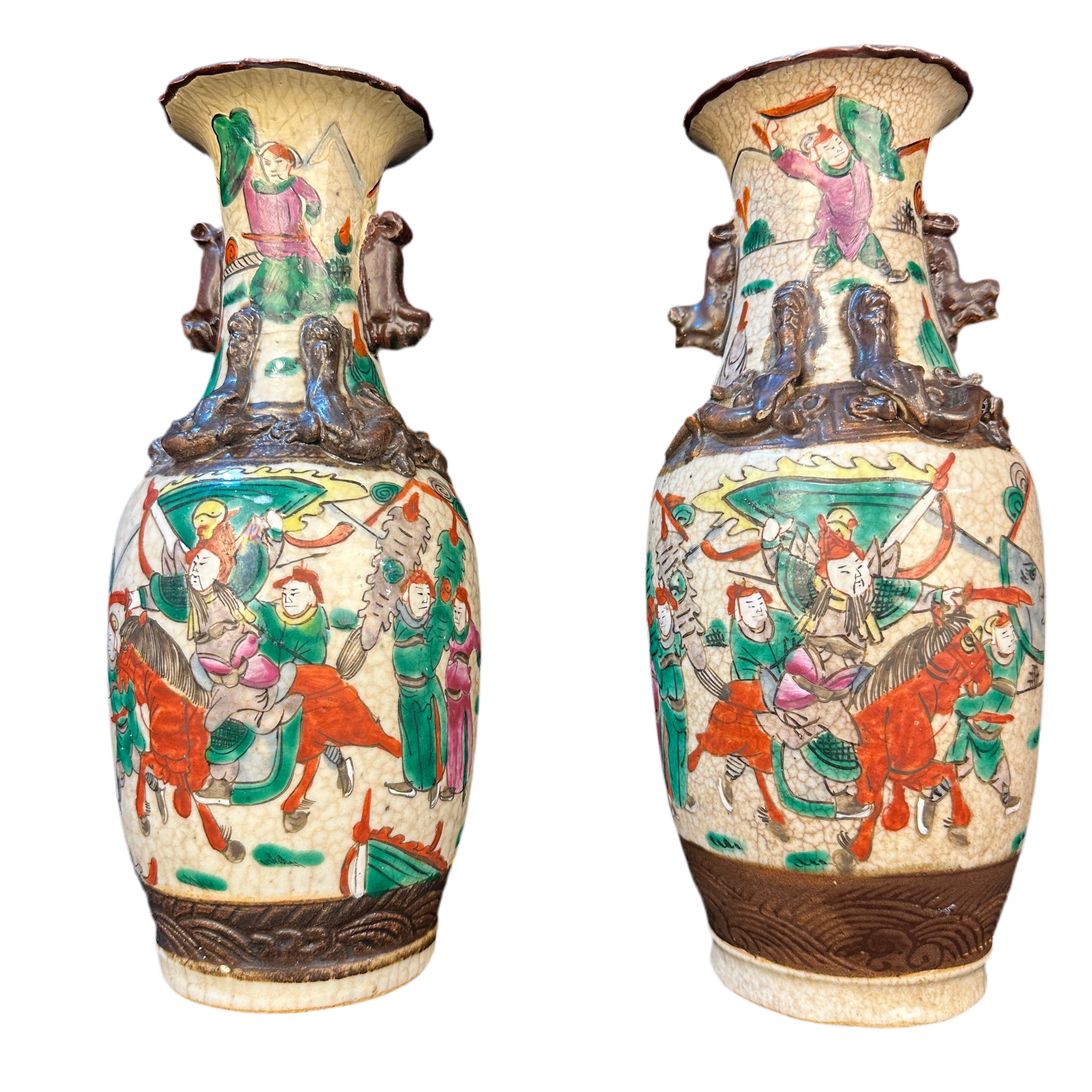 Pareja de jarrones chinos estilo Nanking, con sus tradicionales escenas de batalla y adornado con salamandras. Posee pequeñas restauraciones en el cuello de uno de los jarrones.