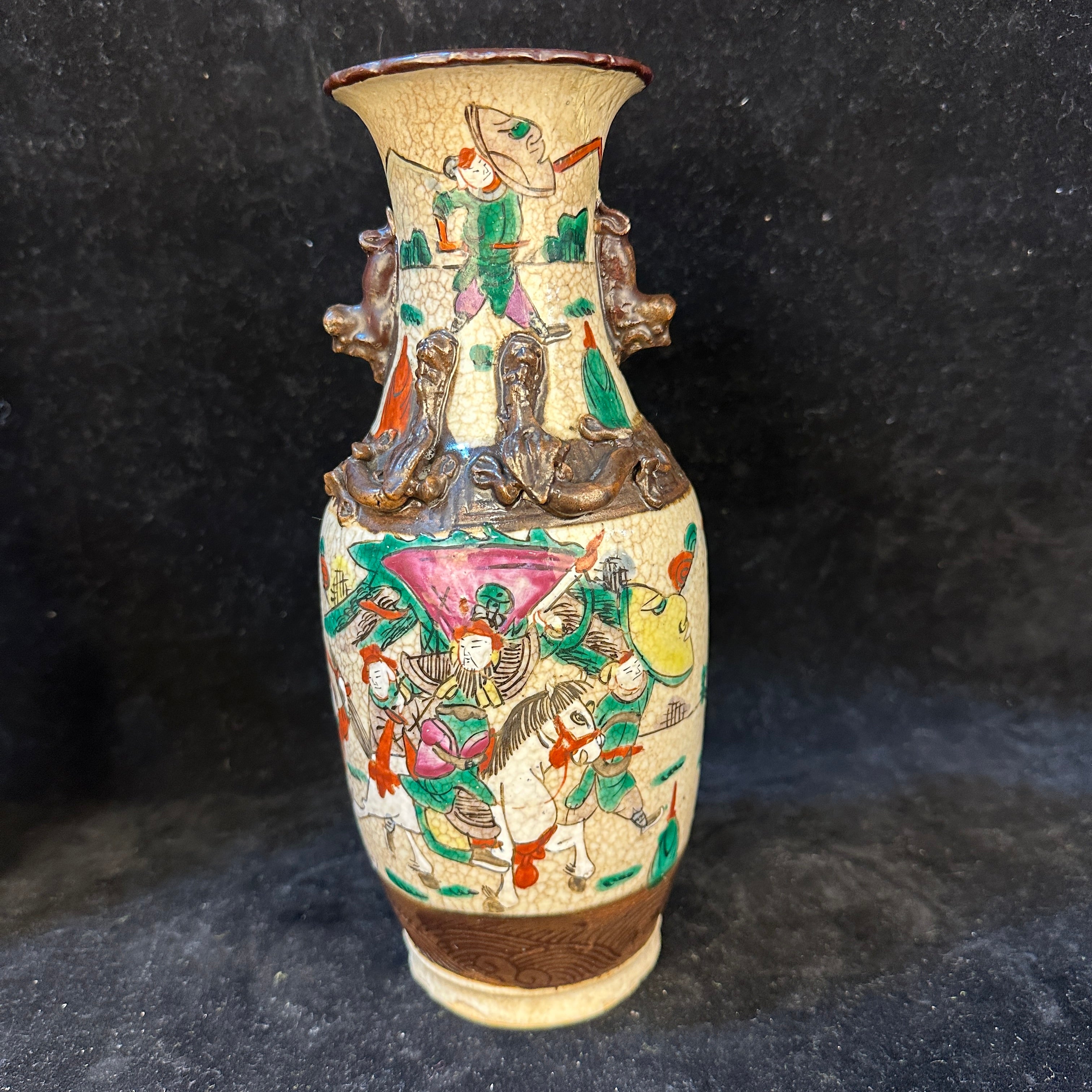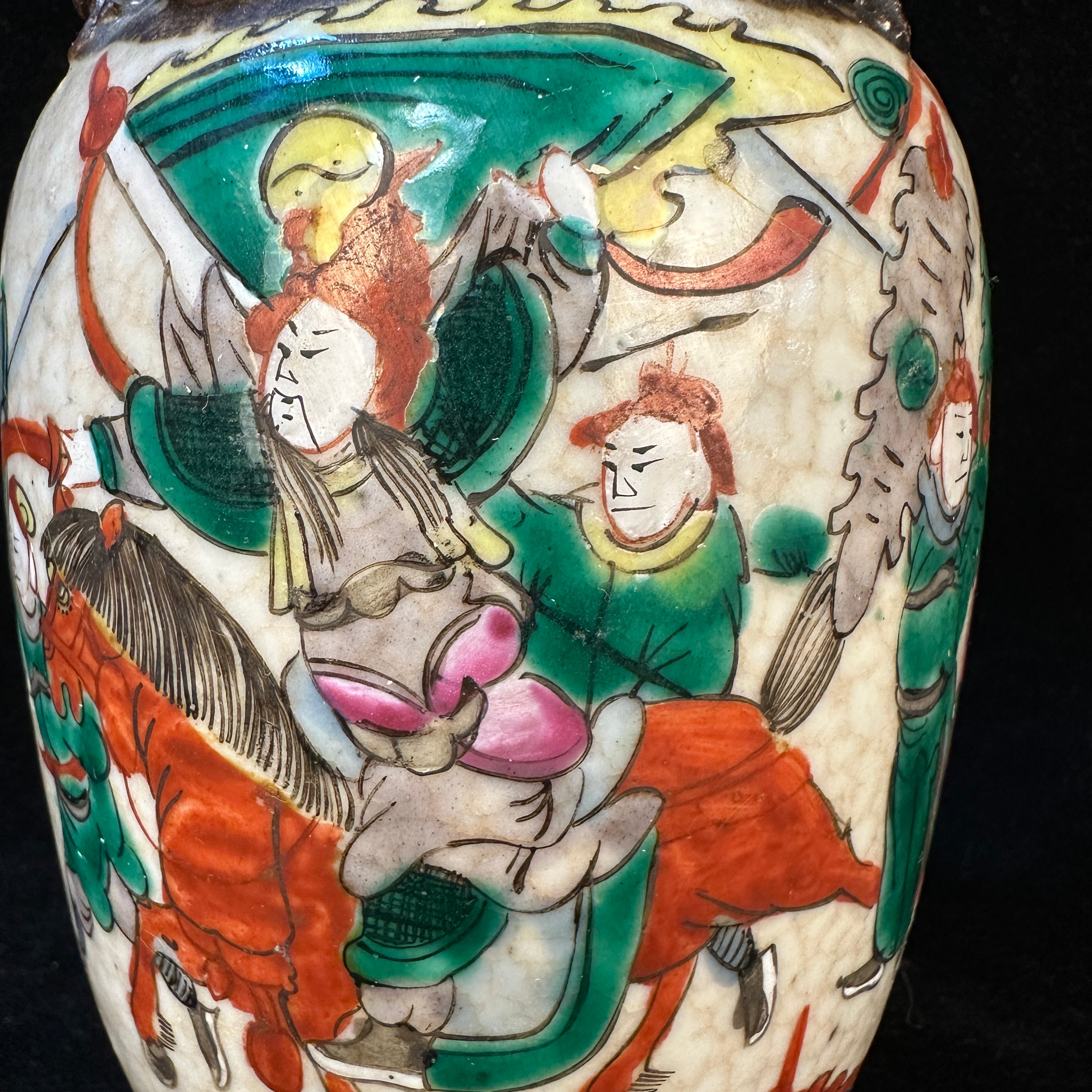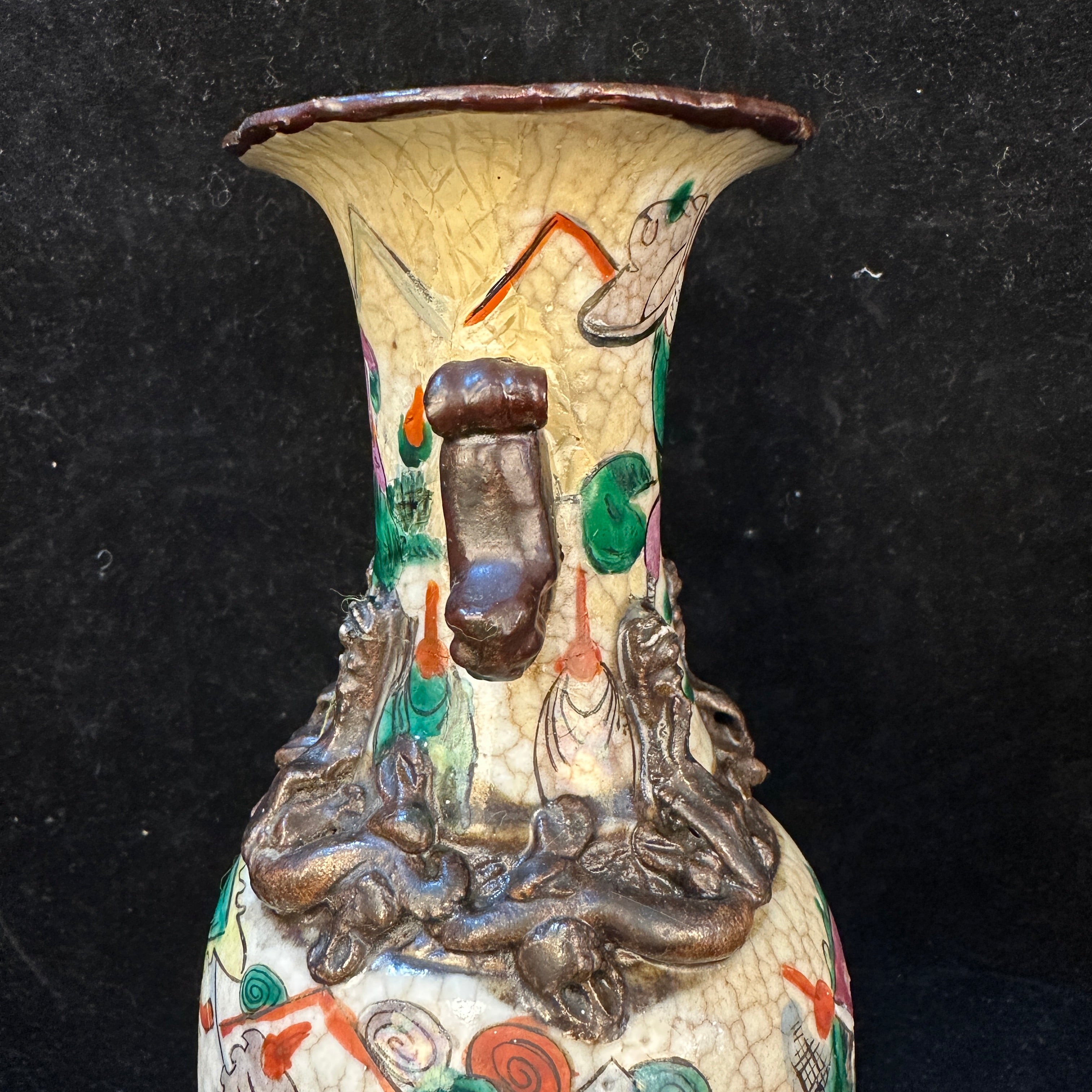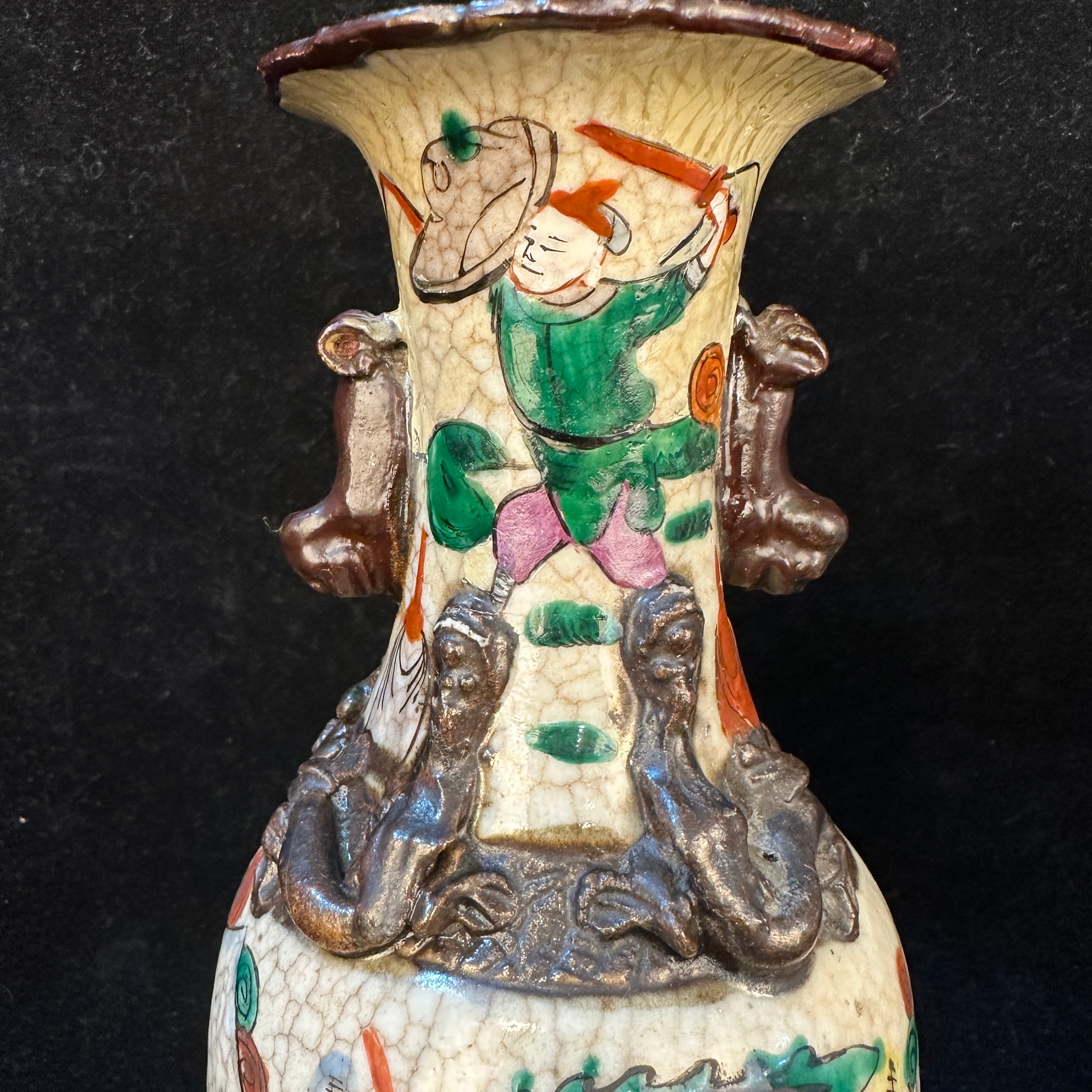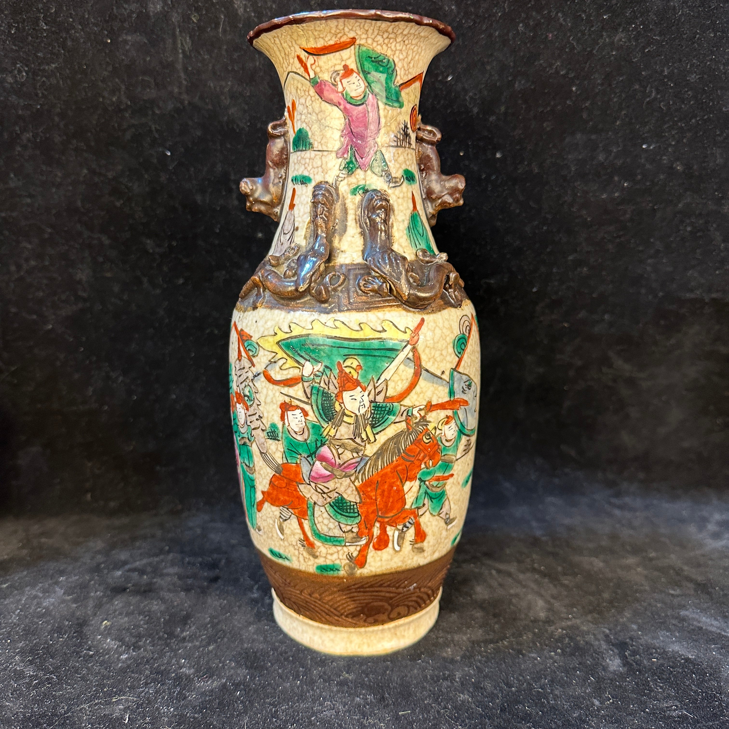 Pareja de jarrones chinos estilo Nanking, con sus tradicionales escenas de batalla y adornado con salamandras. Posee pequeñas restauraciones en el cuello de uno de los jarrones.