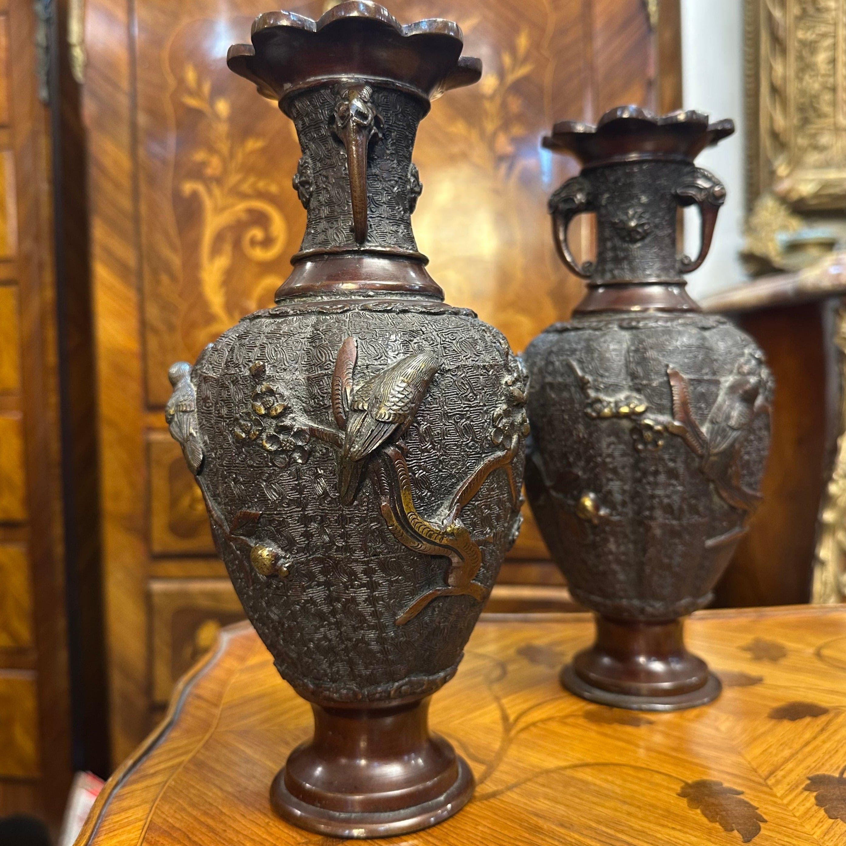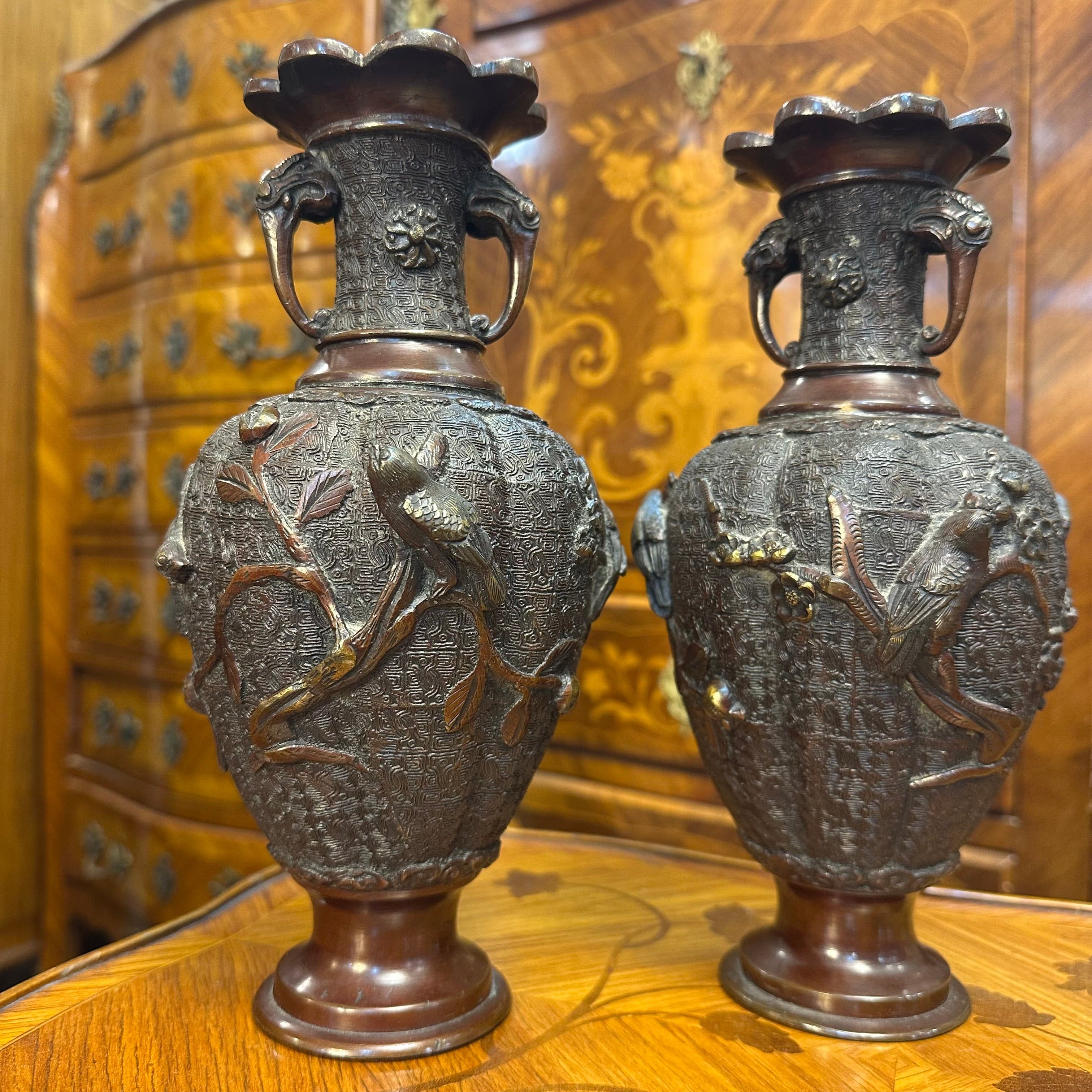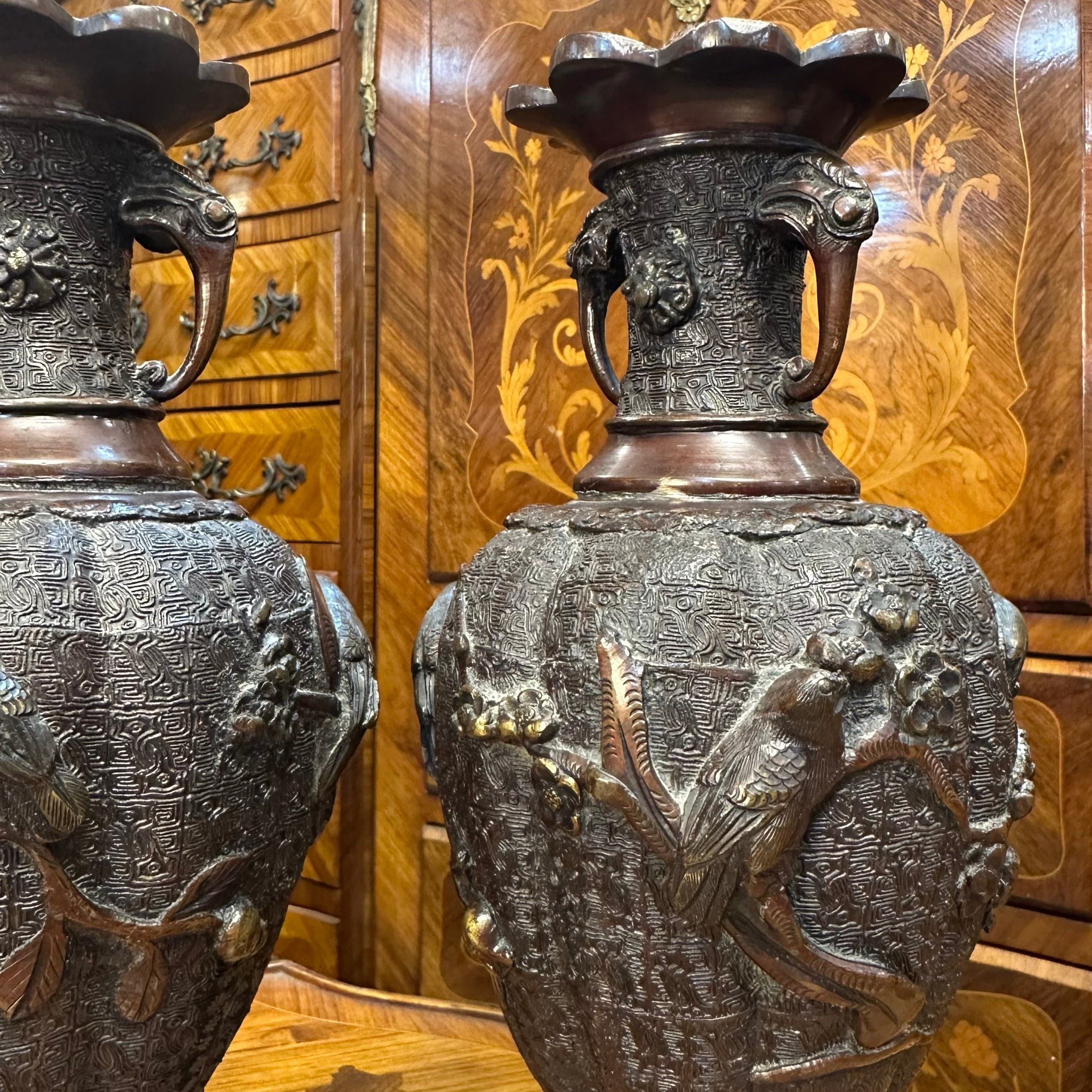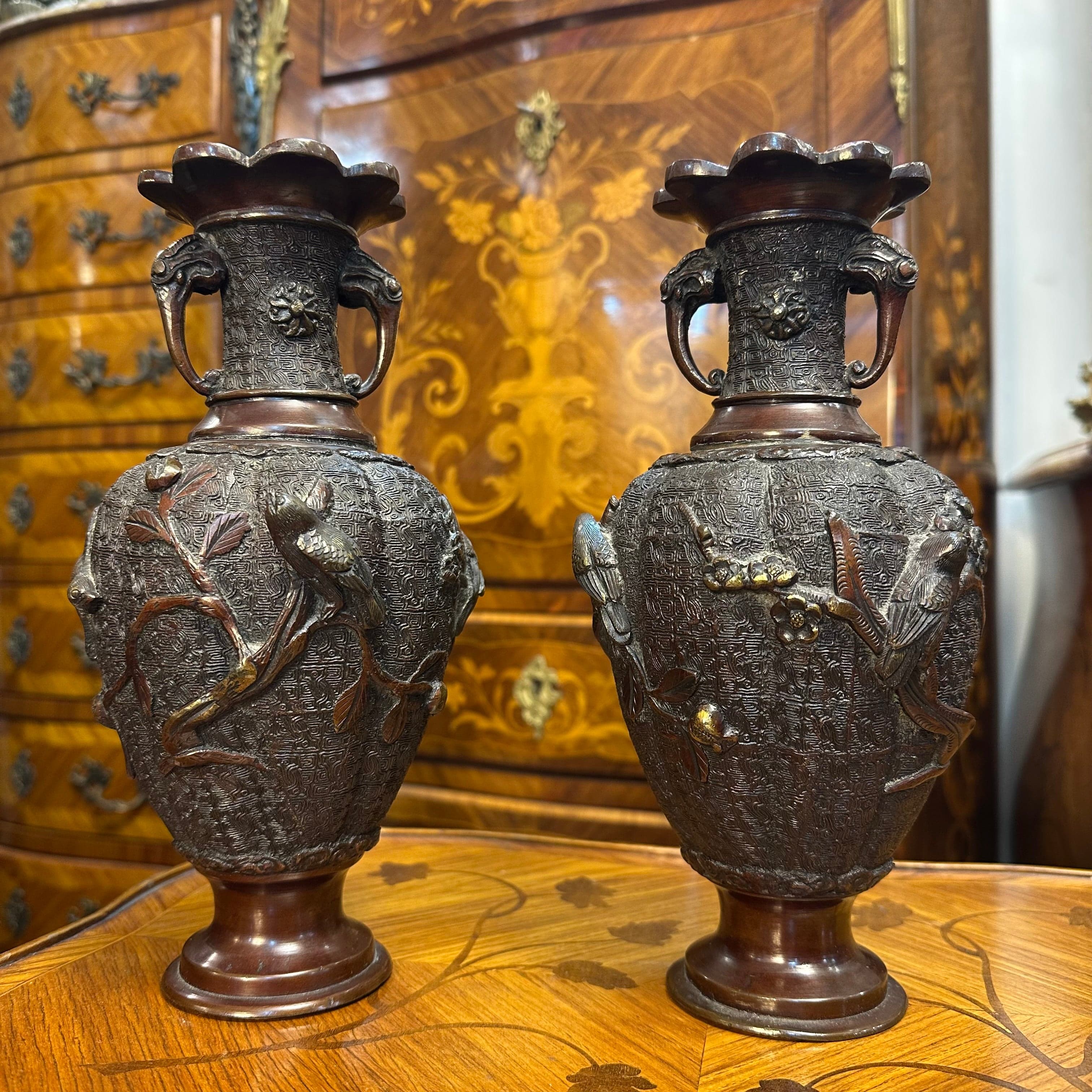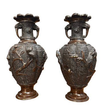 Bello par de jarrones de bronce con patina marrón de los años 50 aproximadamente. Posee un cuerpo con relieves que representan aves típicas de la cultura japonesa sobre ramas de ciruelo. Además, presenta un intrincado diseño y asas con lo que parecen ser cabezas de animales.