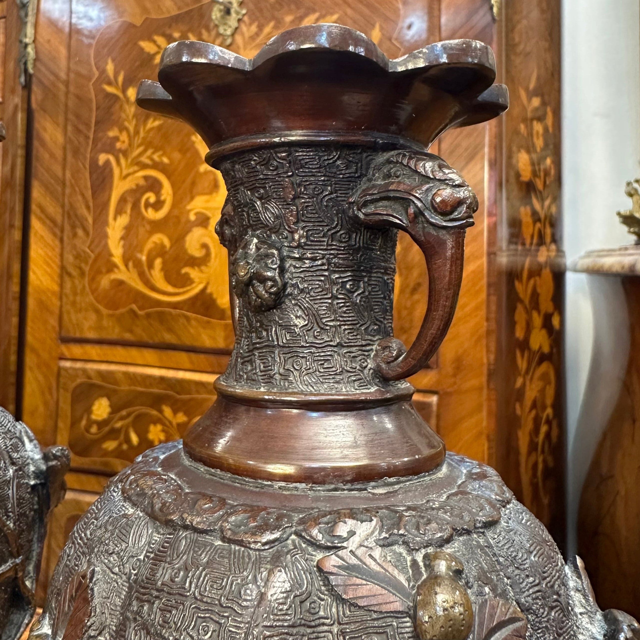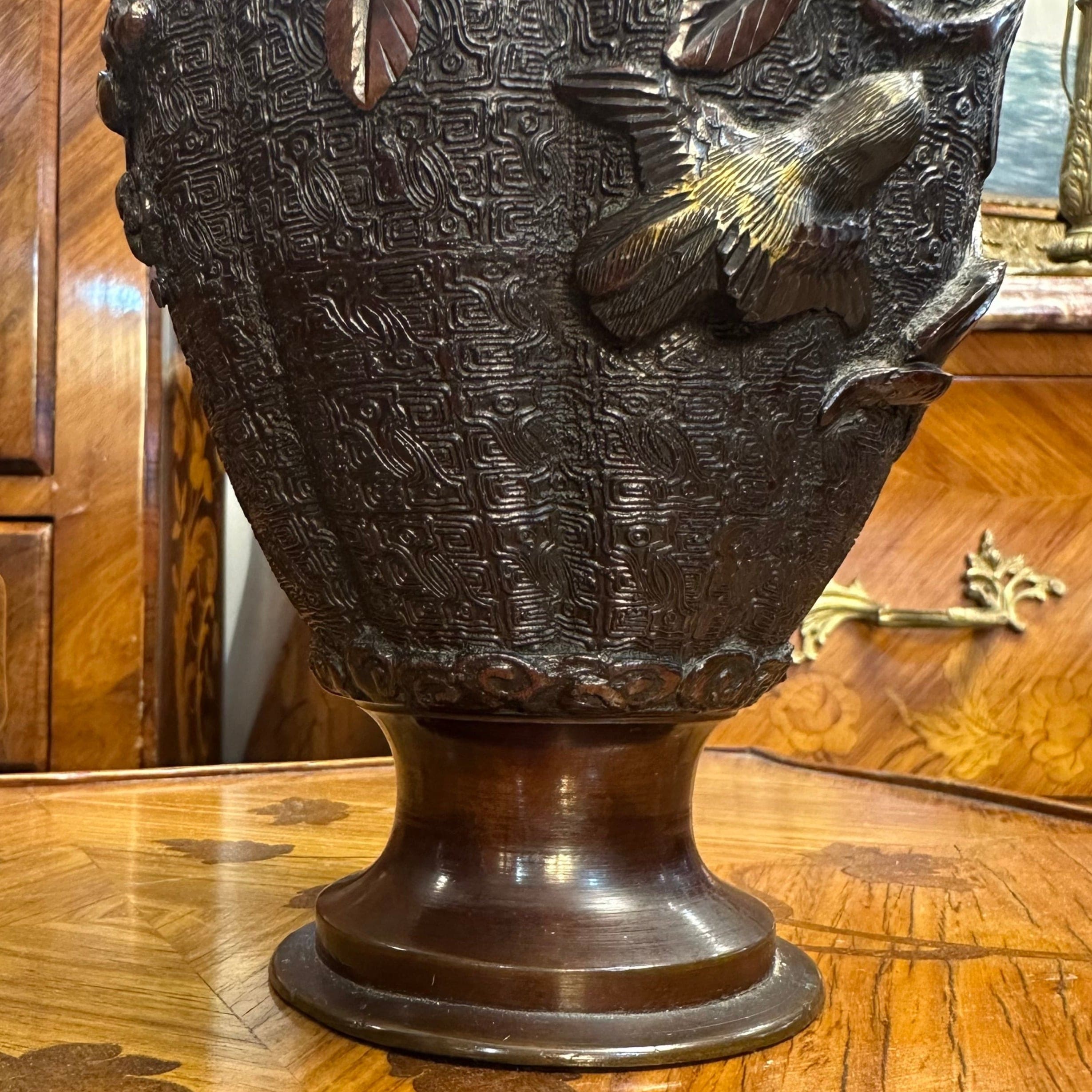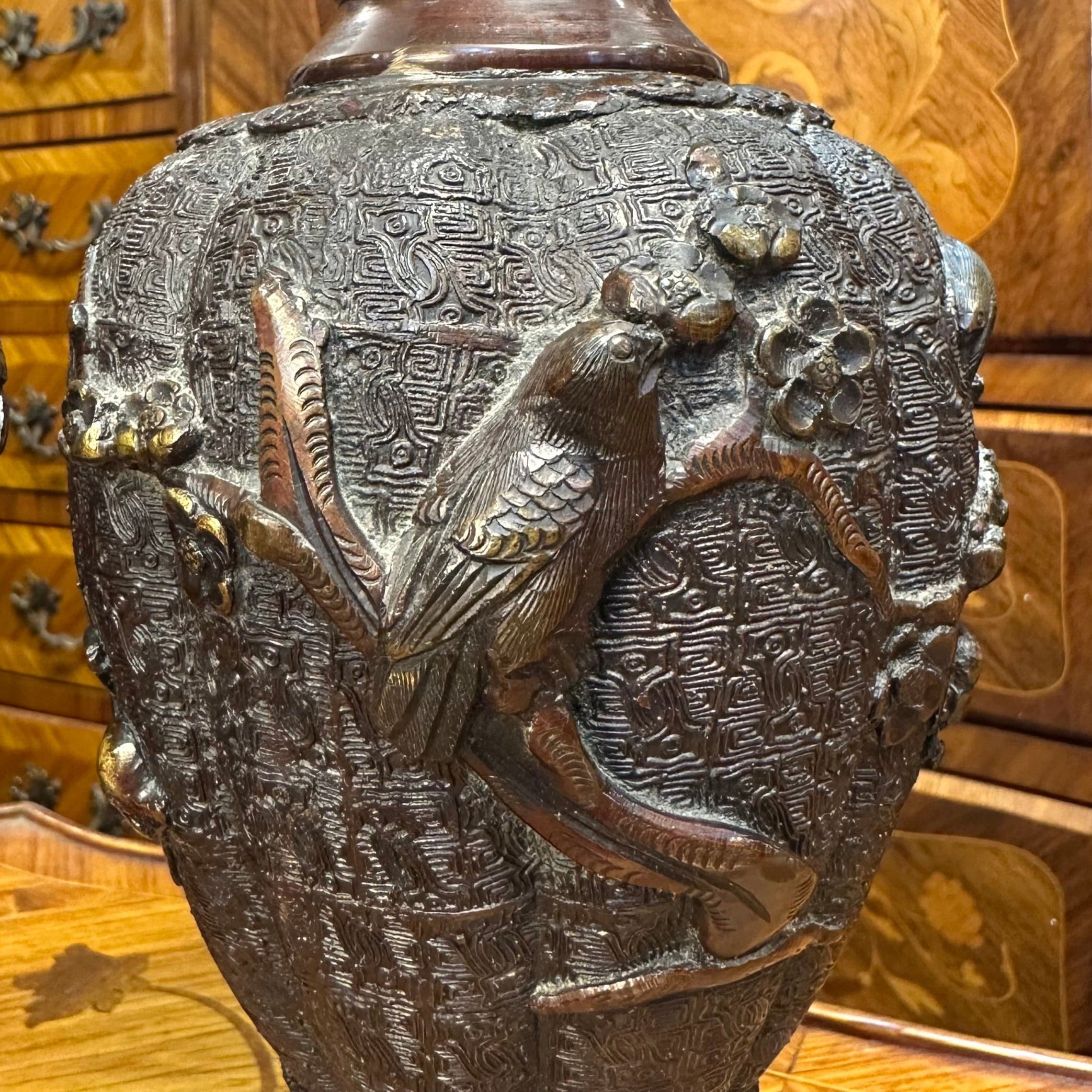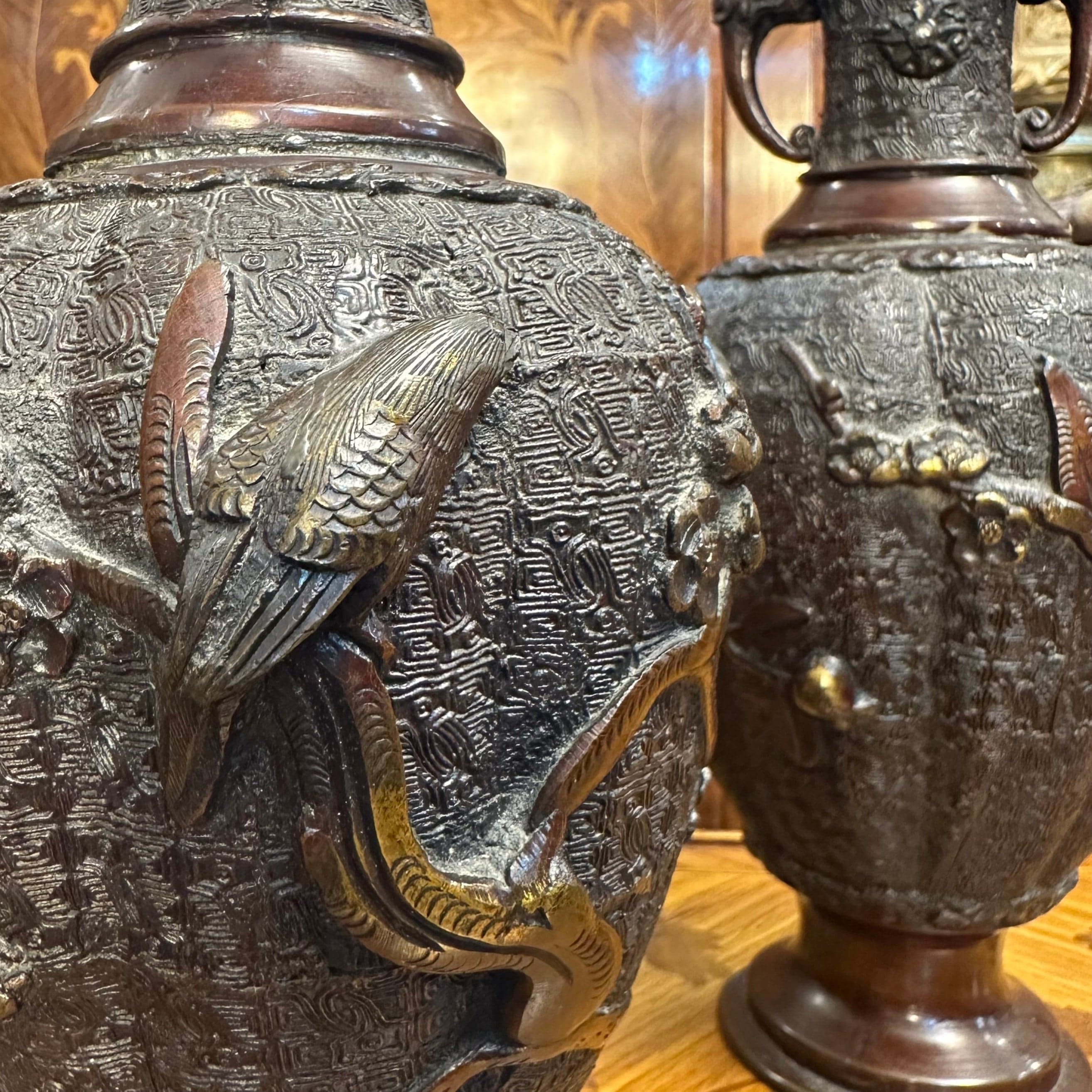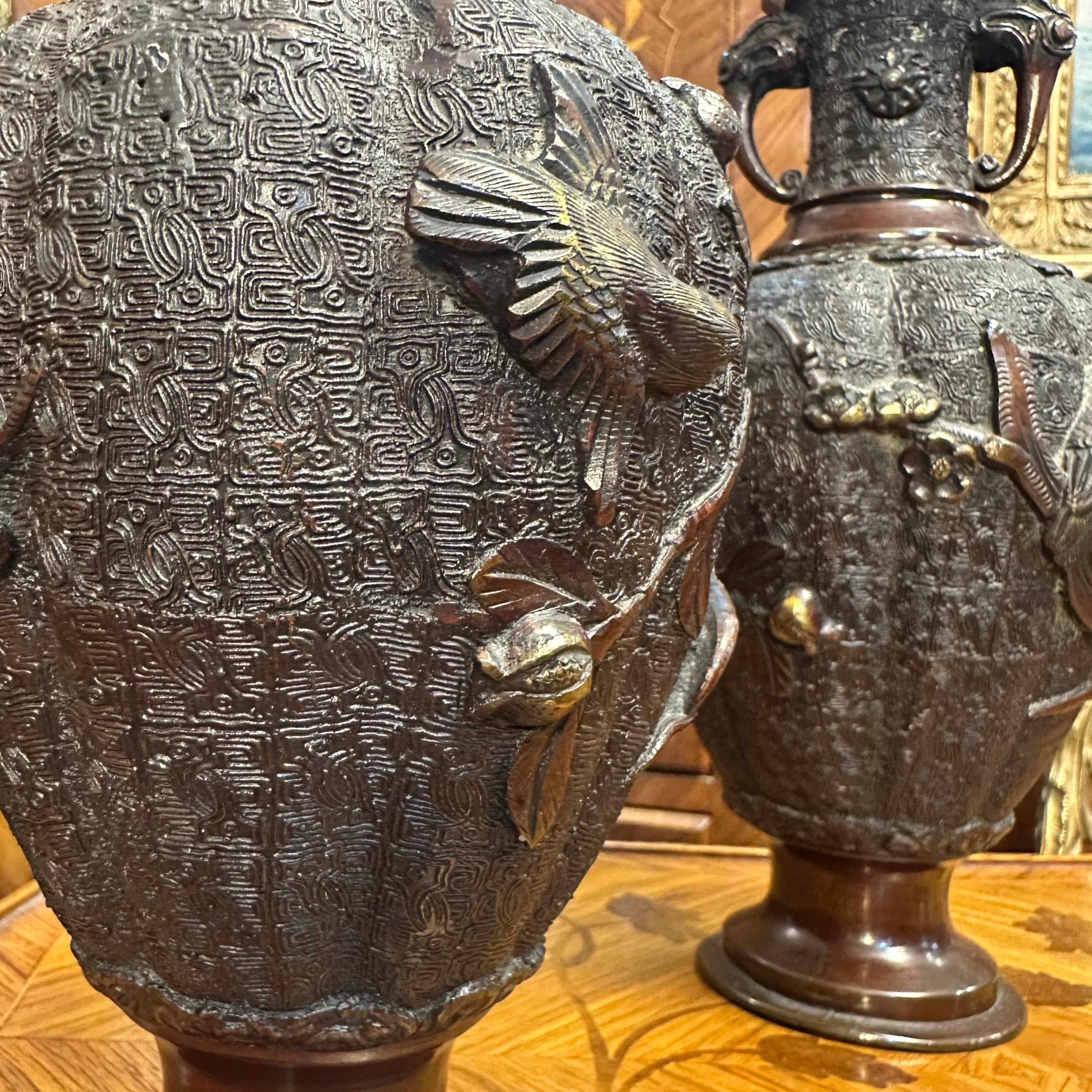 Bello par de jarrones de bronce con patina marrón de los años 50 aproximadamente. Posee un cuerpo con relieves que representan aves típicas de la cultura japonesa sobre ramas de ciruelo. Además, presenta un intrincado diseño y asas con lo que parecen ser cabezas de animales.