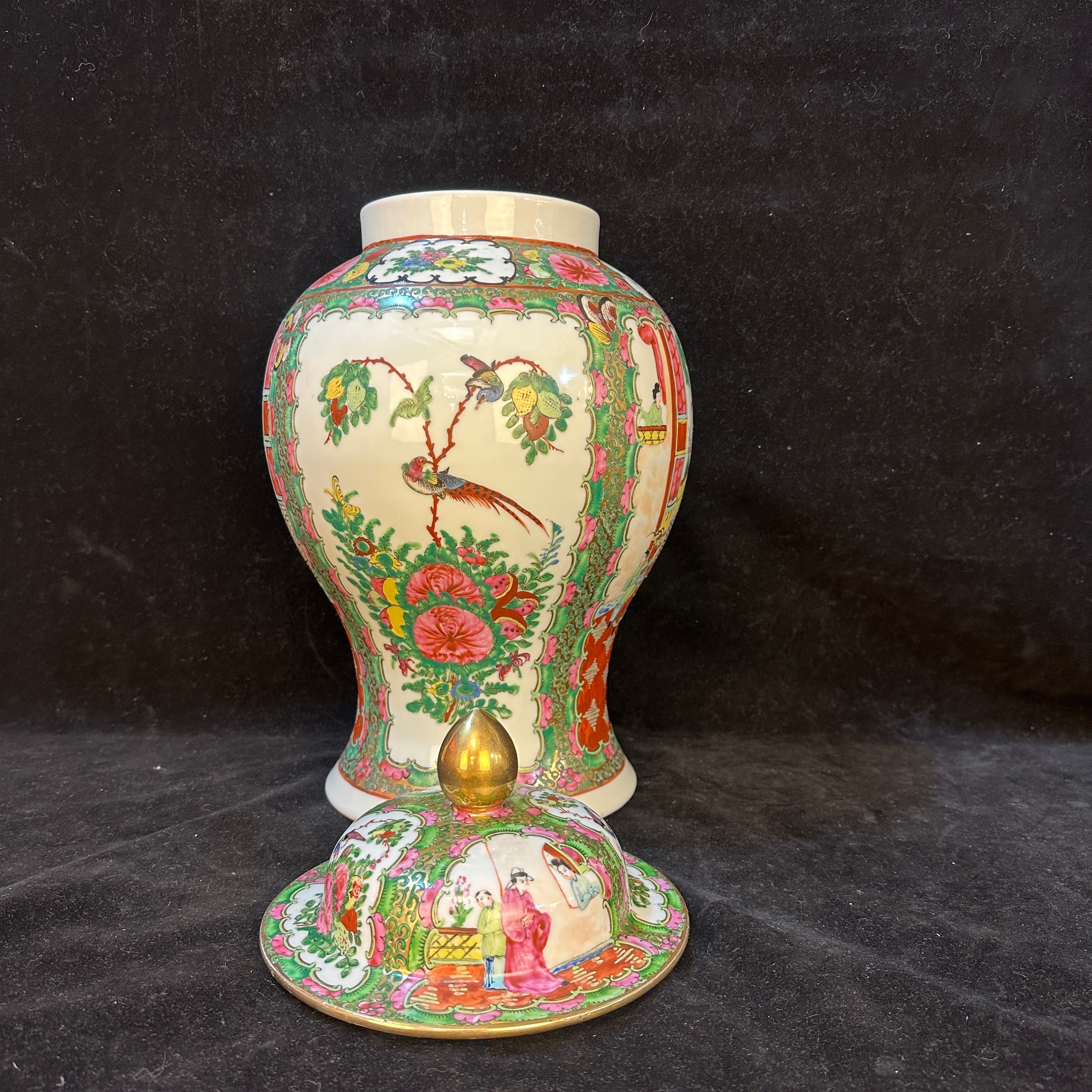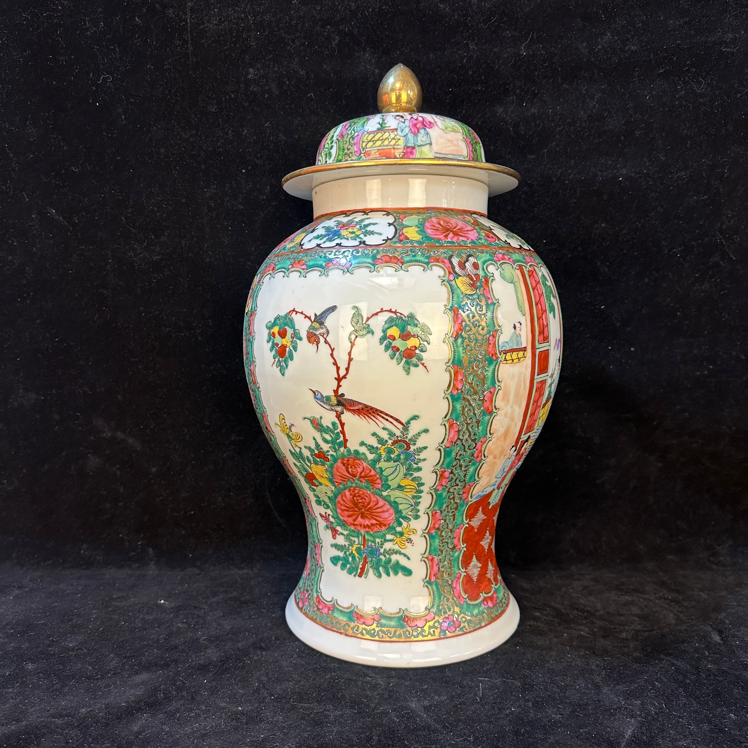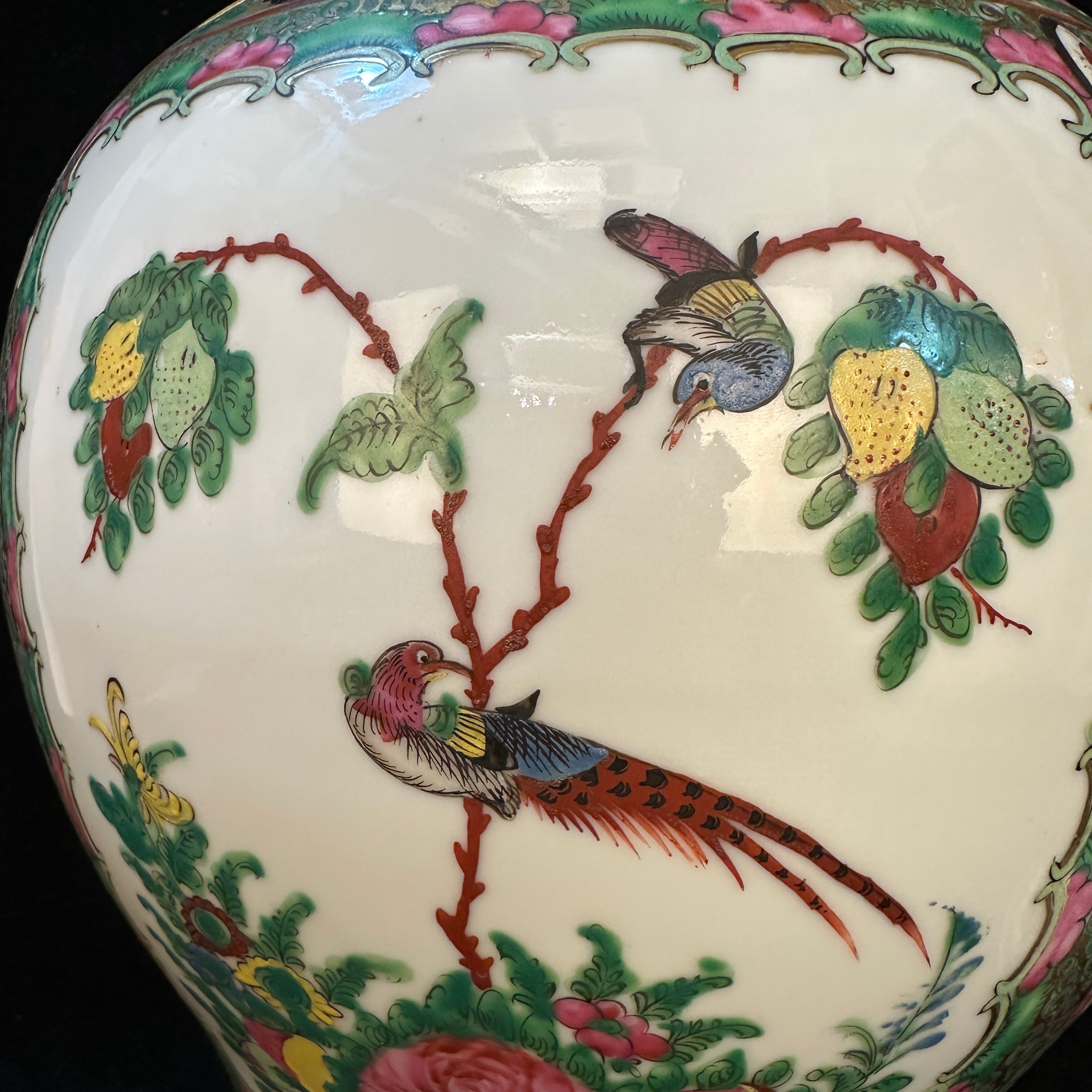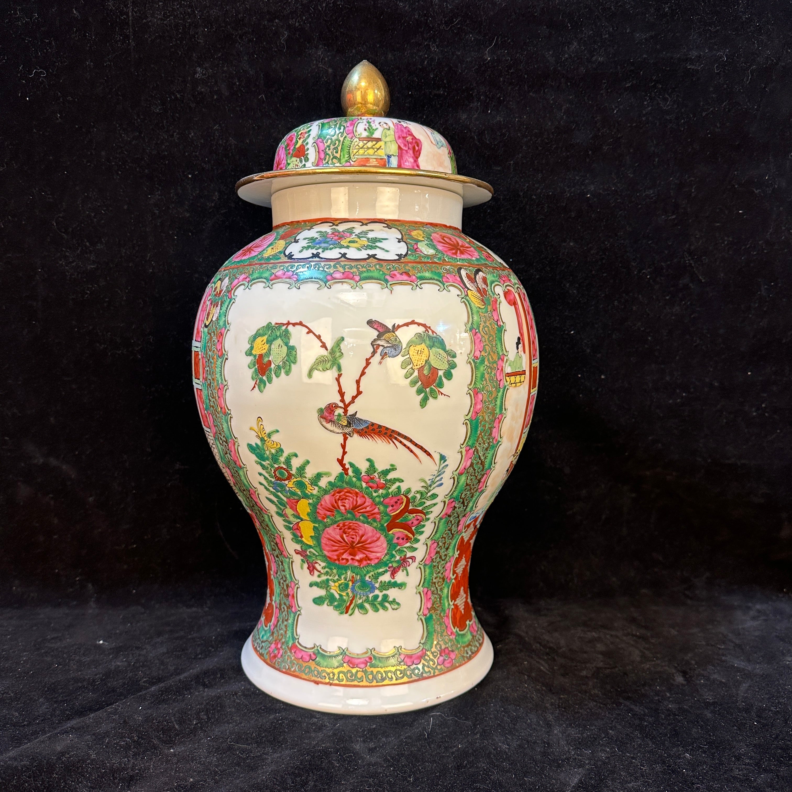Espectacular potiche hecho de porcelana, de origen chino, con un esmaltado policromado y detalles pintados a mano, con diseños de flores, aves, en tonos verdes, amarillos y rosas, y detalles en dorado. Familia Rosa Medallion.